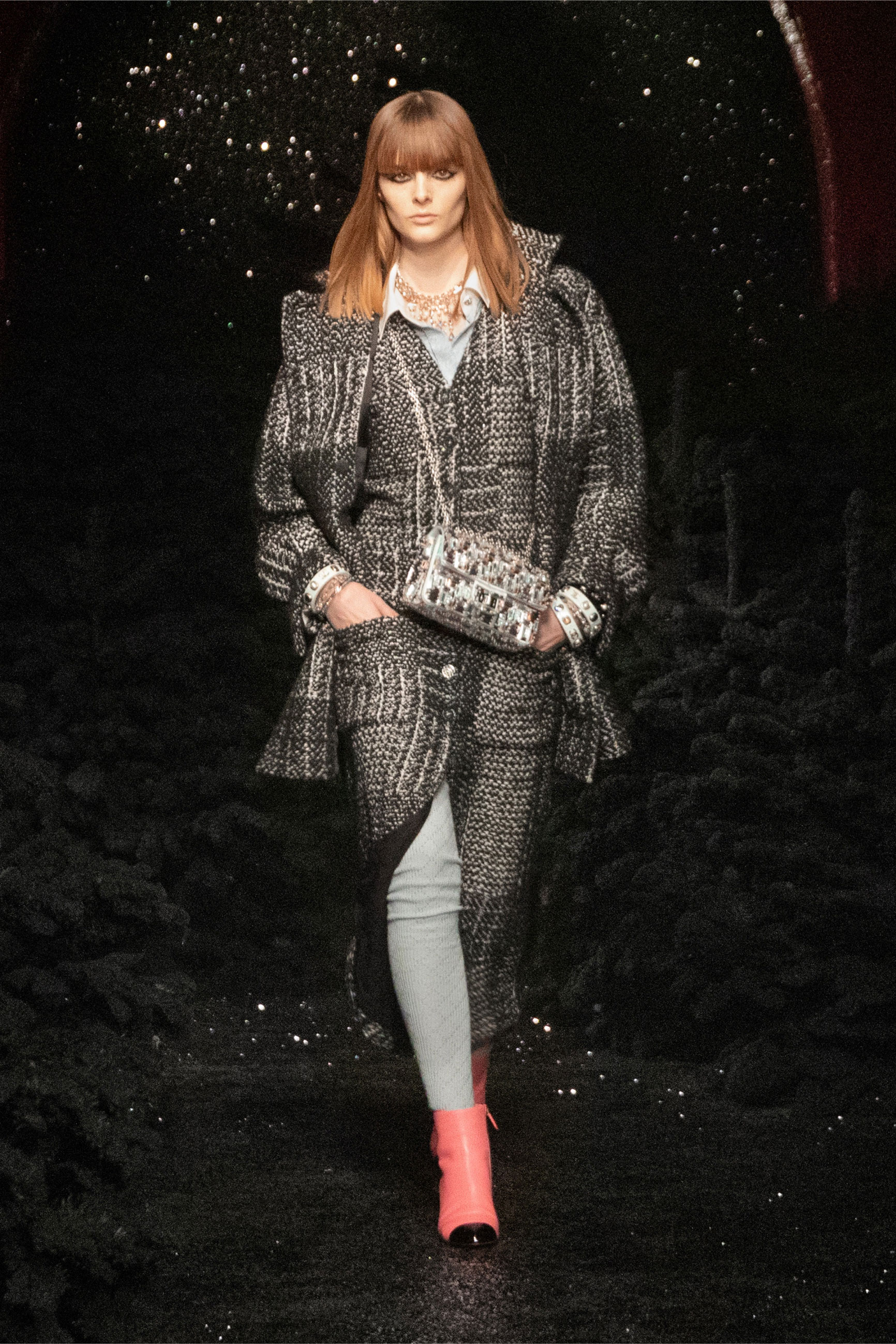 Показ осенней коллекции Chanel Виржини Виар снова превратила в праздник. После того как мы виртуально побывали на большом семейном торжестве, где невеста выехала в финале верхом на белоснежном коне, дизайнер перенесла зрителей в мир раскованности, веселья и девичьих вечеринок с привкусом 60-х и 70-х. Пока привычный для шоу дома Гран-Пале закрыт на реконструкцию, действие фильма, снятого дуэтом Inez & Vinoodh, перенесли в легендарный парижский клуб Castel. Виржини всегда вдохновляли рассказы Карла Лагерфельда о том, как он проводил показы в 1970-х, предоставляя девушкам возможность самим одеваться перед выходом к публике в ресторане или клубе.