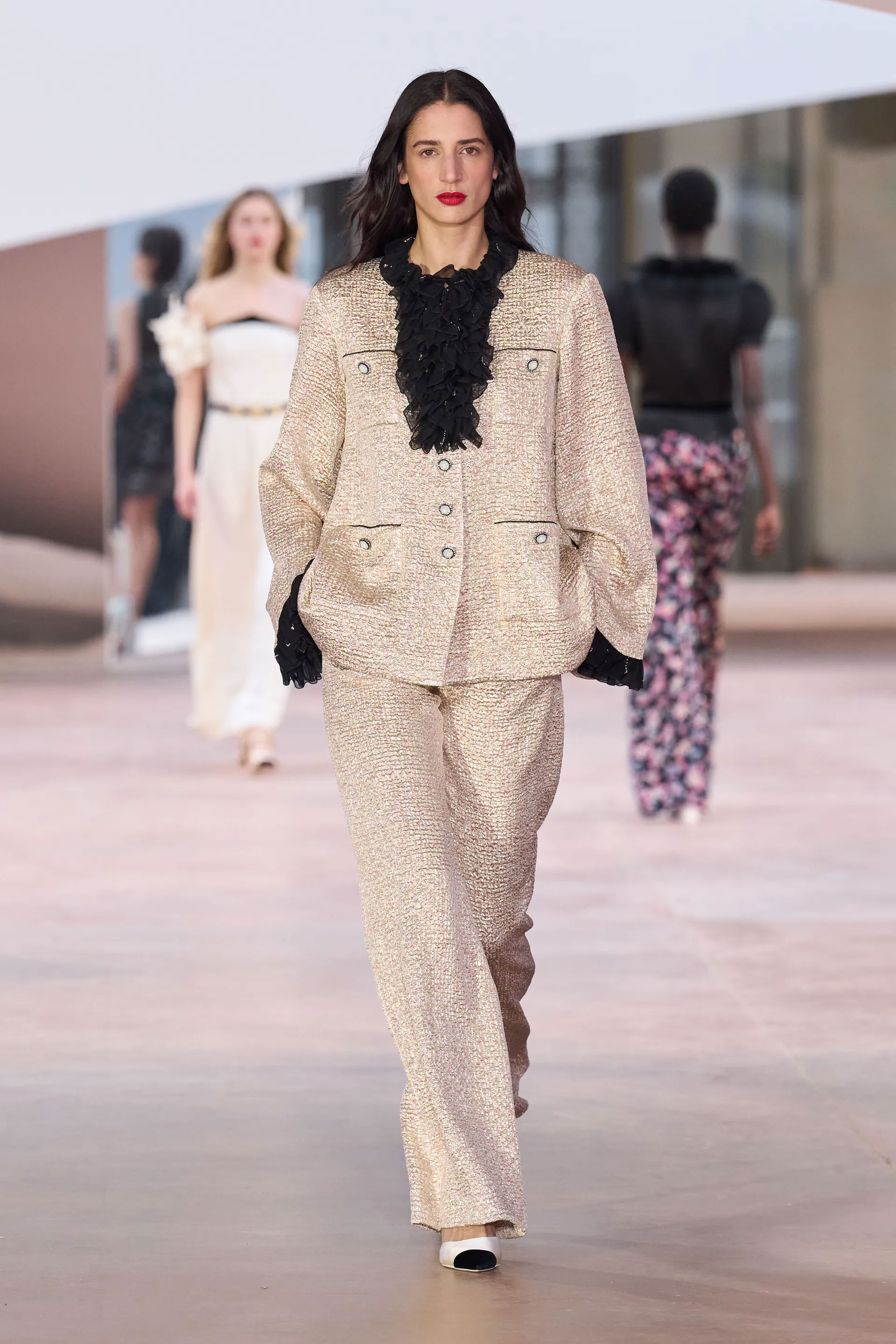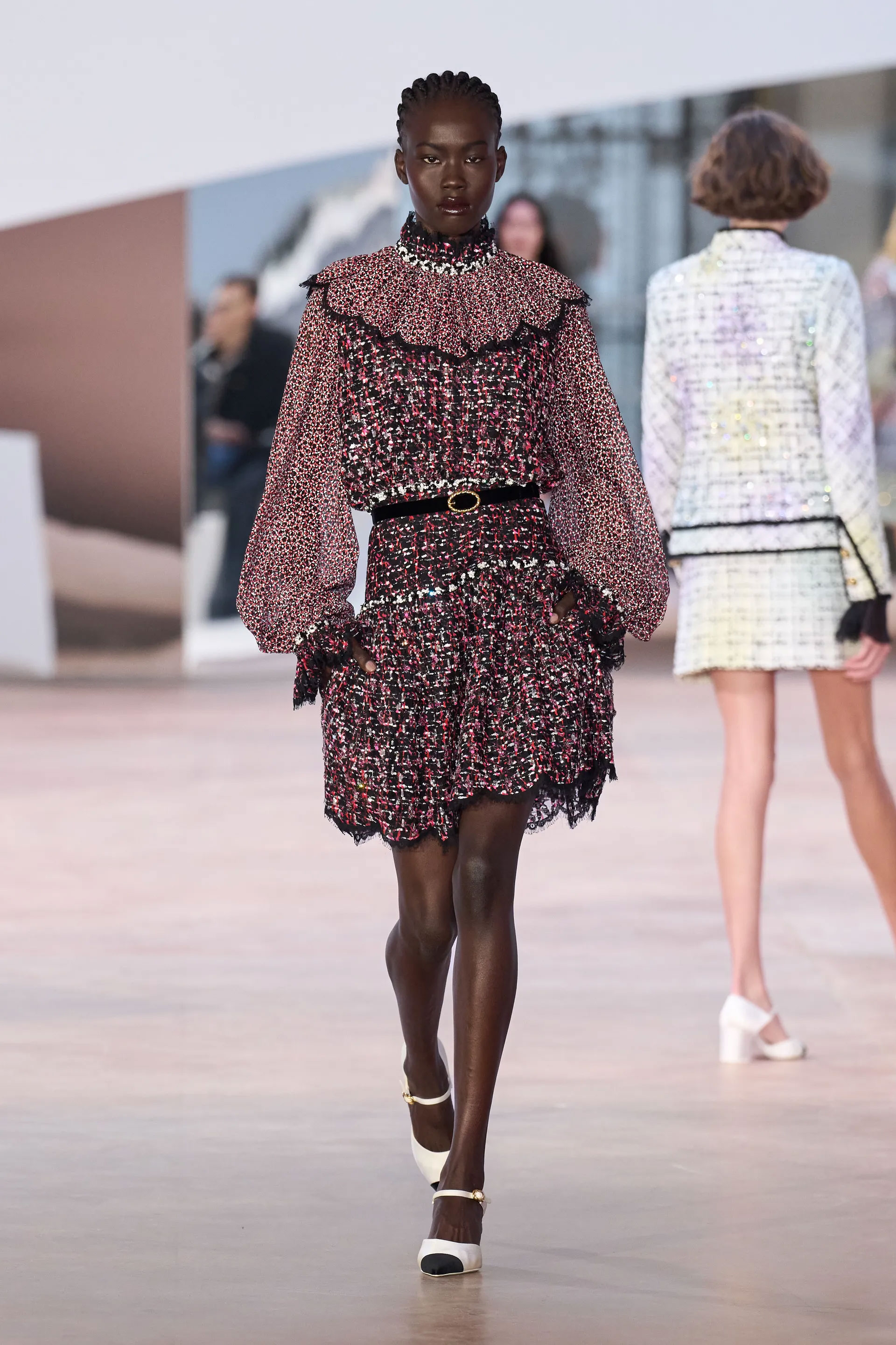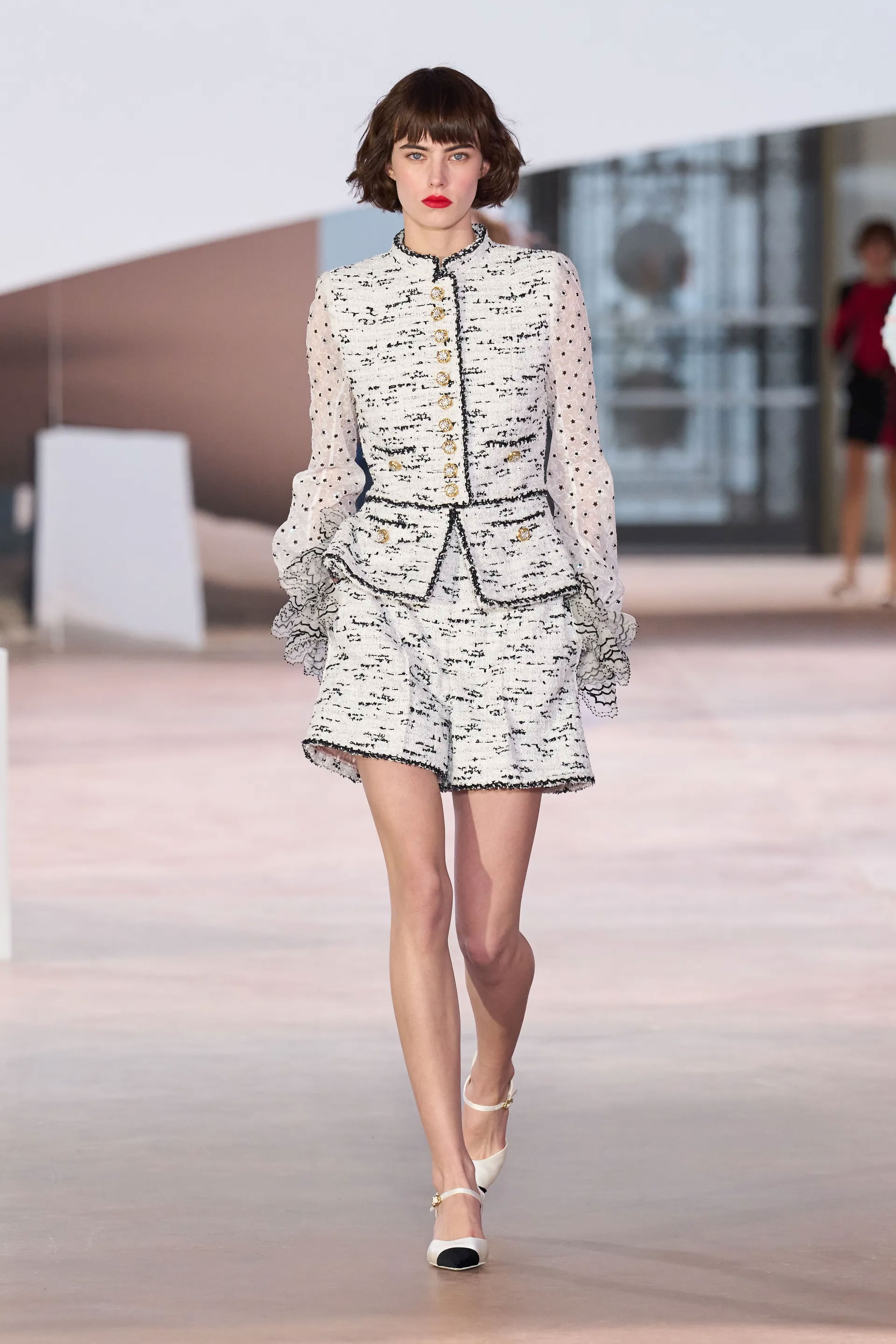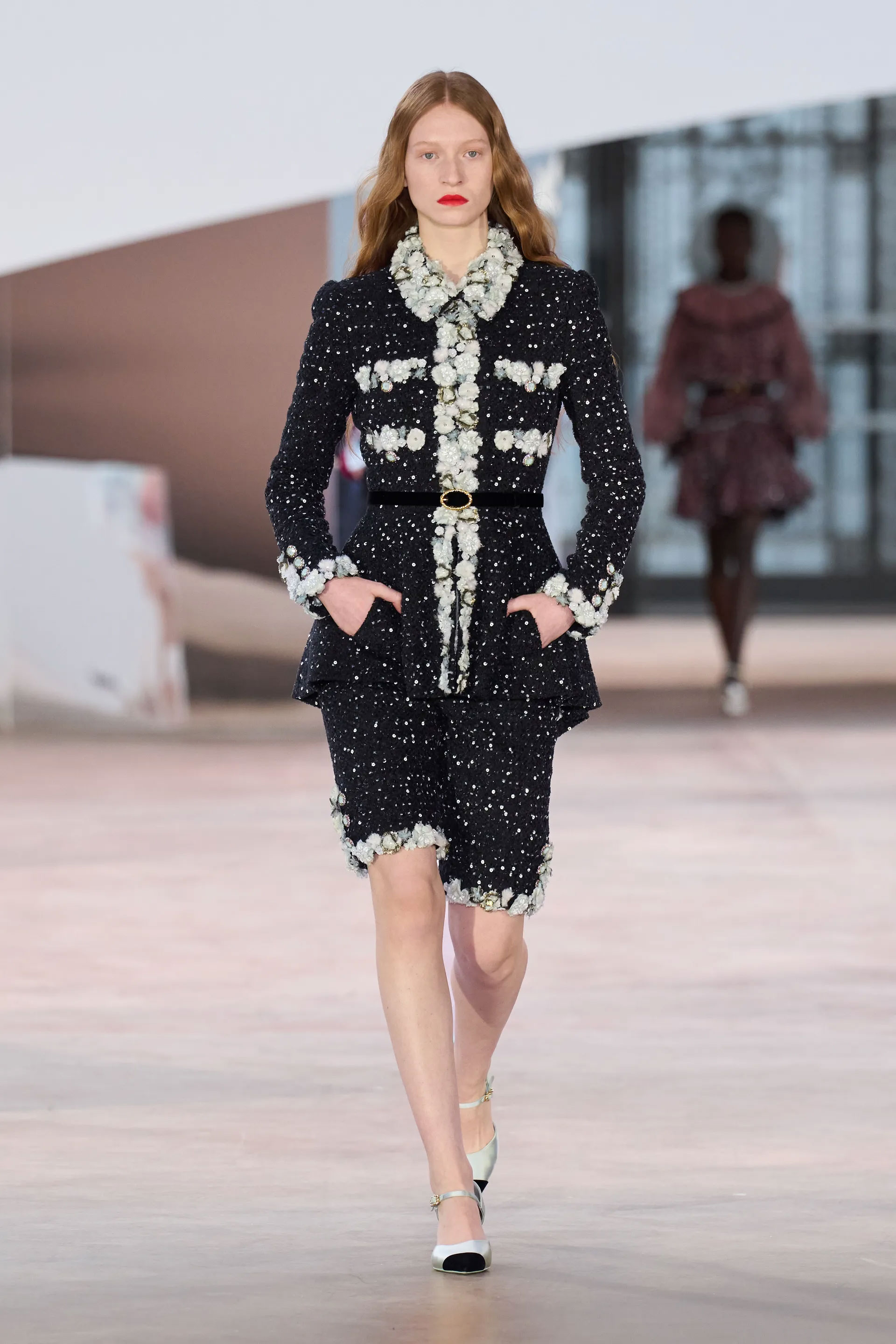 Шоу відкрила серія образів з варіацією твідових костюмів: класичний білий, з декоративним пір’ям, різнокольоровий, жакет з вирізом-човником чи V-подібним, з кришталевими ґудзиками — метаморфозою до місяця, сонця та квіток камелії — чи оксамитовими бантами, а також інші модні есе на тему культового елементу від Chanel.