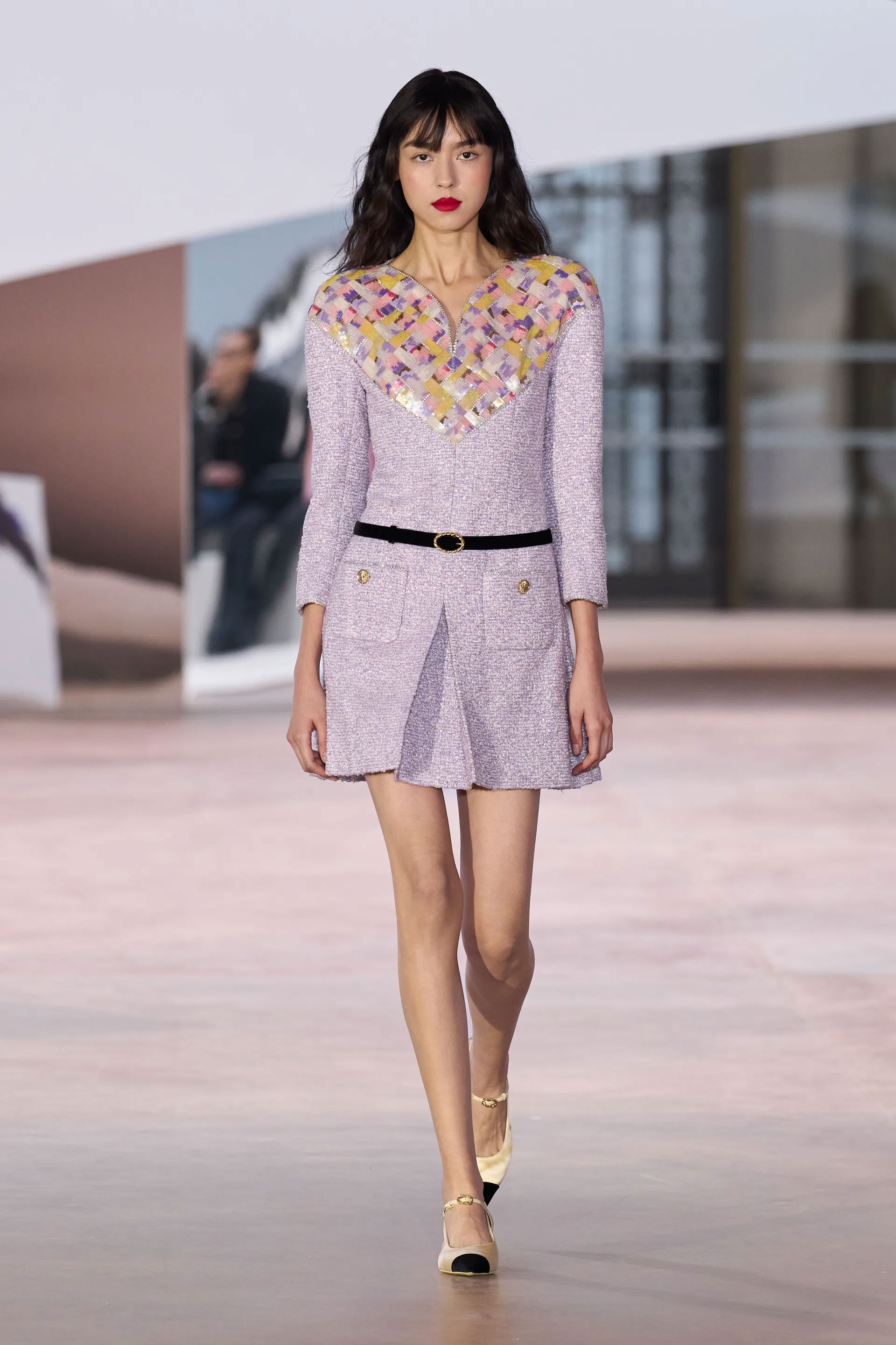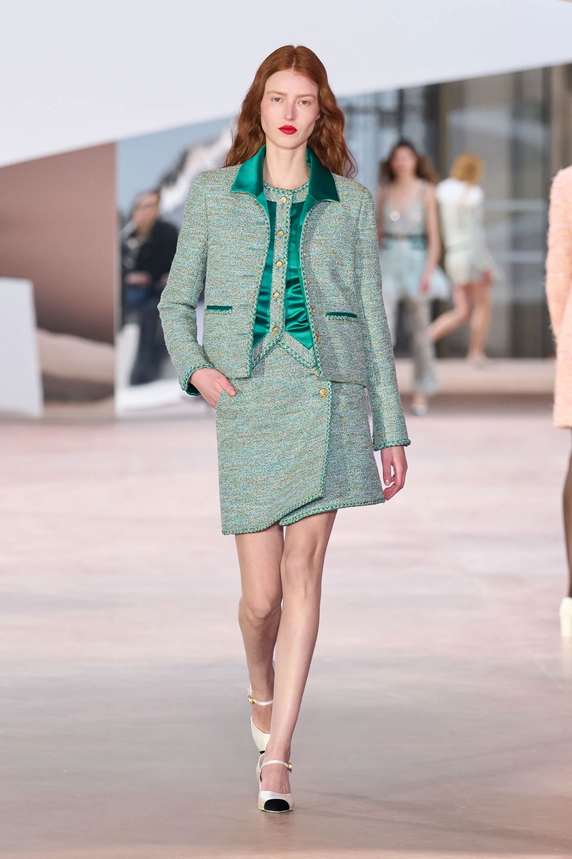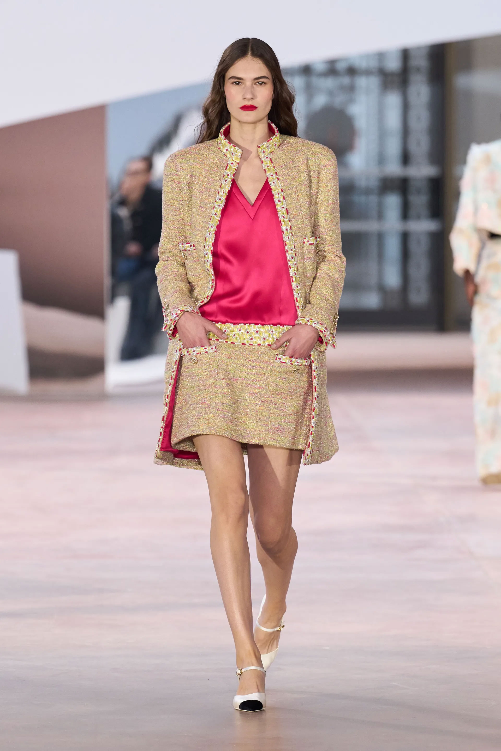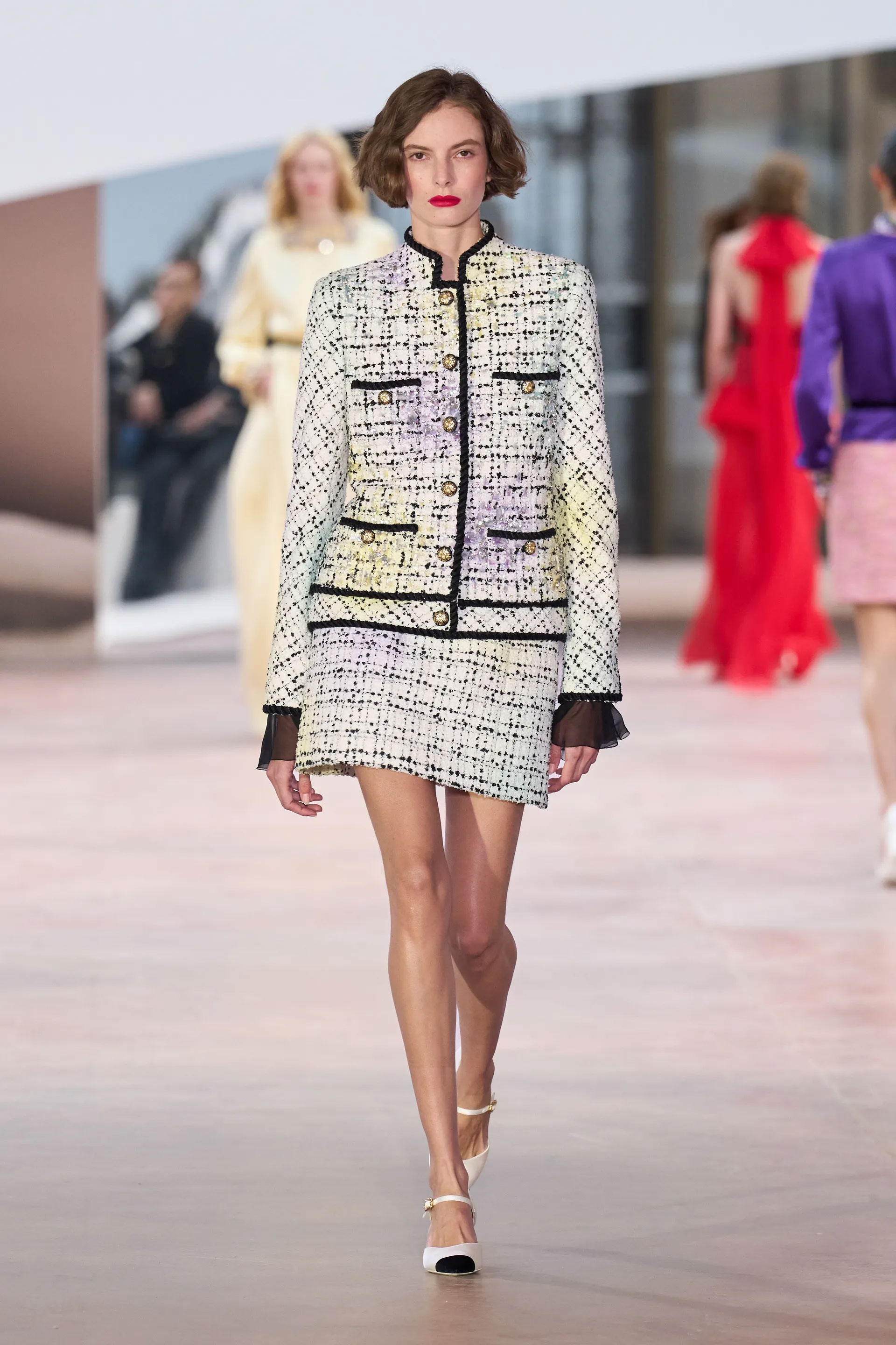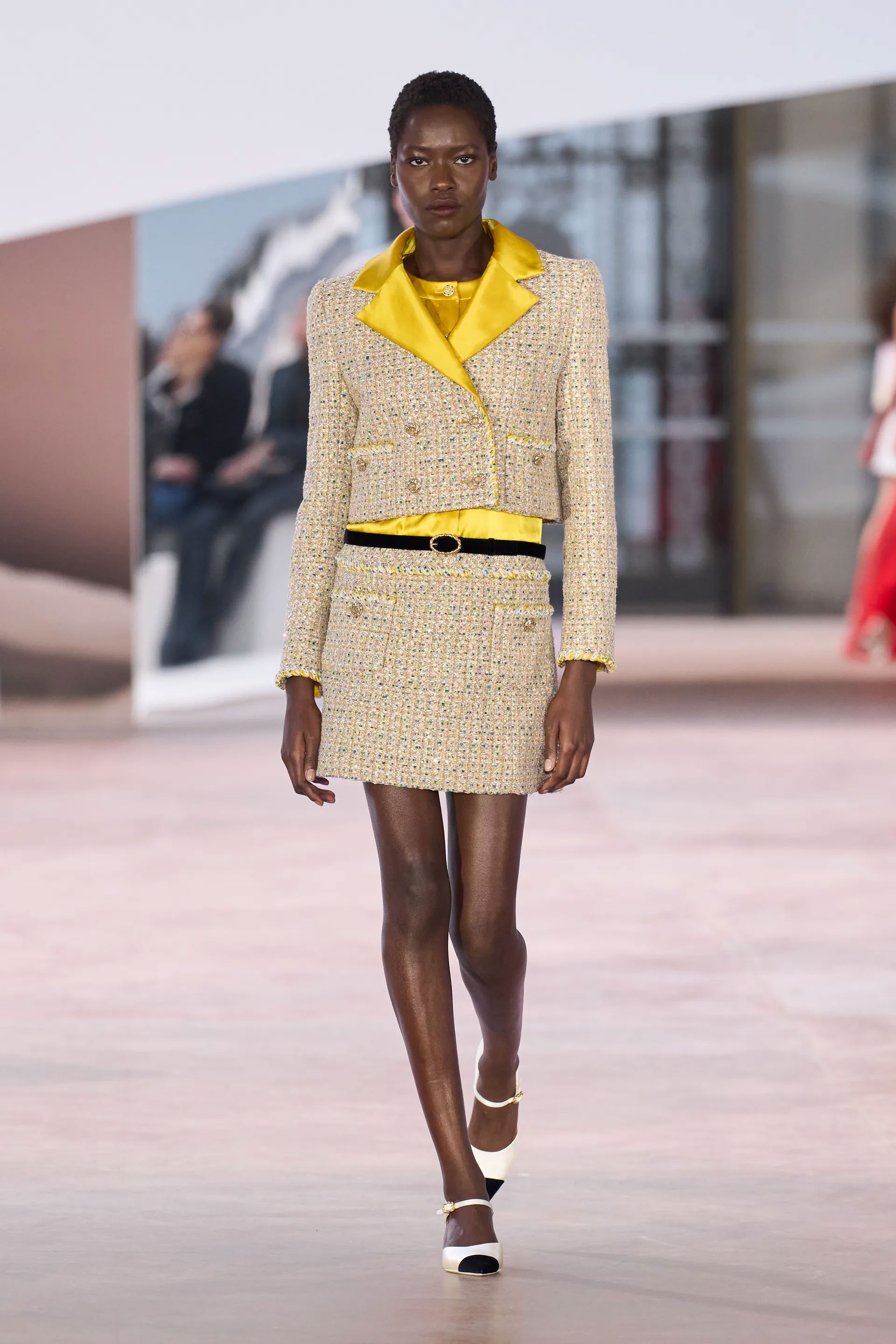 Шоу відкрила серія образів з варіацією твідових костюмів: класичний білий, з декоративним пір’ям, різнокольоровий, жакет з вирізом-човником чи V-подібним, з кришталевими ґудзиками — метаморфозою до місяця, сонця та квіток камелії — чи оксамитовими бантами, а також інші модні есе на тему культового елементу від Chanel.