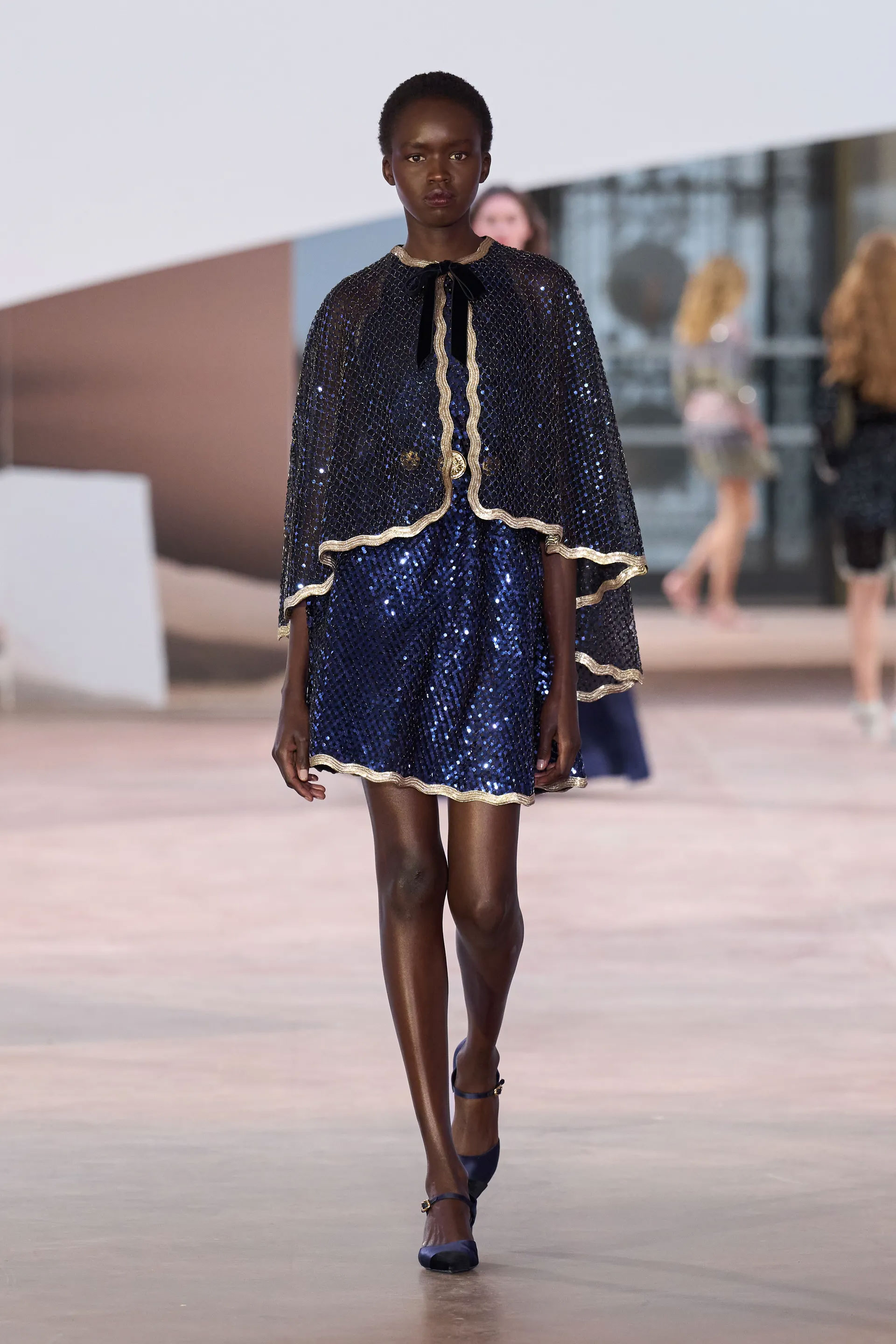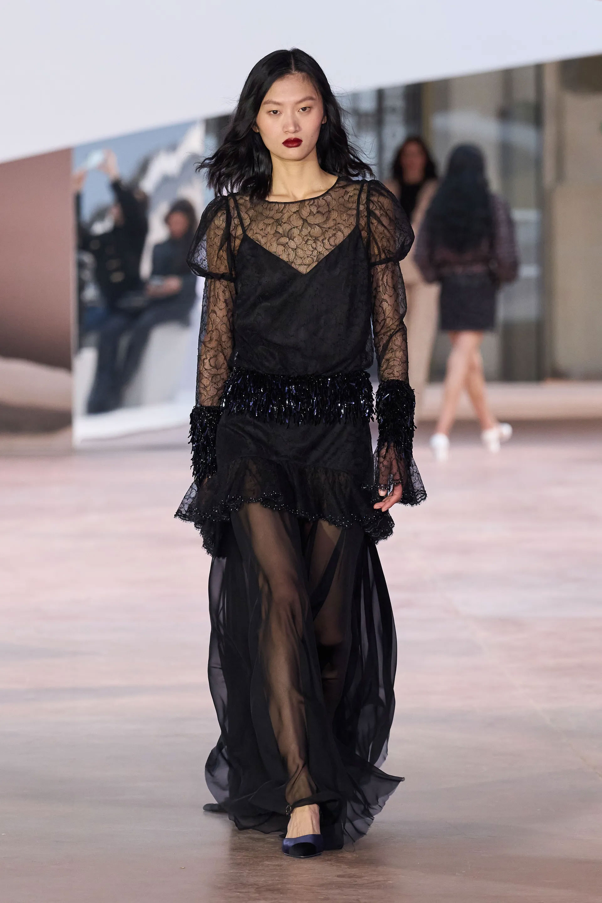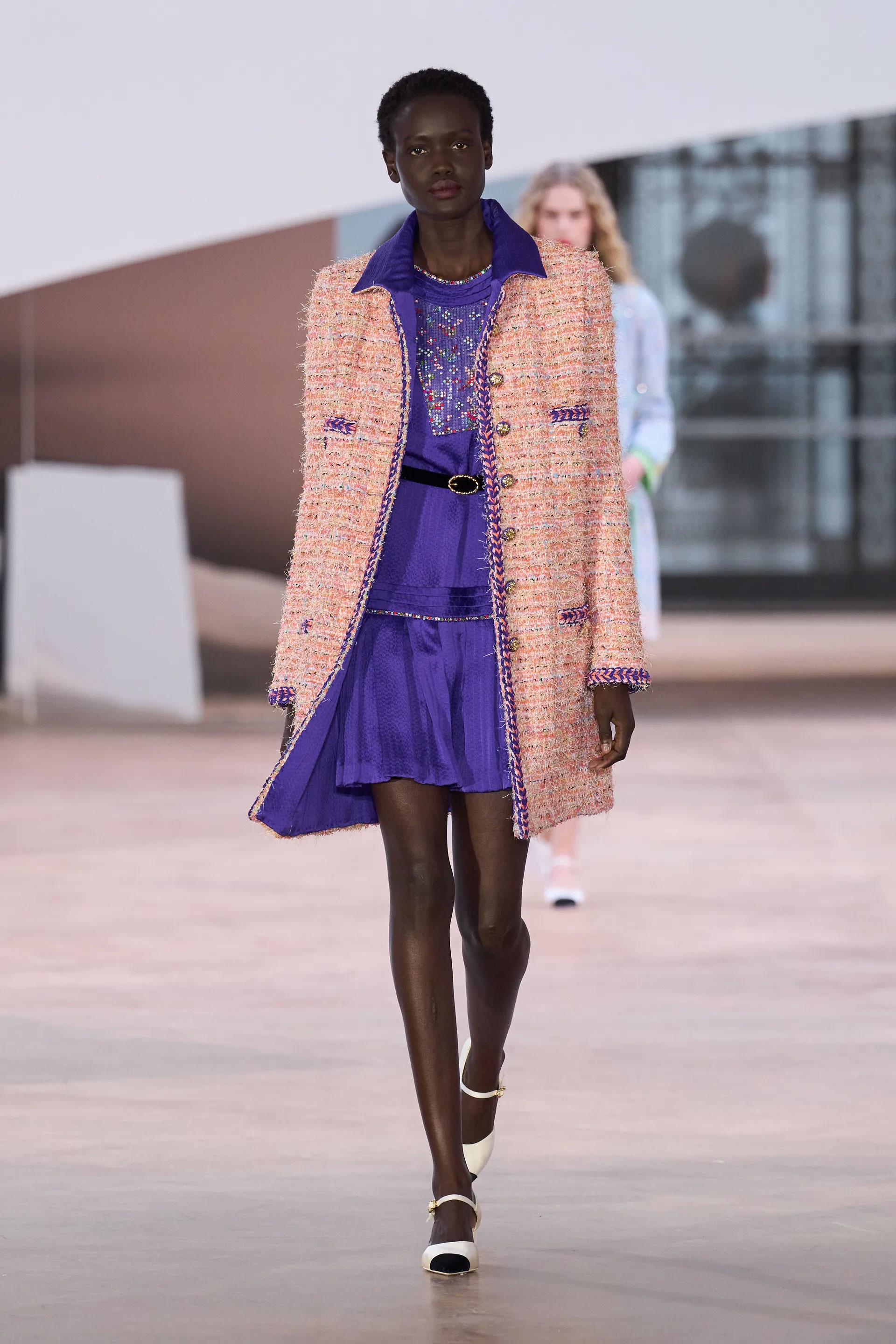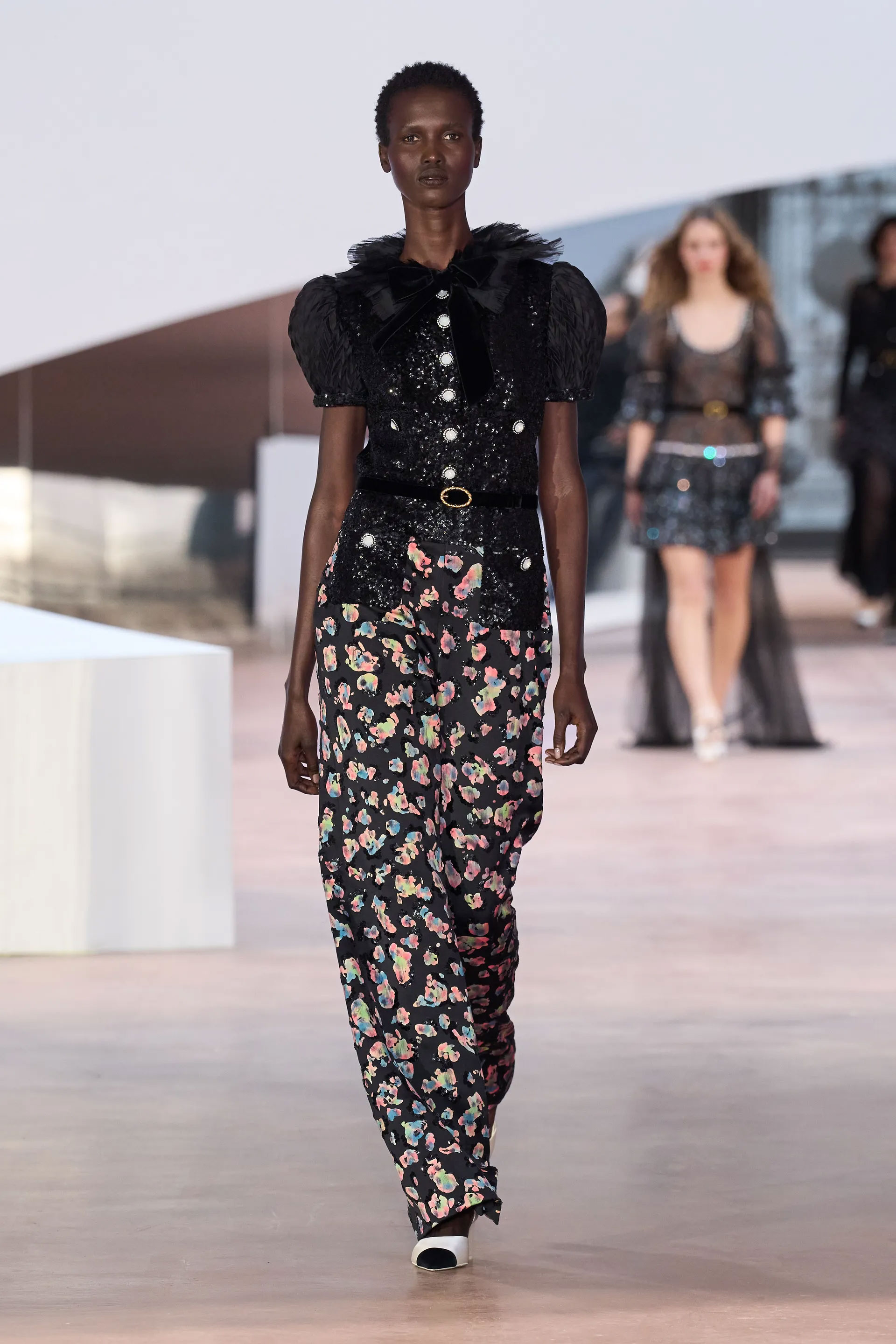 Шоу відкрила серія образів з варіацією твідових костюмів: класичний білий, з декоративним пір’ям, різнокольоровий, жакет з вирізом-човником чи V-подібним, з кришталевими ґудзиками — метаморфозою до місяця, сонця та квіток камелії — чи оксамитовими бантами, а також інші модні есе на тему культового елементу від Chanel.