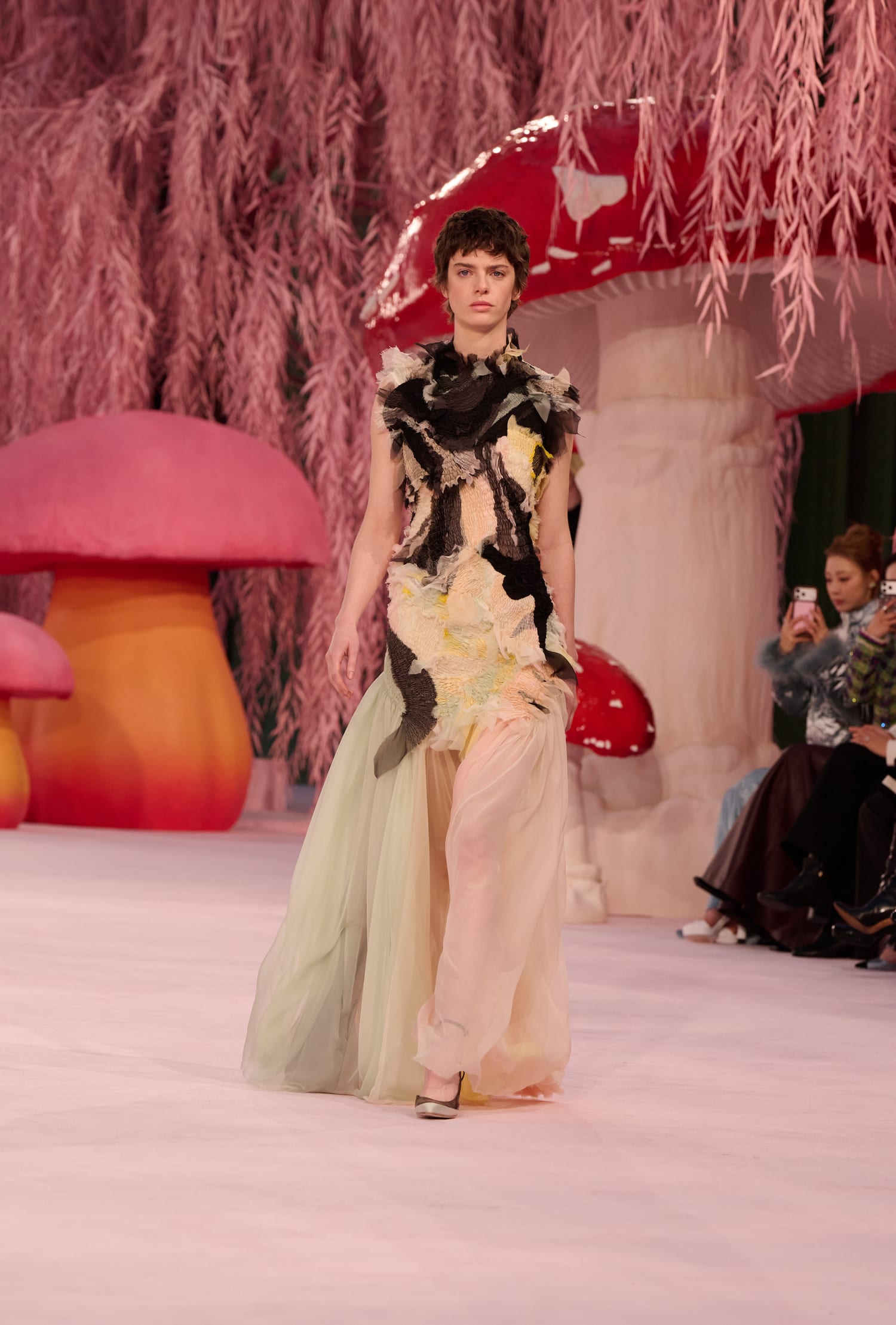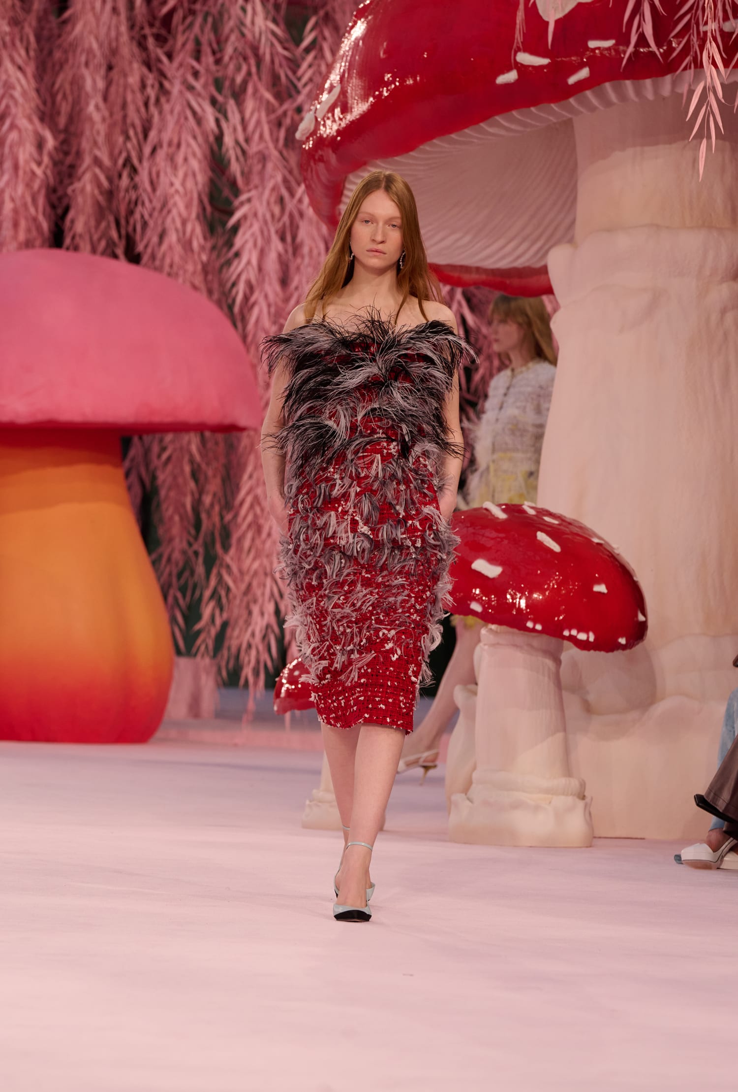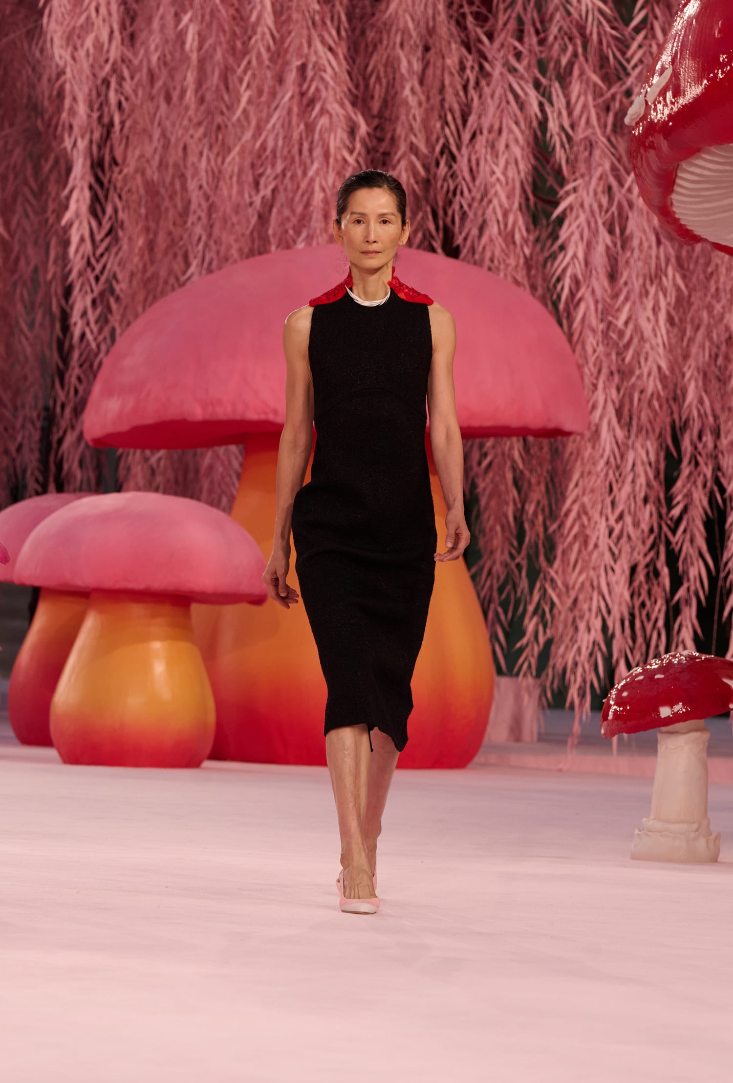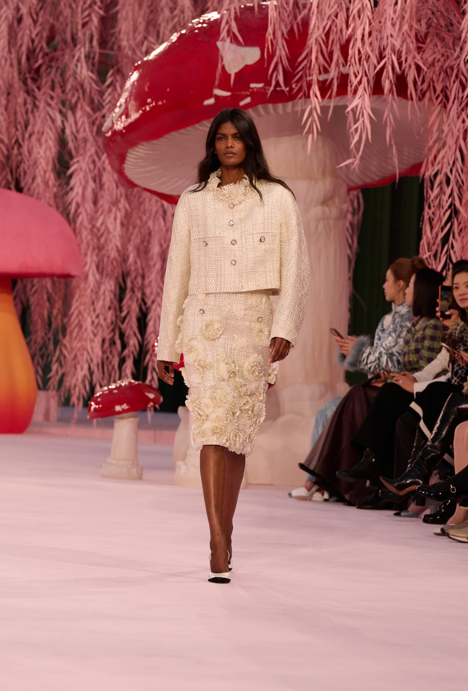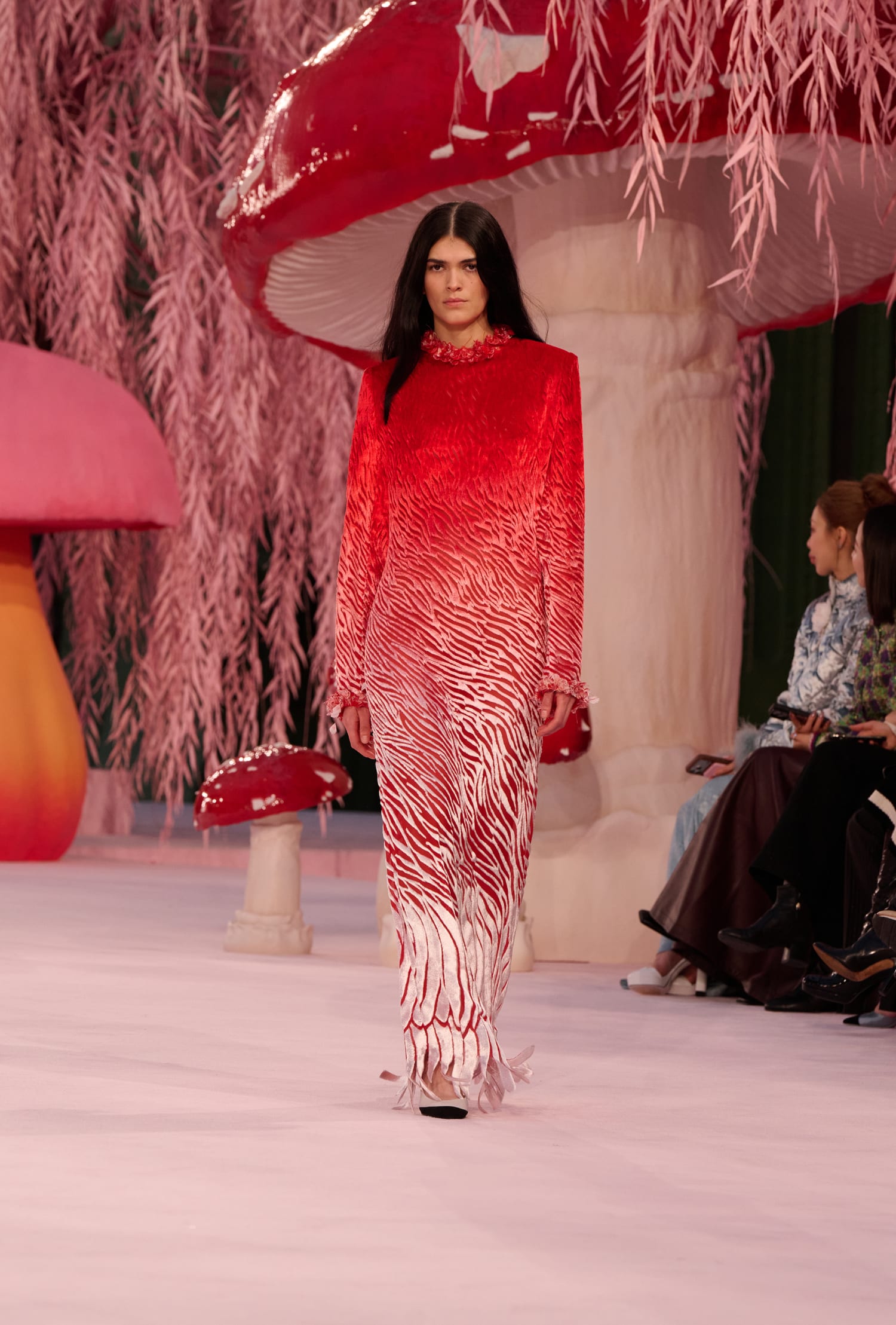 Сценографією для шоу, яке традиційно розгорнулося в Гран Пале, виступили рожеві ліани та гігантські скульптури у вигляді грибів, ніби з «Аліси в країні Чудес». На фоні цього дофамінового різноманіття був помічений численний перелік знаменитостей: у front row показу — Ніколь Кідман, Тільда Свінтон, Шарлотта Казірагі, Пенелопа Крус тощо.