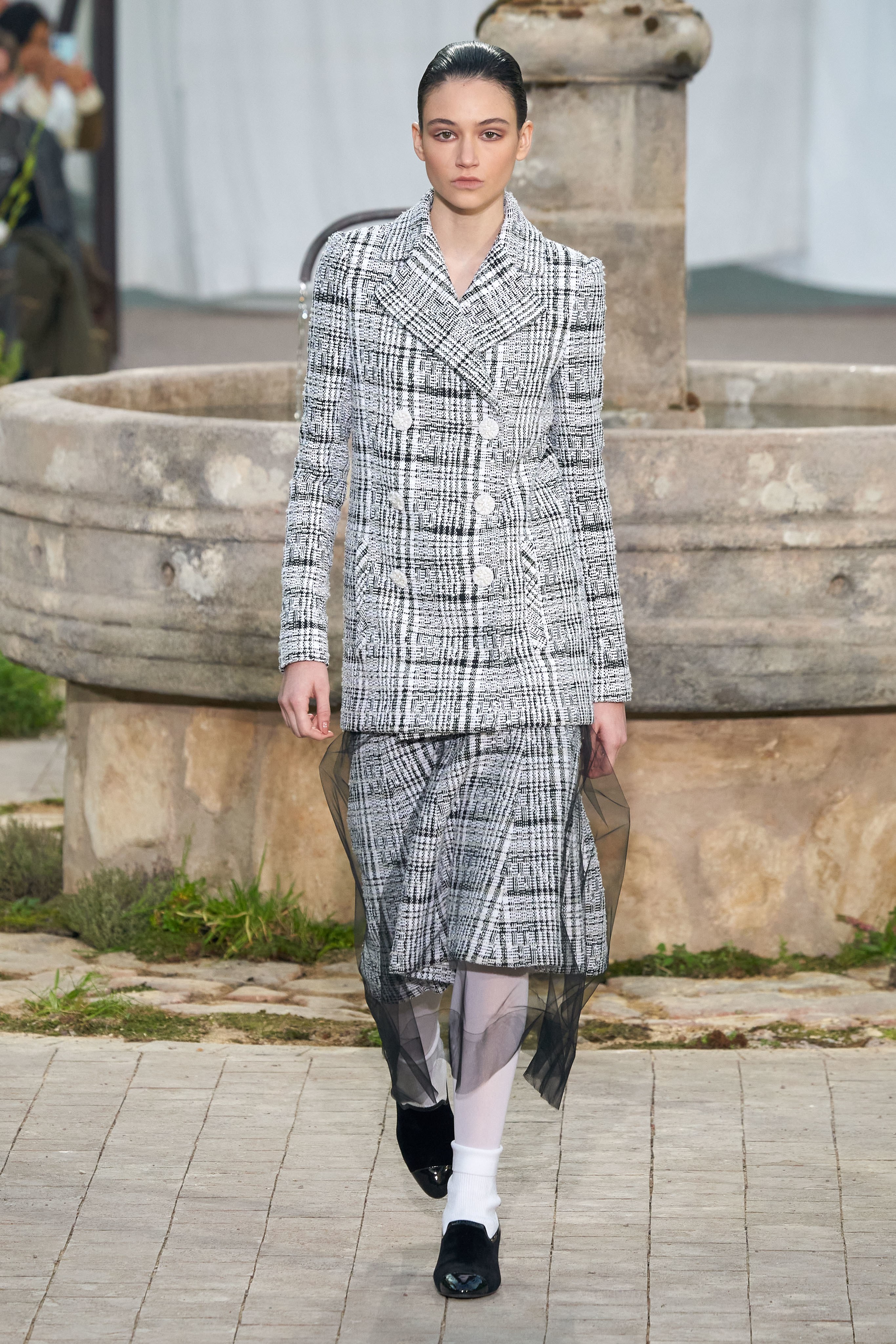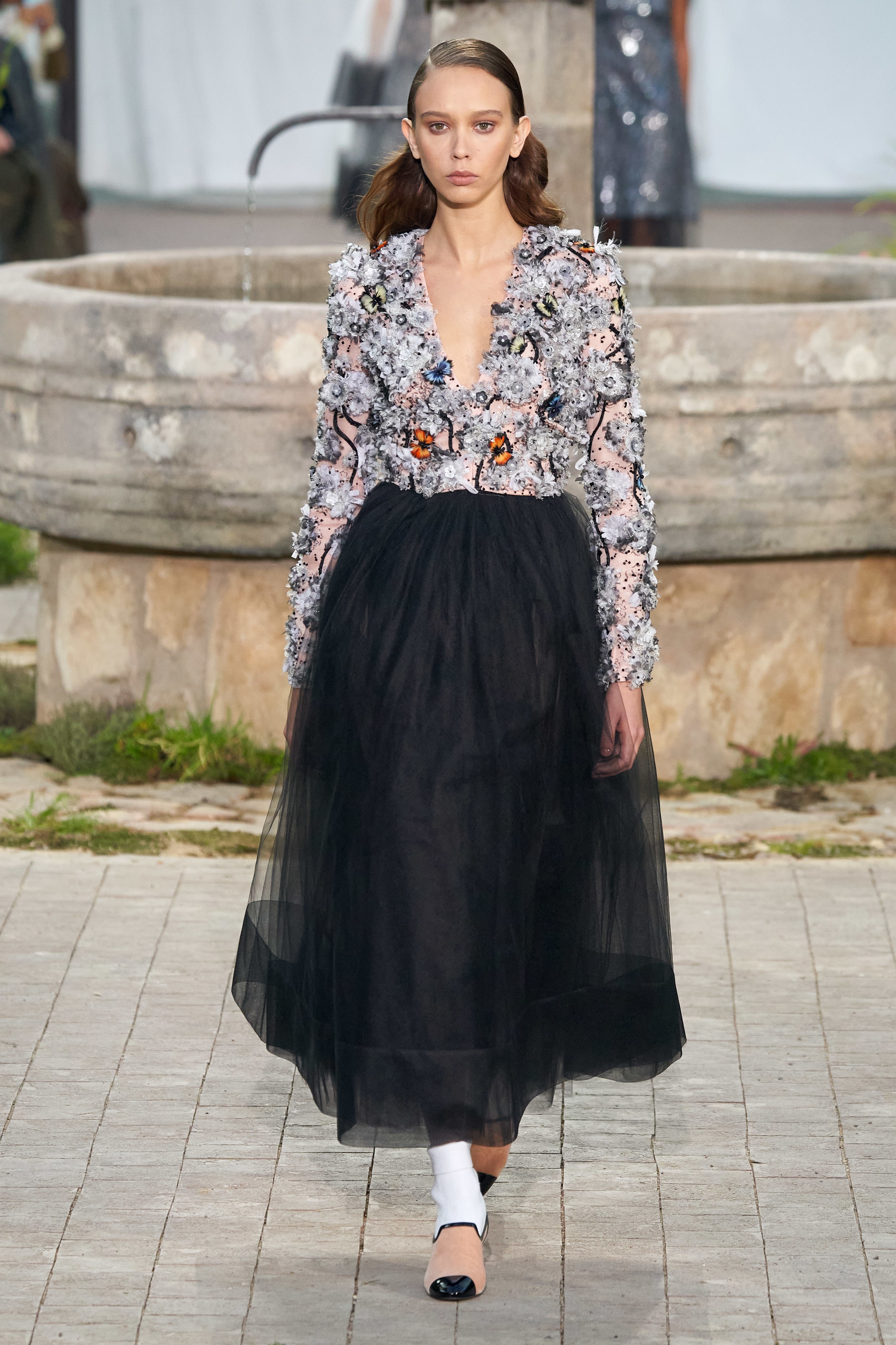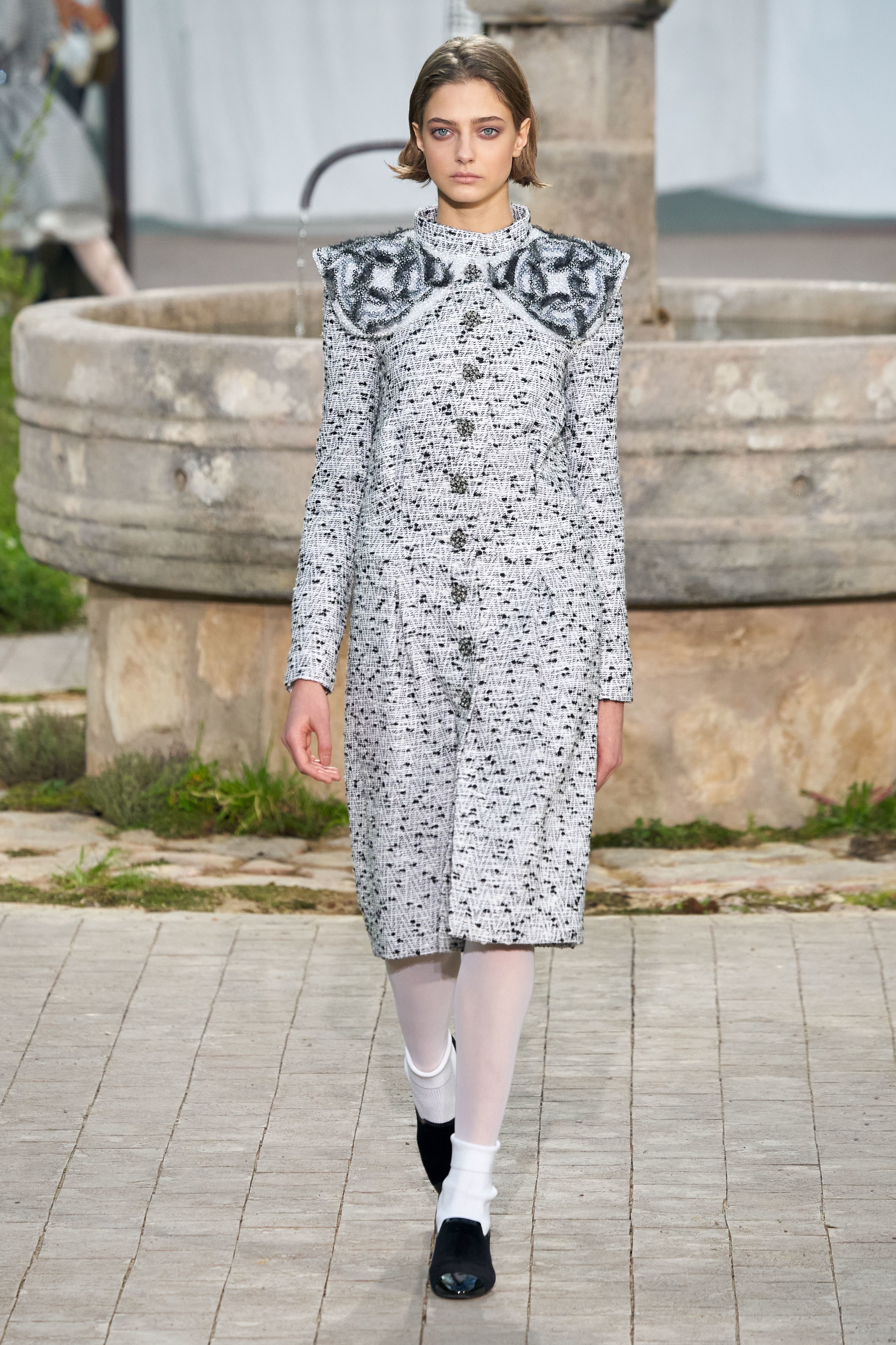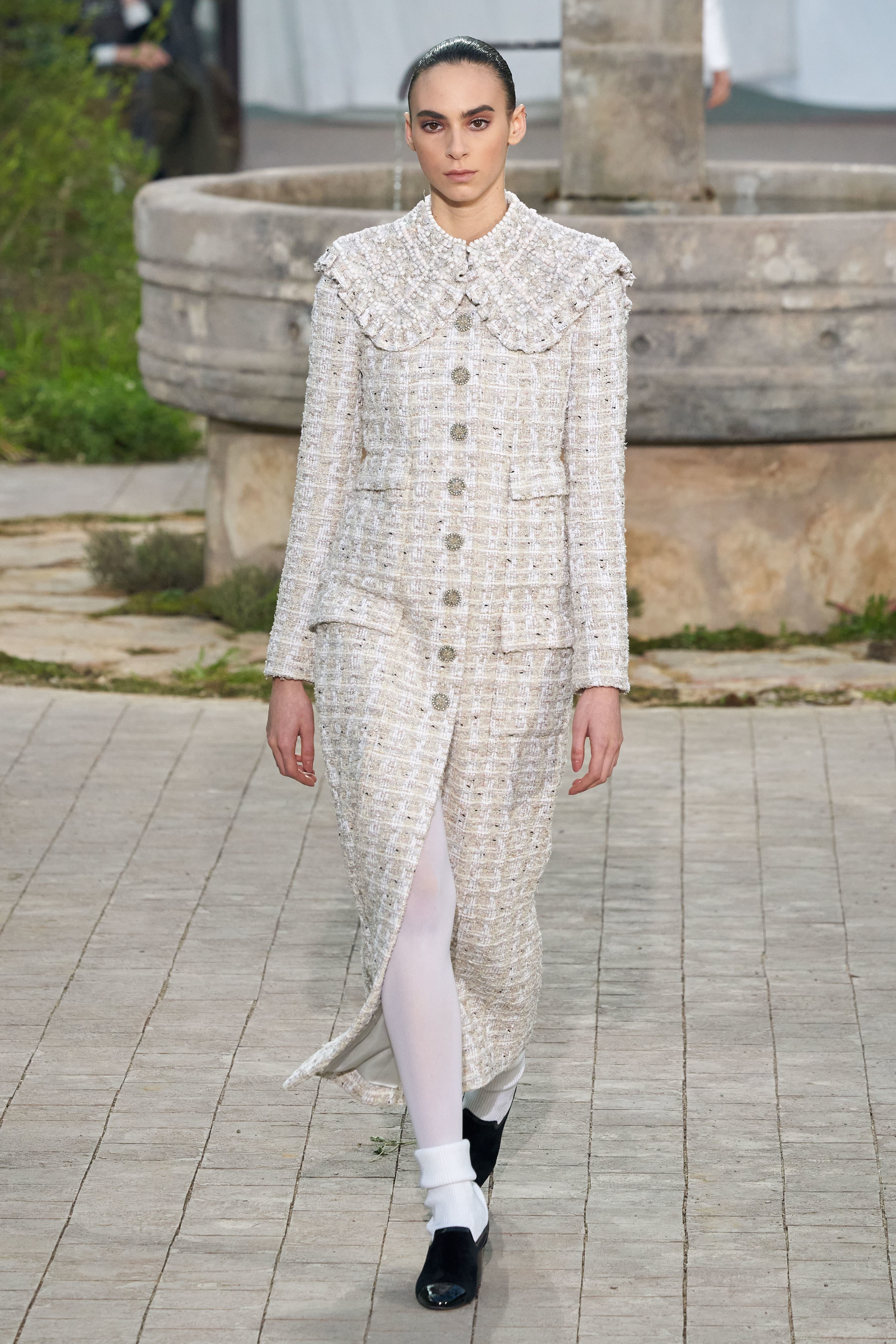 Для нового показа Haute Couture преемница Карла Лагерфельда и креативный директор легендарного дома Виржини Виар решила воссоздать внутренний двор Обазинского аббатства, в котором Габриэль Шанель провела юность. Для этого в Гран-Пале потрудилась целая команда декораторов и конструкторов, и благодаря этому шоу получилось атмосферным и кинематографичным. В коллекцию вошли платья и костюмы с юбками, плащи и легкие пальто, но почти никаких брюк. Сама Коко утверждала, что нет ничего притягательнее, чем закрытое простое платье с воротничком, — Виржини Виар представила интеллигентную и изысканную версию такого наряда.