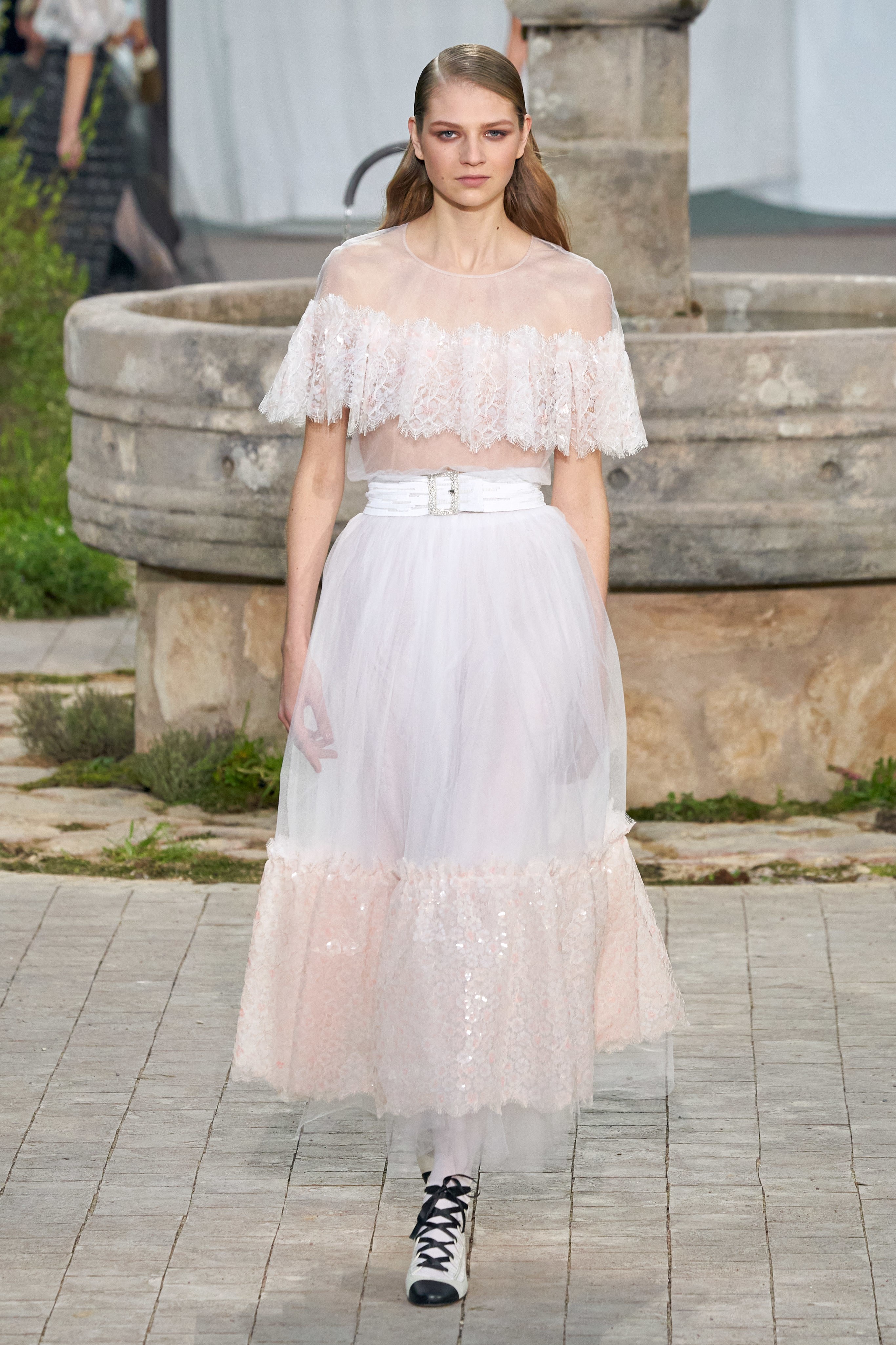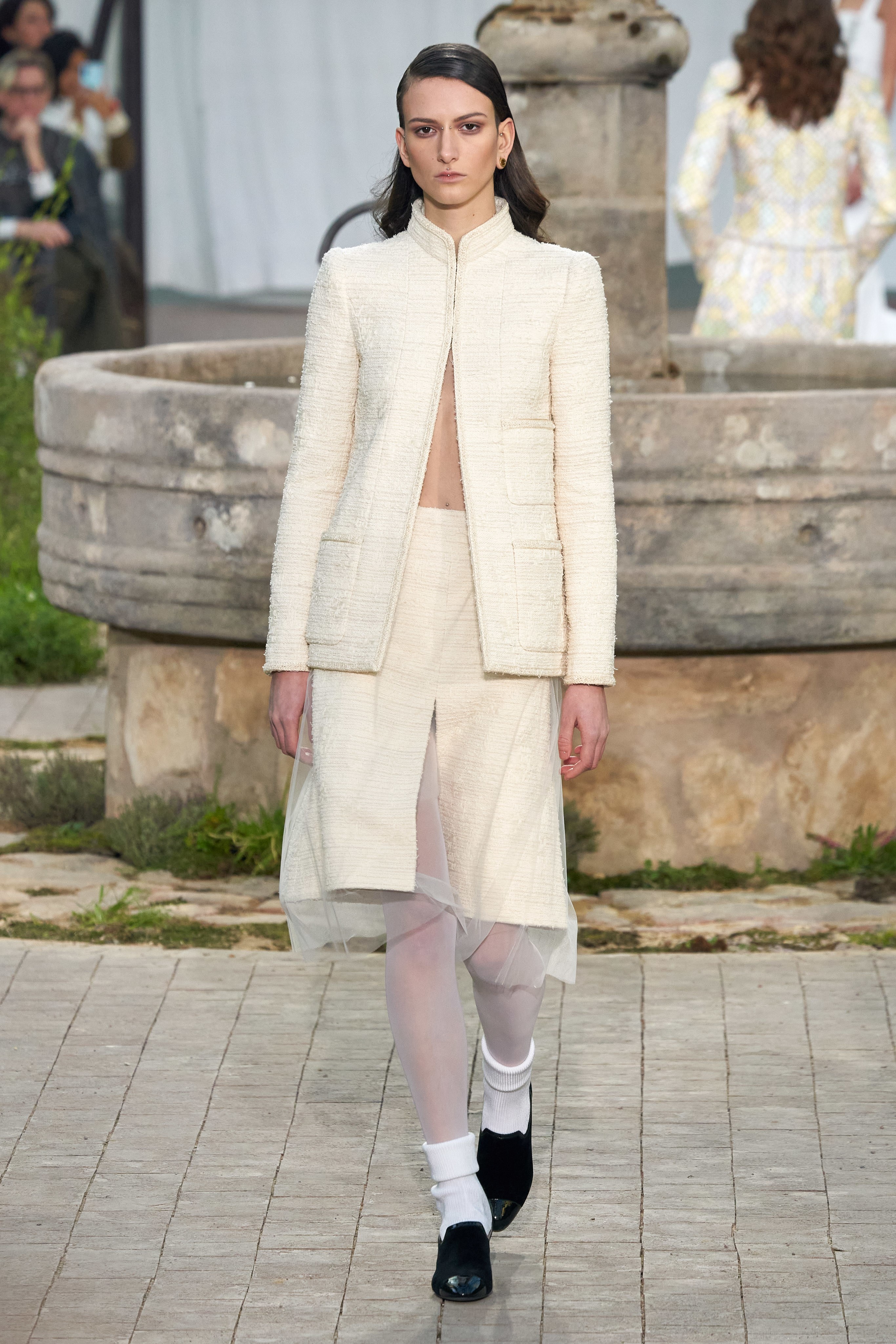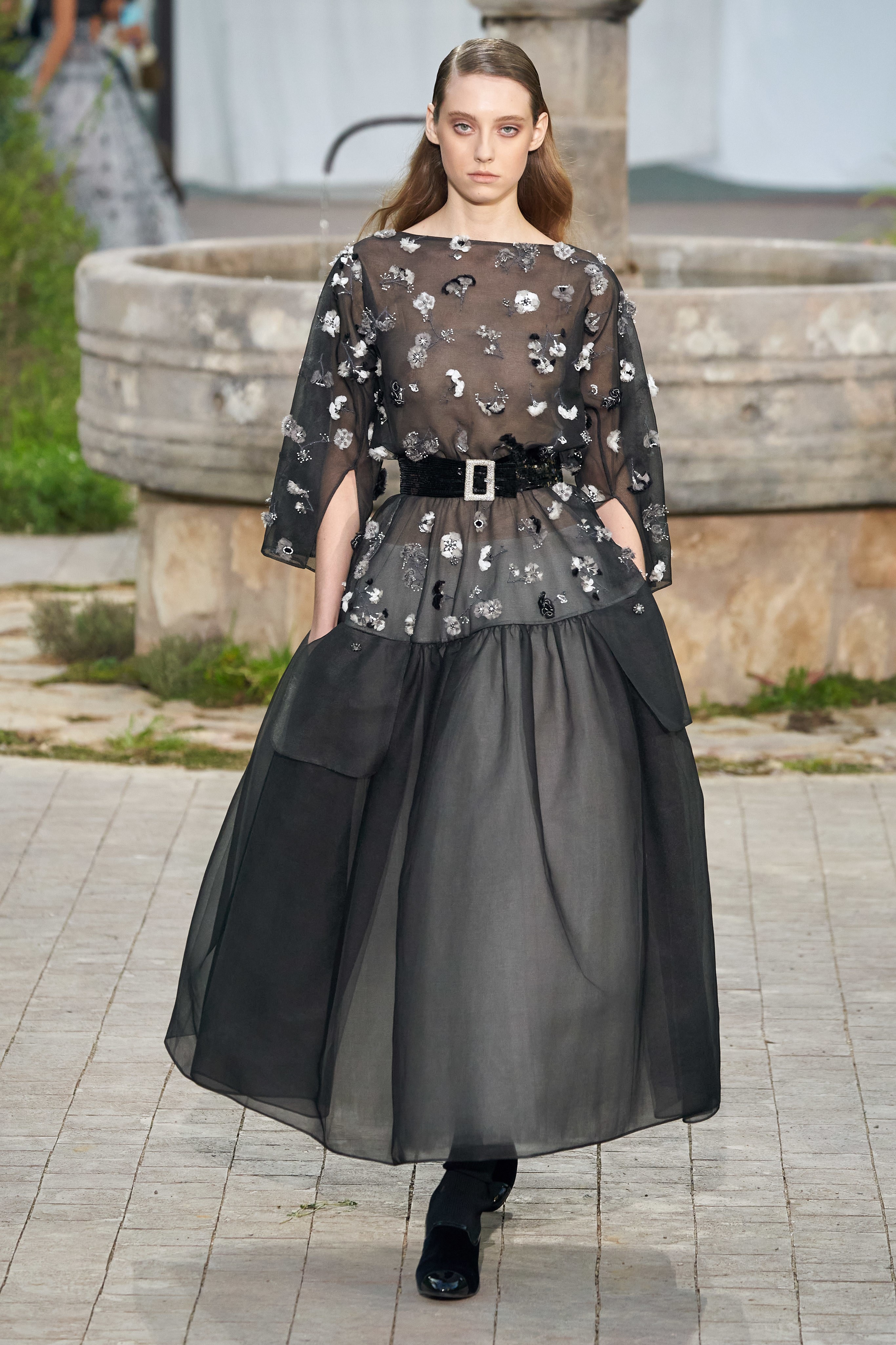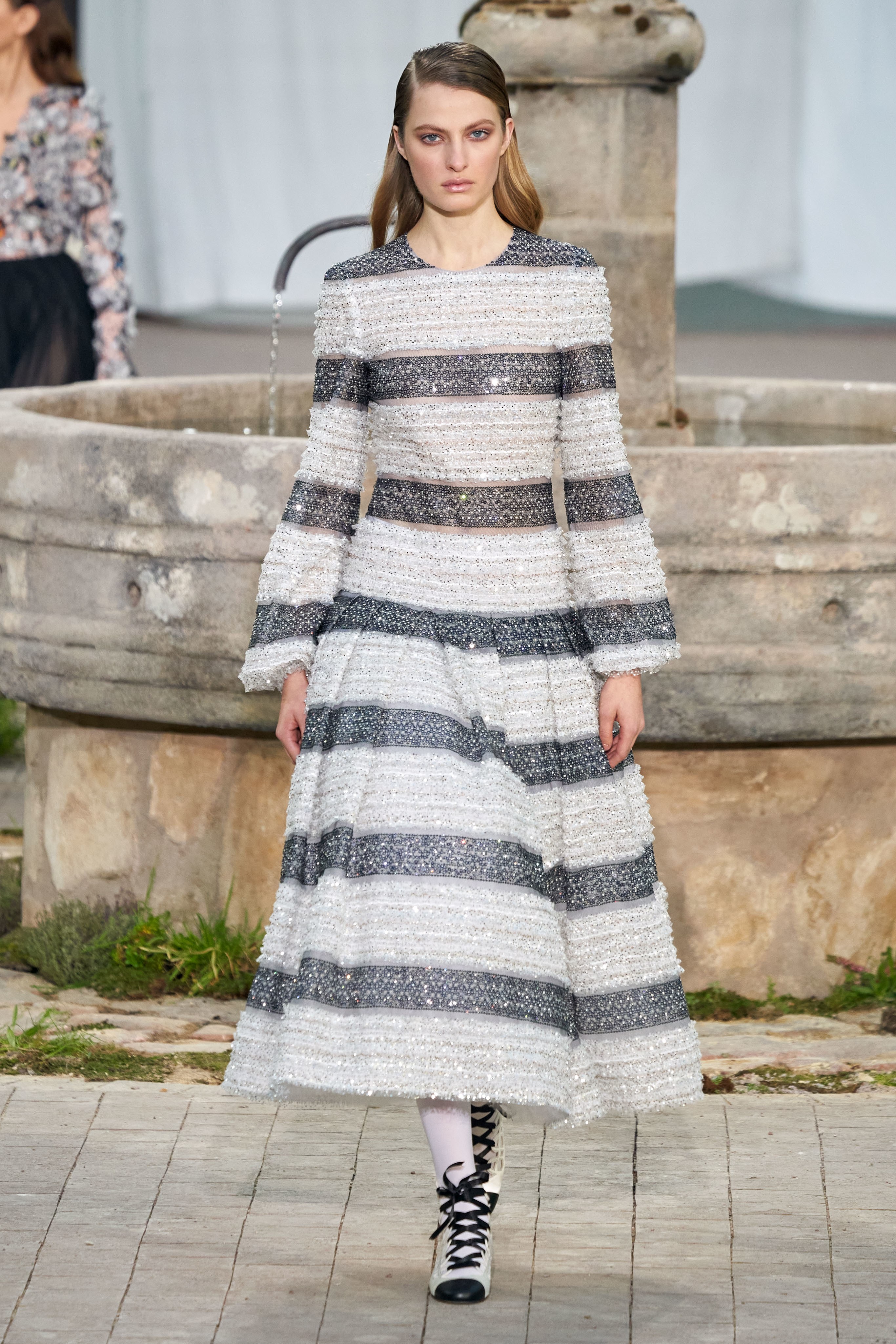 Для нового показа Haute Couture преемница Карла Лагерфельда и креативный директор легендарного дома Виржини Виар решила воссоздать внутренний двор Обазинского аббатства, в котором Габриэль Шанель провела юность. Для этого в Гран-Пале потрудилась целая команда декораторов и конструкторов, и благодаря этому шоу получилось атмосферным и кинематографичным. В коллекцию вошли платья и костюмы с юбками, плащи и легкие пальто, но почти никаких брюк. Сама Коко утверждала, что нет ничего притягательнее, чем закрытое простое платье с воротничком, — Виржини Виар представила интеллигентную и изысканную версию такого наряда.