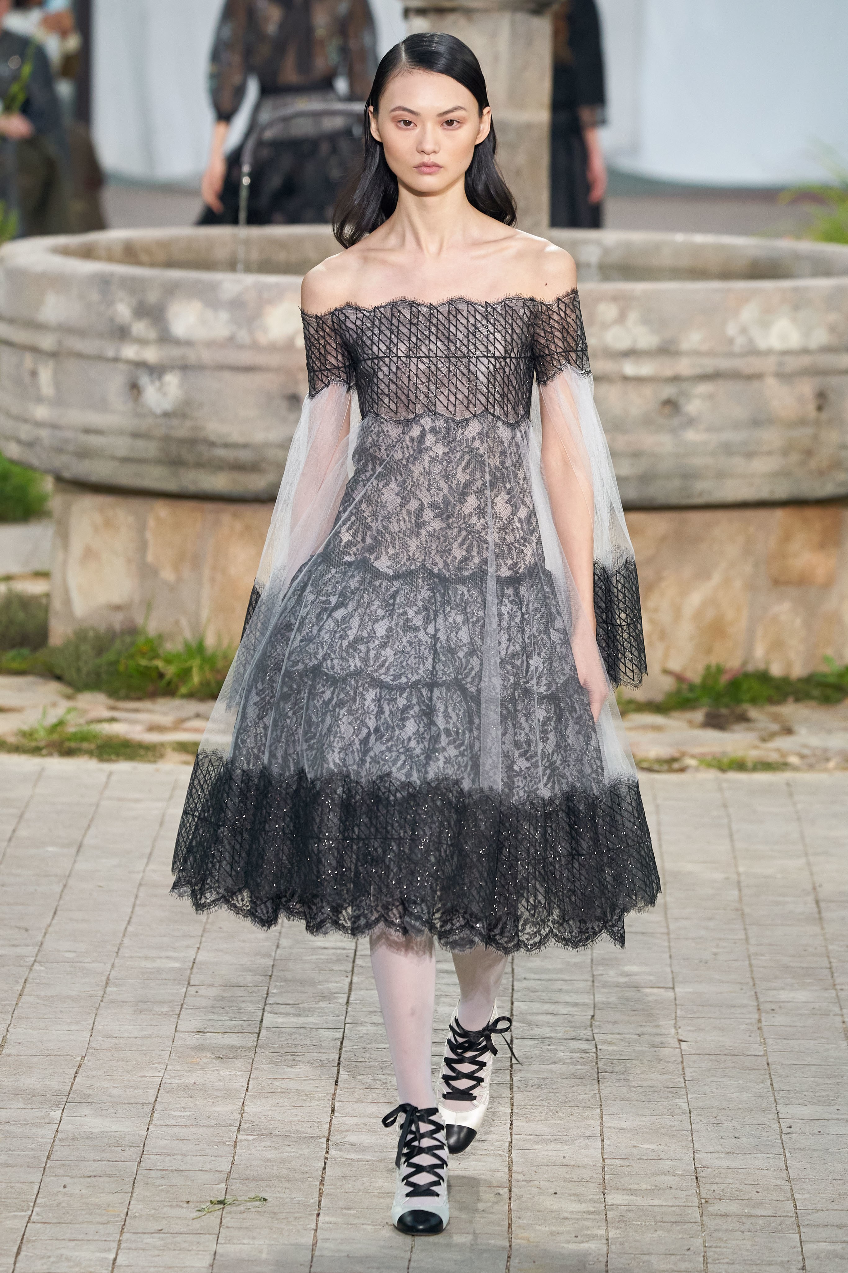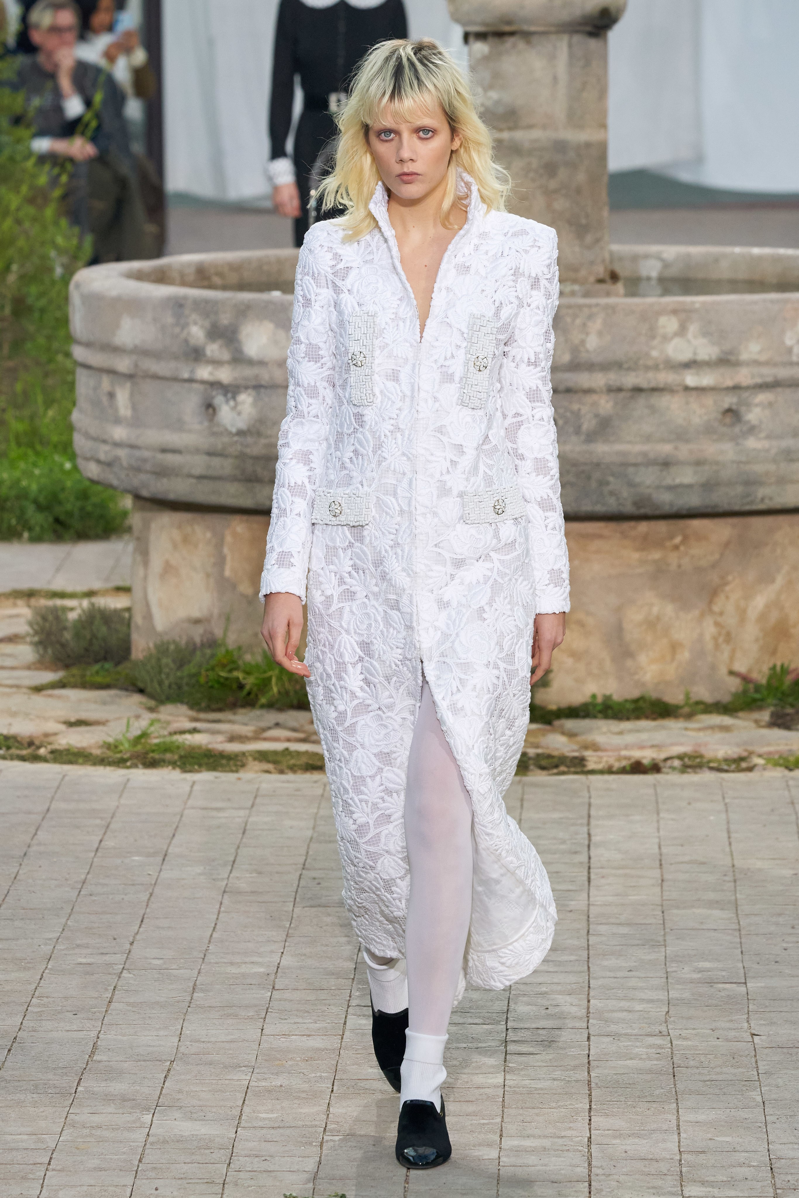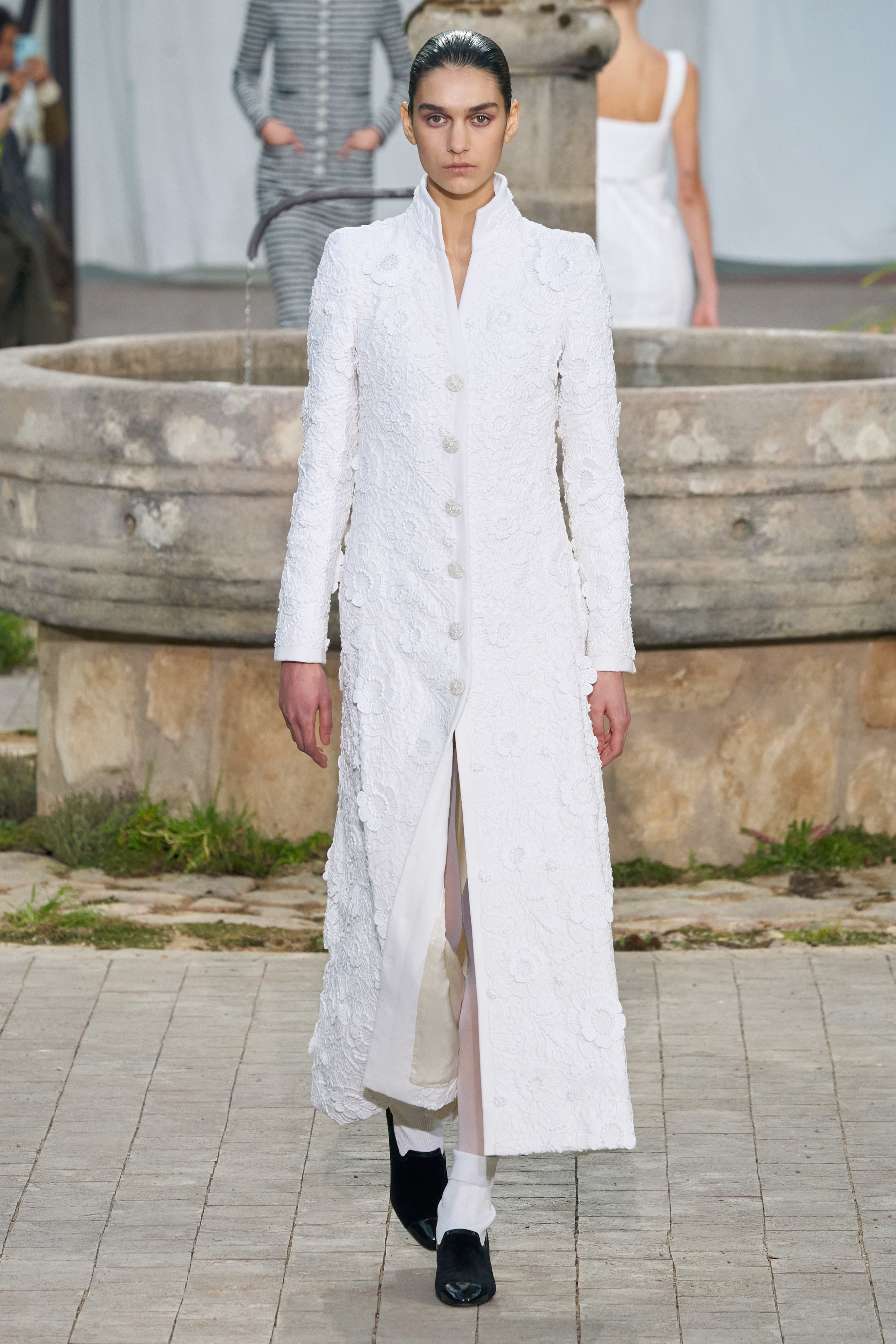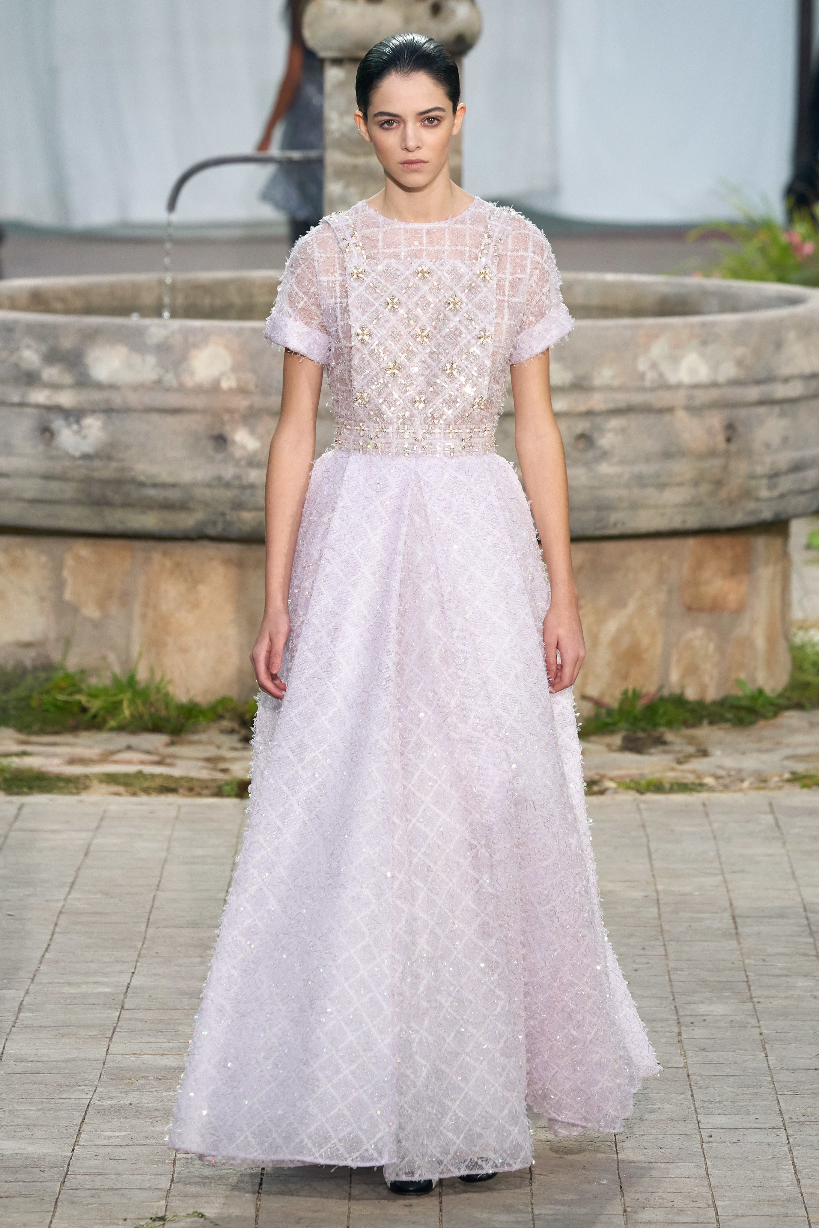Для нового показа Haute Couture преемница Карла Лагерфельда и креативный директор легендарного дома Виржини Виар решила воссоздать внутренний двор Обазинского аббатства, в котором Габриэль Шанель провела юность. Для этого в Гран-Пале потрудилась целая команда декораторов и конструкторов, и благодаря этому шоу получилось атмосферным и кинематографичным. В коллекцию вошли платья и костюмы с юбками, плащи и легкие пальто, но почти никаких брюк. Сама Коко утверждала, что нет ничего притягательнее, чем закрытое простое платье с воротничком, — Виржини Виар представила интеллигентную и изысканную версию такого наряда.