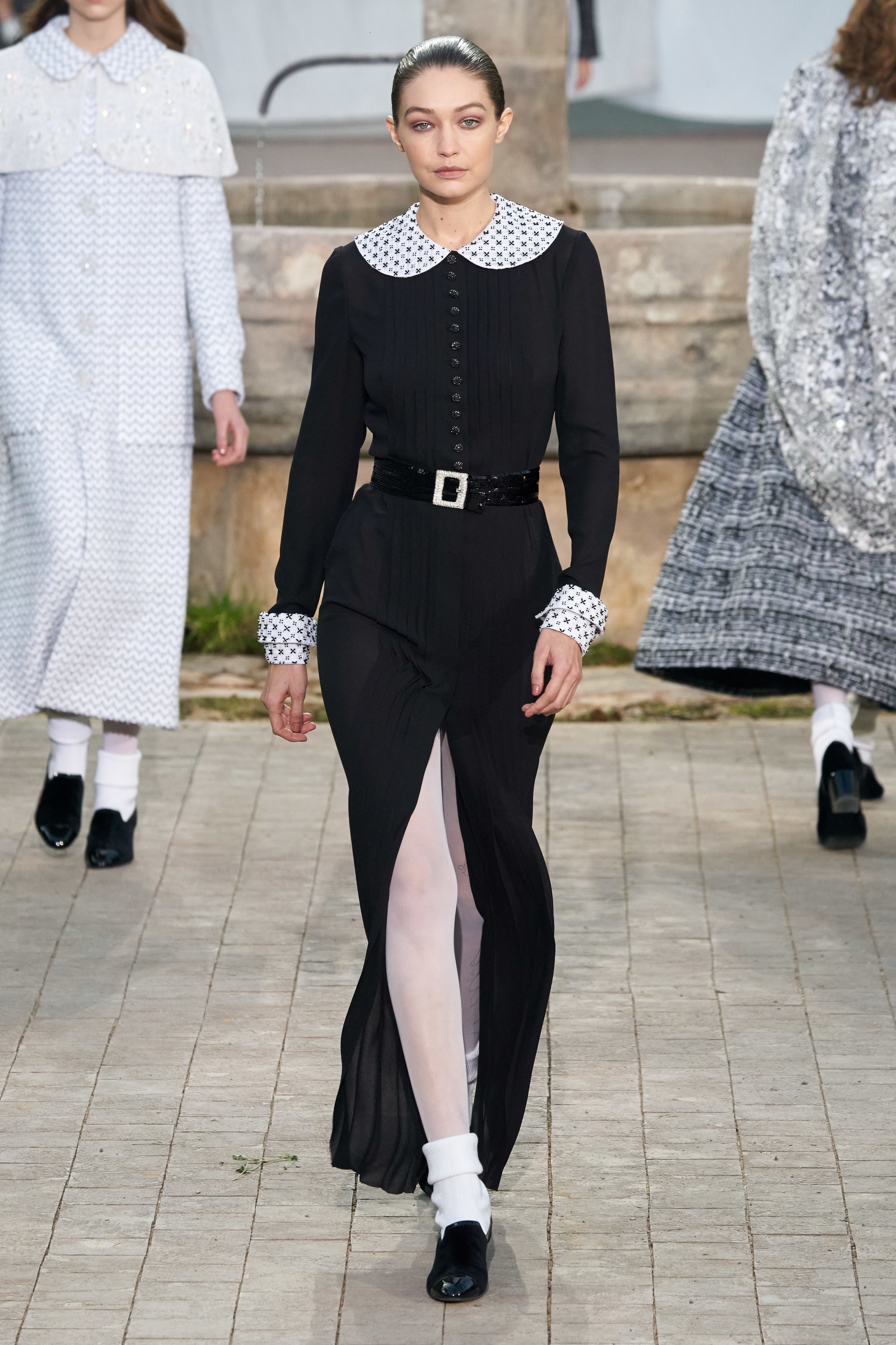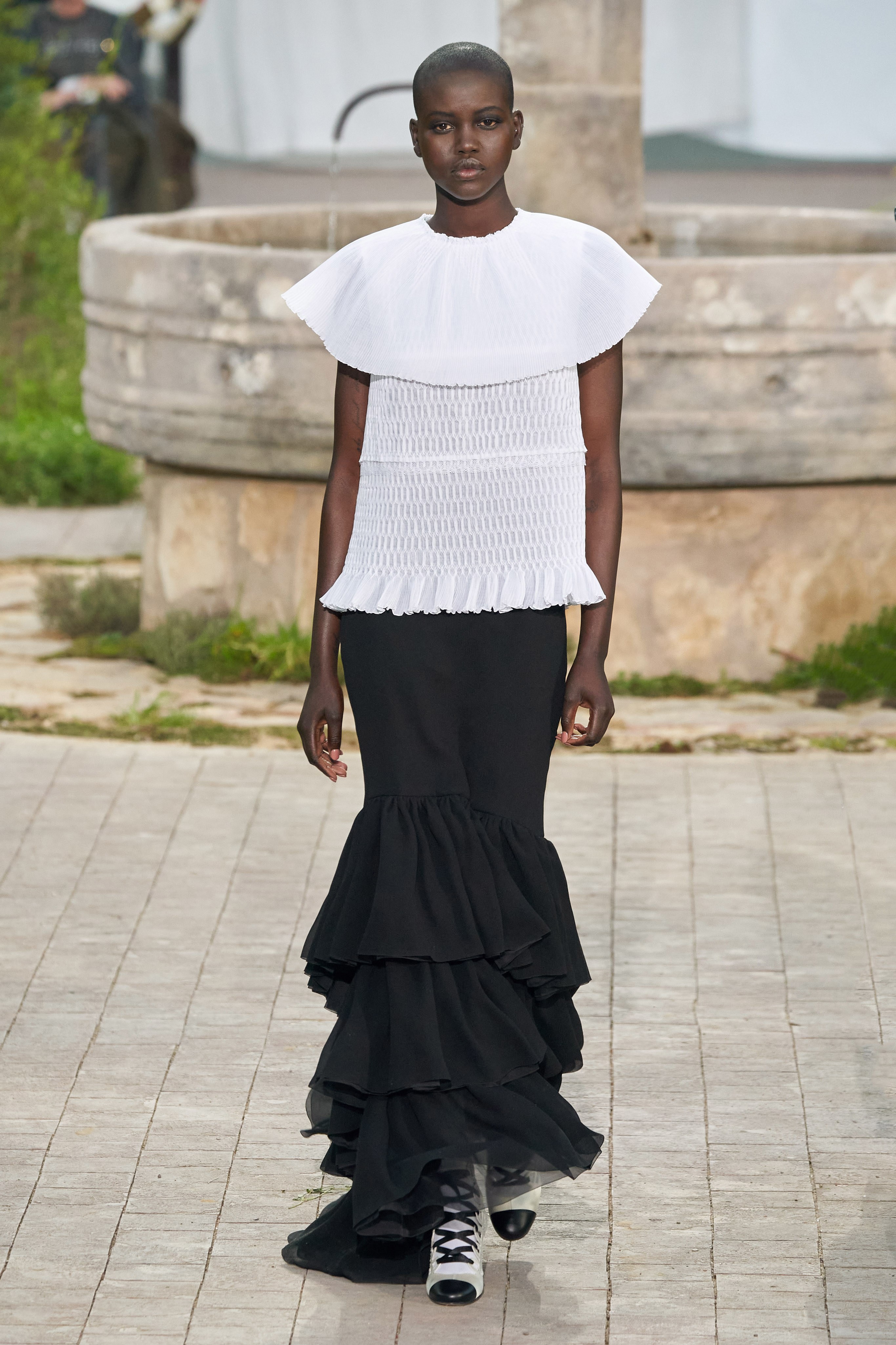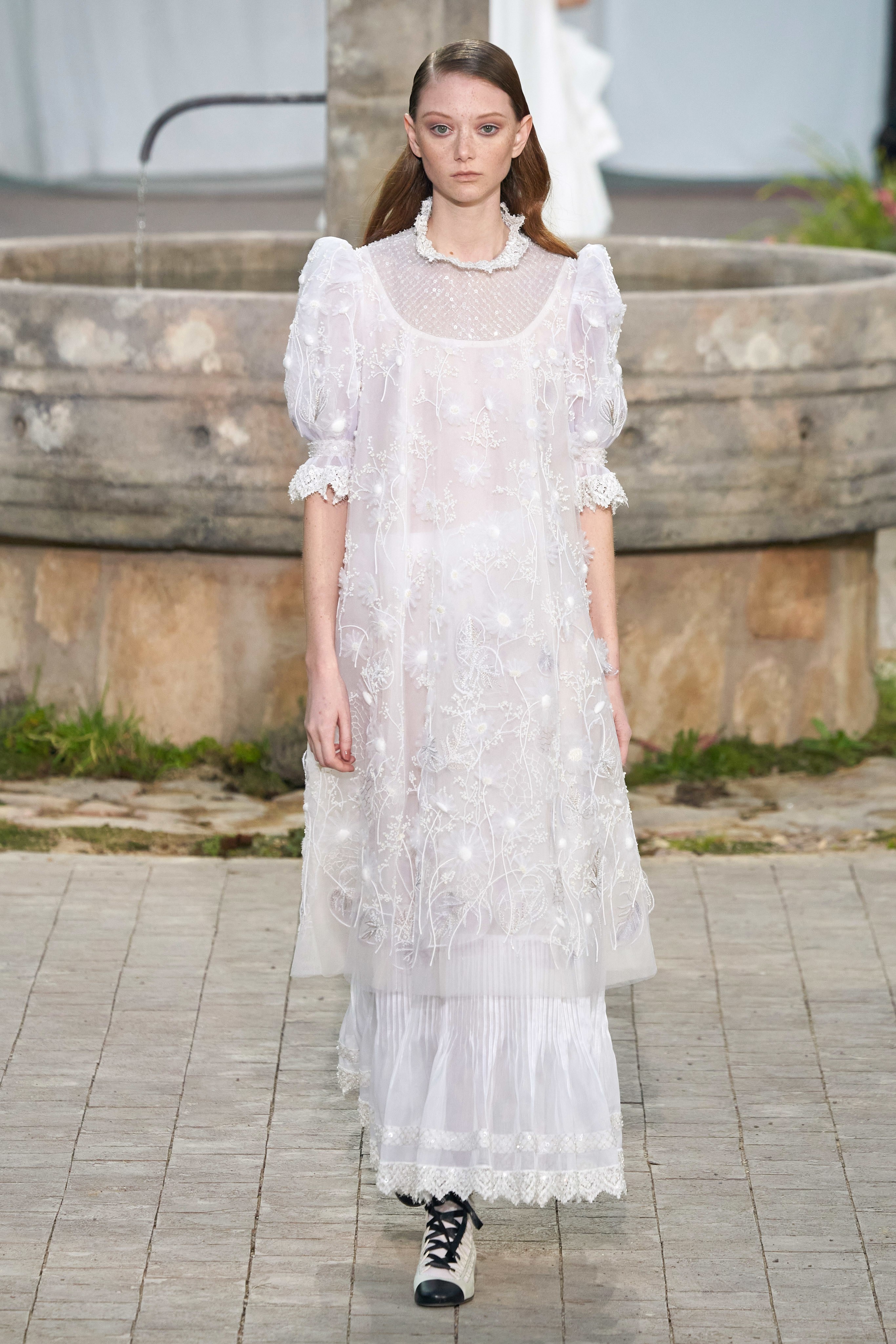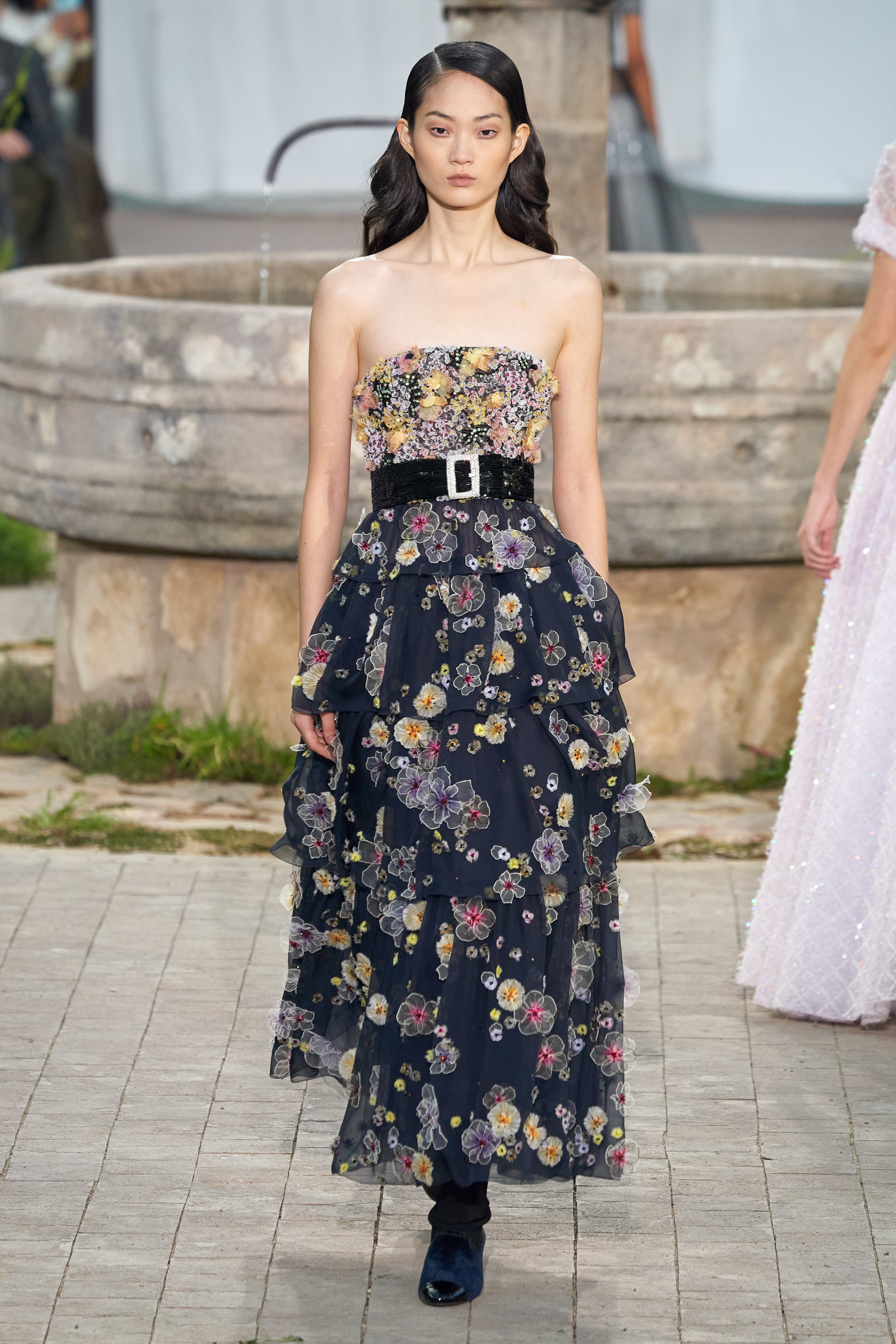 Для нового показа Haute Couture преемница Карла Лагерфельда и креативный директор легендарного дома Виржини Виар решила воссоздать внутренний двор Обазинского аббатства, в котором Габриэль Шанель провела юность. Для этого в Гран-Пале потрудилась целая команда декораторов и конструкторов, и благодаря этому шоу получилось атмосферным и кинематографичным. В коллекцию вошли платья и костюмы с юбками, плащи и легкие пальто, но почти никаких брюк. Сама Коко утверждала, что нет ничего притягательнее, чем закрытое простое платье с воротничком, — Виржини Виар представила интеллигентную и изысканную версию такого наряда.