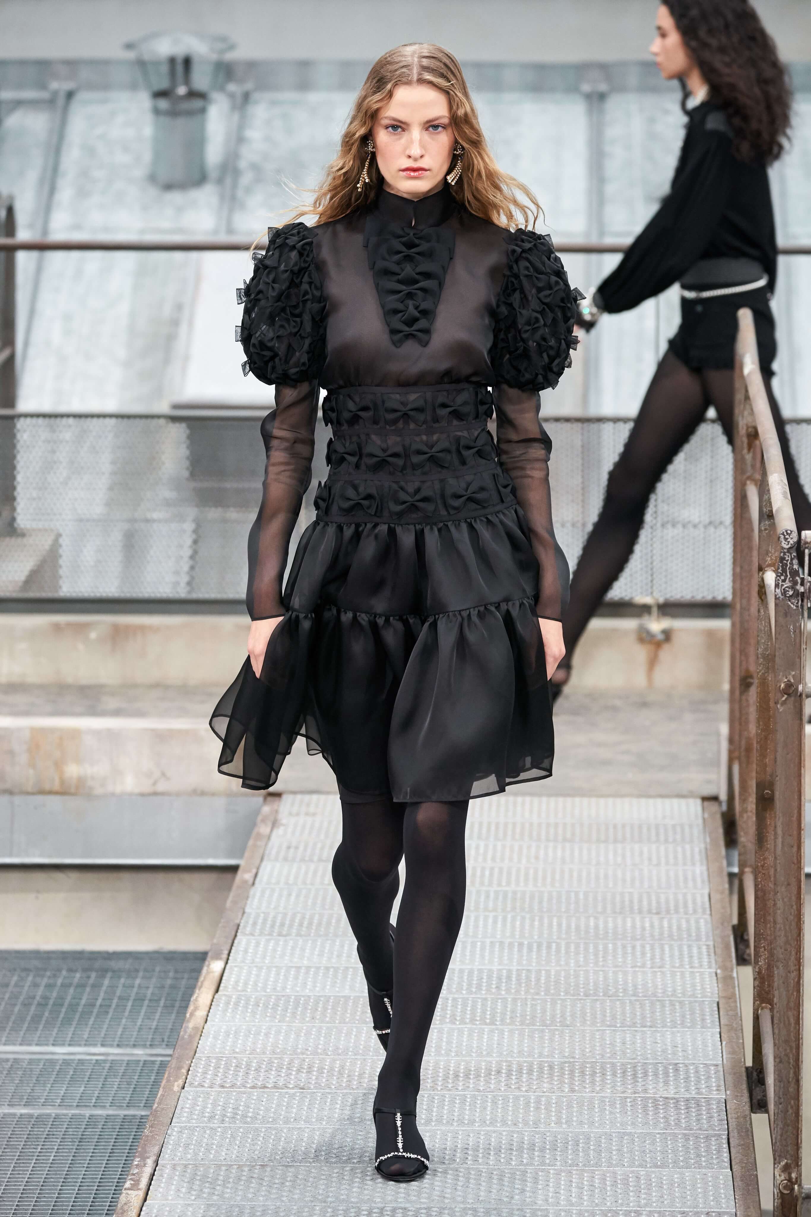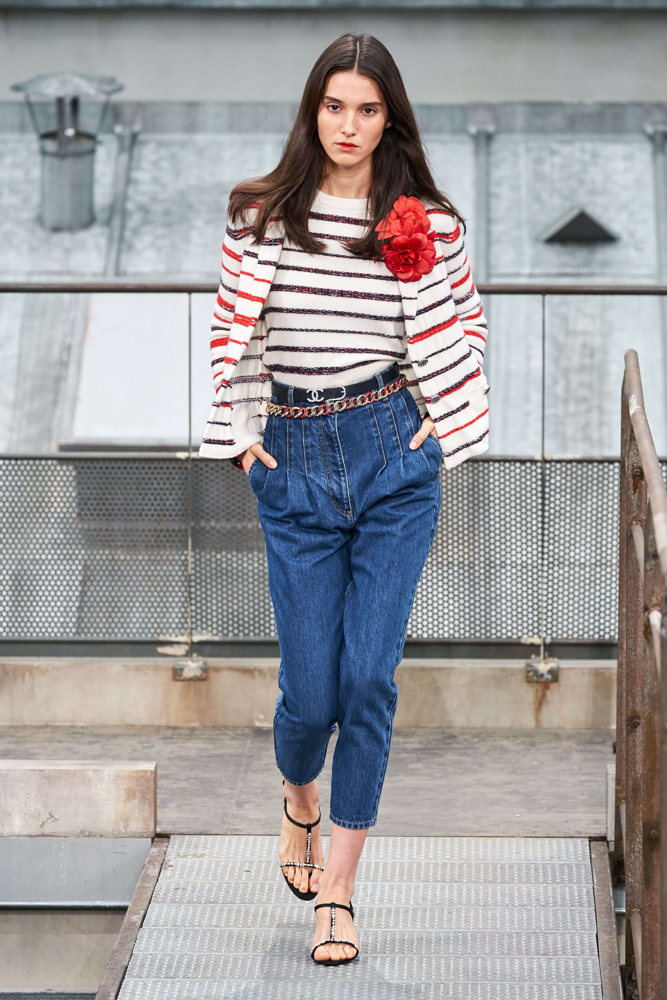 Среди выстроенных в Гран-Пале конструкций модели выходили в платьях, джемперах и топах в бретонскую полоску, твидовых комбинезонах с лацканами, как на мужских пиджаках, костюмах из денима с пышными рукавами, обшитыми рюшами на испанский манер, и вечерних платьях с карманами. В волосы девушек были вплетены цветы, а кое-где головы покрывали шляпки — это выглядело по-особенному романтично в сочетании с пышными топами из тюля и широкими юбками.