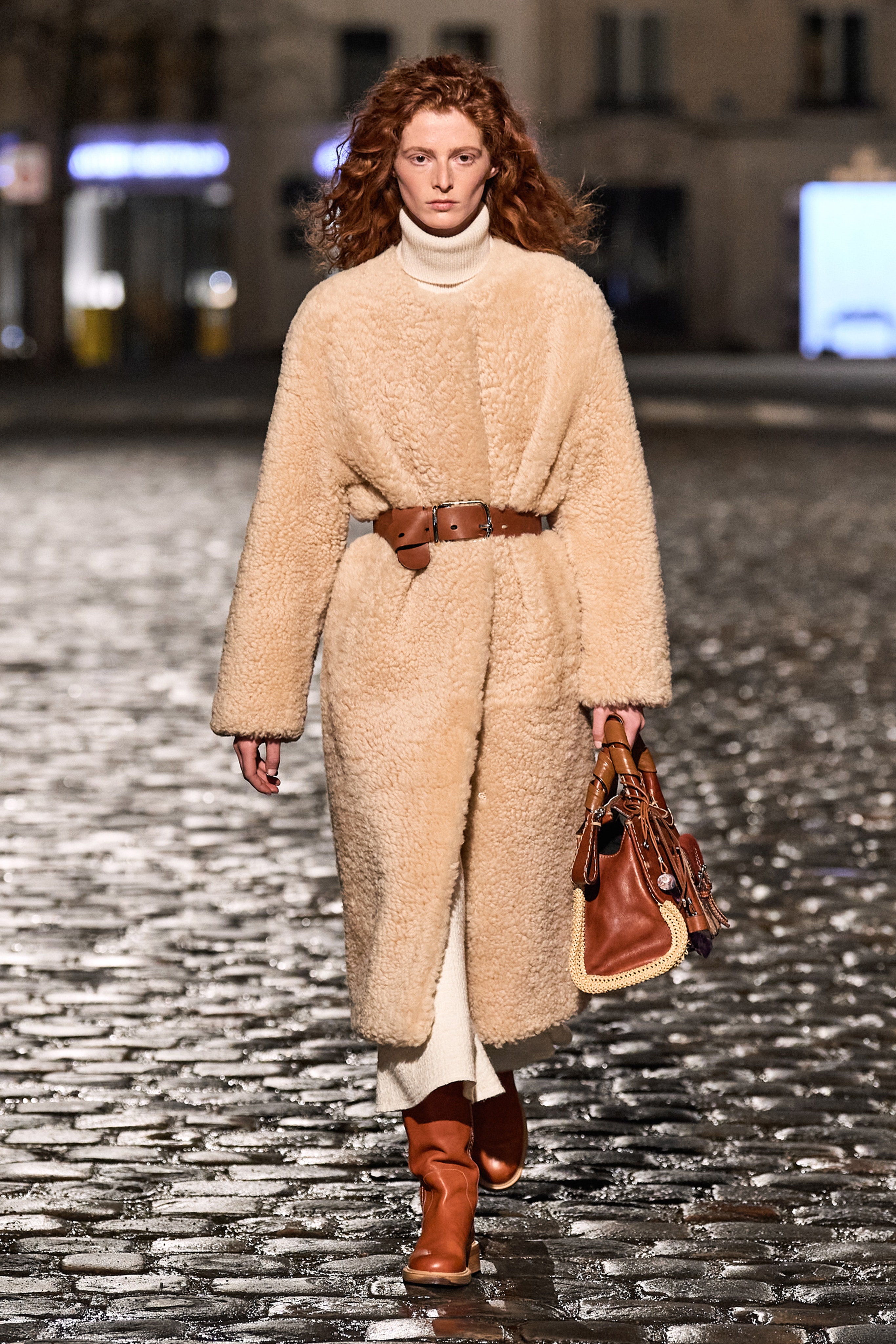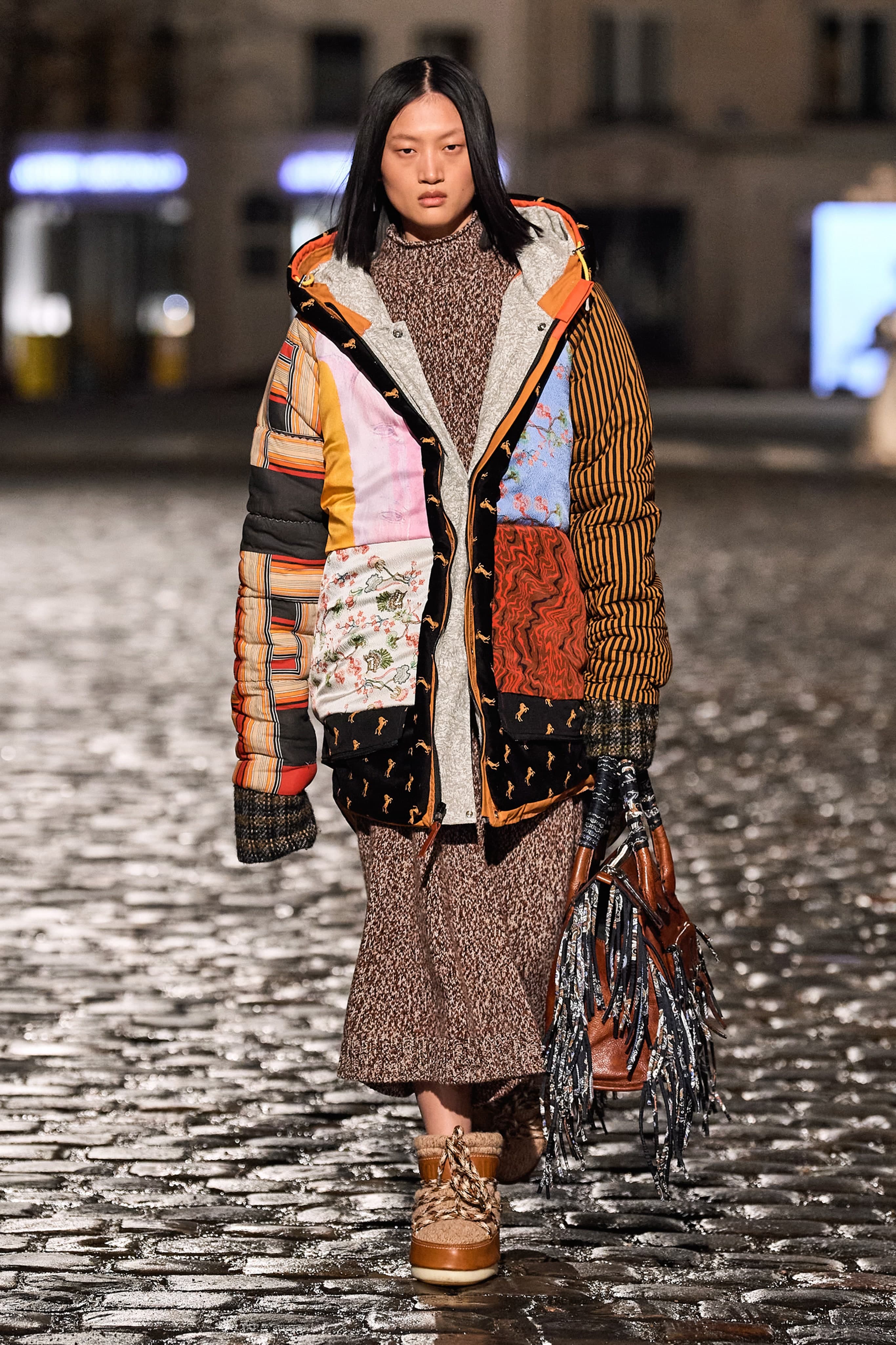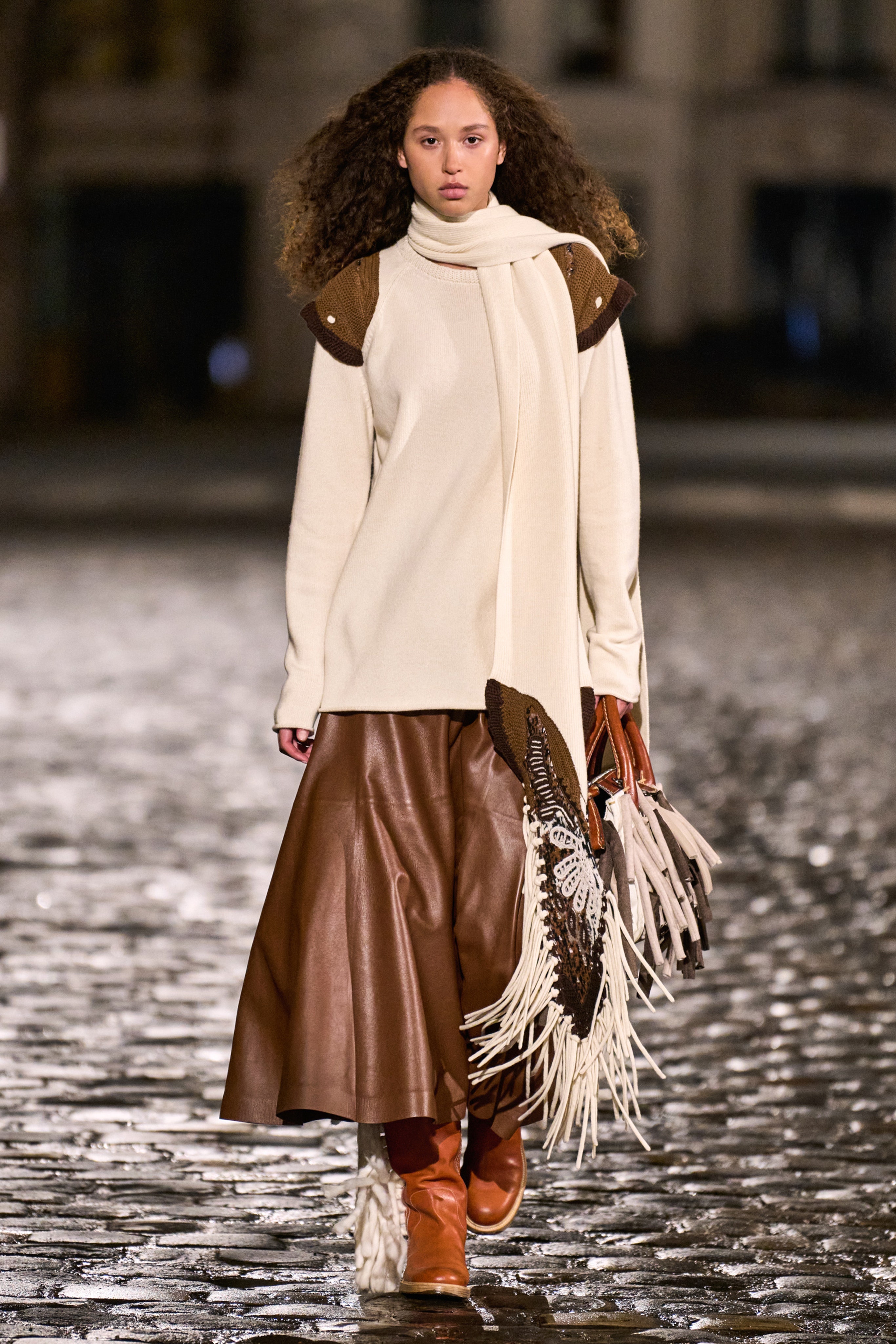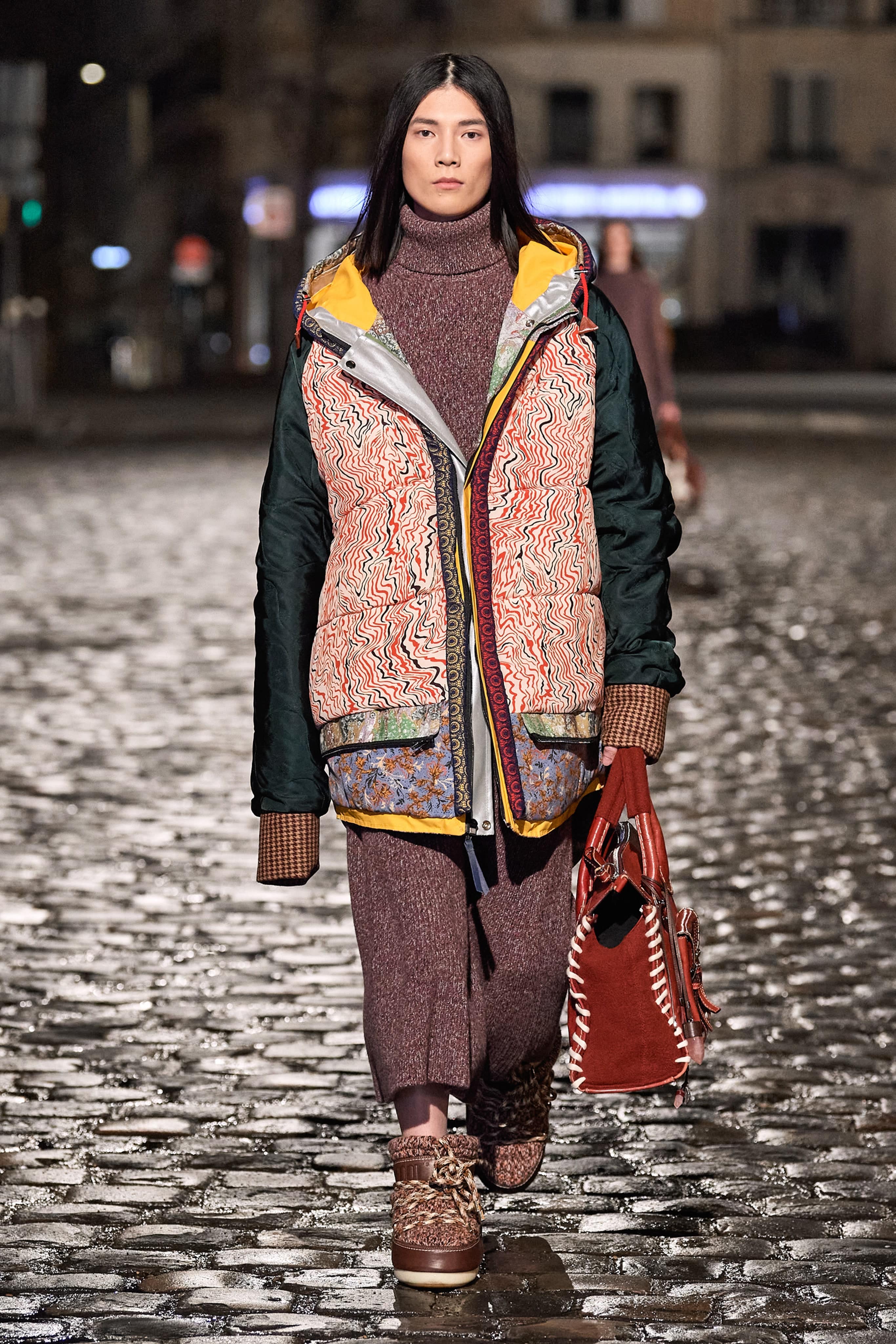 Для работы над коллекцией команда дизайнера собрала целый ворох винтажных вещей, которые были переработаны и кастомизированы. Габриэла также обратилась к архивным предметам, созданным предыдущими креативными директорами дома, и так на свет появилась мини-версия сумки, созданной когда-то Фиби Файло. Основу осеннего гардероба Chloé в исполнении Херст составили пончо в полоску, платья из переработанного кашемира, дубленые пальто и пуховики, сшитые из текстильных остатков. Также в коллекцию вошли тренчи из кожи, напоминающей чешую благодаря сложной технике пэчворк, платья из кожи с резными деталями и сложносочиненные сарафаны на бретелях, сшитые из нескольких видов ткани.