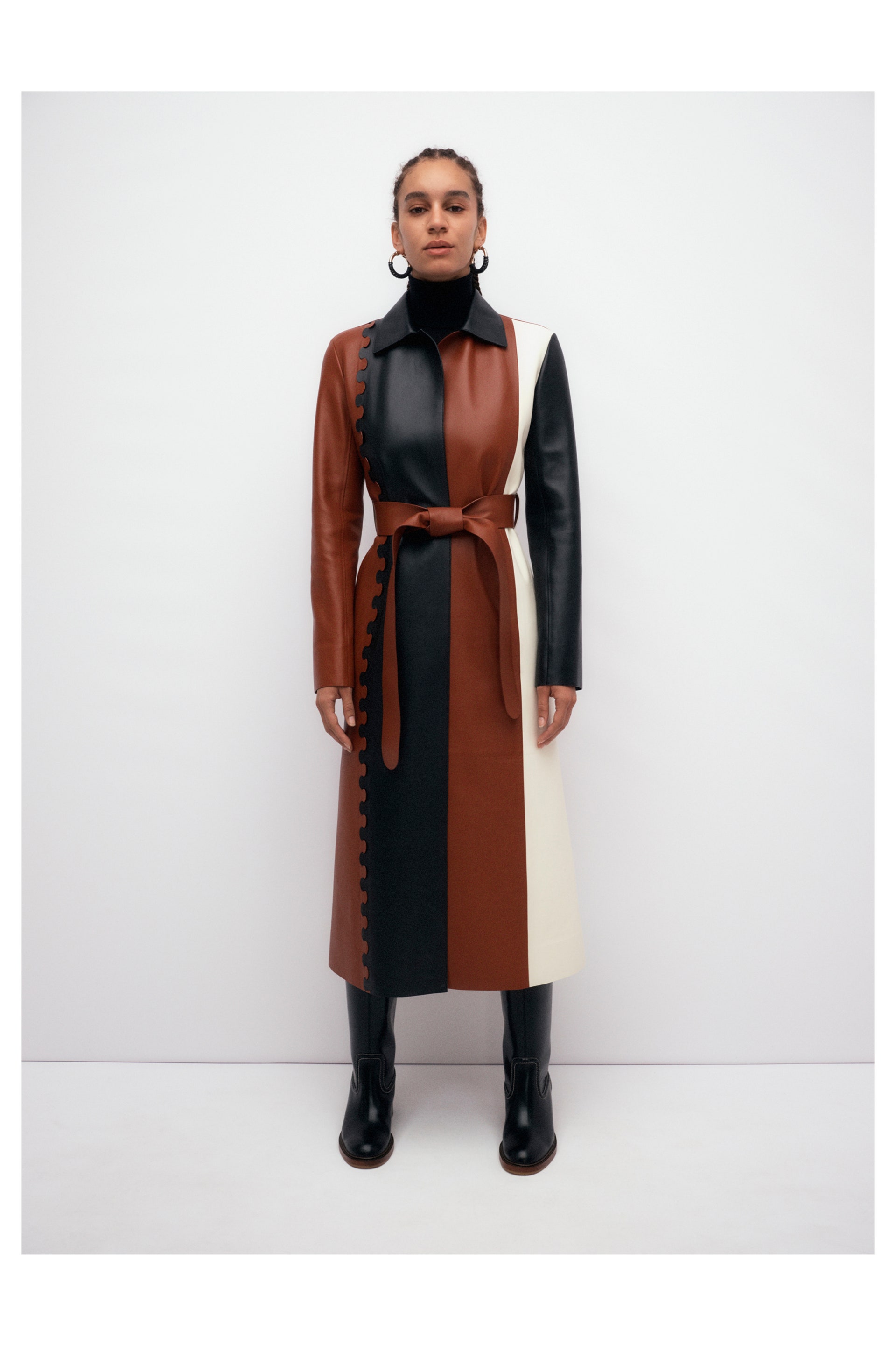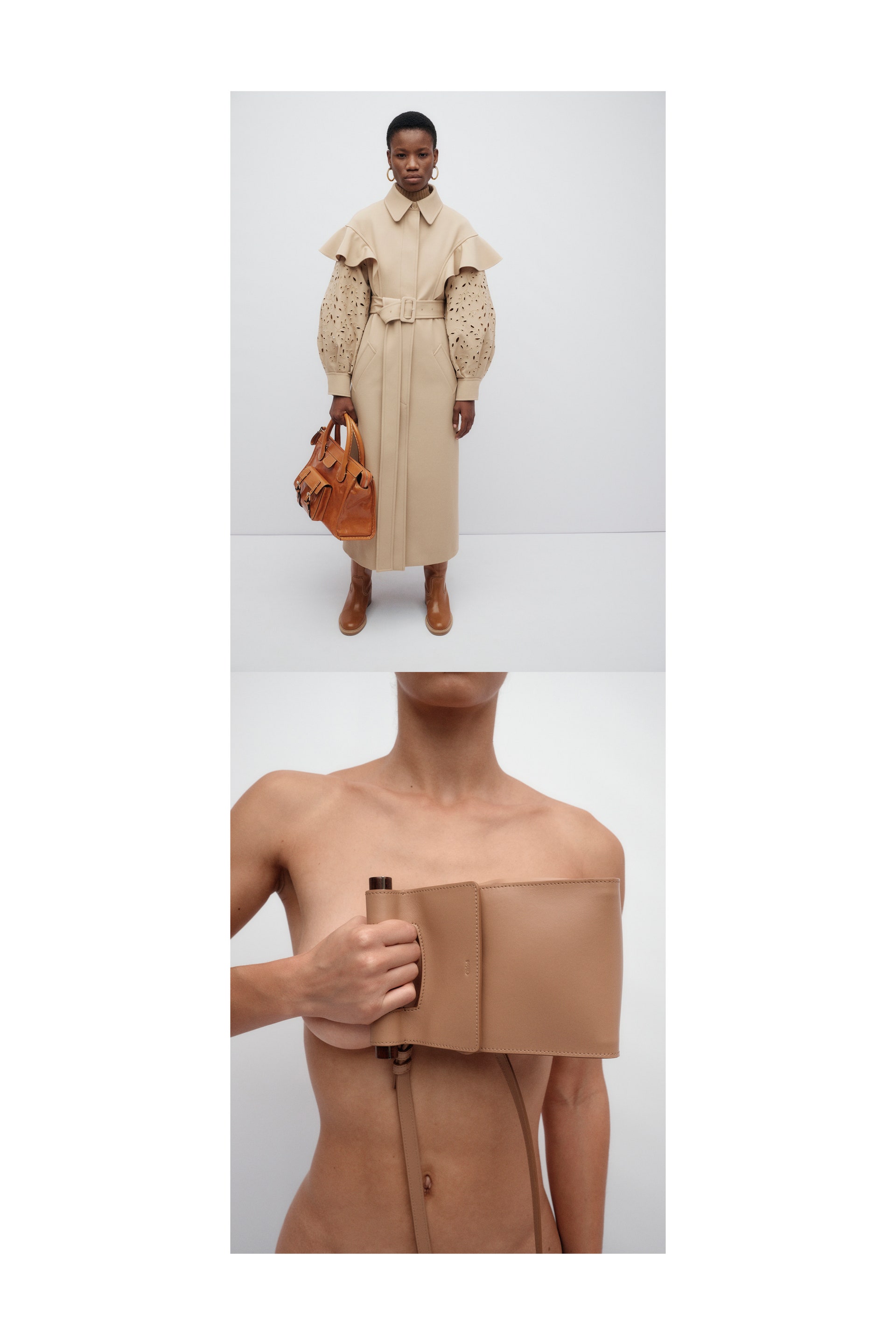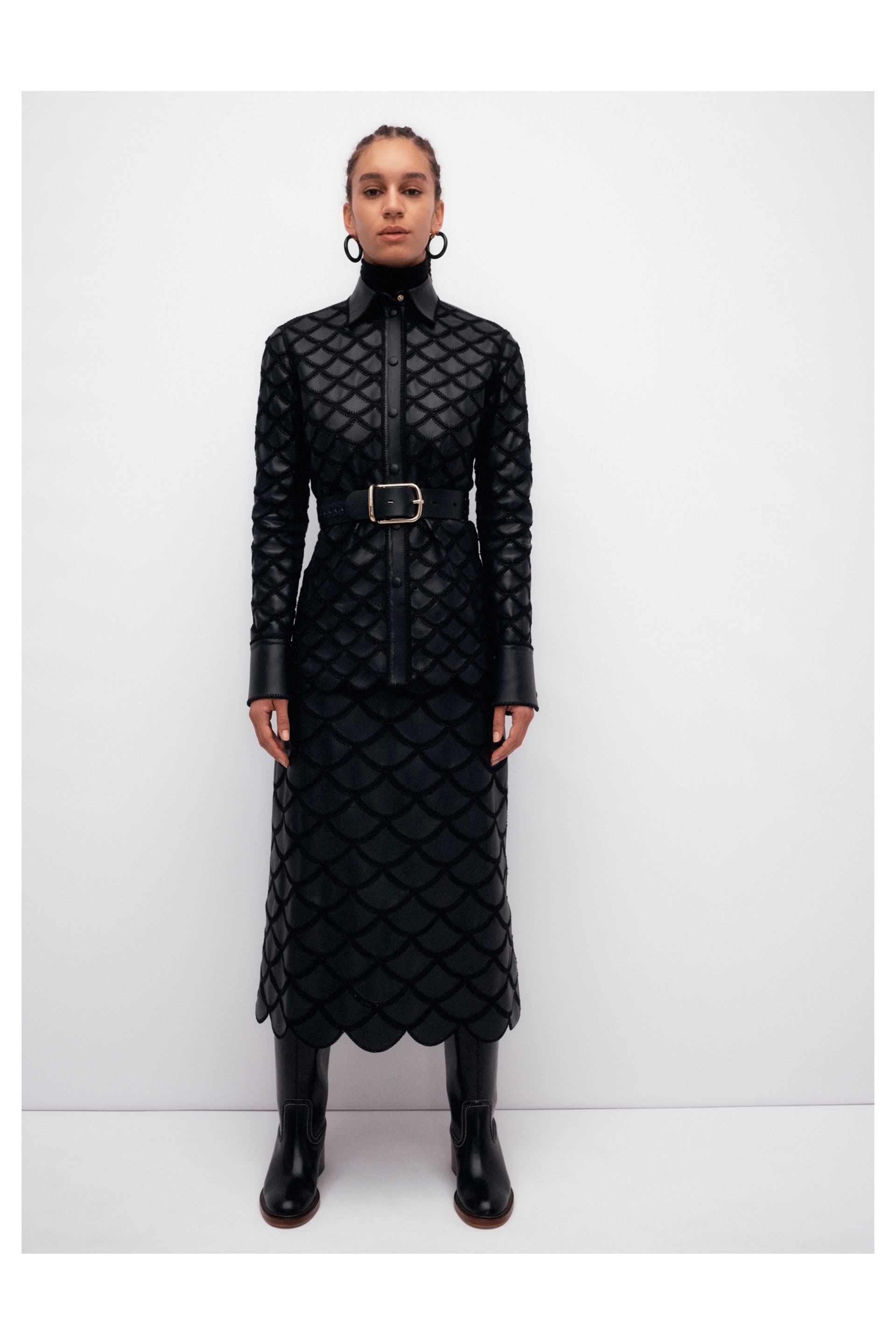 В линию аксессуаров Херст добавила ремни с увеличенными пряжками, найденными в архивах дома Chloé, массивные колье и чокеры в южном стиле, вязаные кроссовки и сланцы. В лукбуке также можно заметить фирменные пончо, связанные вручную южными мастерицами, трехцветные устойчивые плащи и сарафаны с вышивкой. Свою работу Херст продолжает выполнять по всем заветам устойчивости. Так, идеально скроенный брючный костюм выполнен из биоразлагаемого денима, юбки и свитеры из мериносовой шерсти окрашены при помощи растительных красителей, а все кожаные изделия коллекции выполнены из отходов мясного производства (для получения сырья животных не убивают, а полученная кожа сертифицирована строжайшим образом).