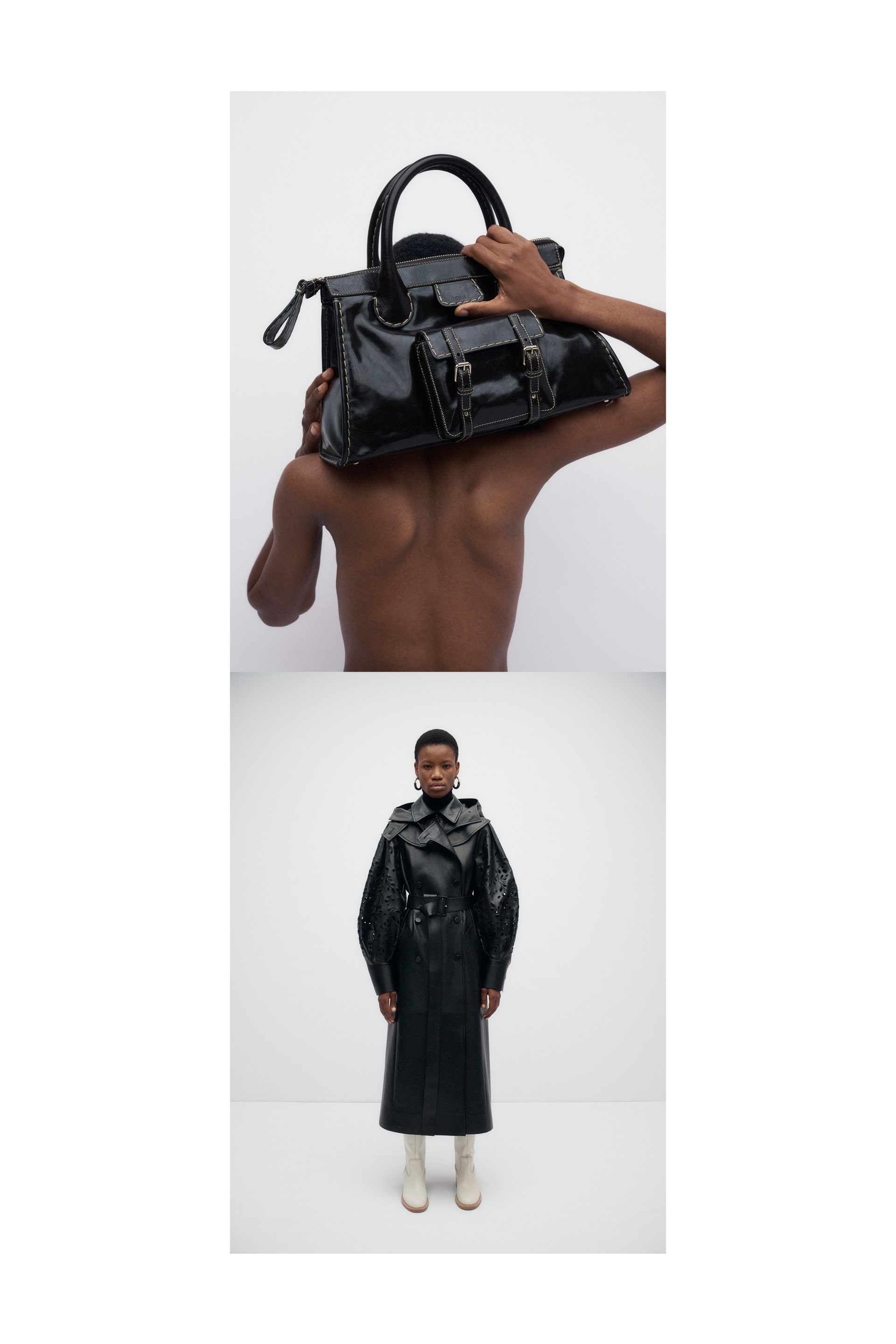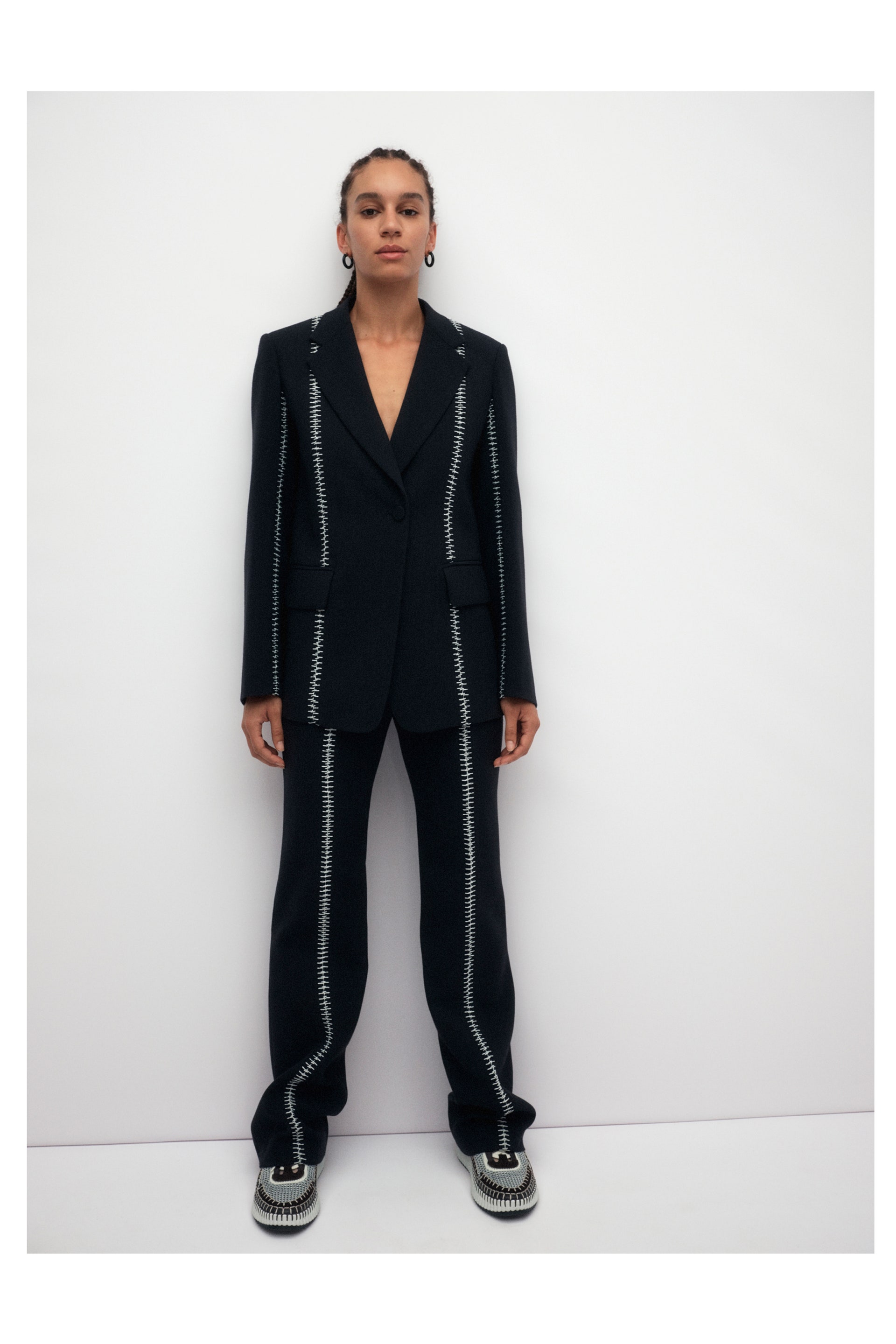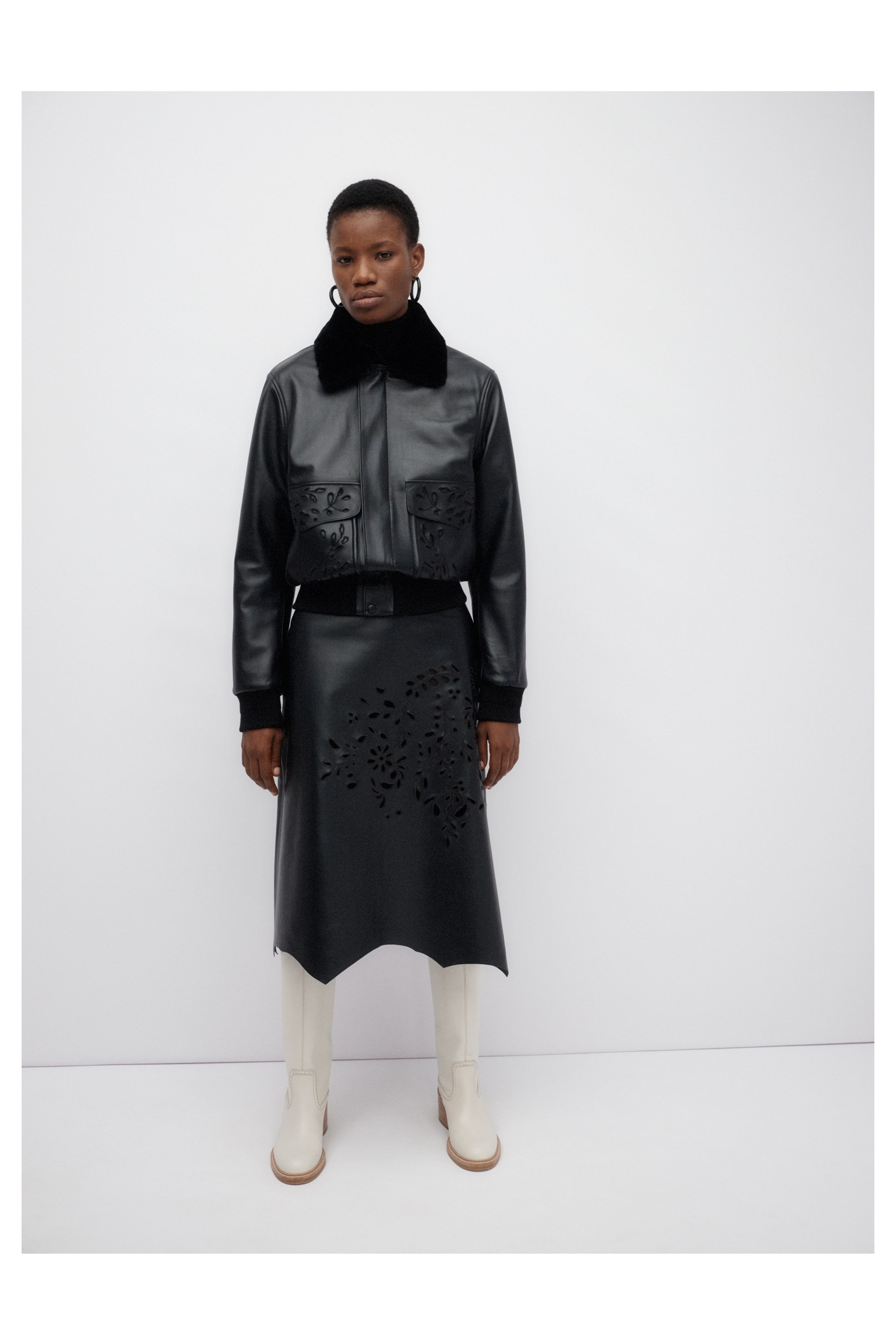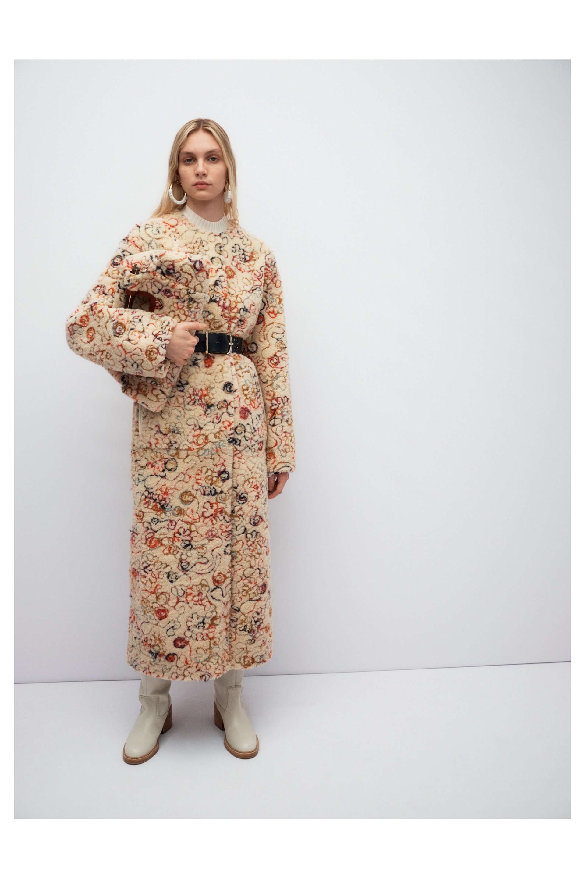 В линию аксессуаров Херст добавила ремни с увеличенными пряжками, найденными в архивах дома Chloé, массивные колье и чокеры в южном стиле, вязаные кроссовки и сланцы. В лукбуке также можно заметить фирменные пончо, связанные вручную южными мастерицами, трехцветные устойчивые плащи и сарафаны с вышивкой. Свою работу Херст продолжает выполнять по всем заветам устойчивости. Так, идеально скроенный брючный костюм выполнен из биоразлагаемого денима, юбки и свитеры из мериносовой шерсти окрашены при помощи растительных красителей, а все кожаные изделия коллекции выполнены из отходов мясного производства (для получения сырья животных не убивают, а полученная кожа сертифицирована строжайшим образом).