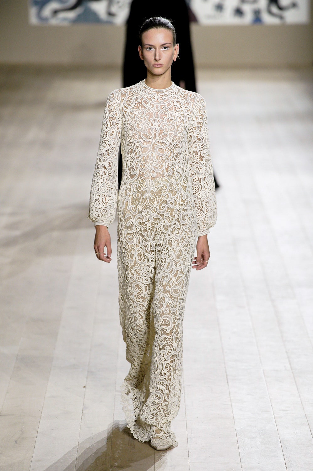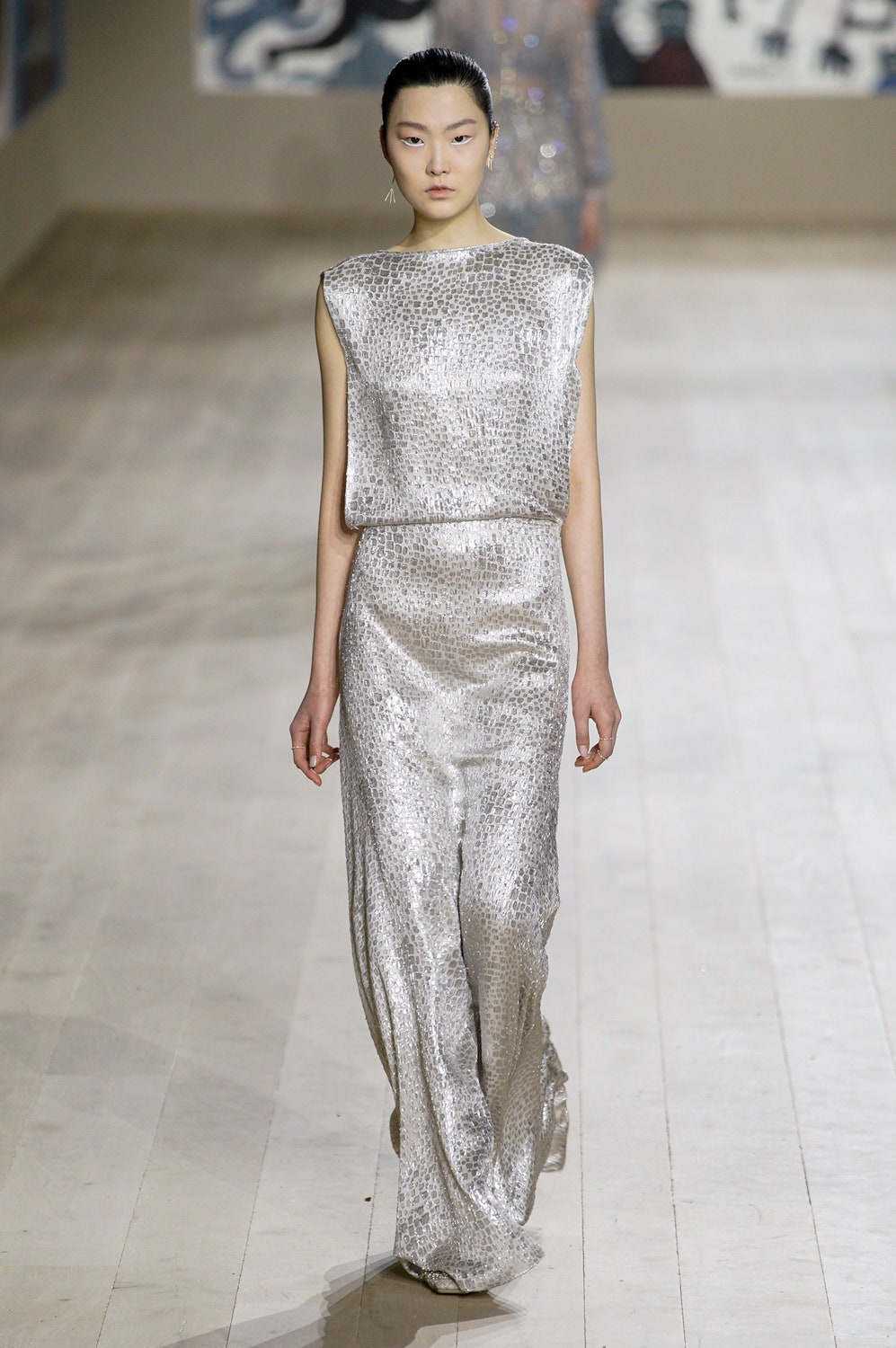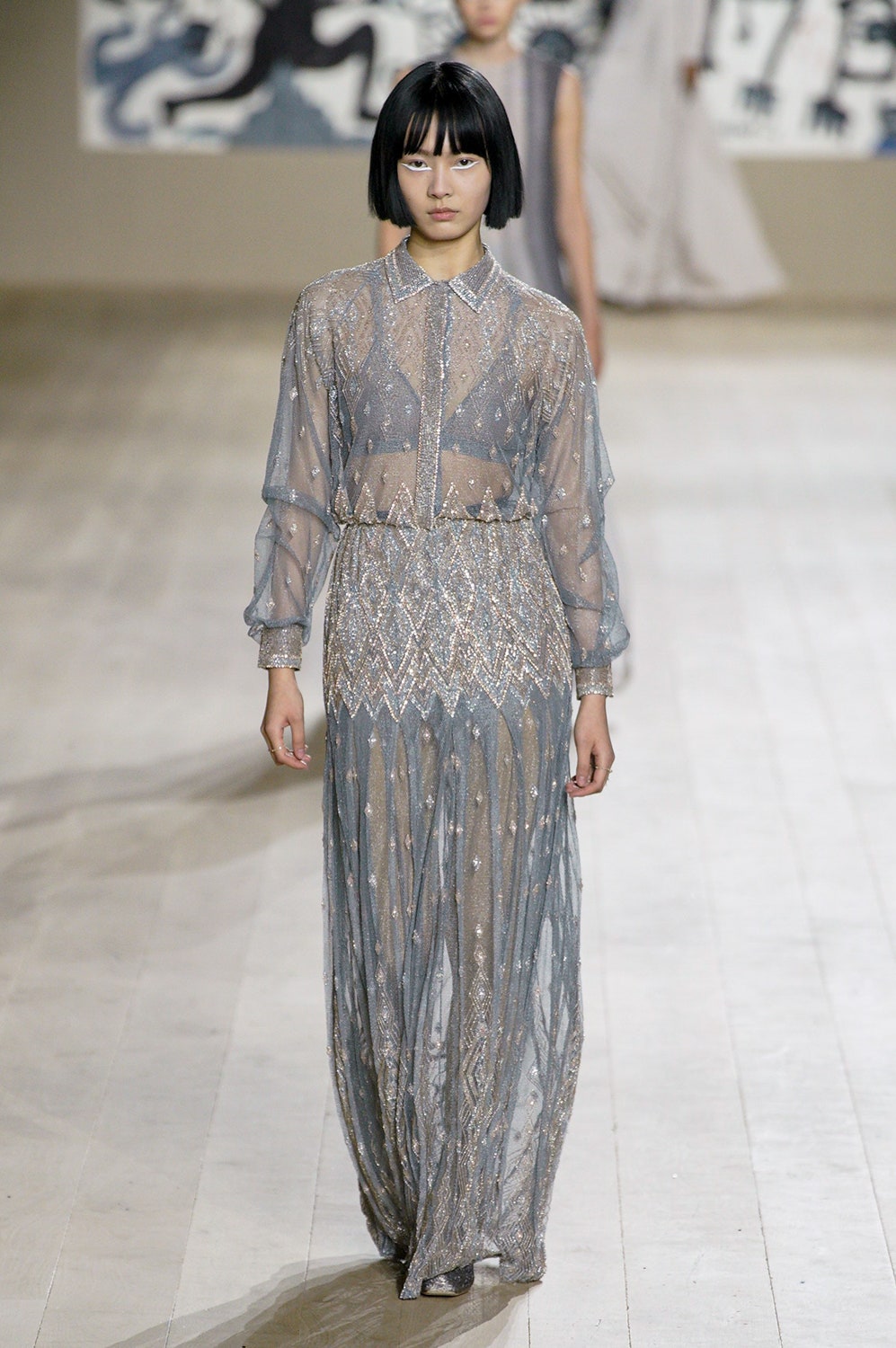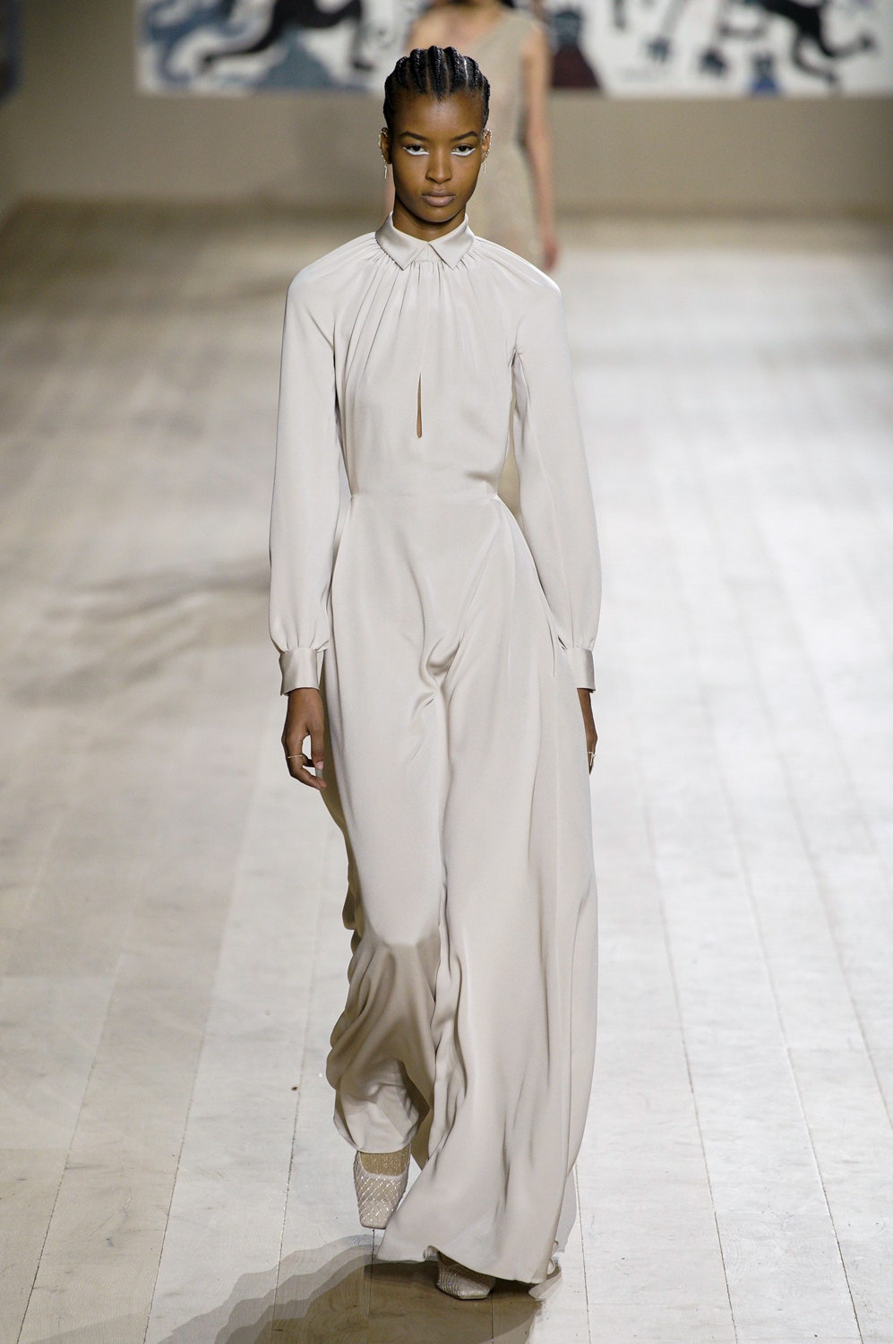 Молочные и кремовые пальто, брюки и платья коллекции скроены настолько идеально, что к ним не хочется ничего добавить, однако соседствовали на подиуме они вместе с роскошными тренчами в мириадах вышивки, мерцающими вечерними платьями и эфемерными блузами из тонкого шелка сложной фактуры. Шоу прошло в саду музея Родена, а декорациями к нему послужили красочные гобелены художниц Мадхви и Ману Парех из ремесленной школы Чанакья — их создавали вручную 380 мастеров, а их площадь — 340 квадратных метров.