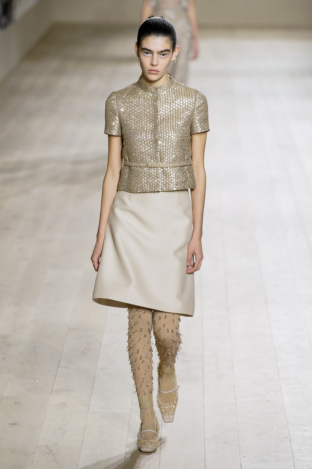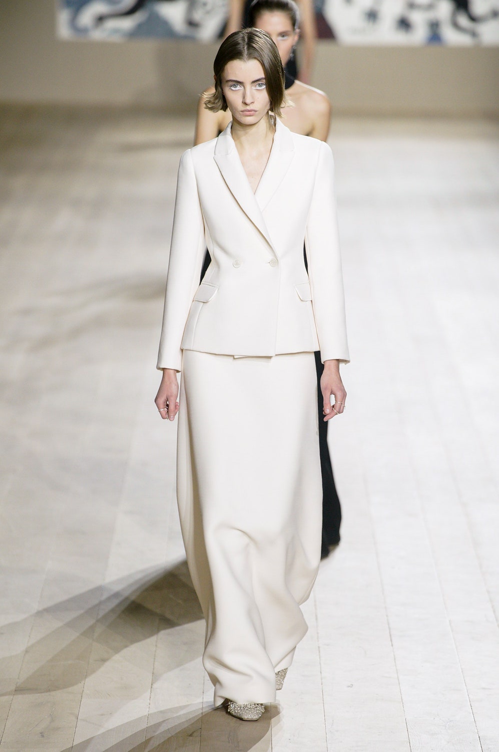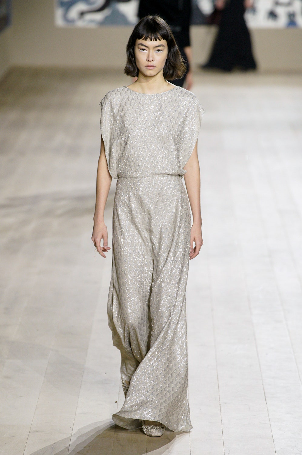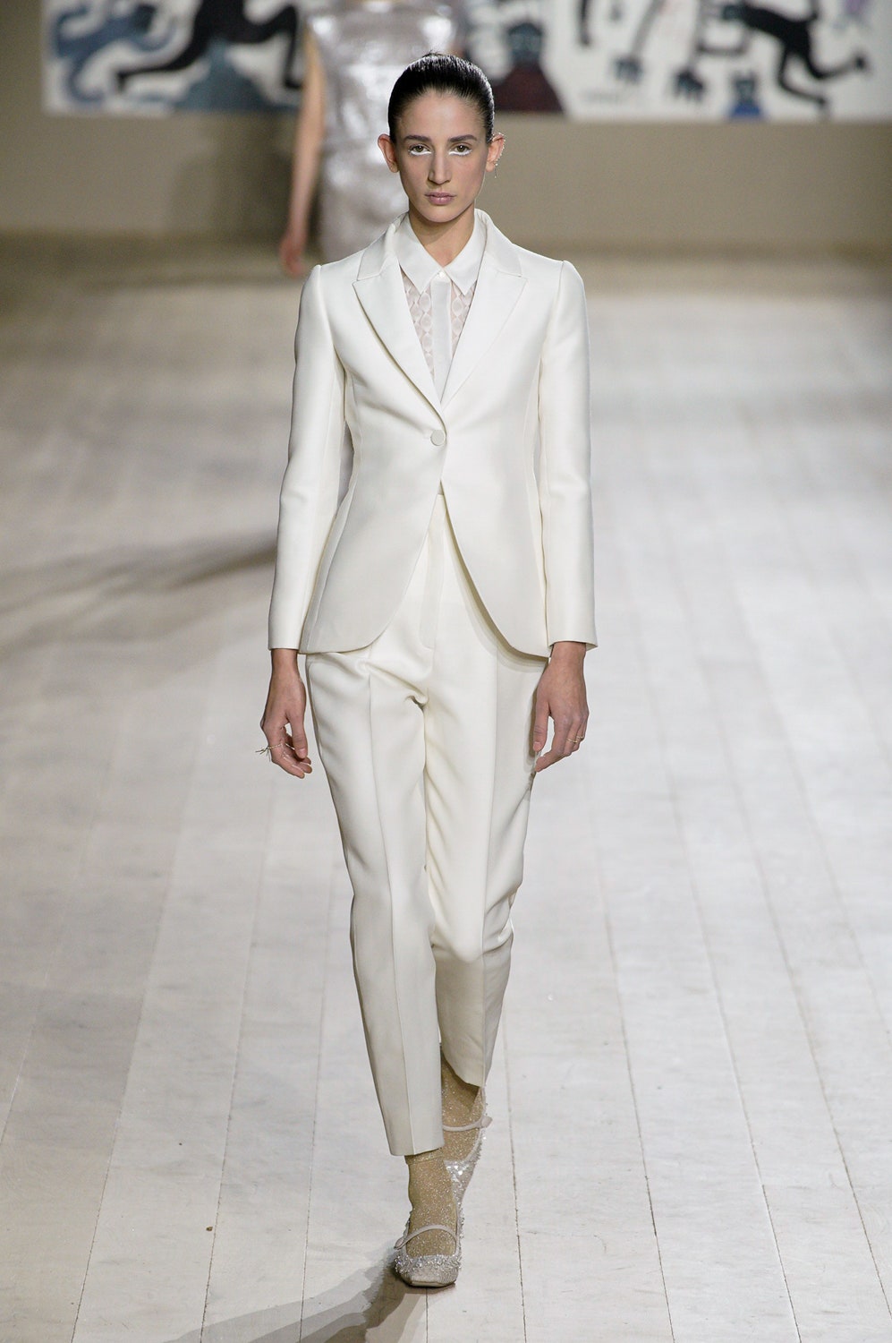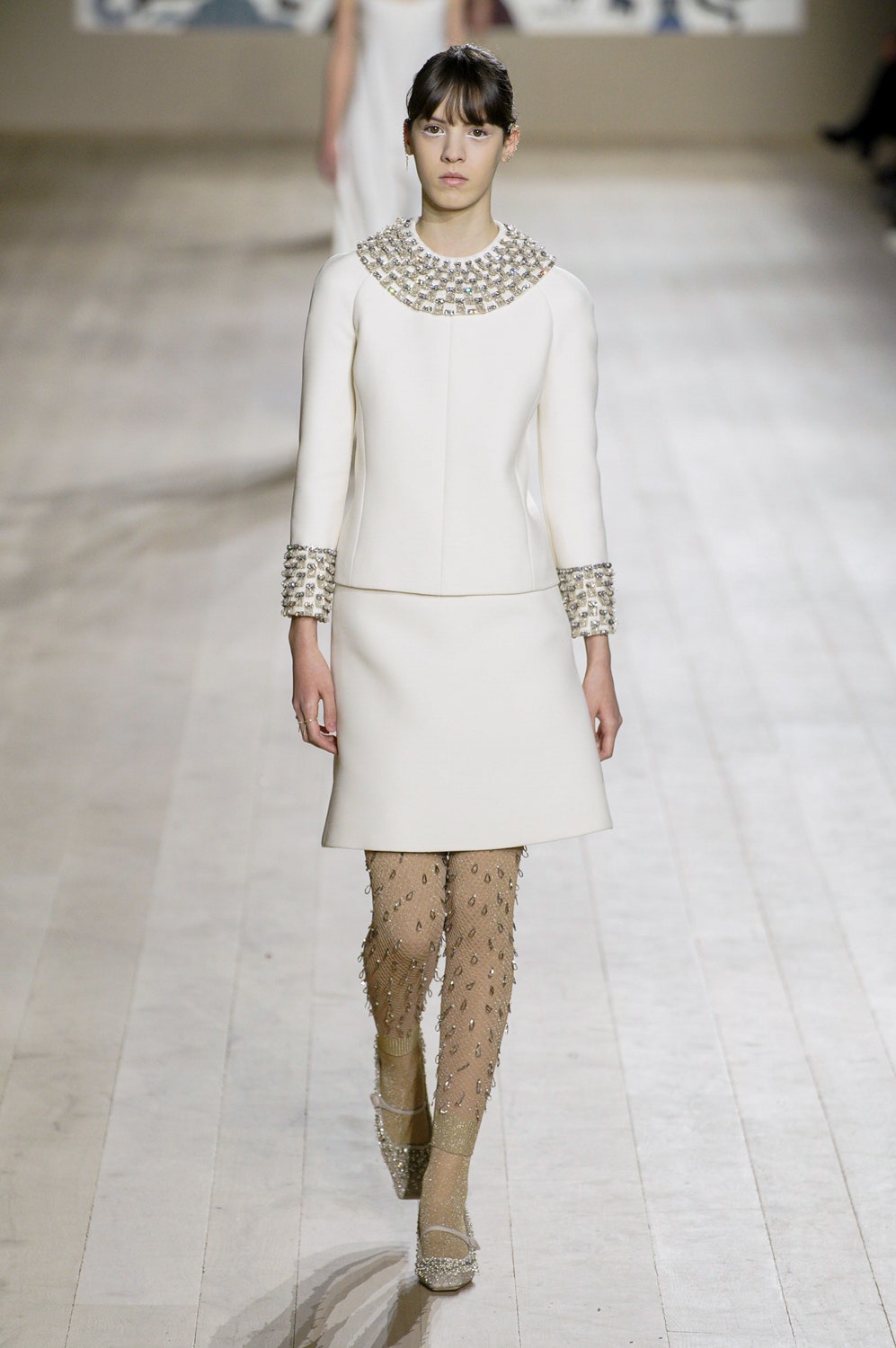 Мария Грация Кьюри представила коллекцию от-кутюр для Christian Dior и на этот раз решила не подчинять ее какой-либо концепции, а сосредоточиться на высоком мастерстве и простых силуэтах. В видимой простоте по задумке Кьюри и кроются детали высокого искусства ручного труда. Так, на моделях были плиссированные кейпы и юбки, строчки на которых едва заметны при ближайшем рассмотрении, усеянные сотнями кристаллов платья и наряды, имитирующие раздельные комплекты (как, например, черное шелковое платье, которое кажется юбкой и топом). Показ открыла модель в геометрическом боди, расшитом серебряной нитью, а закрыла модель в платье-сетке, усеянном "каплями"-кристаллами, — такими же оказались расшиты и колготки, которые могут стать must have этой весны. Главным предметом коллекции стал жакет-бар, возведенный в культ самим Кристианом Диором.