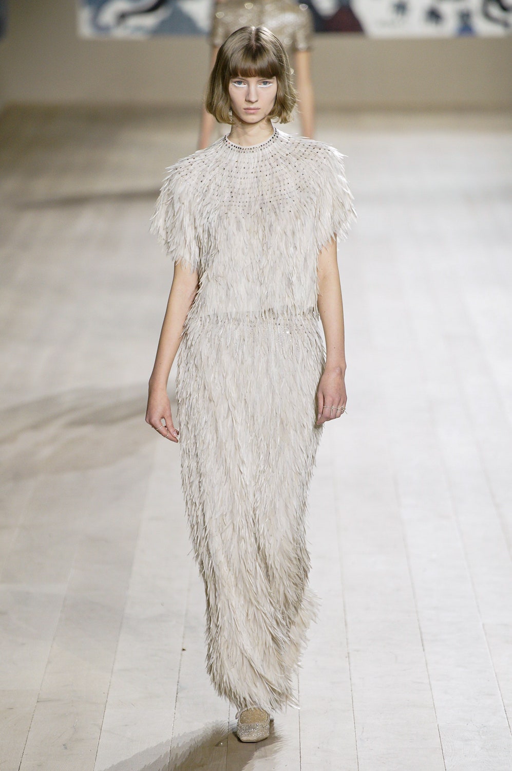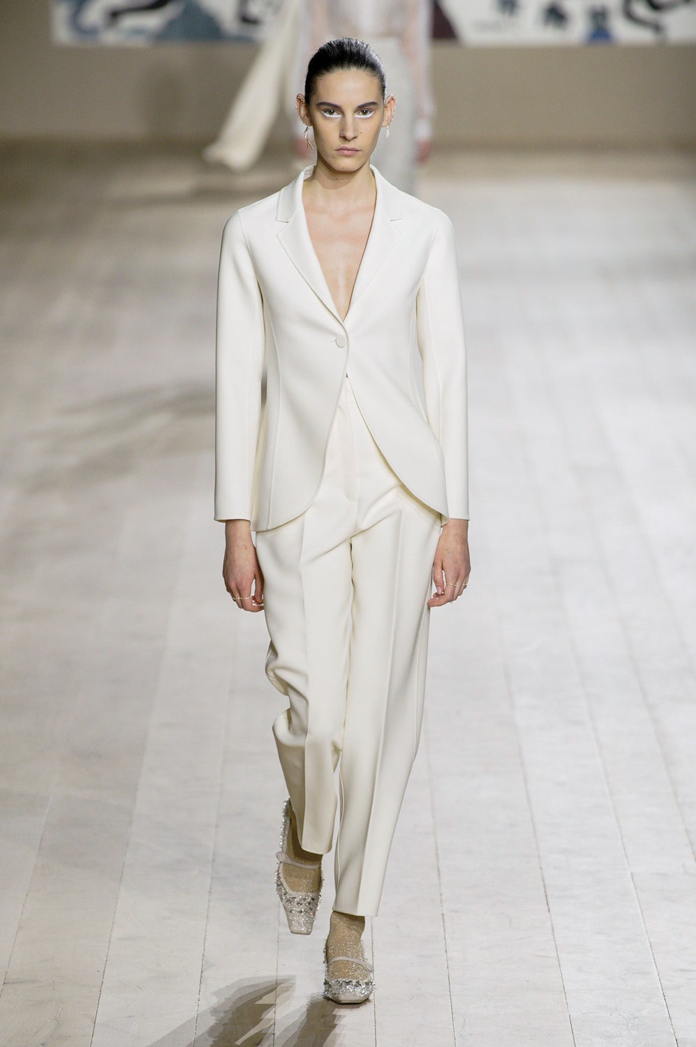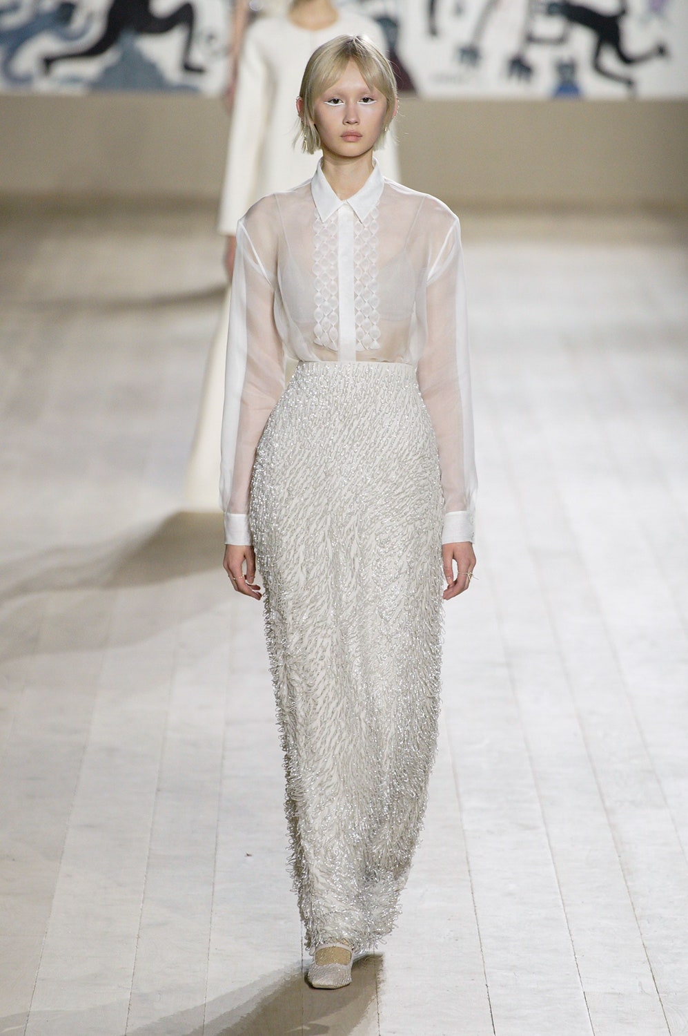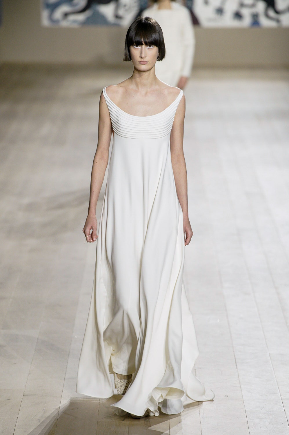 Мария Грация Кьюри представила коллекцию от-кутюр для Christian Dior и на этот раз решила не подчинять ее какой-либо концепции, а сосредоточиться на высоком мастерстве и простых силуэтах. В видимой простоте по задумке Кьюри и кроются детали высокого искусства ручного труда. Так, на моделях были плиссированные кейпы и юбки, строчки на которых едва заметны при ближайшем рассмотрении, усеянные сотнями кристаллов платья и наряды, имитирующие раздельные комплекты (как, например, черное шелковое платье, которое кажется юбкой и топом). Показ открыла модель в геометрическом боди, расшитом серебряной нитью, а закрыла модель в платье-сетке, усеянном "каплями"-кристаллами, — такими же оказались расшиты и колготки, которые могут стать must have этой весны. Главным предметом коллекции стал жакет-бар, возведенный в культ самим Кристианом Диором.