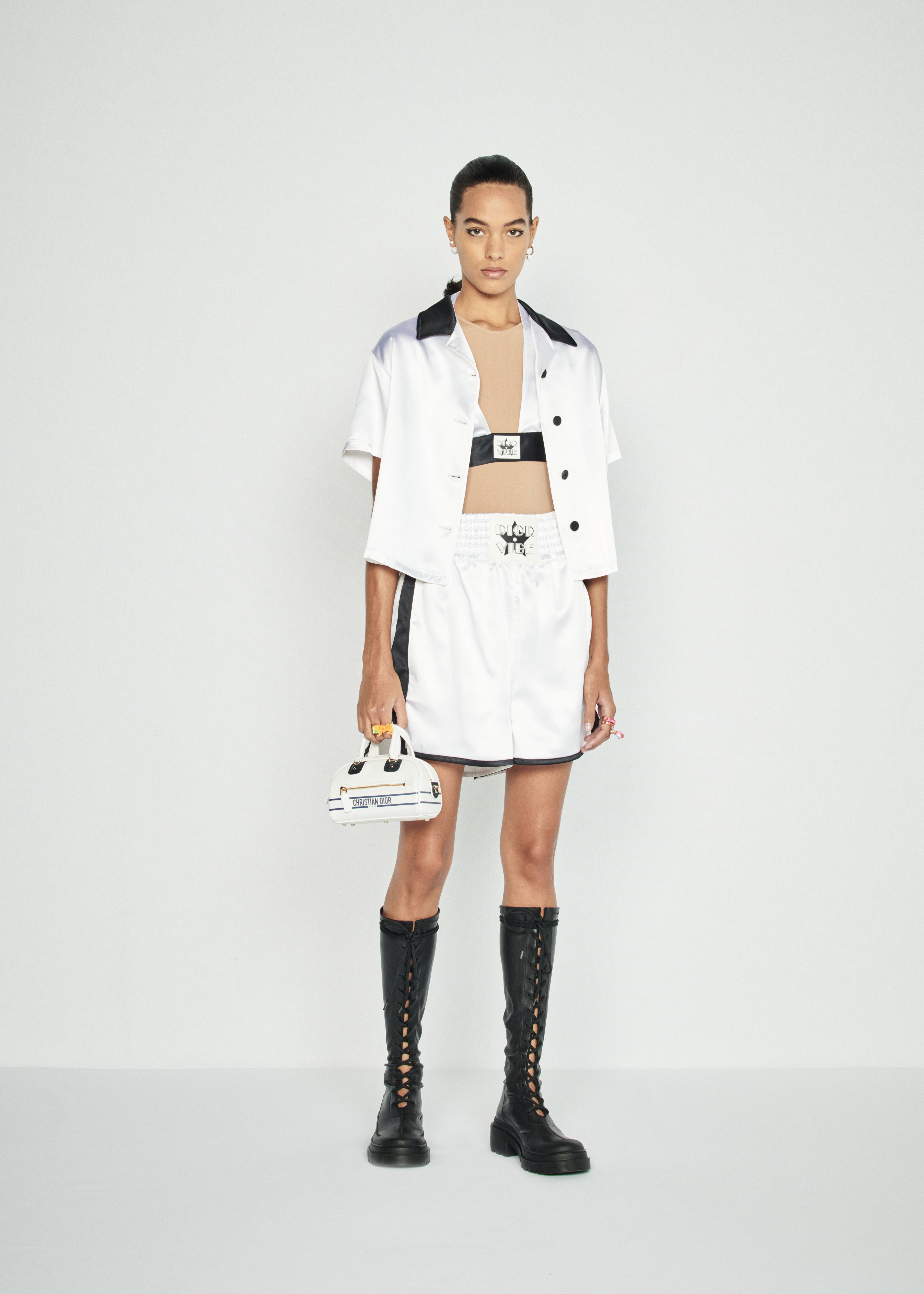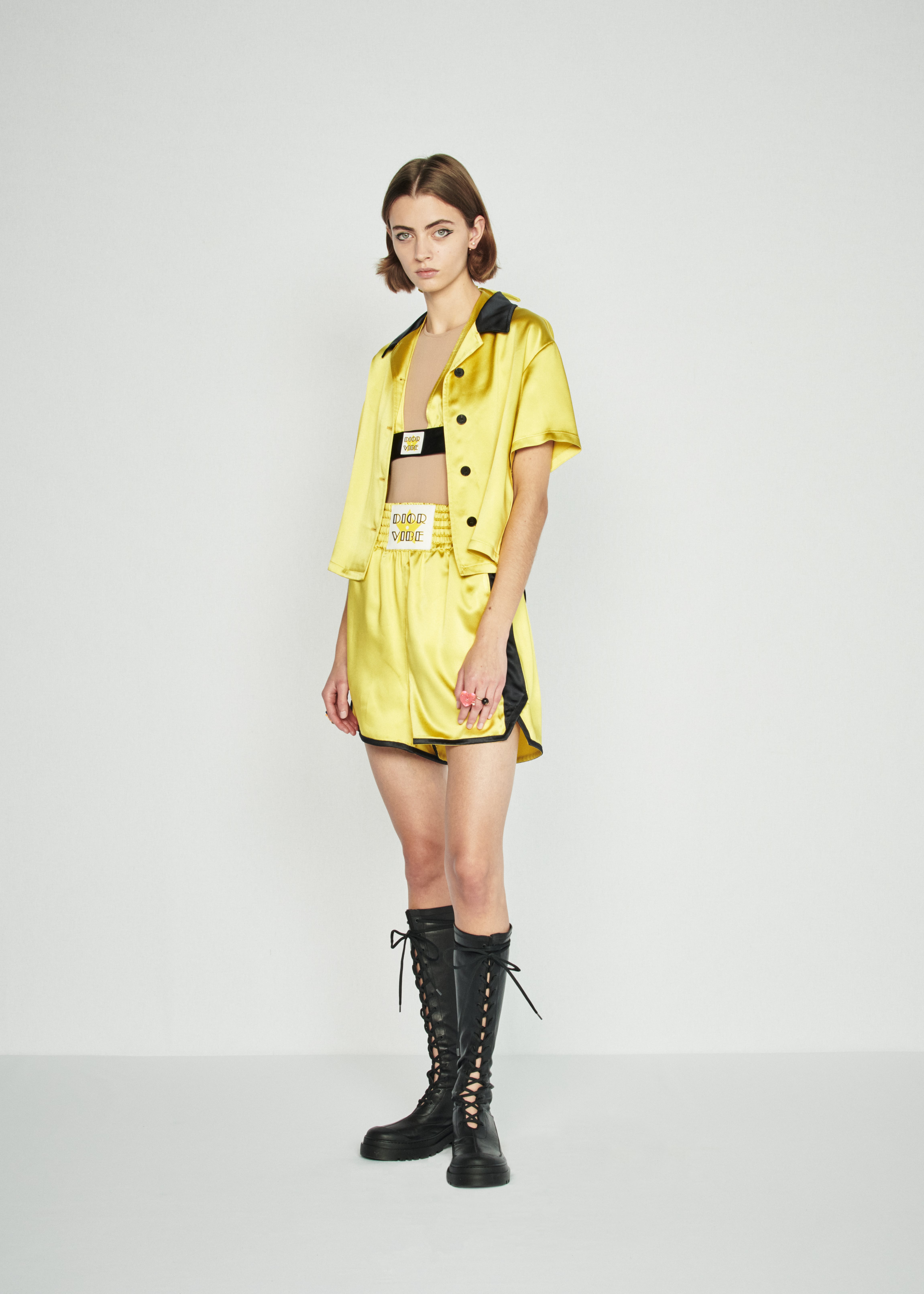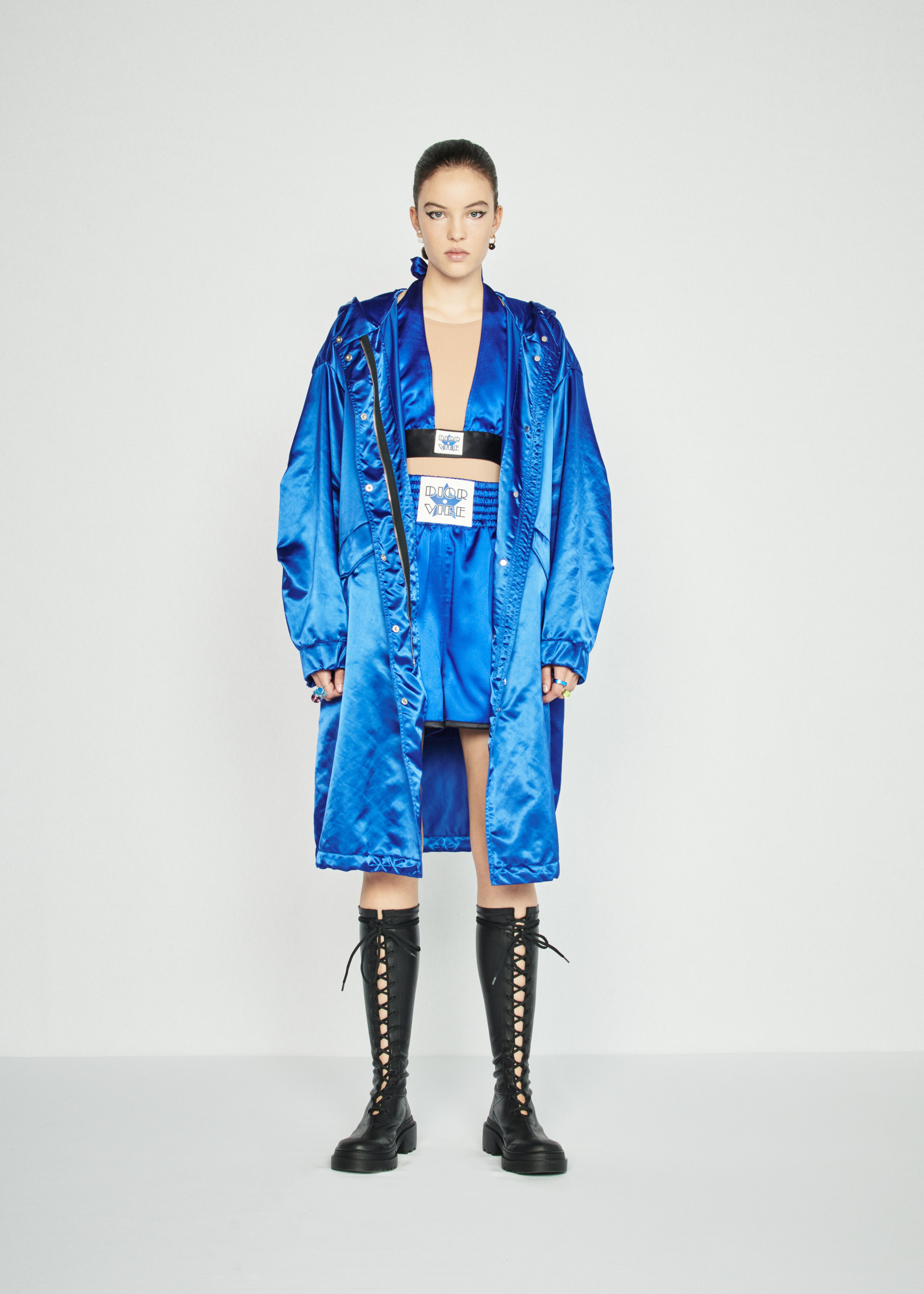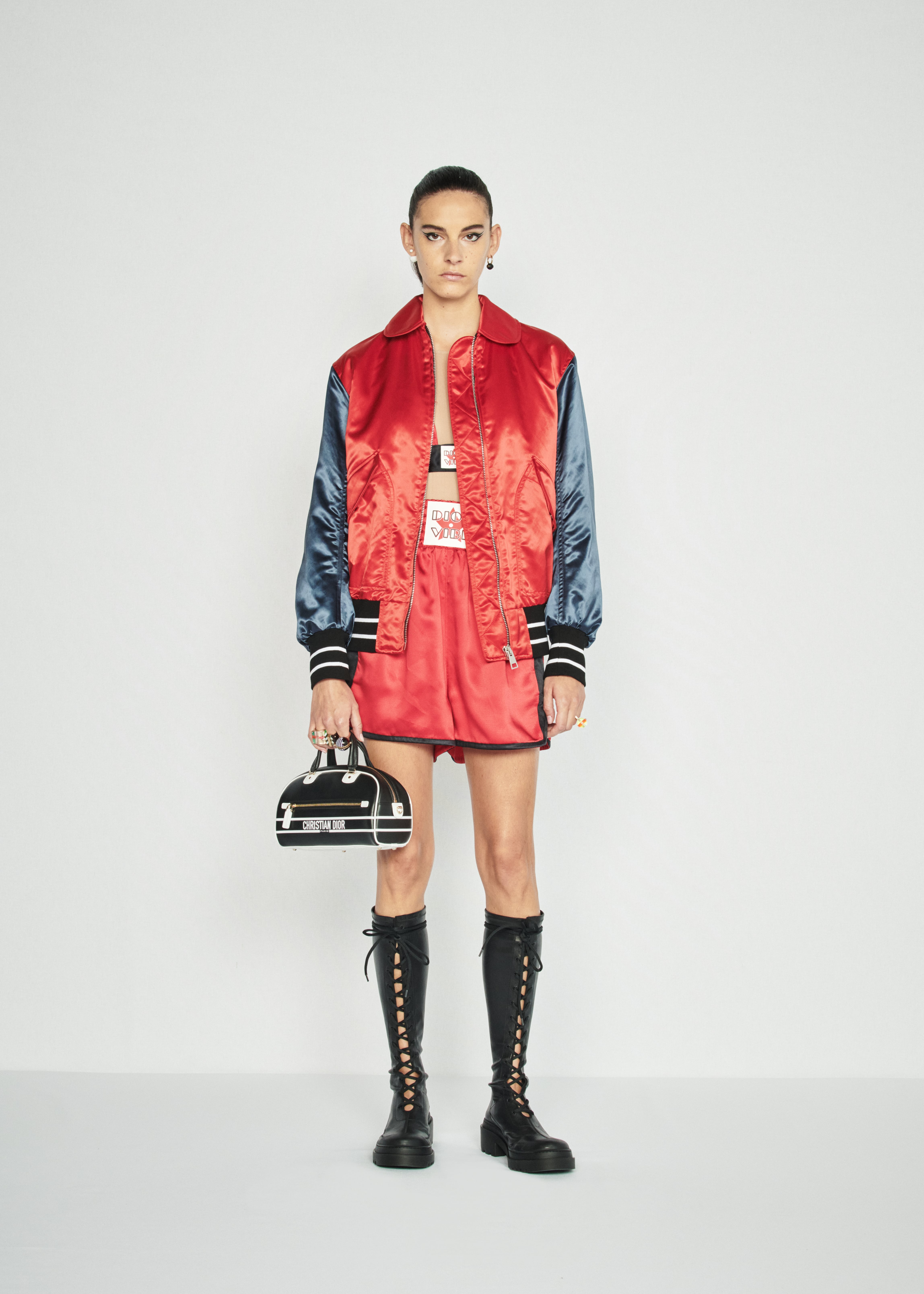 Кьюри советует всем нам превращать свою повседневность в яркую и веселую диско-игру, надевая виниловые топы и мини-юбки с печатным изображением зебр и леопардов, боксерские шорты, футуристические трико с молнией у горловины, платья из золотой бахромы и дубленки с розовым мехом. Обувь будущей весны по версии Dior — удобные балетки на застежках и сапоги с контрастными цветными носками.