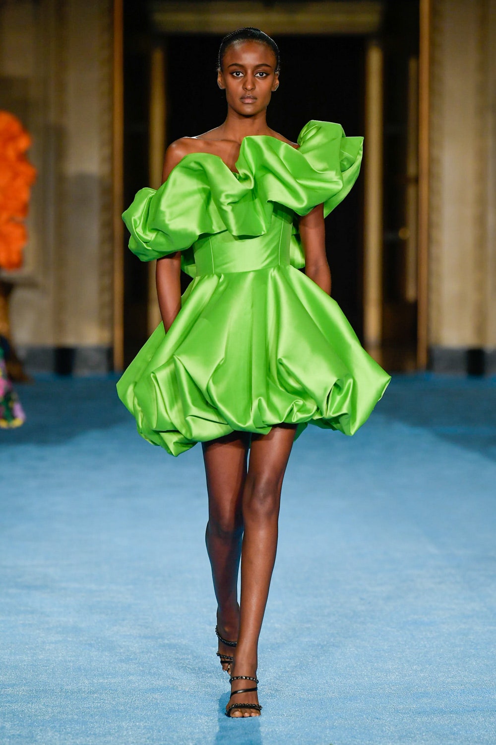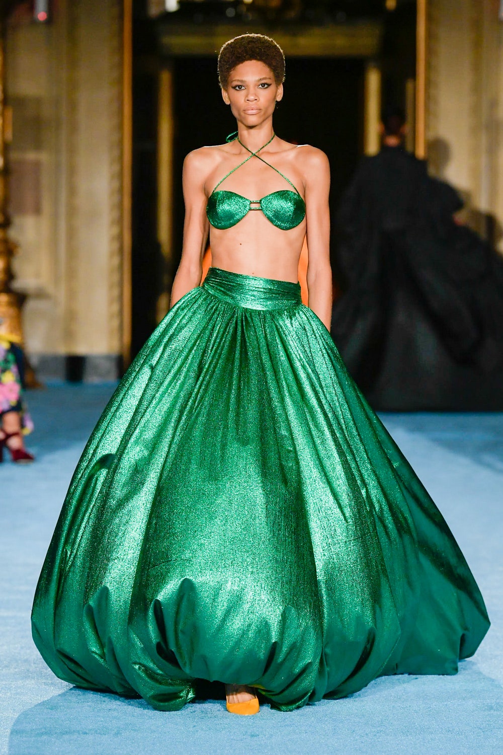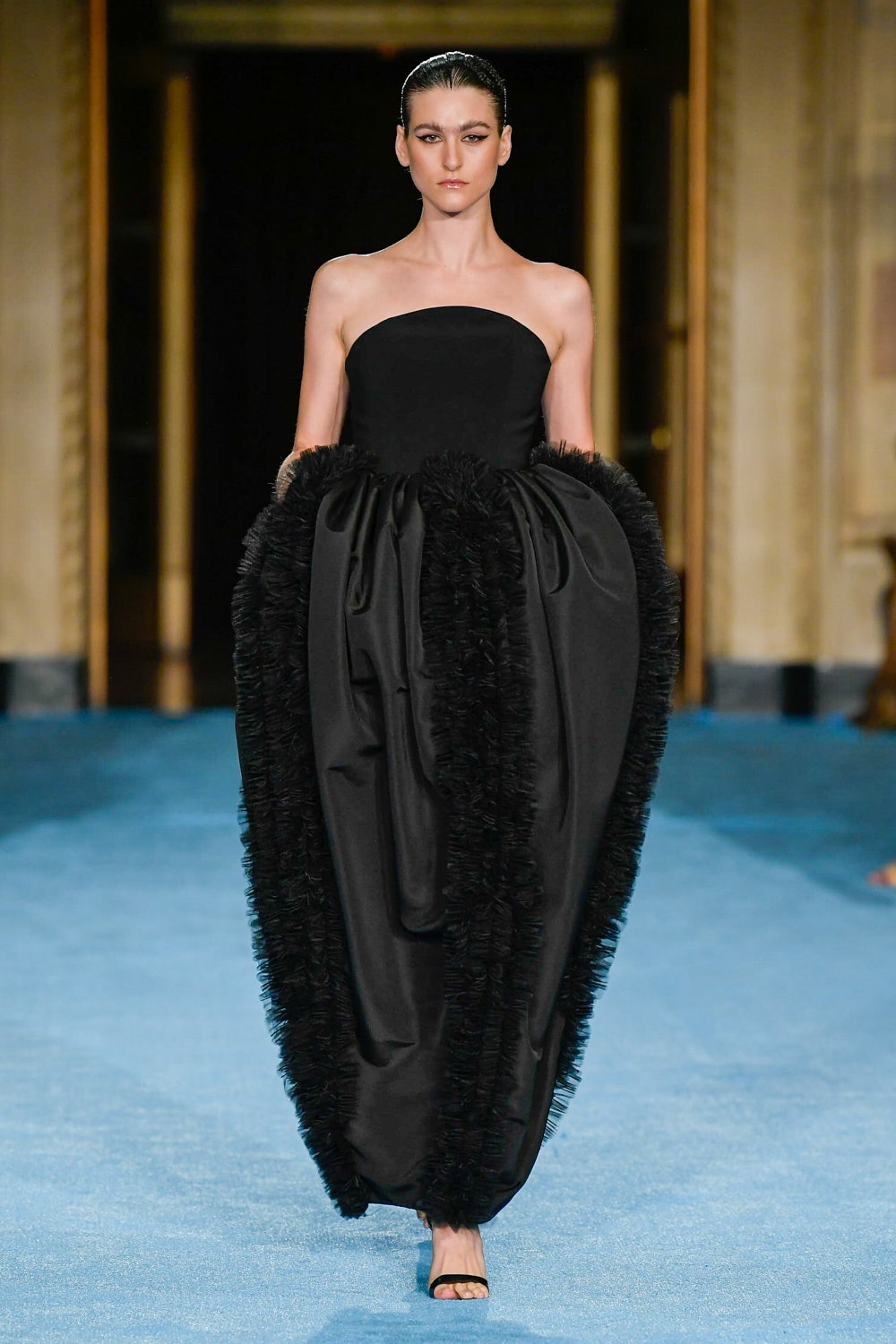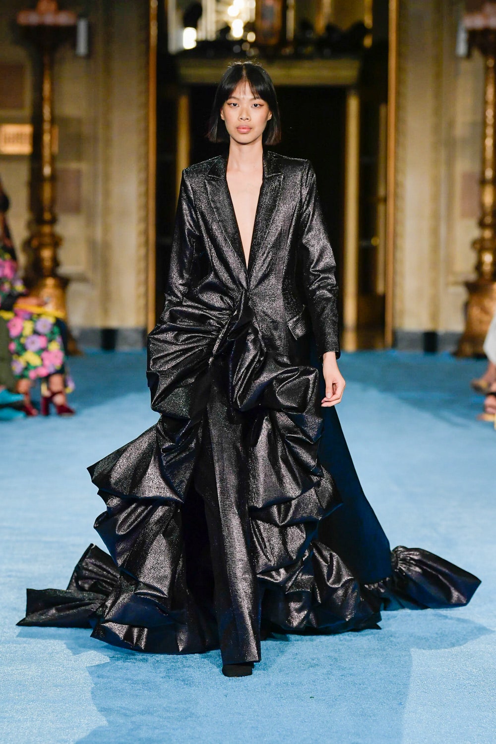 Показ дизайнера Кристиана Сириано прошел в нью-йоркском Готэм-холле, здании бывшего Гринвичского банка, строившегося вместе с бизнес-империями и модными домами в конце 1920-х. В коллекции будущей весны Сириано позволил себе еще больше чрезмерности и пышности. Шоу открыла модель Precious Lee в соблазнительном костюме сочного оранжевого цвета — его дизайнер заимствовал из памяти о гардеробе своей итальянской бабушки. Данью роскошным образам прошлого стали сияющие атласные бюстье и пышные юбки, изящные костюмы с юбками и декором из оборок, струящиеся слоистые платья в горошек и силуэтные наряды с контрастными палантинами. Мода 30-х годов, времени юности бабушки Кристиана, стала главным нарративом коллекции и придала вещам тот самый лоск, который мы с жадностью высматриваем в последних сезонах. Гигантские, почти сокрушительные оборки соседствовали на подиуме с утонченными линиями, прозрачный гипюр — с тяжелой тафтой, а корсеты на косточках — с расслабленными платьями-смокингами и шелковыми баллонами.
