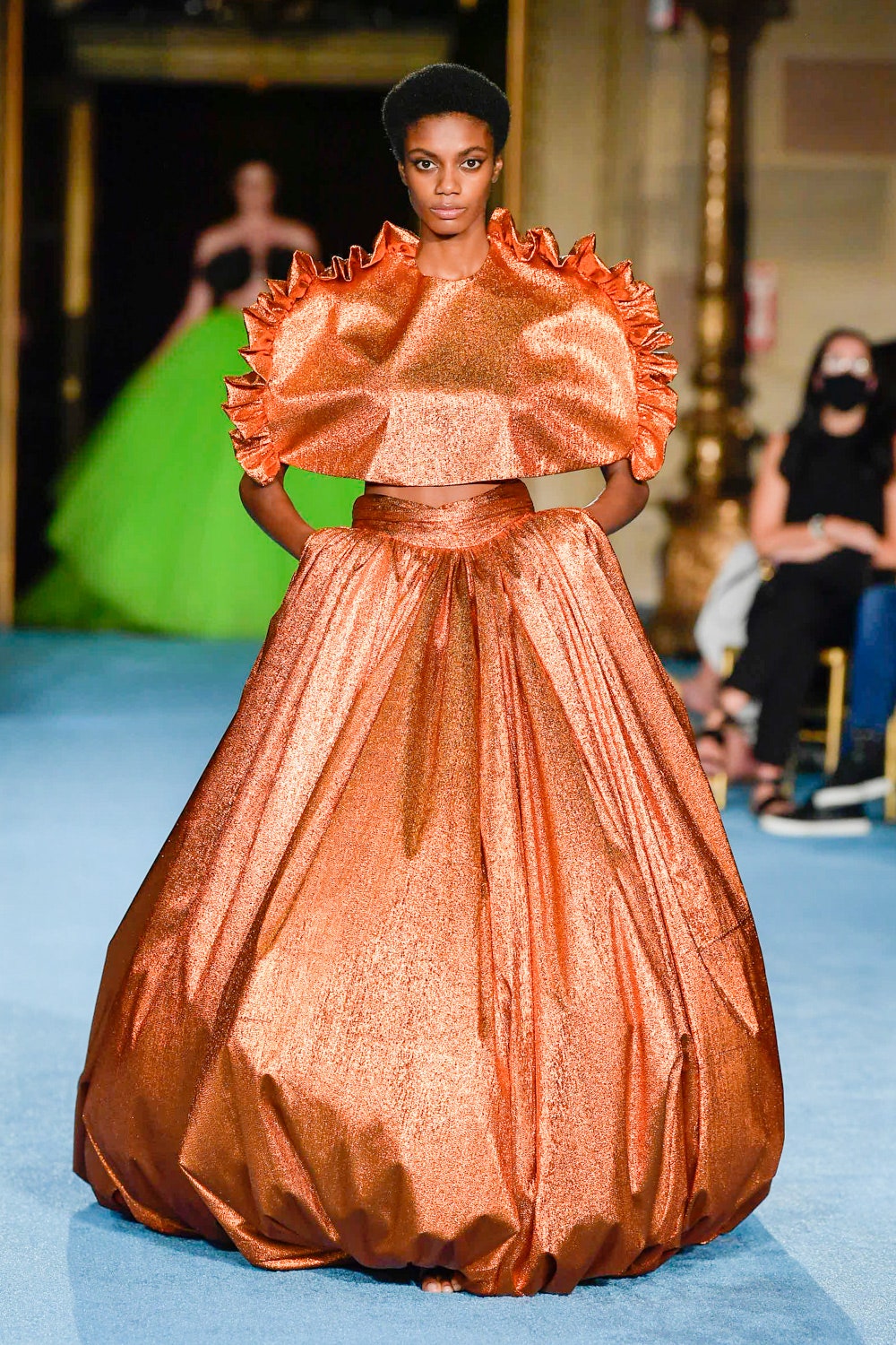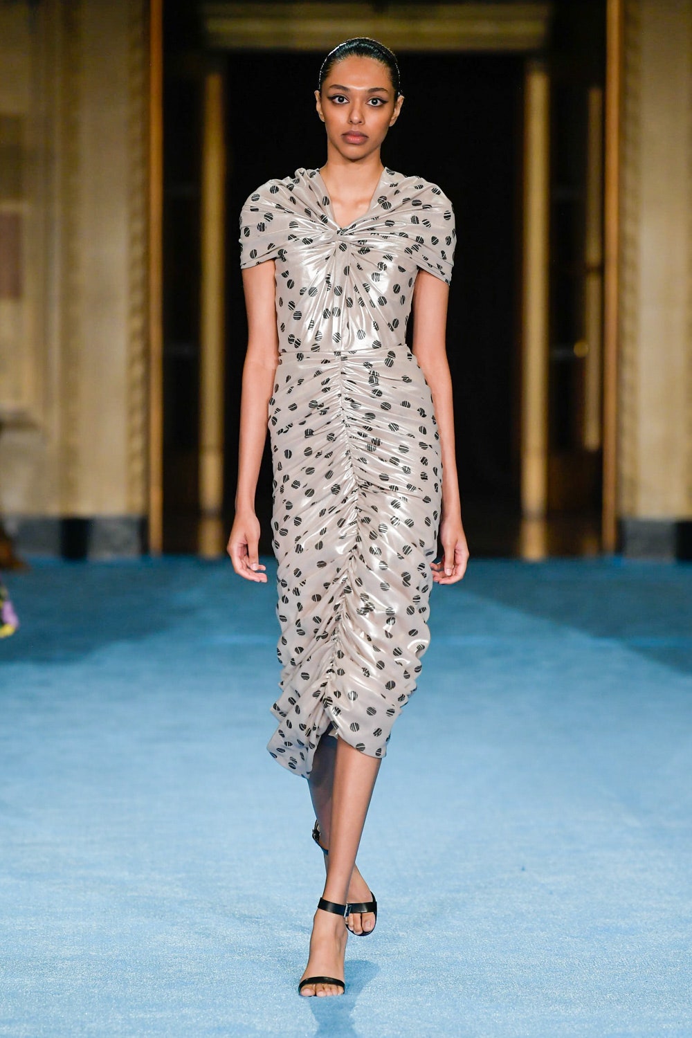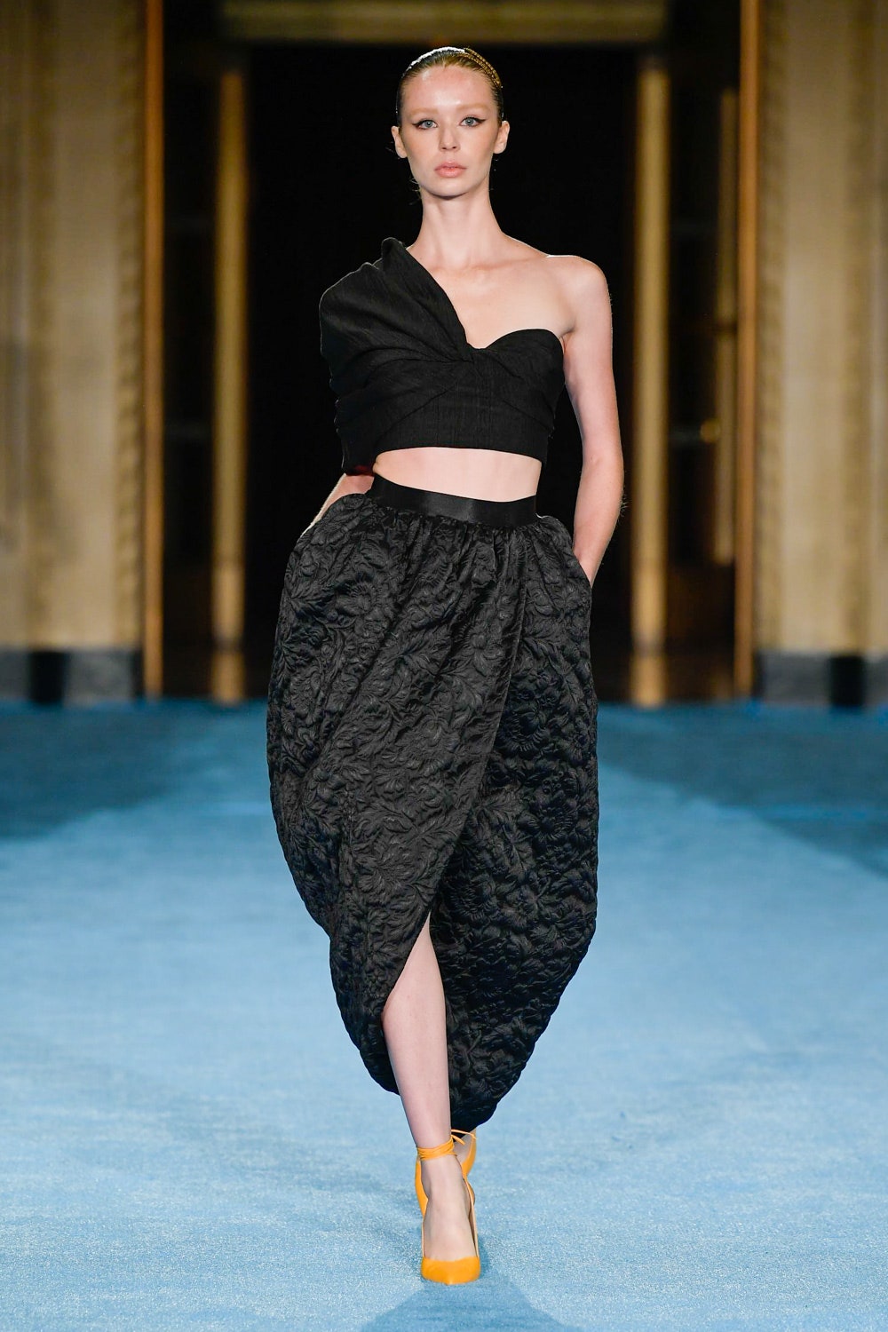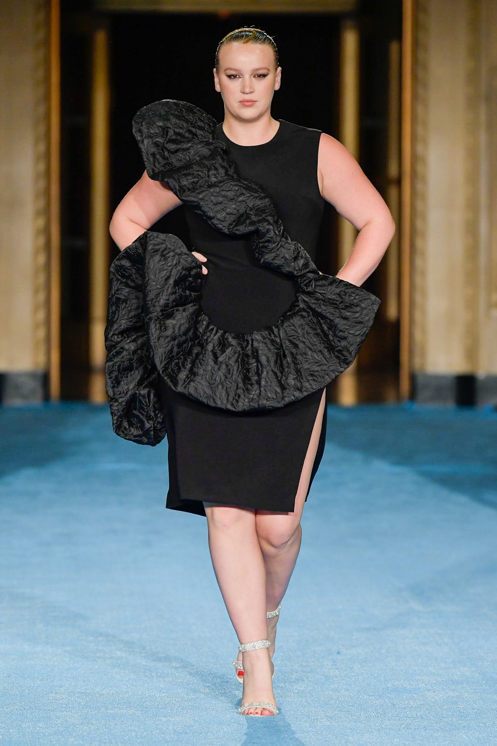 Показ дизайнера Кристиана Сириано прошел в нью-йоркском Готэм-холле, здании бывшего Гринвичского банка, строившегося вместе с бизнес-империями и модными домами в конце 1920-х. В коллекции будущей весны Сириано позволил себе еще больше чрезмерности и пышности. Шоу открыла модель Precious Lee в соблазнительном костюме сочного оранжевого цвета — его дизайнер заимствовал из памяти о гардеробе своей итальянской бабушки. Данью роскошным образам прошлого стали сияющие атласные бюстье и пышные юбки, изящные костюмы с юбками и декором из оборок, струящиеся слоистые платья в горошек и силуэтные наряды с контрастными палантинами. Мода 30-х годов, времени юности бабушки Кристиана, стала главным нарративом коллекции и придала вещам тот самый лоск, который мы с жадностью высматриваем в последних сезонах. Гигантские, почти сокрушительные оборки соседствовали на подиуме с утонченными линиями, прозрачный гипюр — с тяжелой тафтой, а корсеты на косточках — с расслабленными платьями-смокингами и шелковыми баллонами.