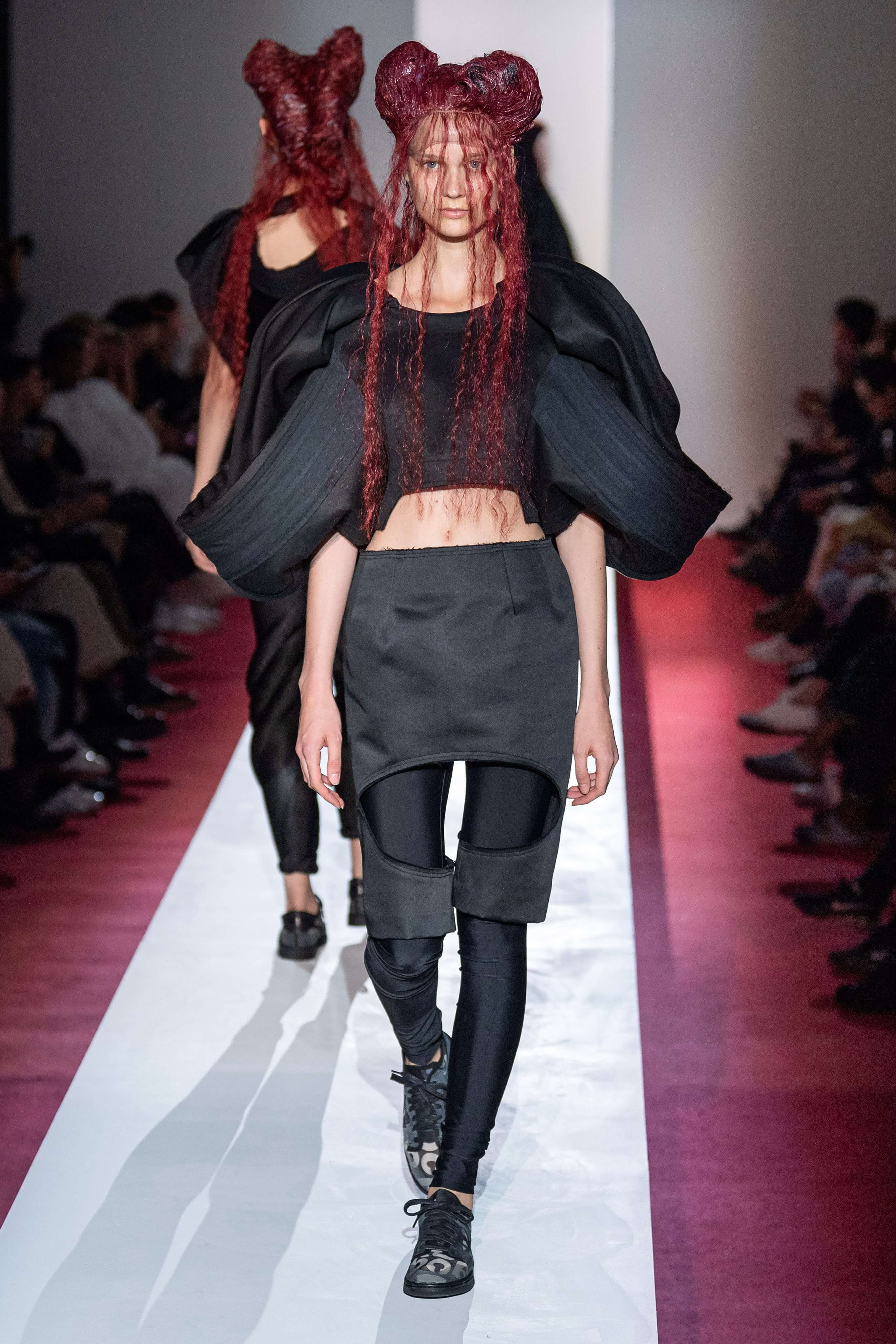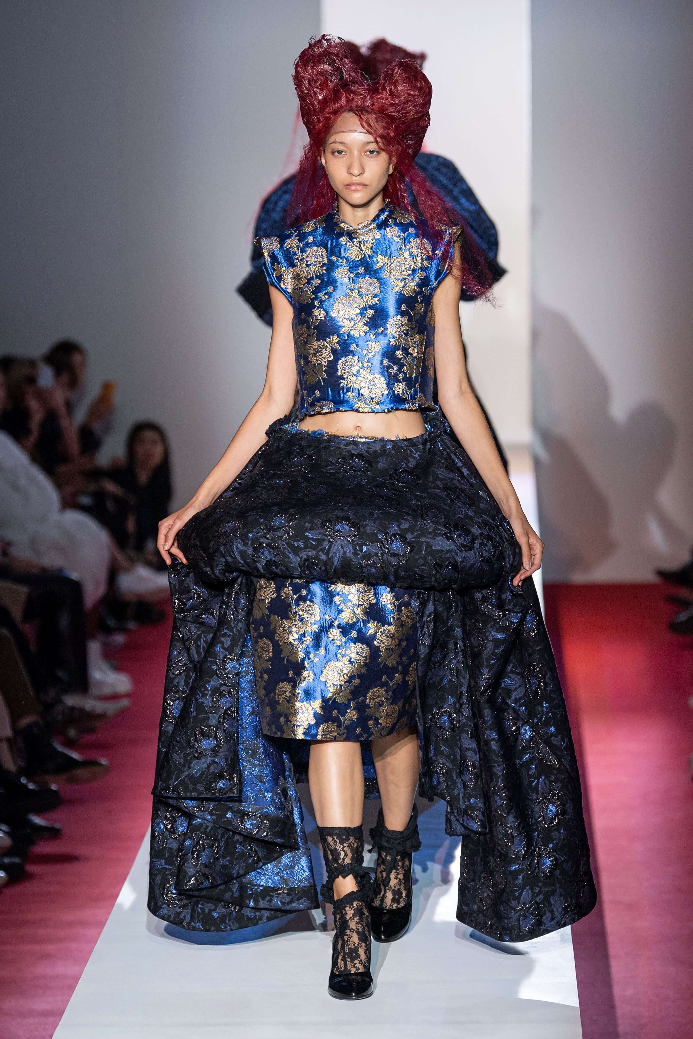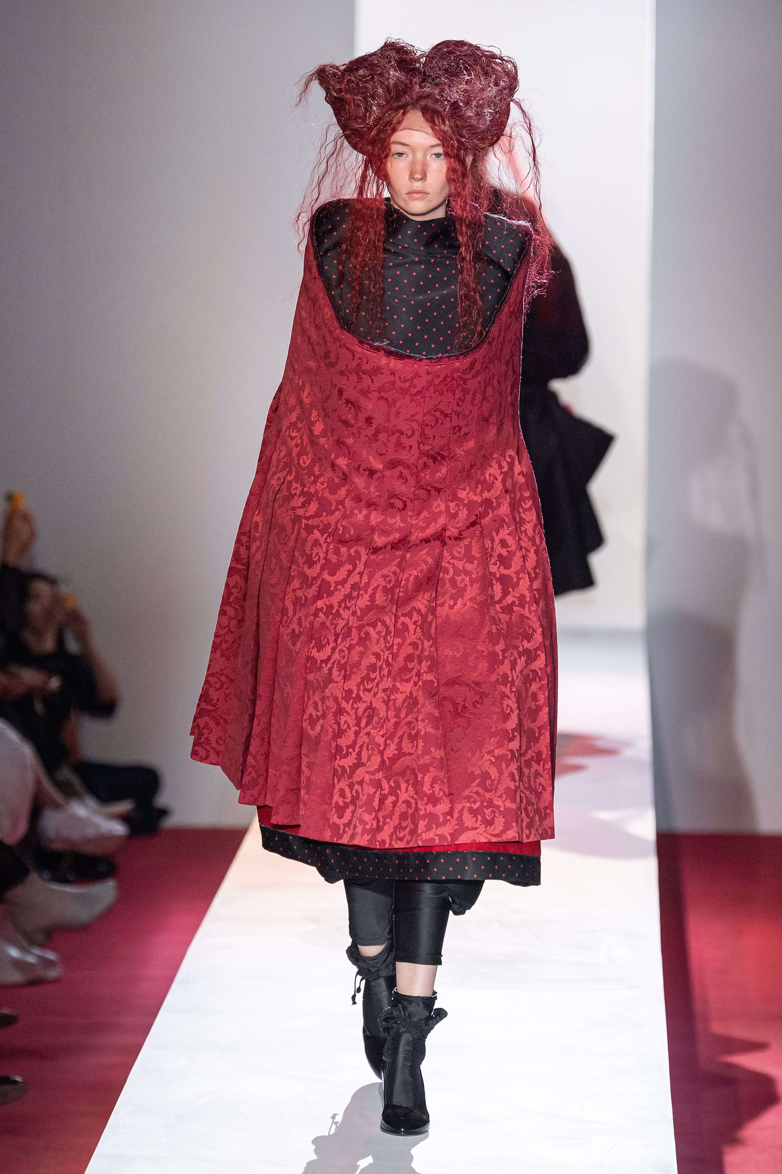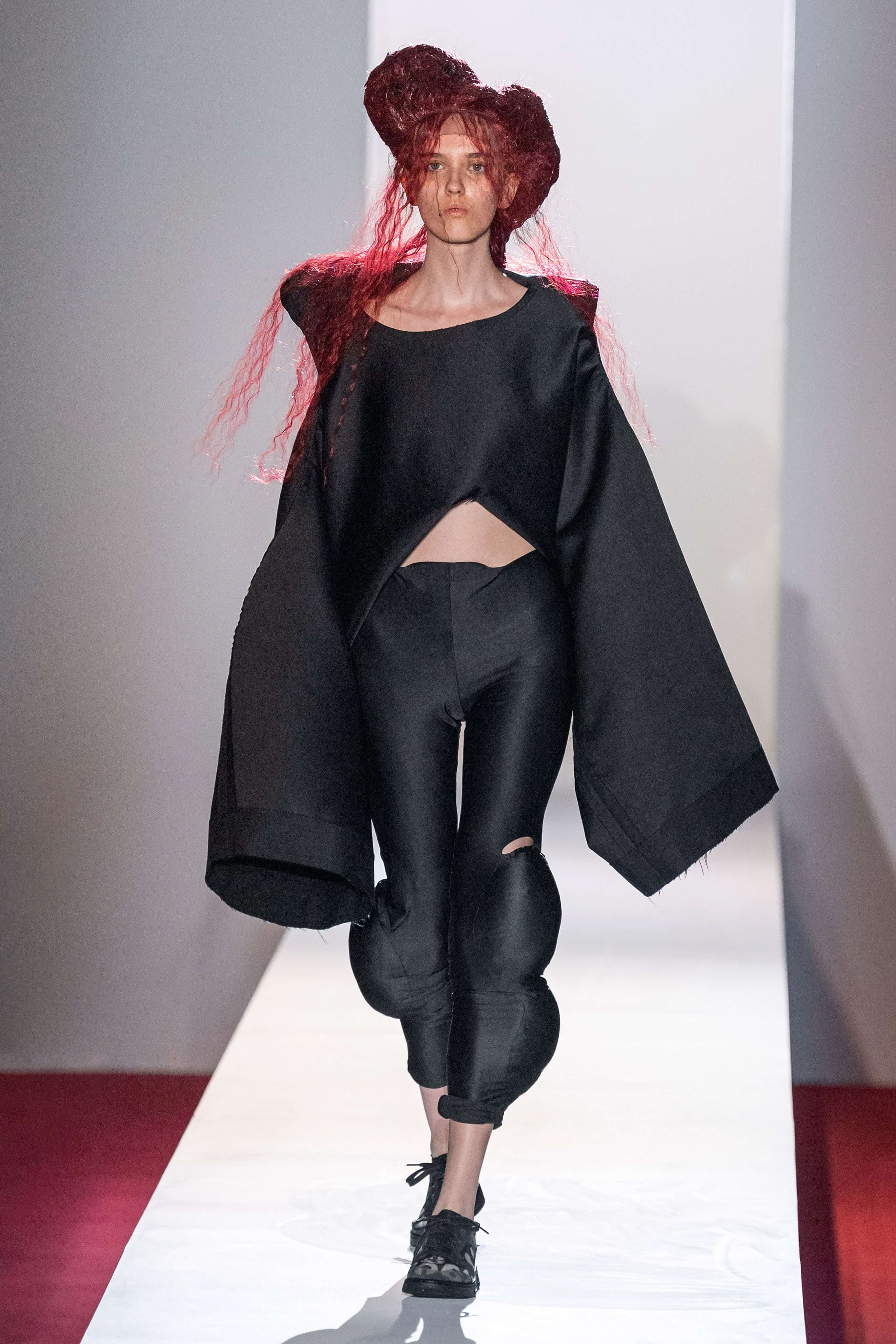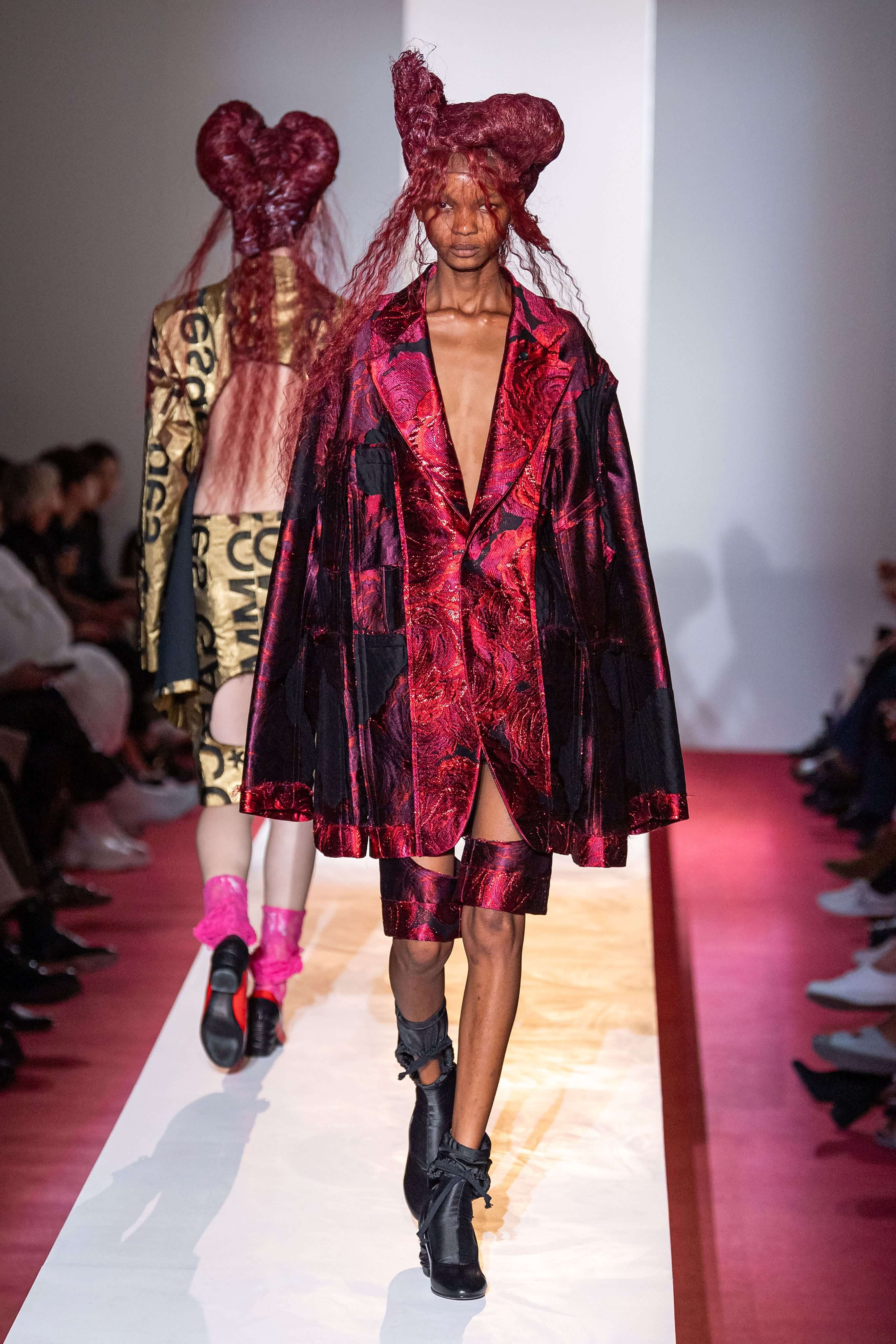 Именно елизаветинской части романа Рей Кавакубо и посвятила платья с тяжелыми фалдами, топы-корсажи с округлыми рукавами, гиперобъёмные наряды из блестящего жаккарда в вензельных орнаментах и "рогатые" прически моделей. Ряд драматичных накидок с алой велюровой бахромой, шорт и брюк с круглыми прорезями, резиновых топов и платьев без рукавов дополнили огромные королевские блузы из шелка с кружевными фестонами, пажеские рубахи из белого сукна и будто вывернутые наизнанку многослойные наряды. Вслед за ними на подиуме появились футуристичные черные костюмы острых силуэтов, а разбавили всё романтичные тренчи из золотого и принтованного цветами жаккарда.