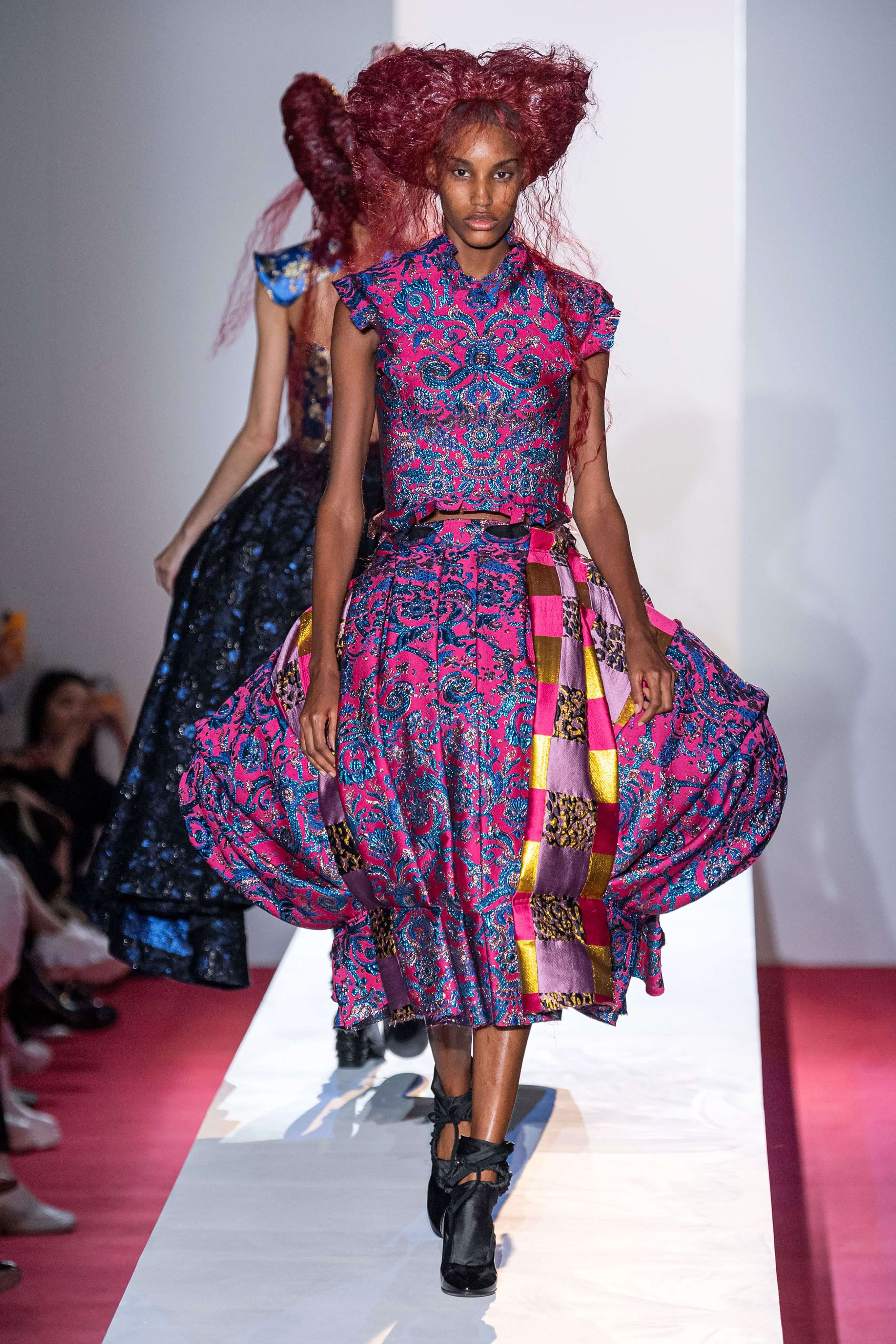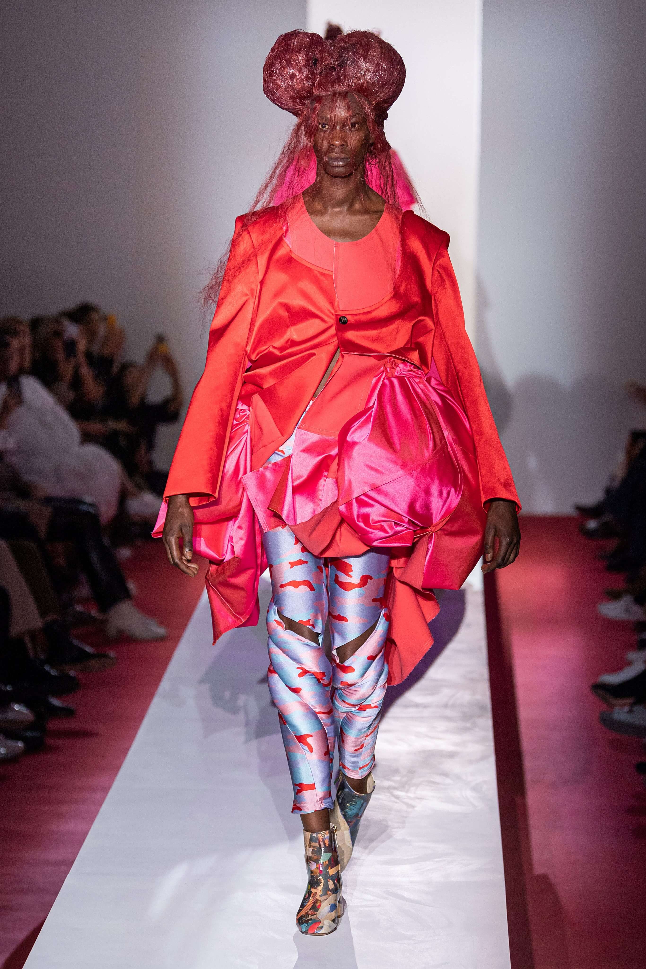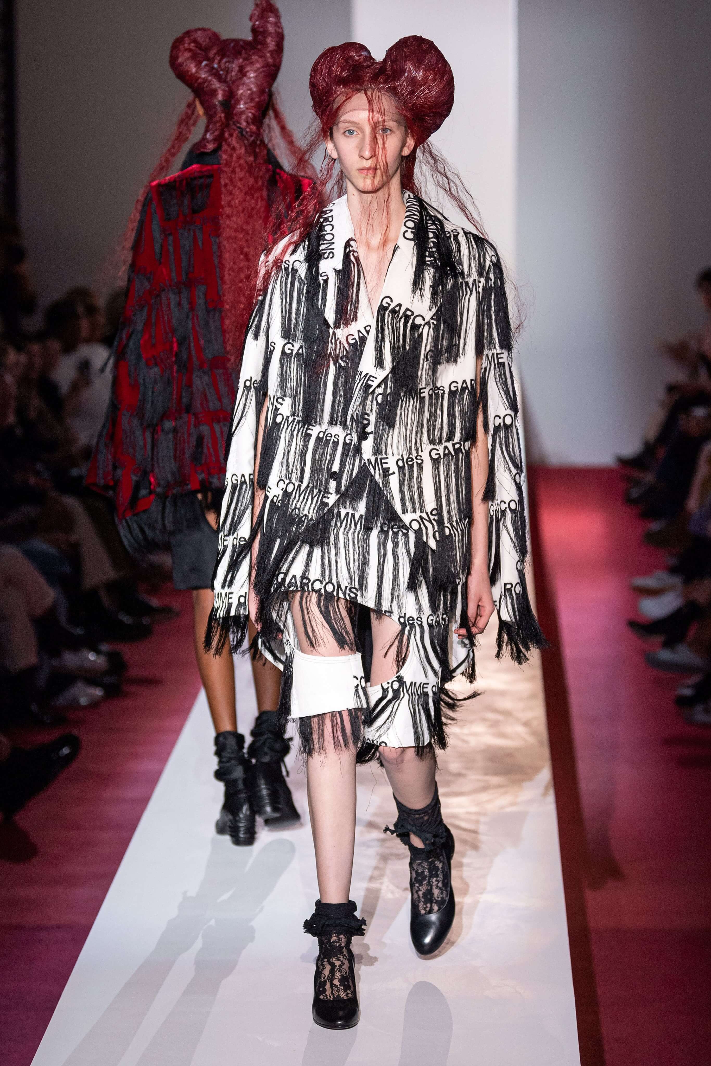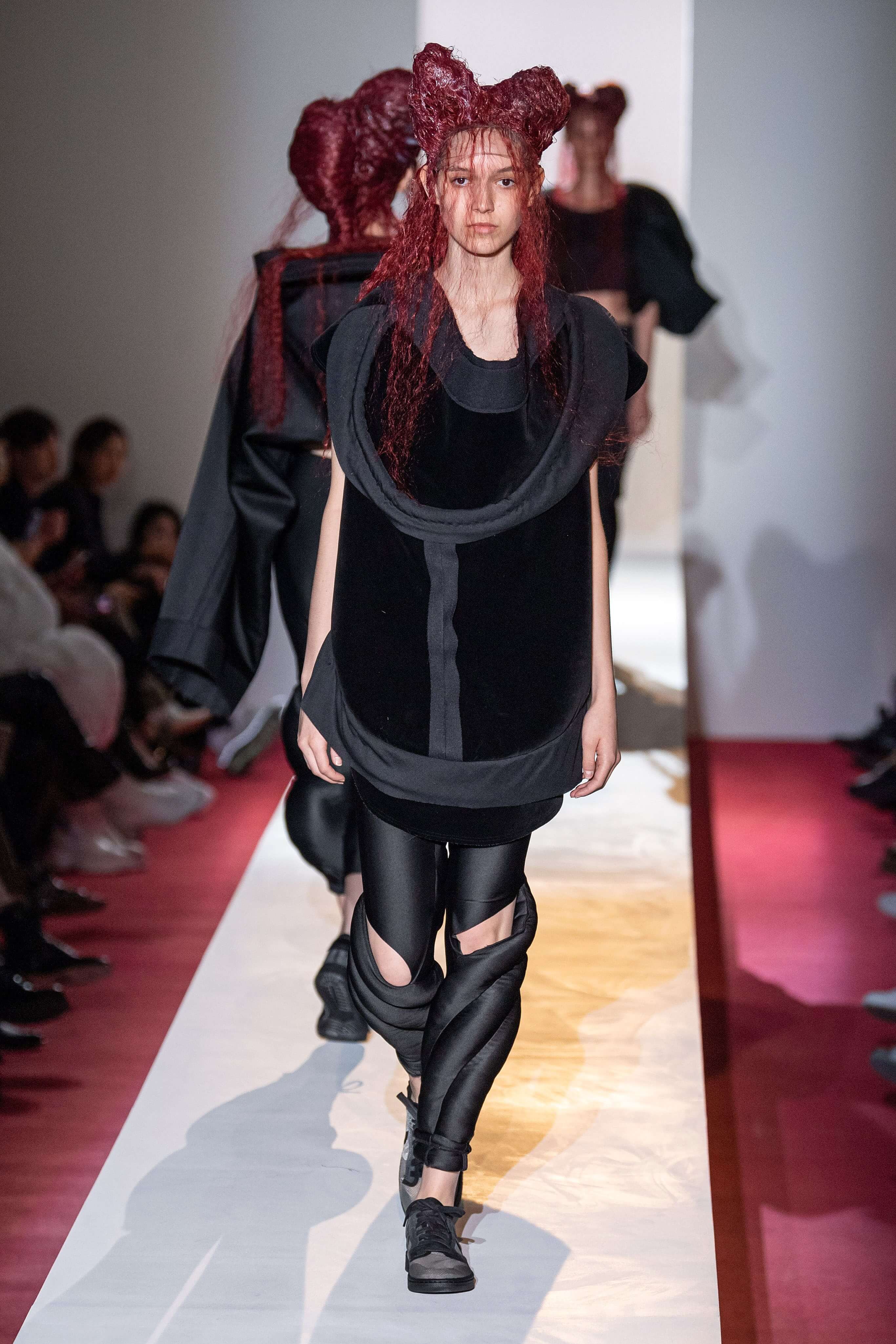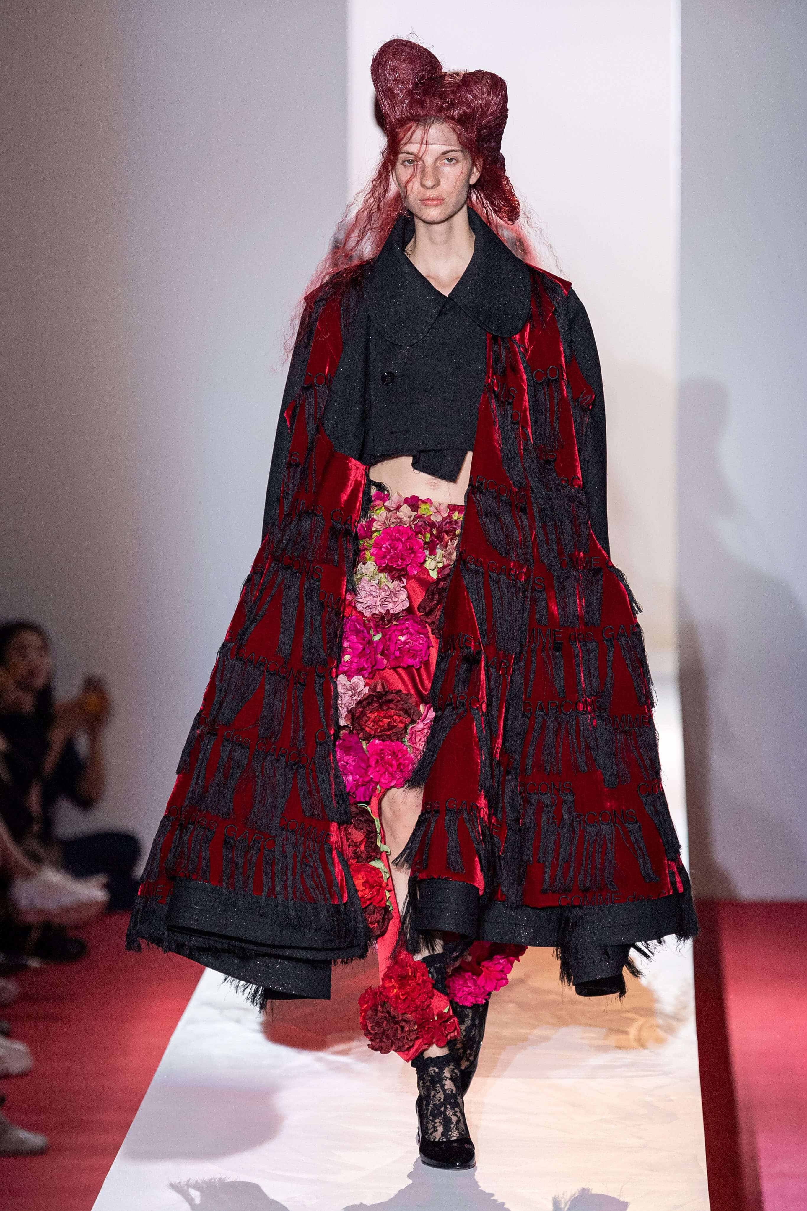 Именно елизаветинской части романа Рей Кавакубо и посвятила платья с тяжелыми фалдами, топы-корсажи с округлыми рукавами, гиперобъёмные наряды из блестящего жаккарда в вензельных орнаментах и "рогатые" прически моделей. Ряд драматичных накидок с алой велюровой бахромой, шорт и брюк с круглыми прорезями, резиновых топов и платьев без рукавов дополнили огромные королевские блузы из шелка с кружевными фестонами, пажеские рубахи из белого сукна и будто вывернутые наизнанку многослойные наряды. Вслед за ними на подиуме появились футуристичные черные костюмы острых силуэтов, а разбавили всё романтичные тренчи из золотого и принтованного цветами жаккарда.