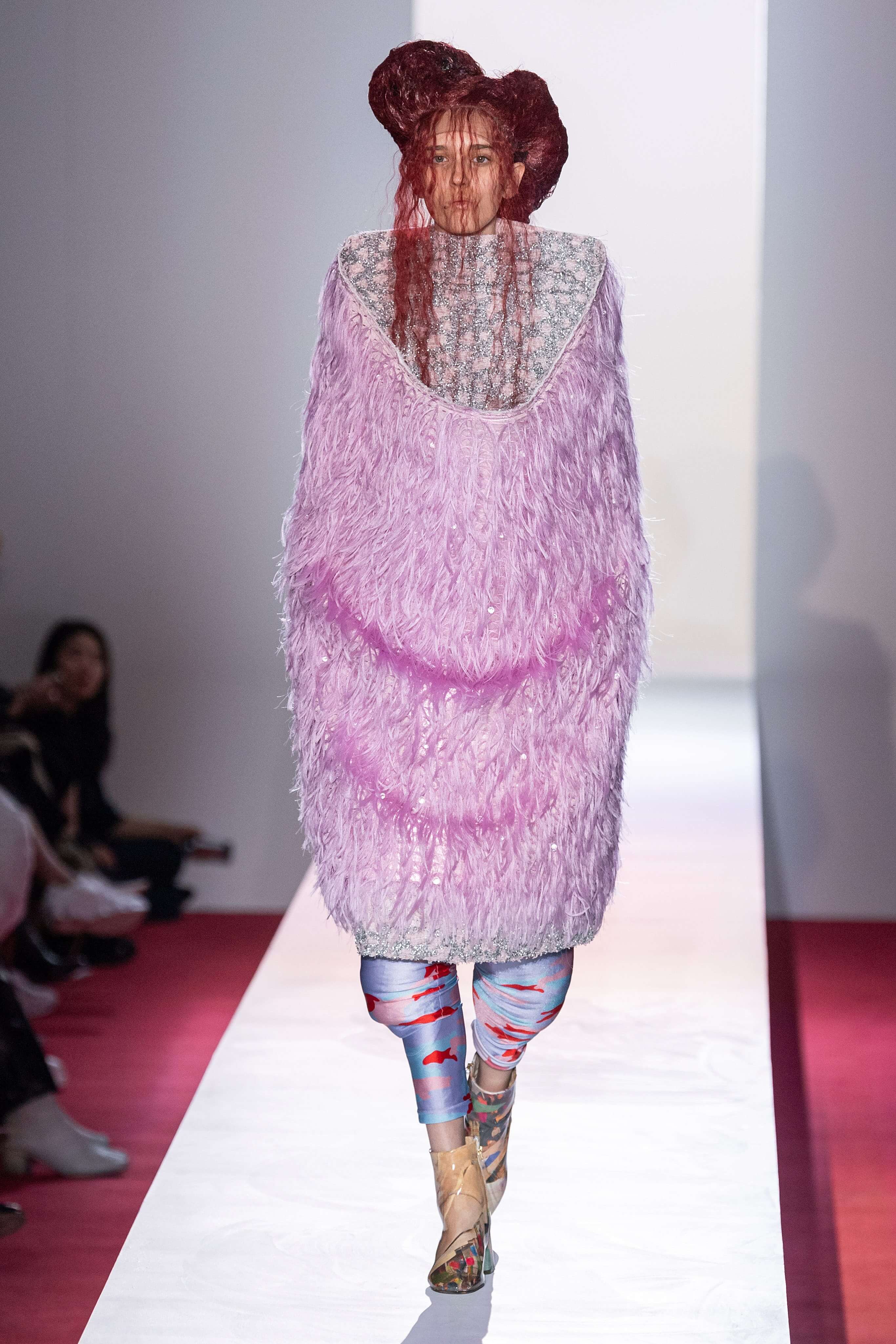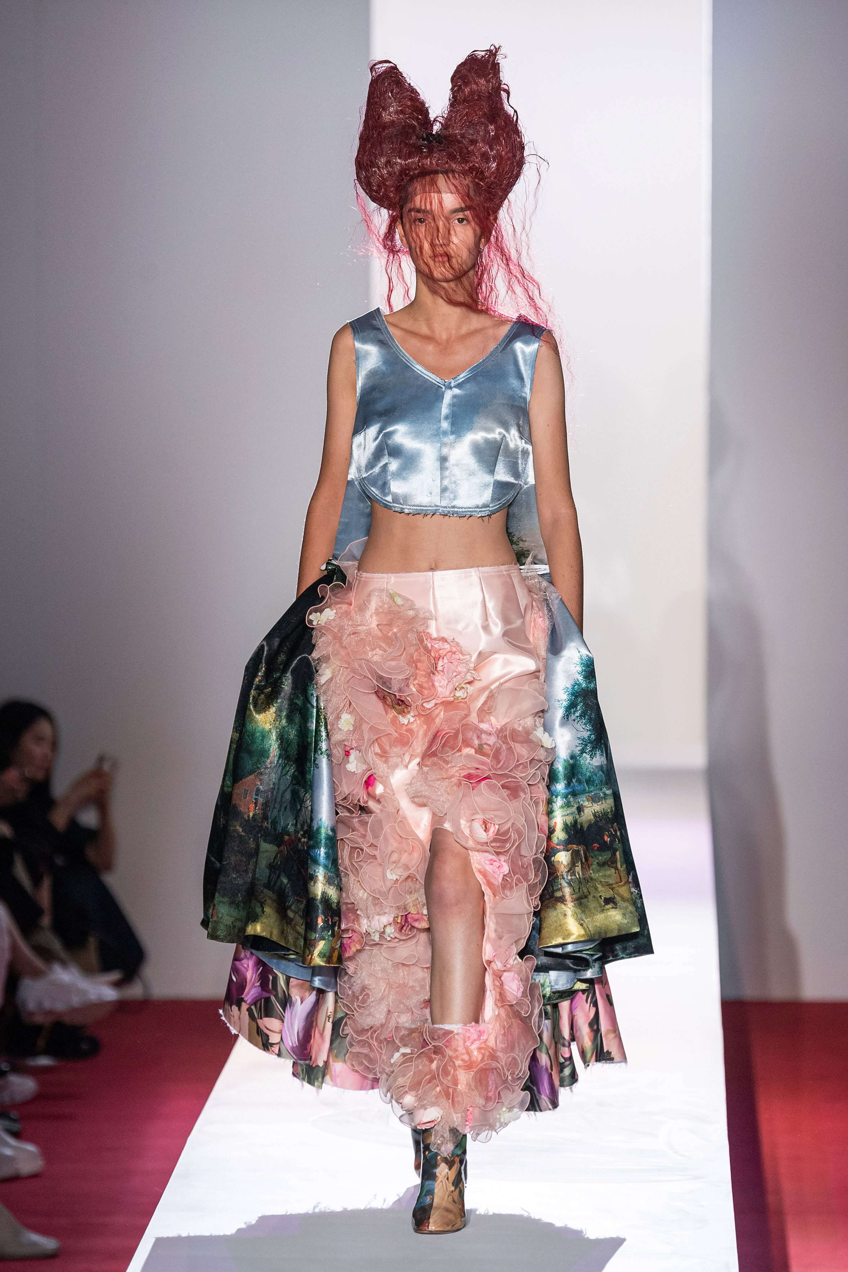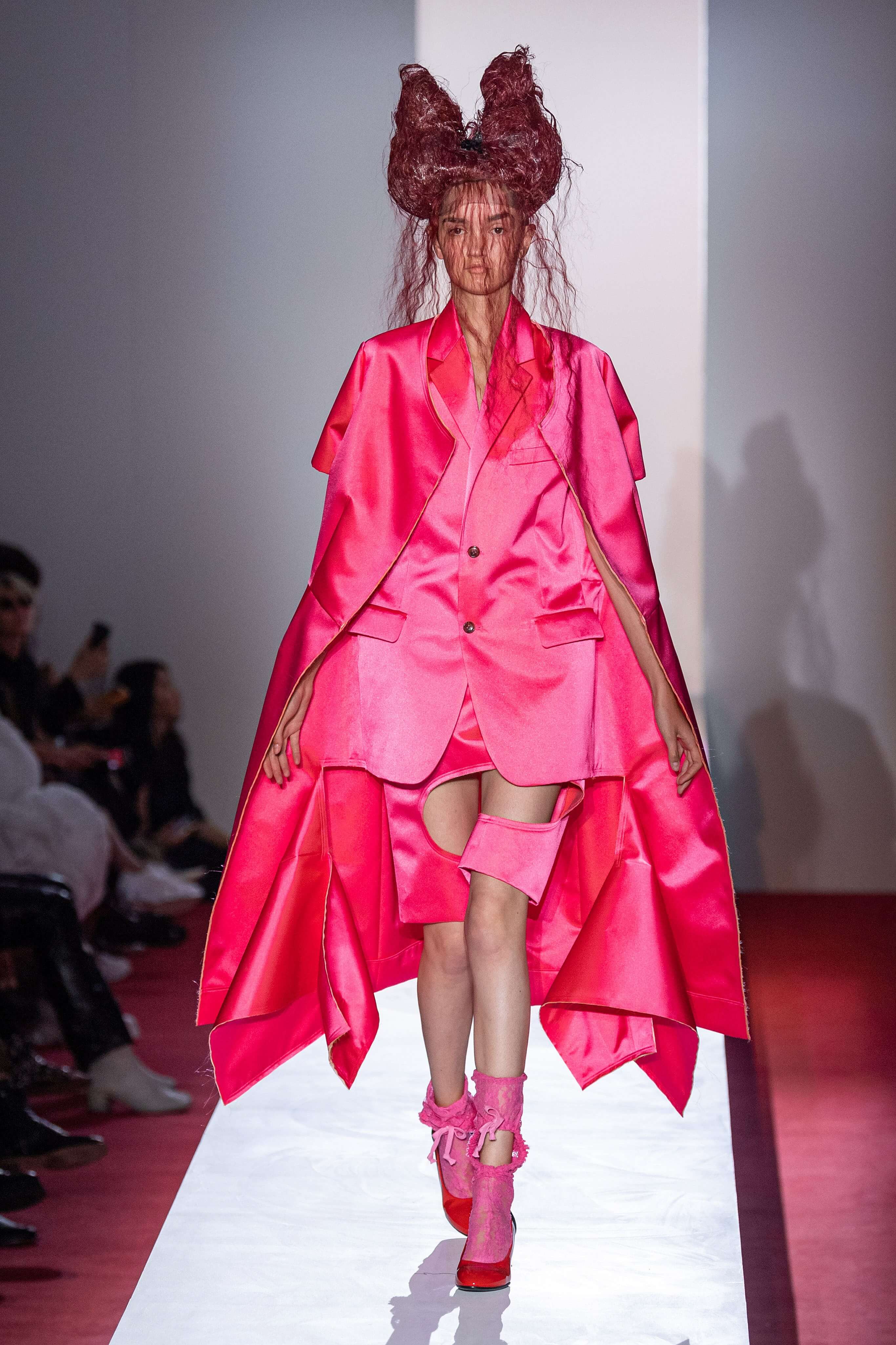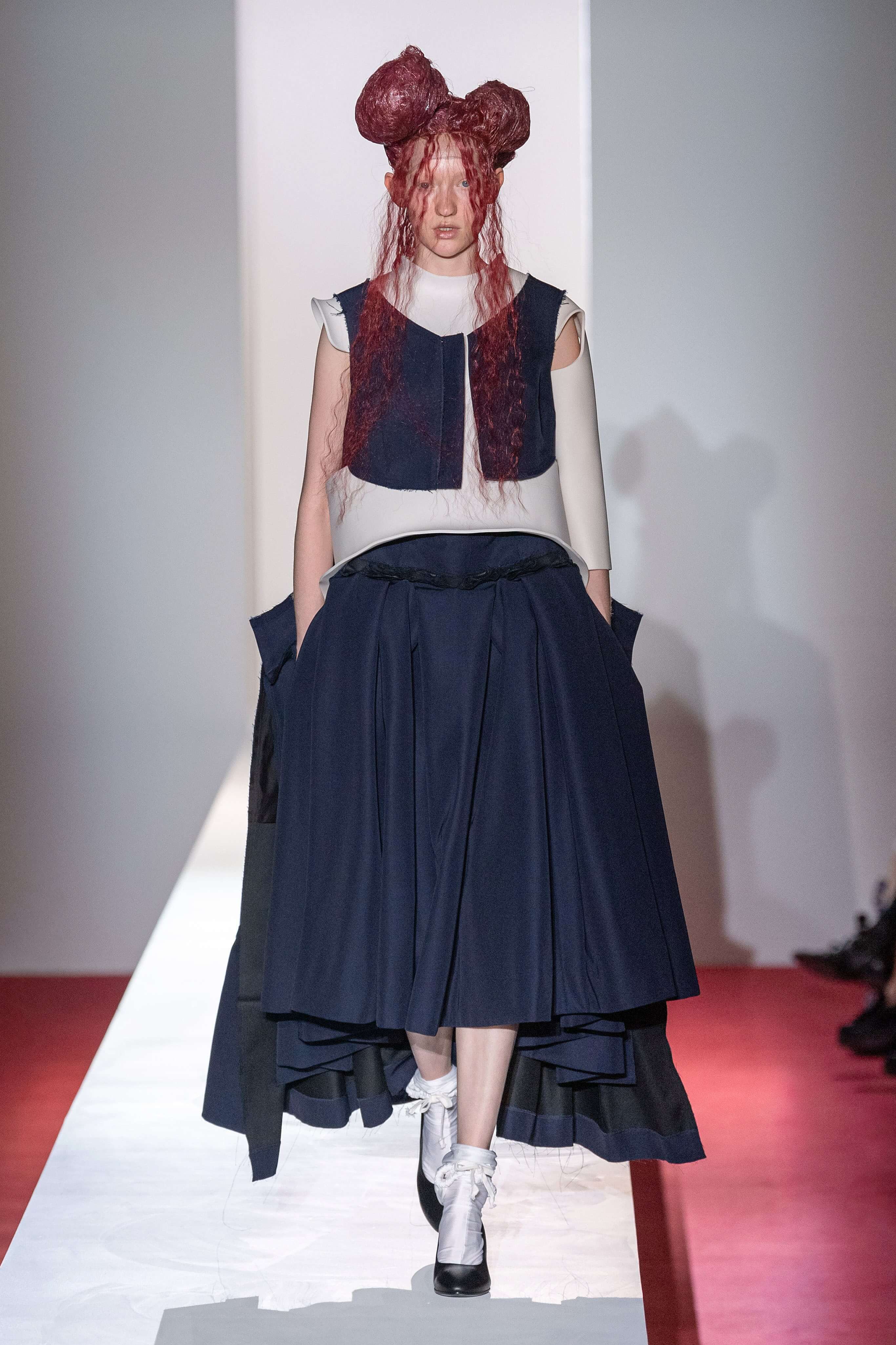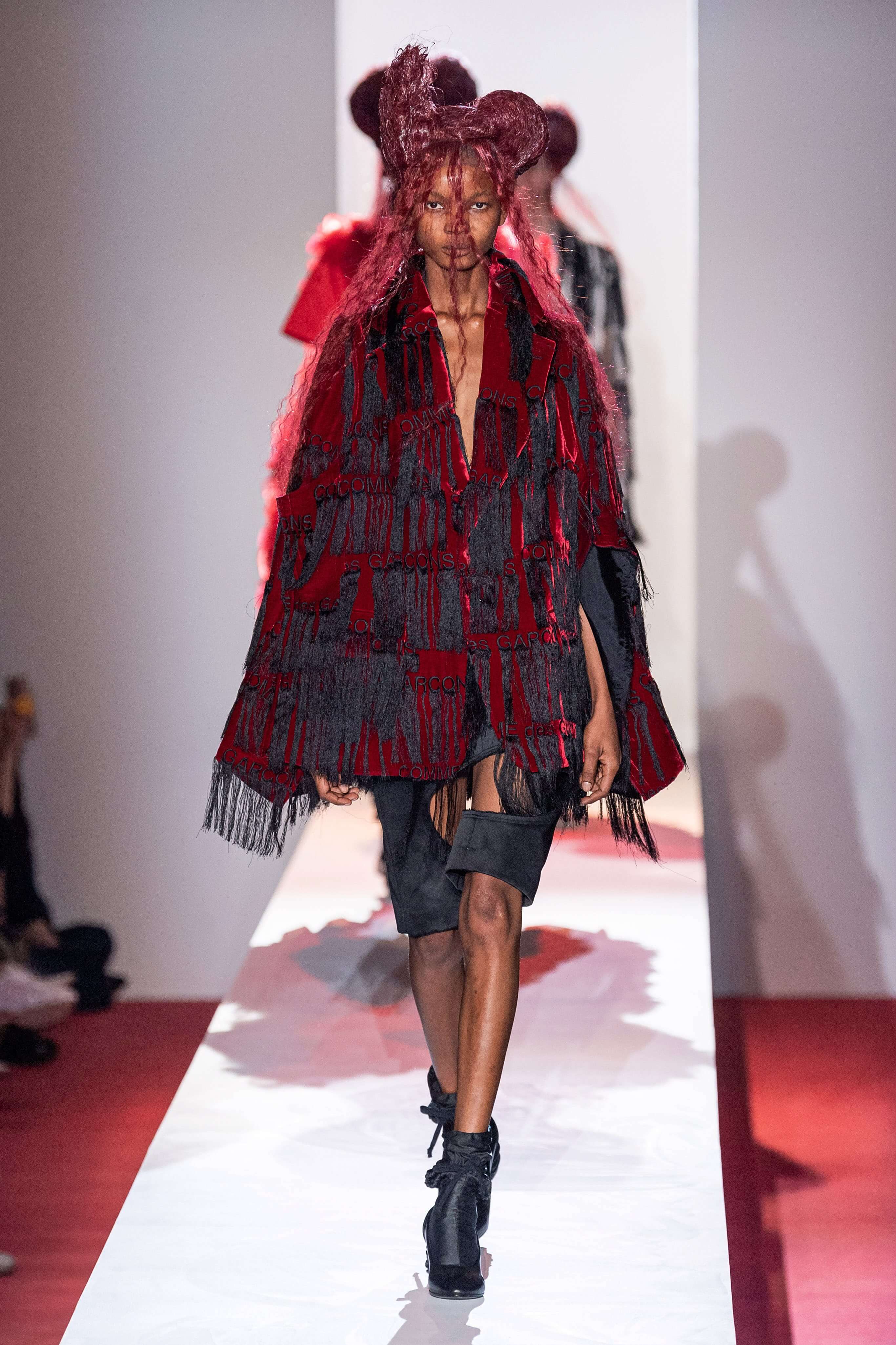 Именно елизаветинской части романа Рей Кавакубо и посвятила платья с тяжелыми фалдами, топы-корсажи с округлыми рукавами, гиперобъёмные наряды из блестящего жаккарда в вензельных орнаментах и "рогатые" прически моделей. Ряд драматичных накидок с алой велюровой бахромой, шорт и брюк с круглыми прорезями, резиновых топов и платьев без рукавов дополнили огромные королевские блузы из шелка с кружевными фестонами, пажеские рубахи из белого сукна и будто вывернутые наизнанку многослойные наряды. Вслед за ними на подиуме появились футуристичные черные костюмы острых силуэтов, а разбавили всё романтичные тренчи из золотого и принтованного цветами жаккарда.
