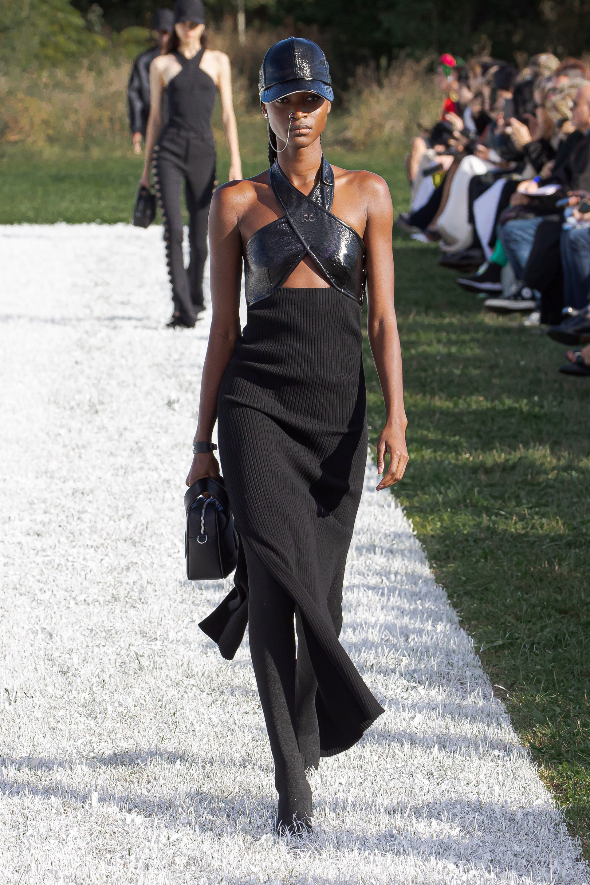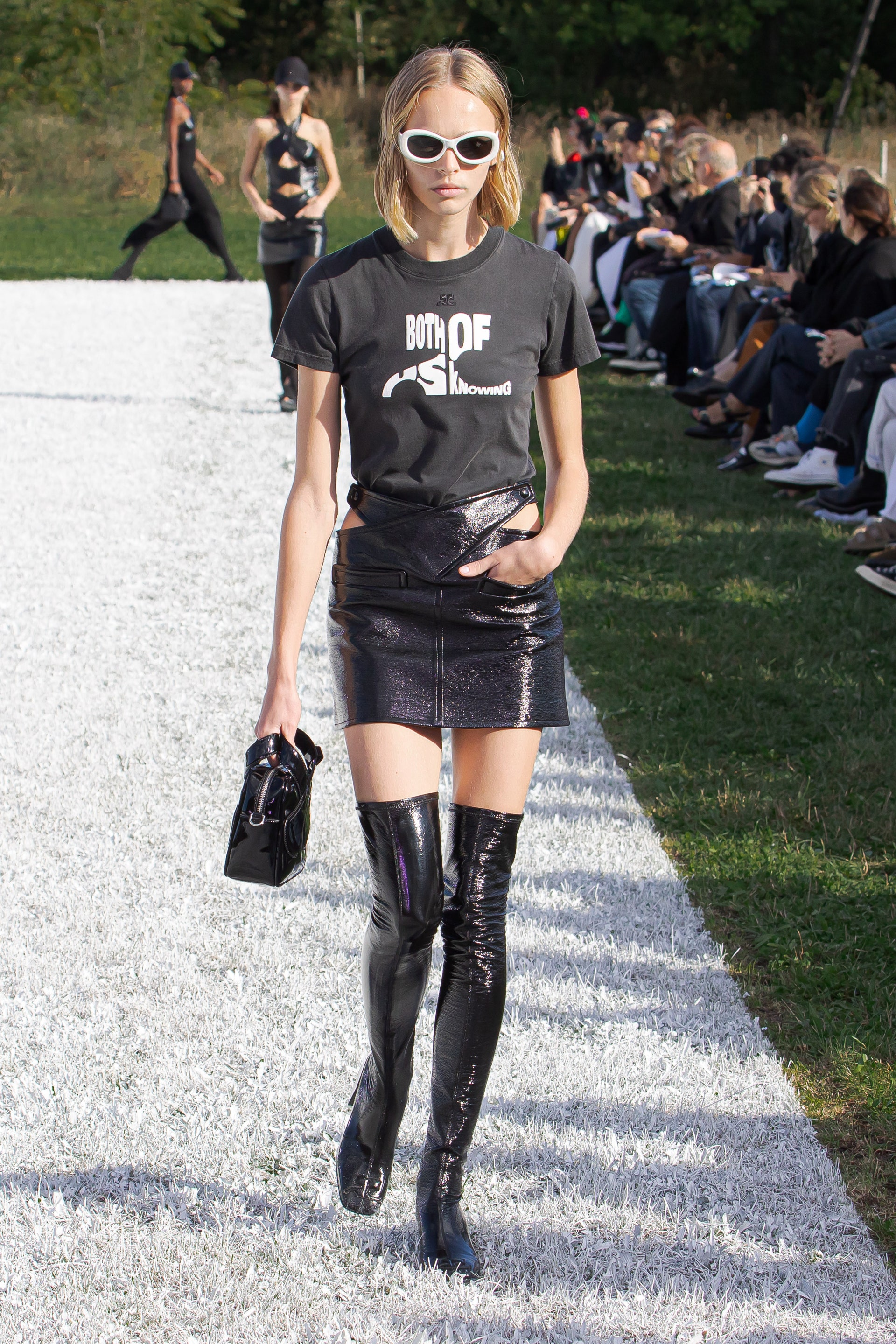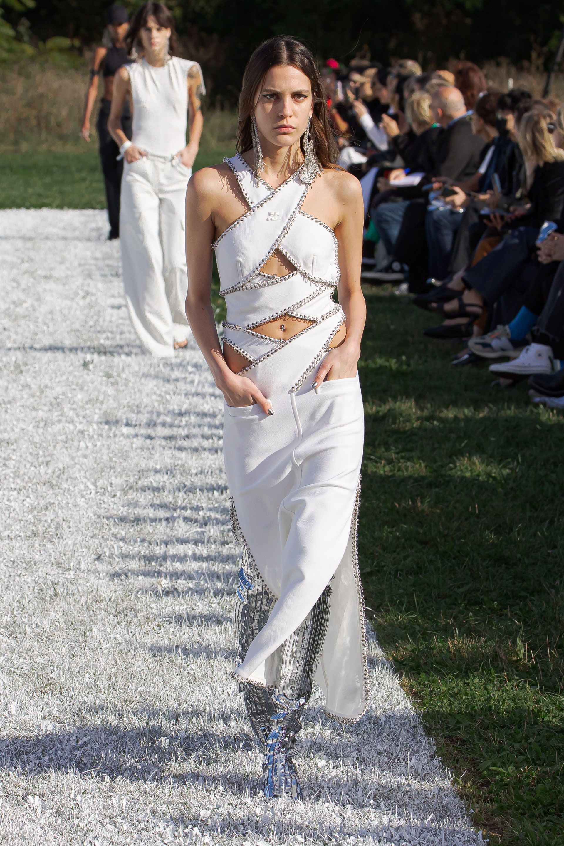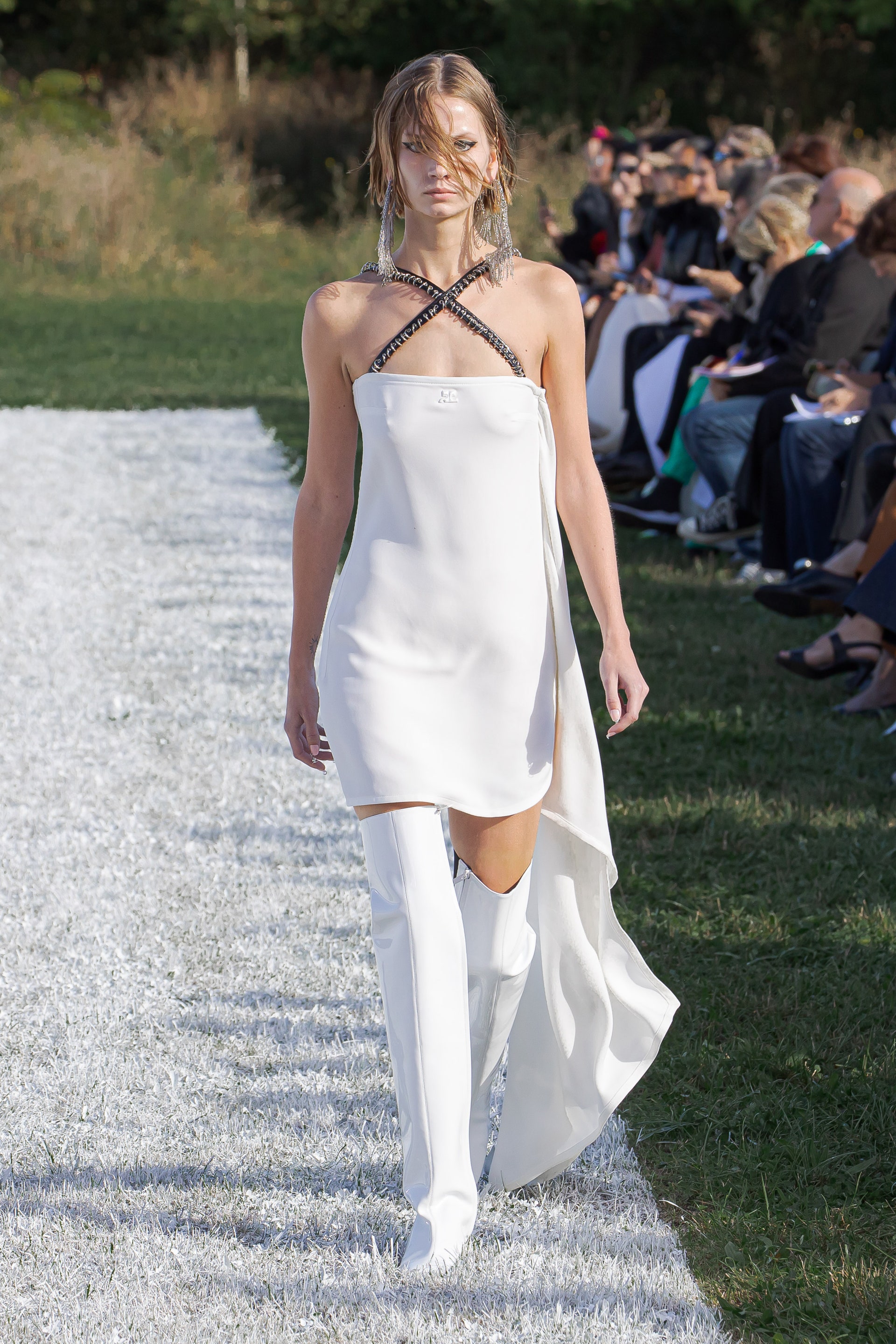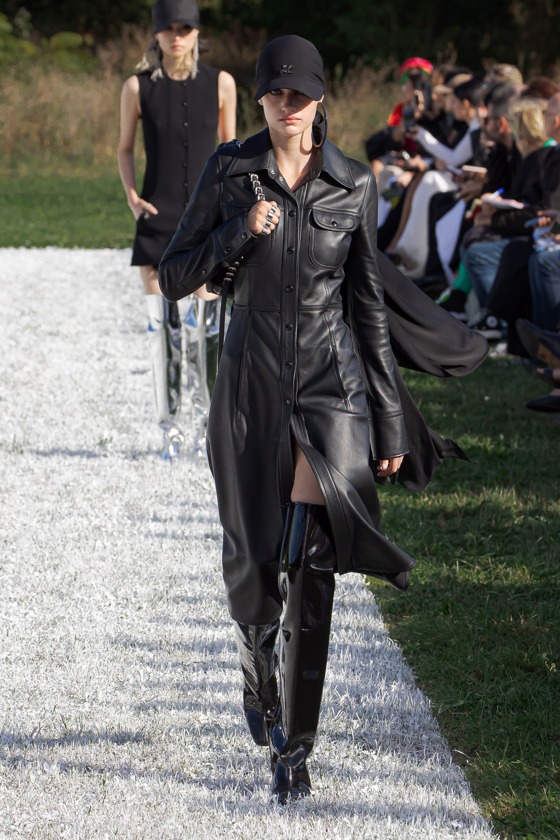 Николя Ди Феличе представил свою вторую коллекцию для легендарного дома, знаменитого чистым и футуристичным дизайном в 1960-70-х. Дизайнер поработал с архивами и решил, что всё это может стать лучшим решением для вечеринки на открытом воздухе (или в космосе). Показ прошел в Венсенском лесу, неподалеку от Парижа. Традиции музыкальных фестивалей, с их дождевиками, высокими сапогами и неизменными короткими топами с юбками, стали отправной точкой для эффектных непромокаемых плащей, ярких платьев из винила и по-настоящему фестивальных образов с кожаными брюками и прозрачными рубашками. Платья с фигурными вырезами на груди и переплетающимися завязками стали отсылкой к творениям Андре Куррежа в 1976 году. Финальные образы коллекции апеллируют к космическому минимализму Куррежа: платья — будто обернутые вокруг тела отрезы ткани, скрепленные ремешками на плечах и дополненные зеркальными или белоснежными сапогами.