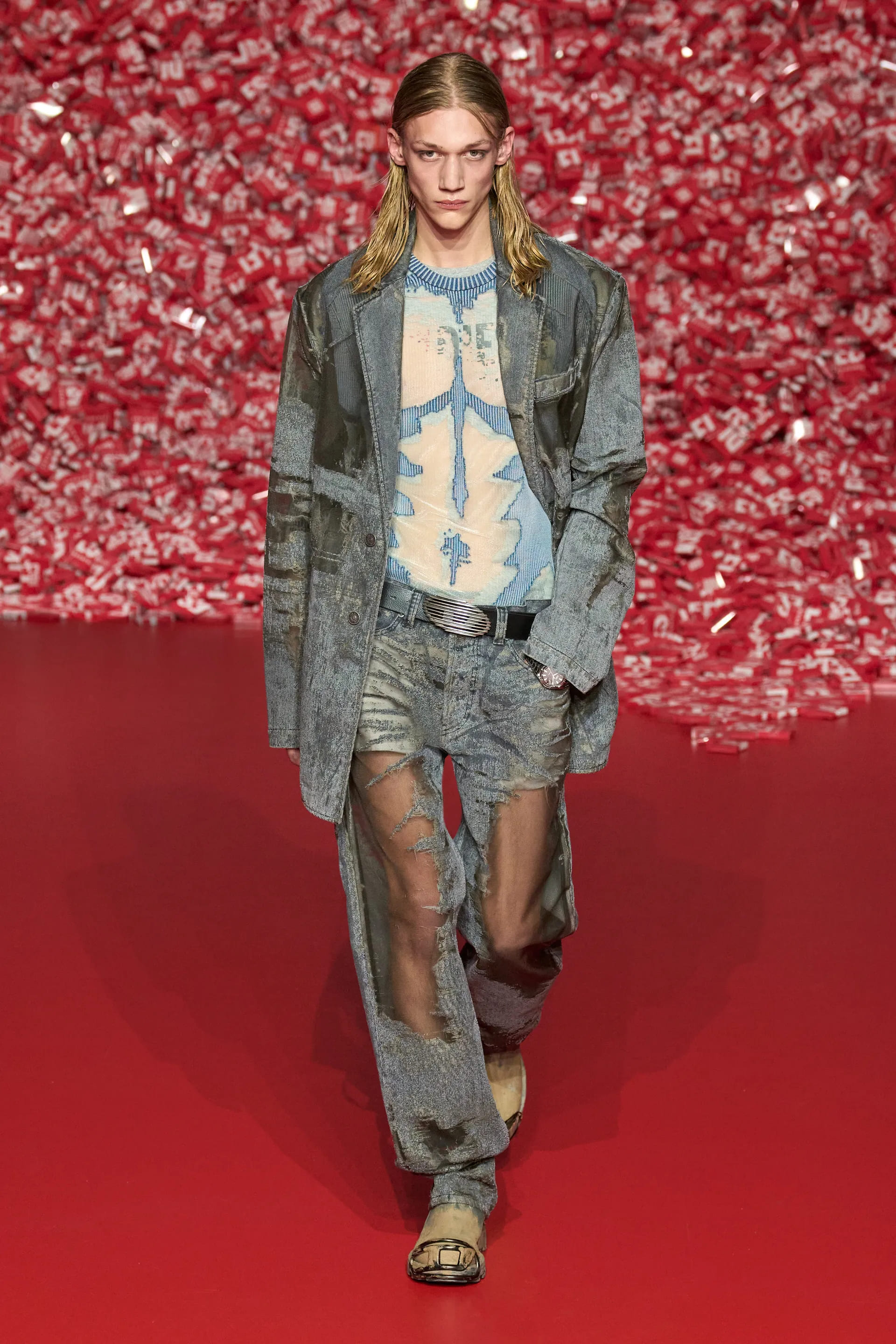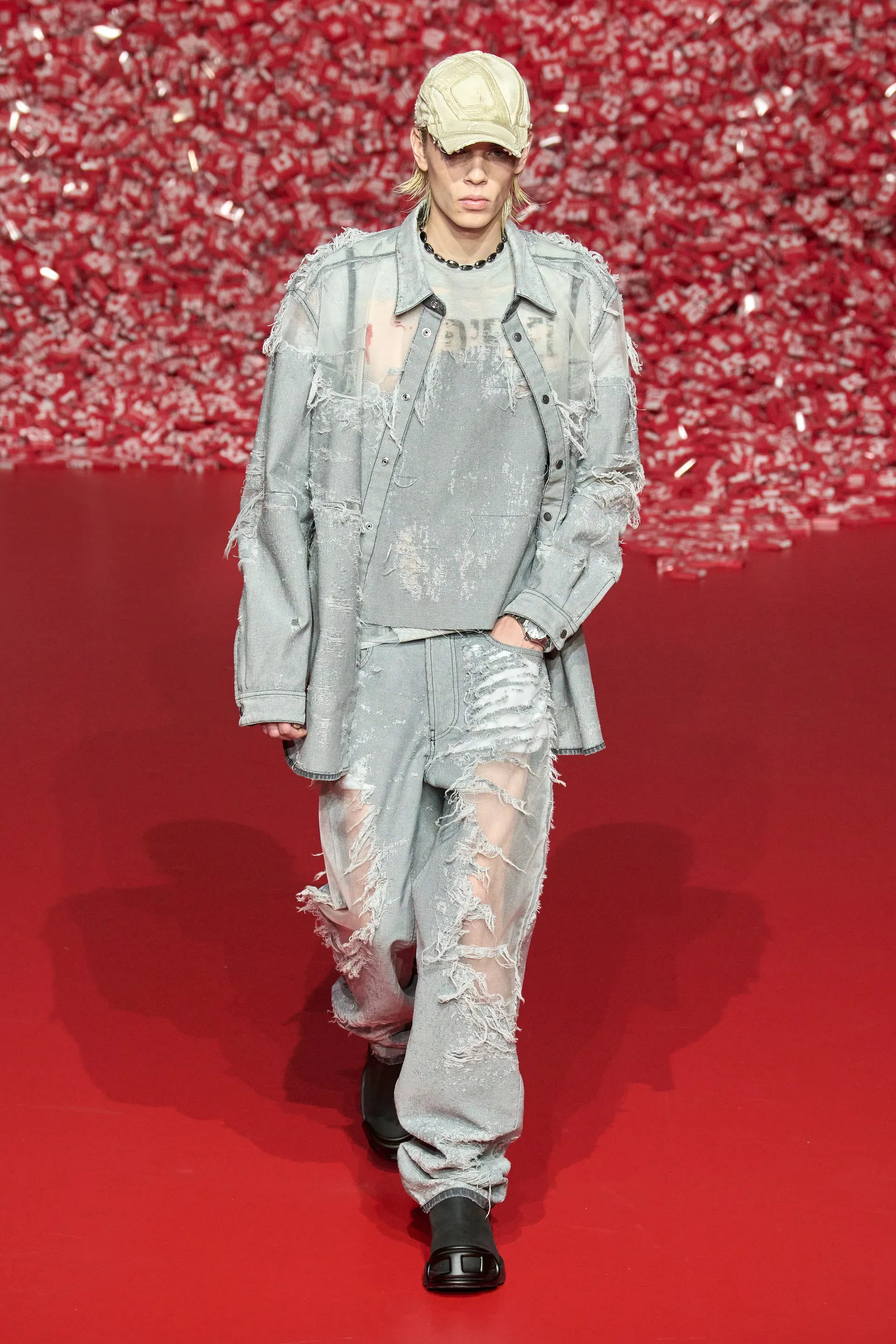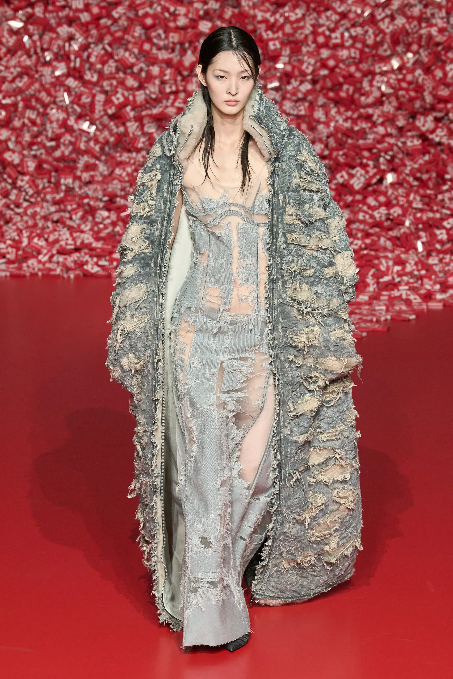 Деворе джинси на низькій посадці разом з майками та прямокутними сумками на плече, напів прозорі максісукні з деніму, спокусливі жакети та об’ємні пальта – завдяки використанню цієї техніки вироби вийшли доволі “сексуально-ніжними”, а ось крій, аксесуари та взуття додавали тієї самої змішаної, інколи дивної та надто відвертої естетики нульових. Також Diesel використав техніку відбілювання та покриття деніму пластиком: технологічністі обробки деніму в цьому сезоні надали великої уваги.