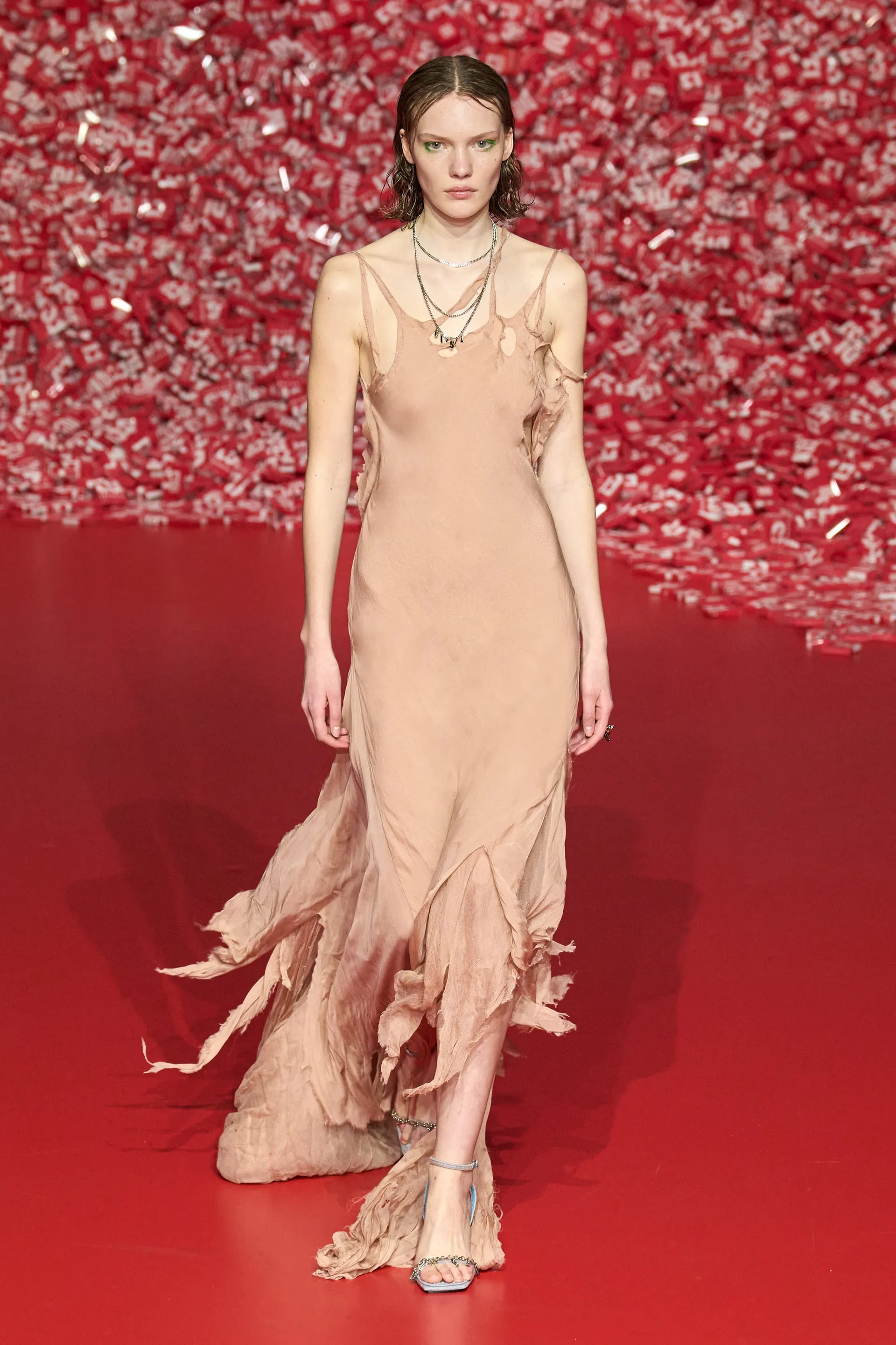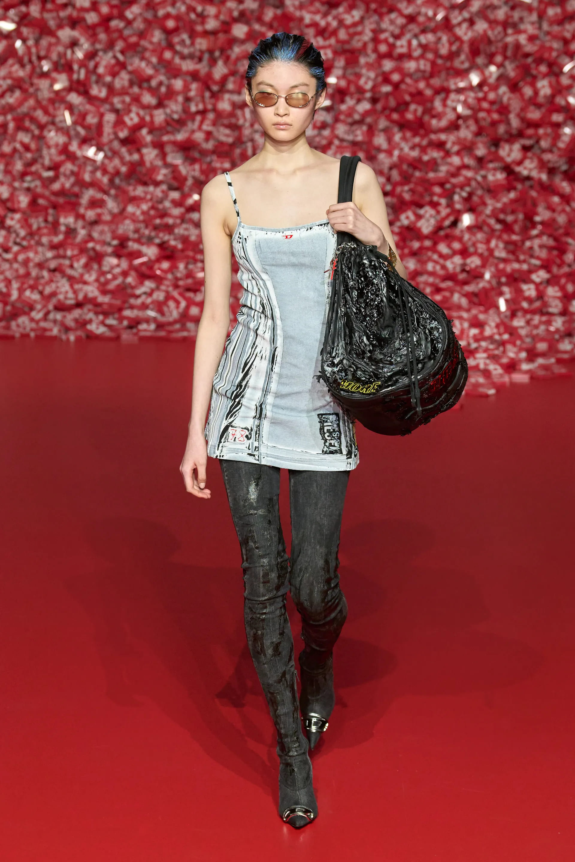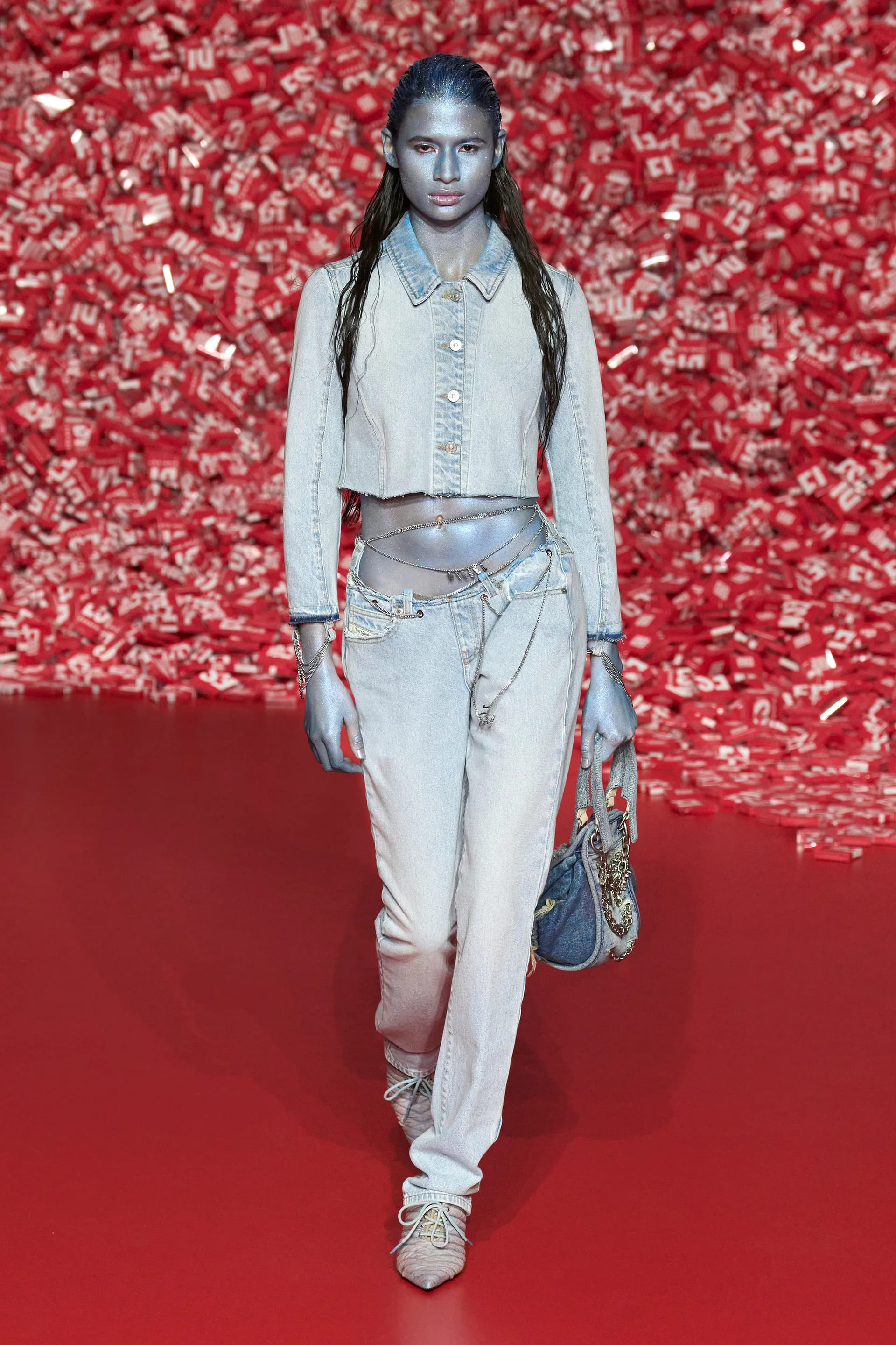 Деворе джинси на низькій посадці разом з майками та прямокутними сумками на плече, напів прозорі максісукні з деніму, спокусливі жакети та об’ємні пальта – завдяки використанню цієї техніки вироби вийшли доволі “сексуально-ніжними”, а ось крій, аксесуари та взуття додавали тієї самої змішаної, інколи дивної та надто відвертої естетики нульових. Також Diesel використав техніку відбілювання та покриття деніму пластиком: технологічністі обробки деніму в цьому сезоні надали великої уваги.