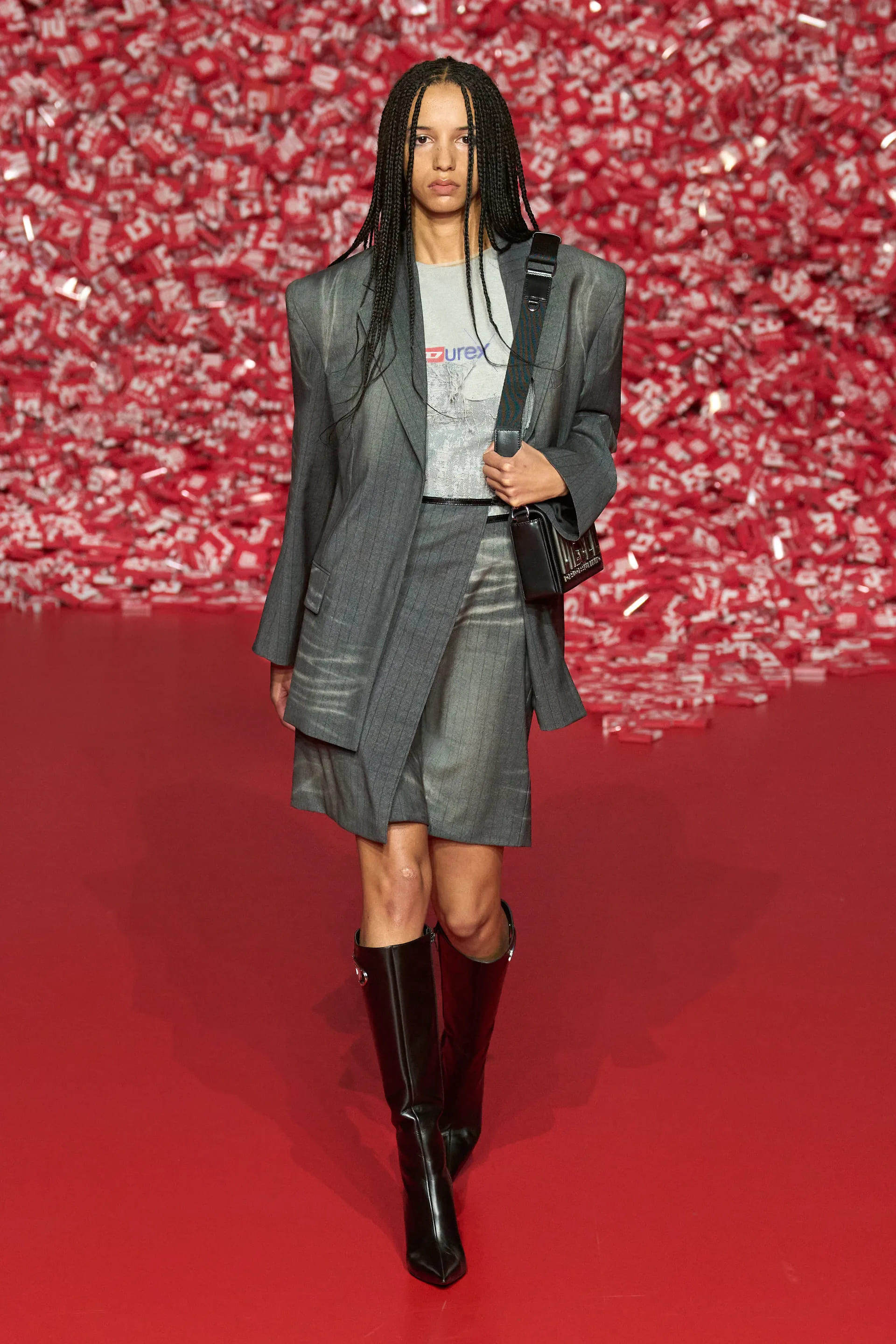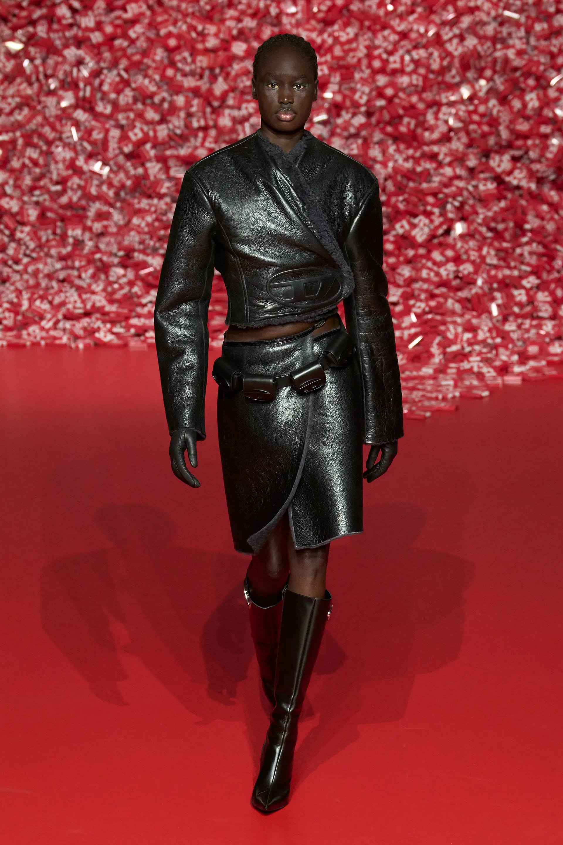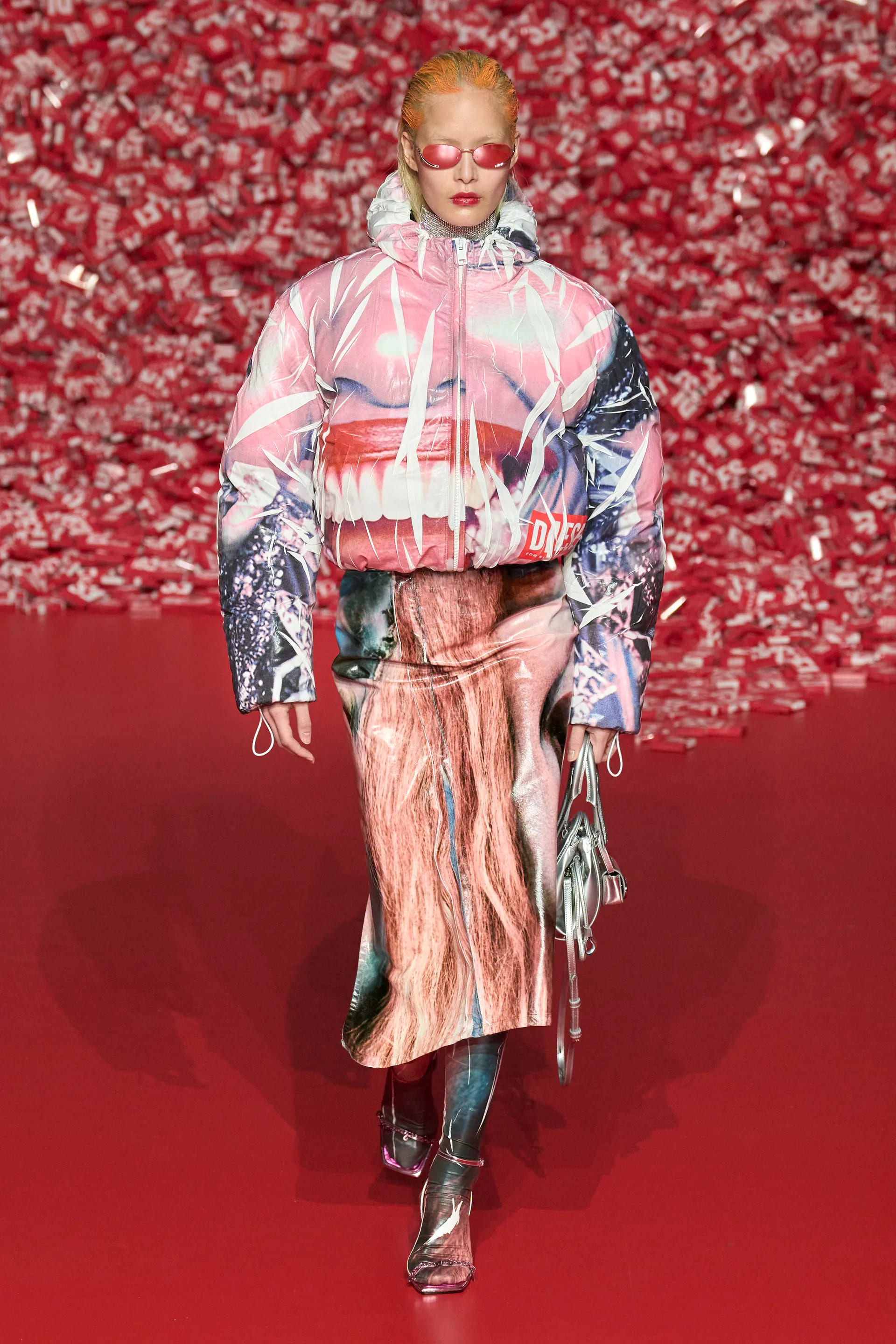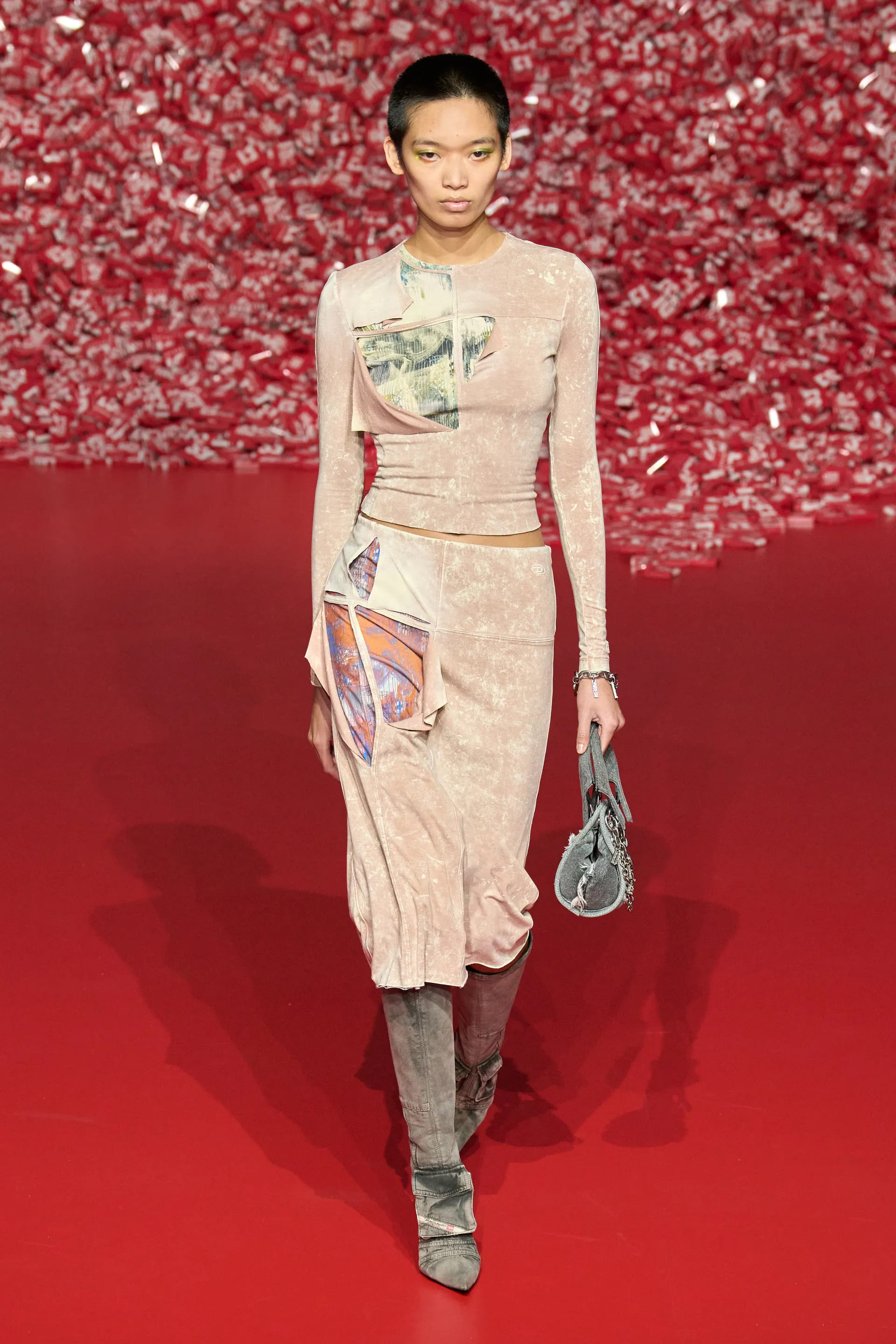Колекцію відкрили джинси на дуже низькій посадці, що буквально закривали взуття. Верхню частину образу доповнював зістарений шкіряний лого бомбер. У наступному уже жіночому образі ми бачимо ті самі джинси на дуже низькій посадці (тобто мода на них триватиме і наступної зими так само) та фактурний светр. У всій колекції прослідковується молодіжна естетика 1990-х та початку 2000-х - Y2K. Силуетні юбки в поєднанні зі светрами на застібках, мінітопи, об’ємні пуховики та великі дивні принти - це мова, якою розмовляє Diesel girl чи boy у новому сезоні.