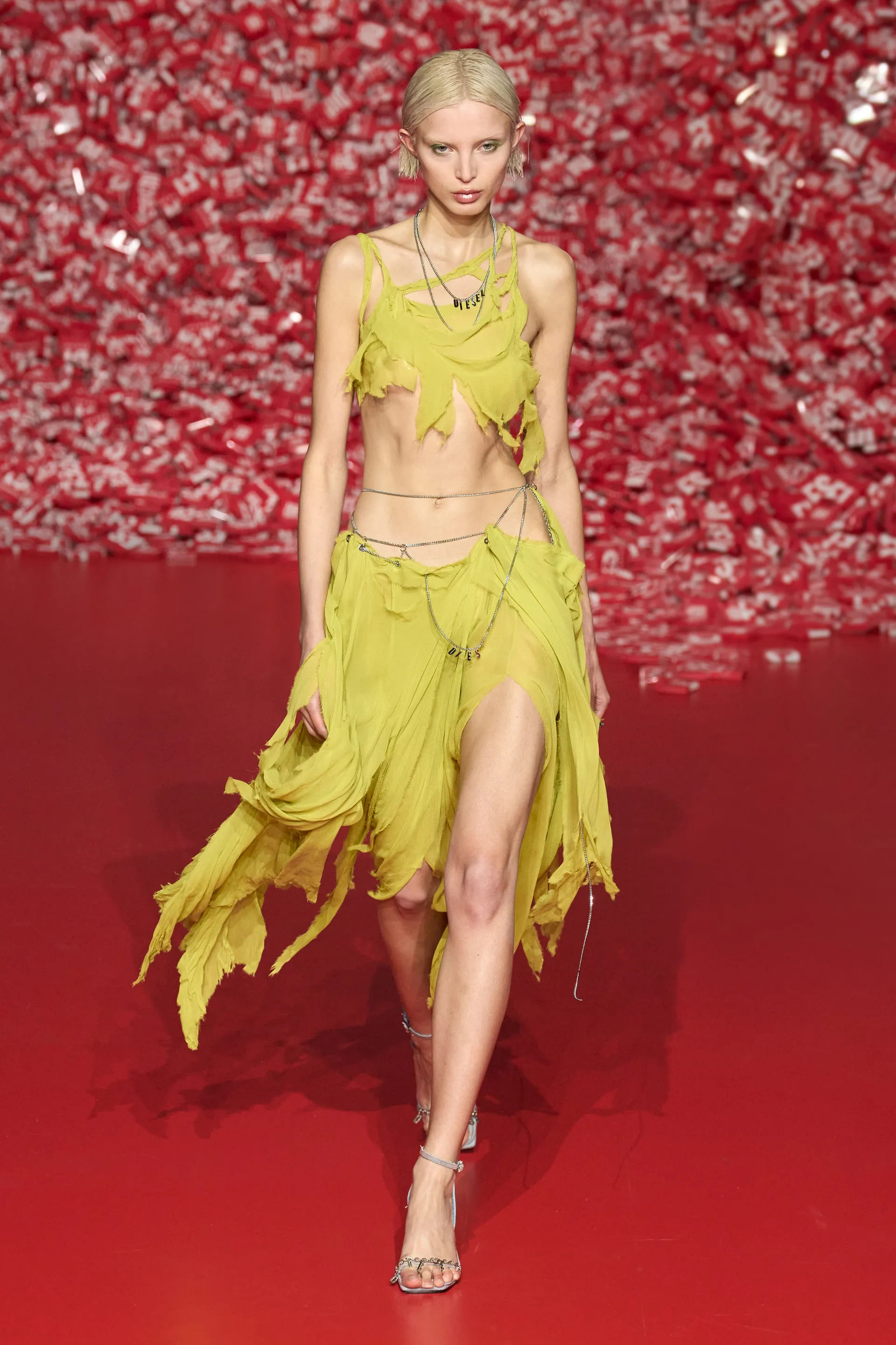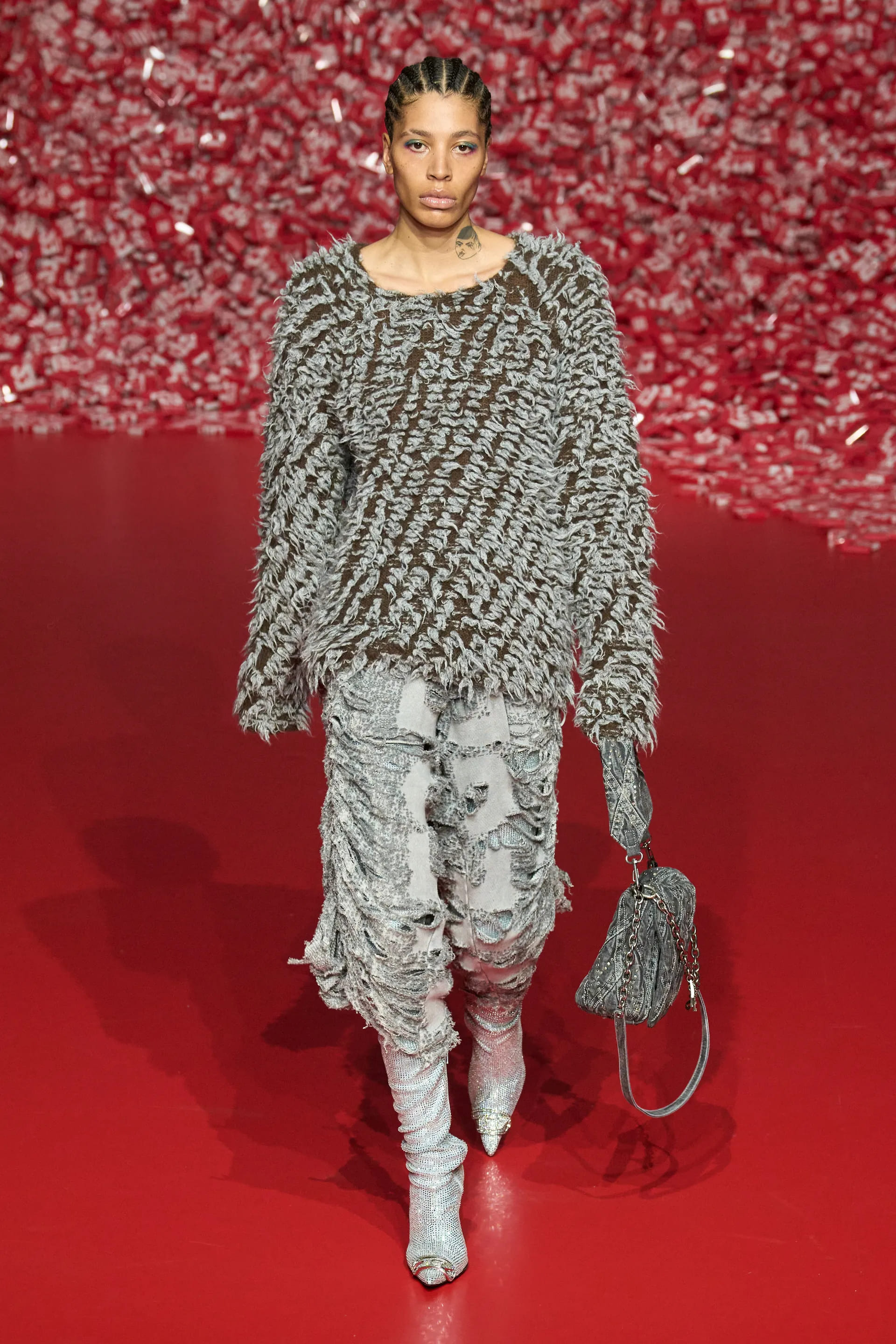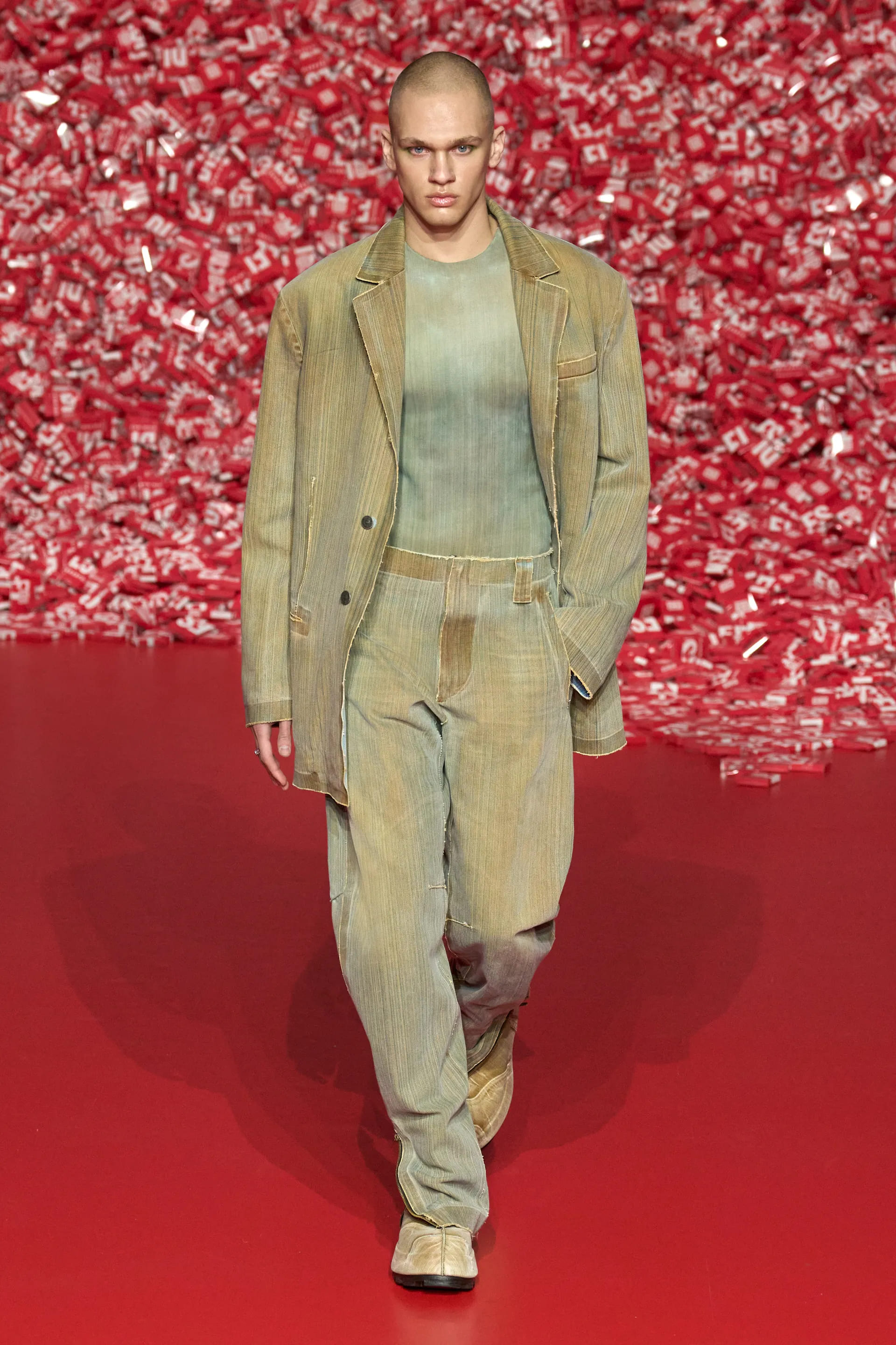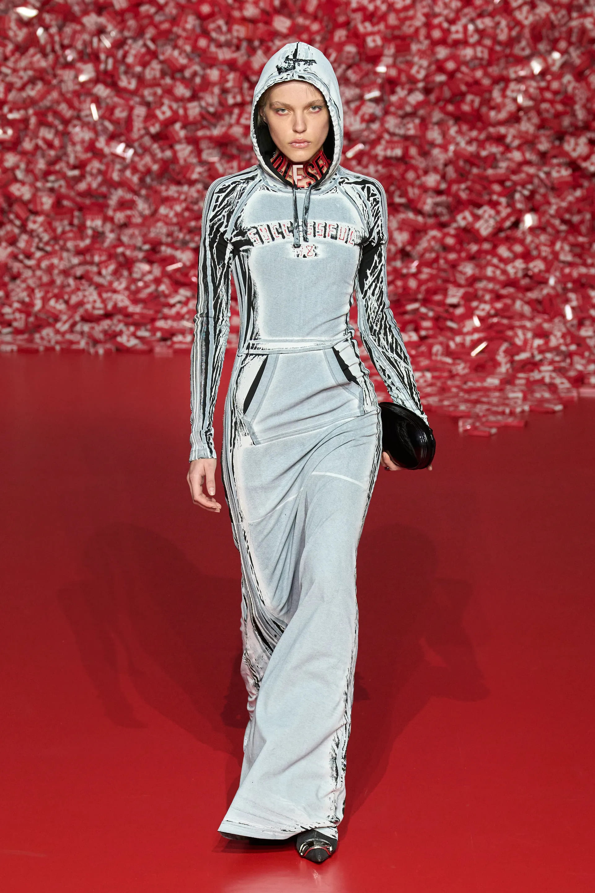 Колекцію відкрили джинси на дуже низькій посадці, що буквально закривали взуття. Верхню частину образу доповнював зістарений шкіряний лого бомбер. У наступному уже жіночому образі ми бачимо ті самі джинси на дуже низькій посадці (тобто мода на них триватиме і наступної зими так само) та фактурний светр. У всій колекції прослідковується молодіжна естетика 1990-х та початку 2000-х - Y2K. Силуетні юбки в поєднанні зі светрами на застібках, мінітопи, об’ємні пуховики та великі дивні принти - це мова, якою розмовляє Diesel girl чи boy у новому сезоні.