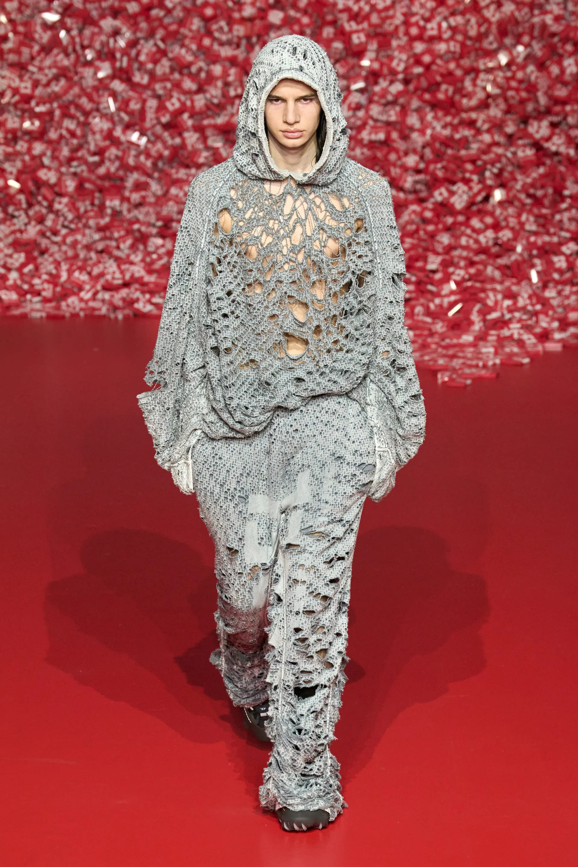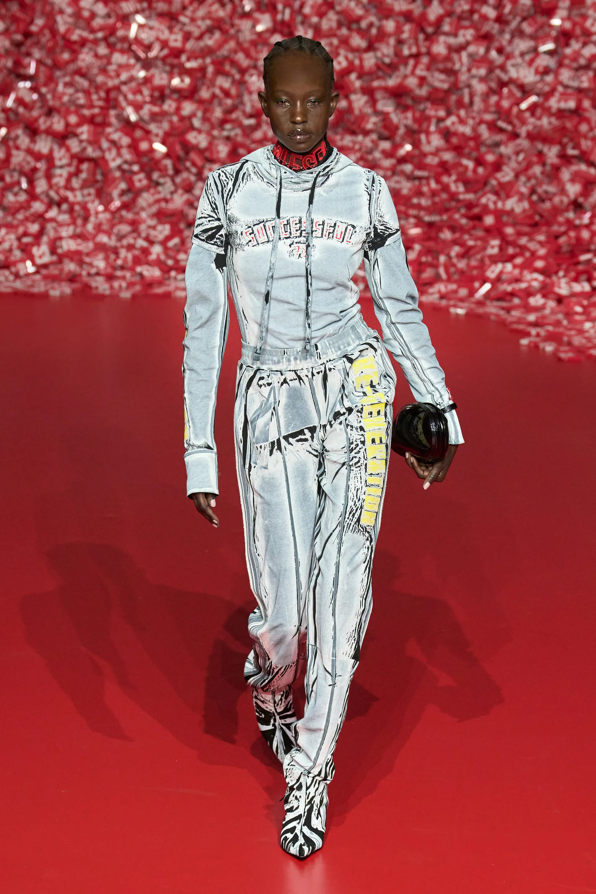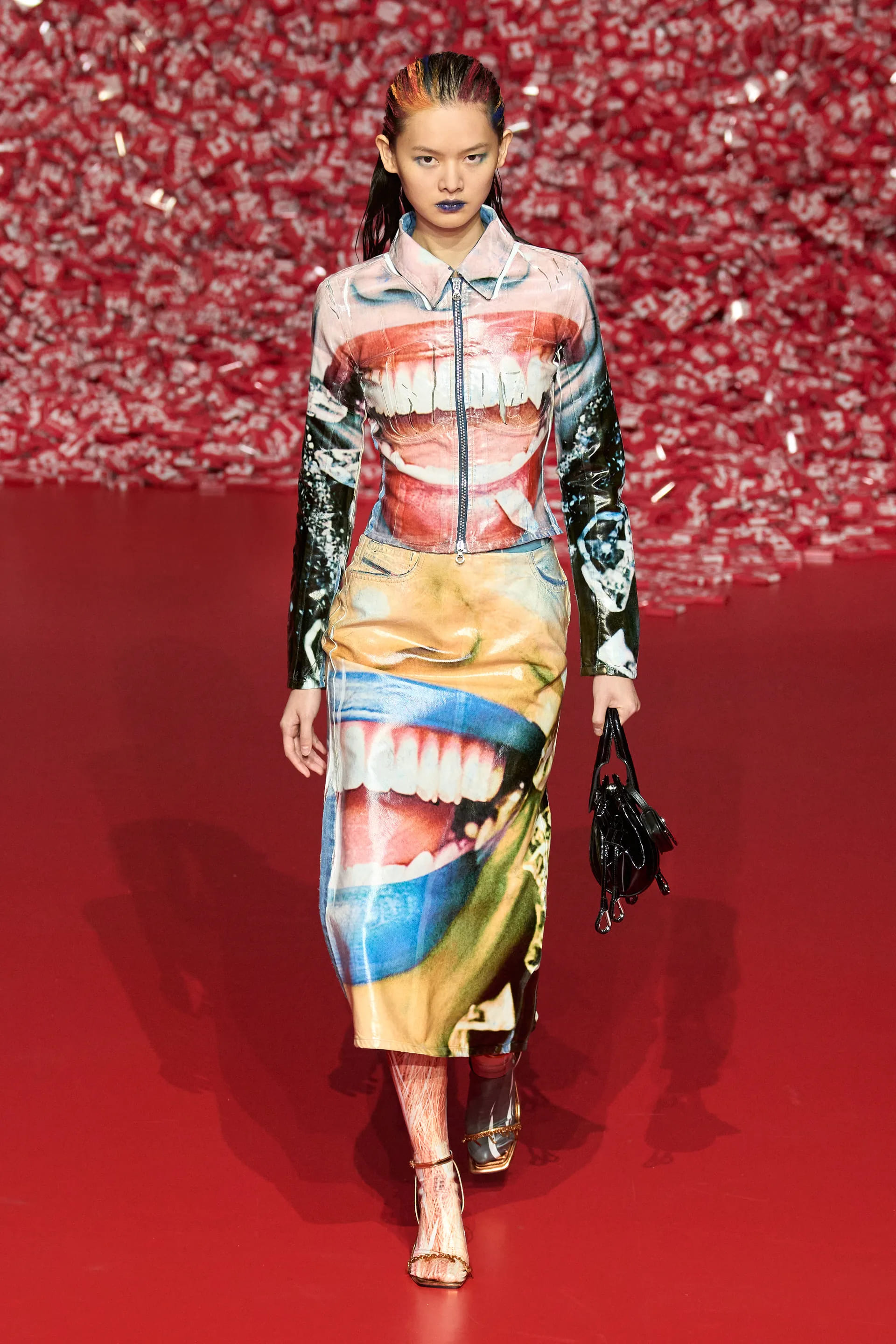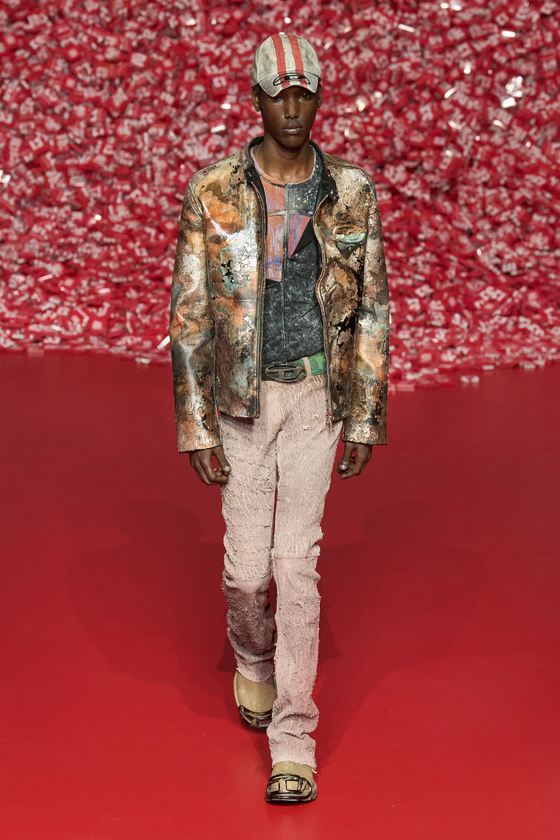 Колекцію відкрили джинси на дуже низькій посадці, що буквально закривали взуття. Верхню частину образу доповнював зістарений шкіряний лого бомбер. У наступному уже жіночому образі ми бачимо ті самі джинси на дуже низькій посадці (тобто мода на них триватиме і наступної зими так само) та фактурний светр. У всій колекції прослідковується молодіжна естетика 1990-х та початку 2000-х - Y2K. Силуетні юбки в поєднанні зі светрами на застібках, мінітопи, об’ємні пуховики та великі дивні принти - це мова, якою розмовляє Diesel girl чи boy у новому сезоні.