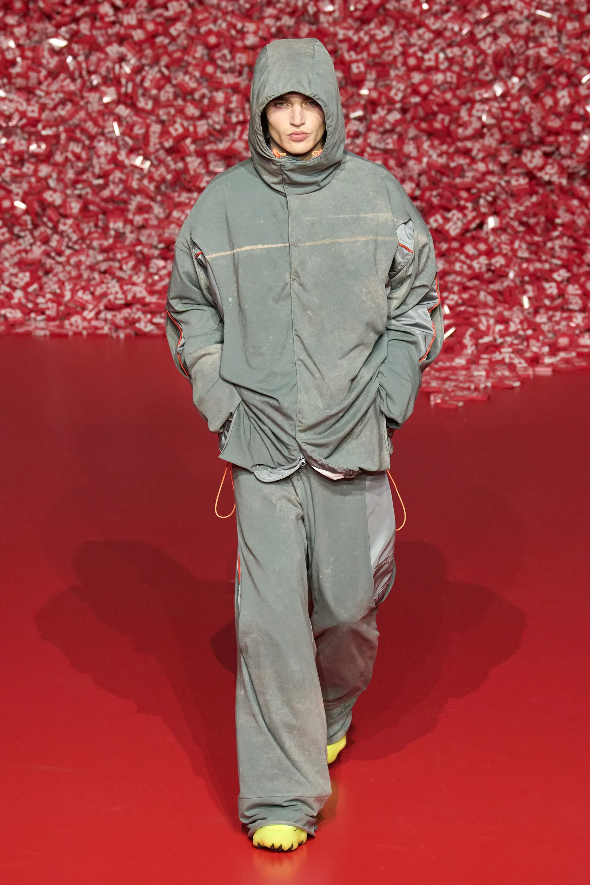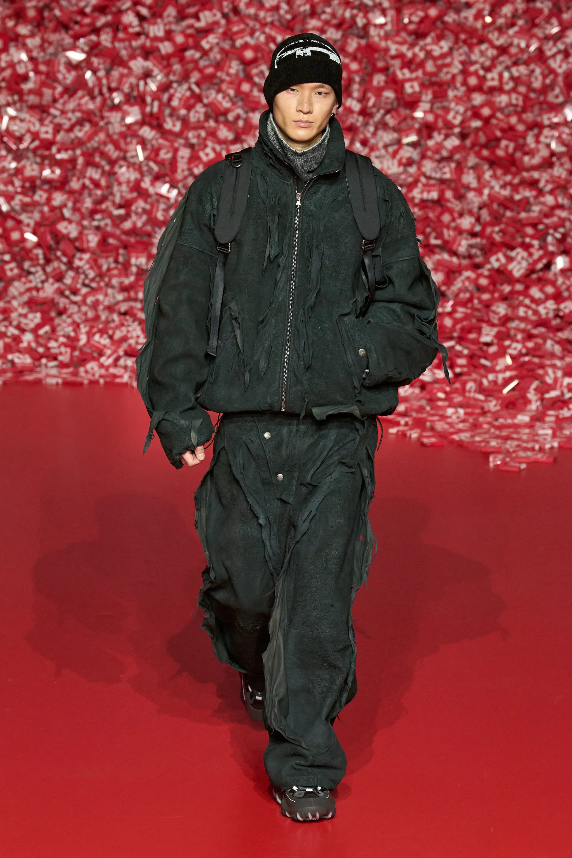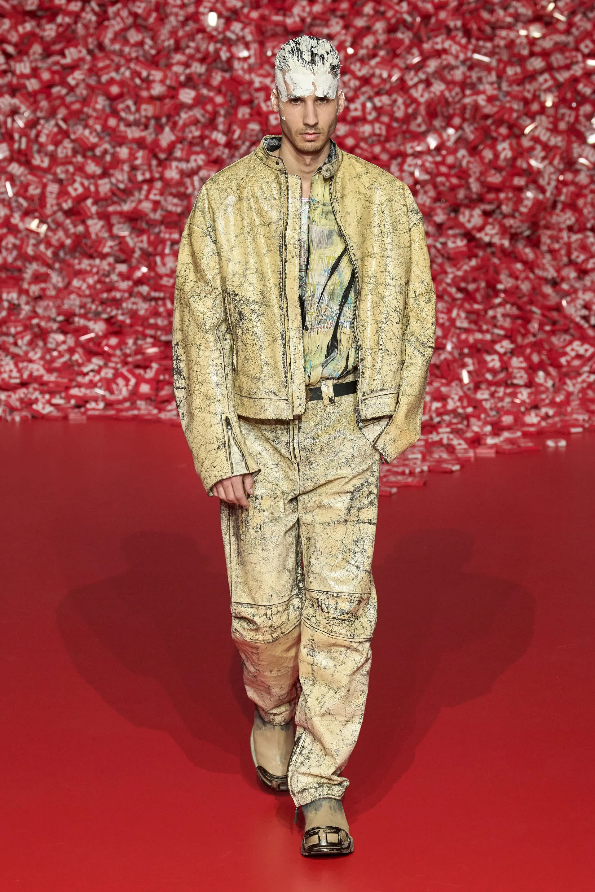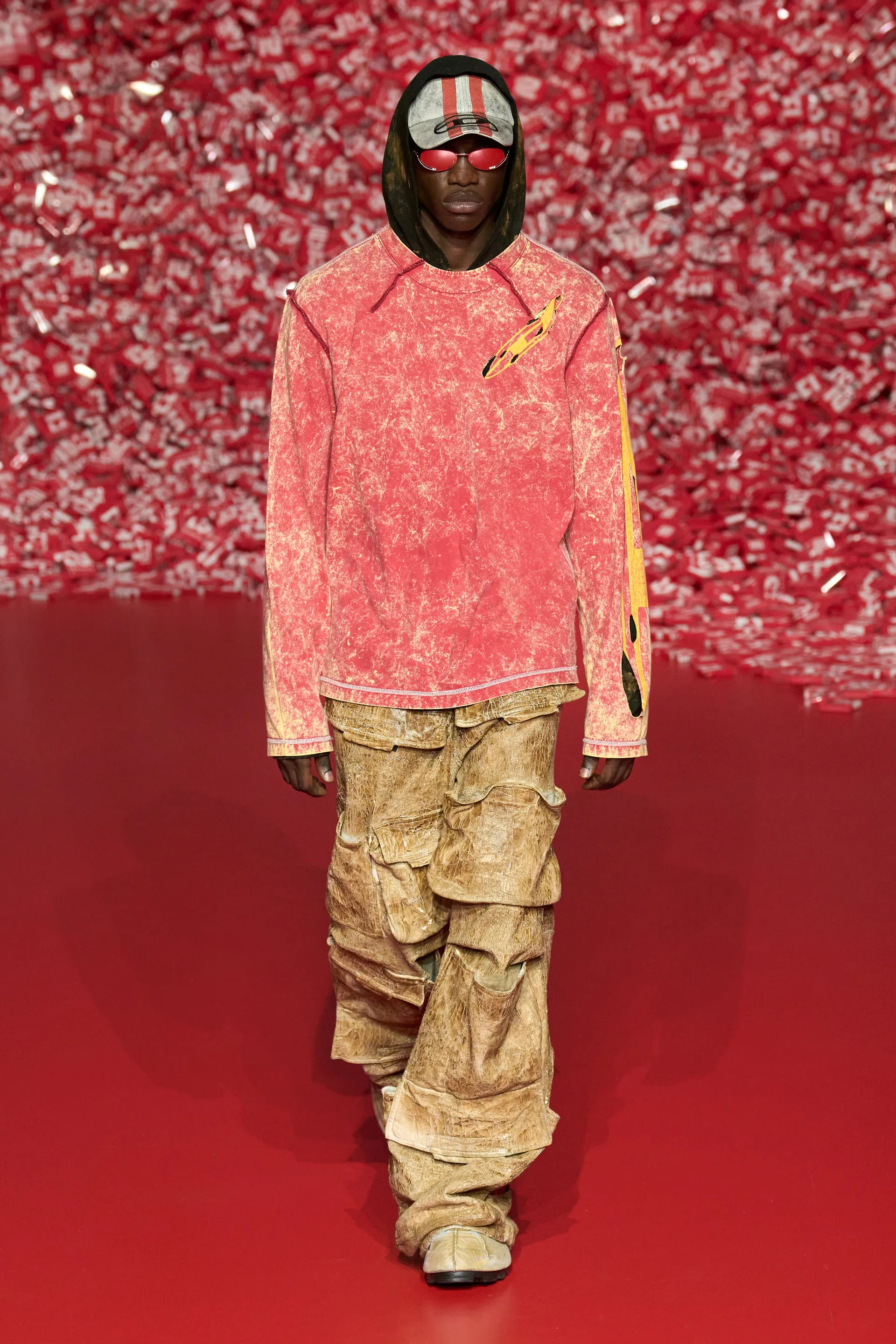Колекцію відкрили джинси на дуже низькій посадці, що буквально закривали взуття. Верхню частину образу доповнював зістарений шкіряний лого бомбер. У наступному уже жіночому образі ми бачимо ті самі джинси на дуже низькій посадці (тобто мода на них триватиме і наступної зими так само) та фактурний светр. У всій колекції прослідковується молодіжна естетика 1990-х та початку 2000-х - Y2K. Силуетні юбки в поєднанні зі светрами на застібках, мінітопи, об’ємні пуховики та великі дивні принти - це мова, якою розмовляє Diesel girl чи boy у новому сезоні.