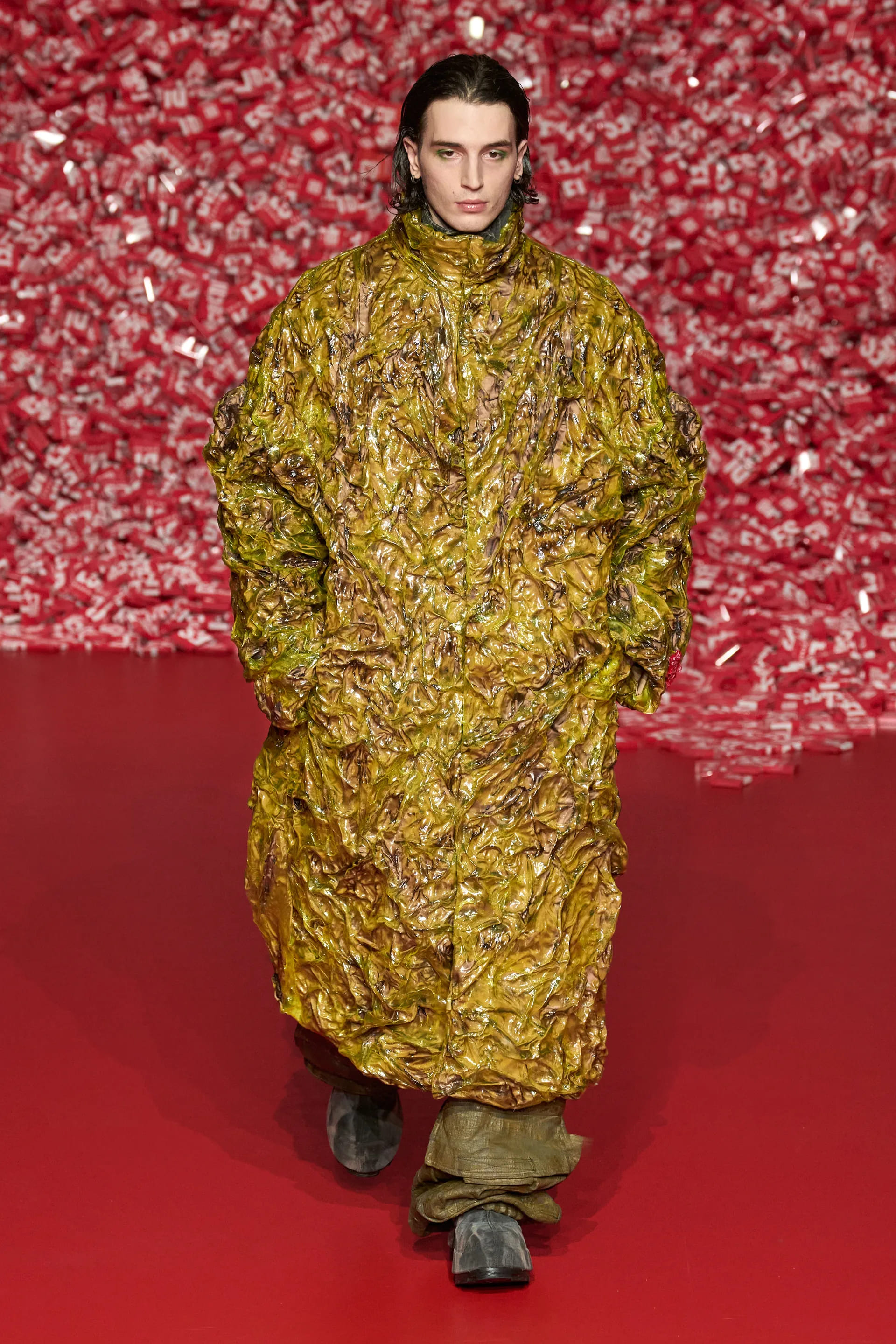 Також варто відмітити й кілька в’язаних образів: завдяки незвичній техніці в’язання, бренд створив об’ємні гранж-луки, що на показі буквально розвалювалися в русі моделей.