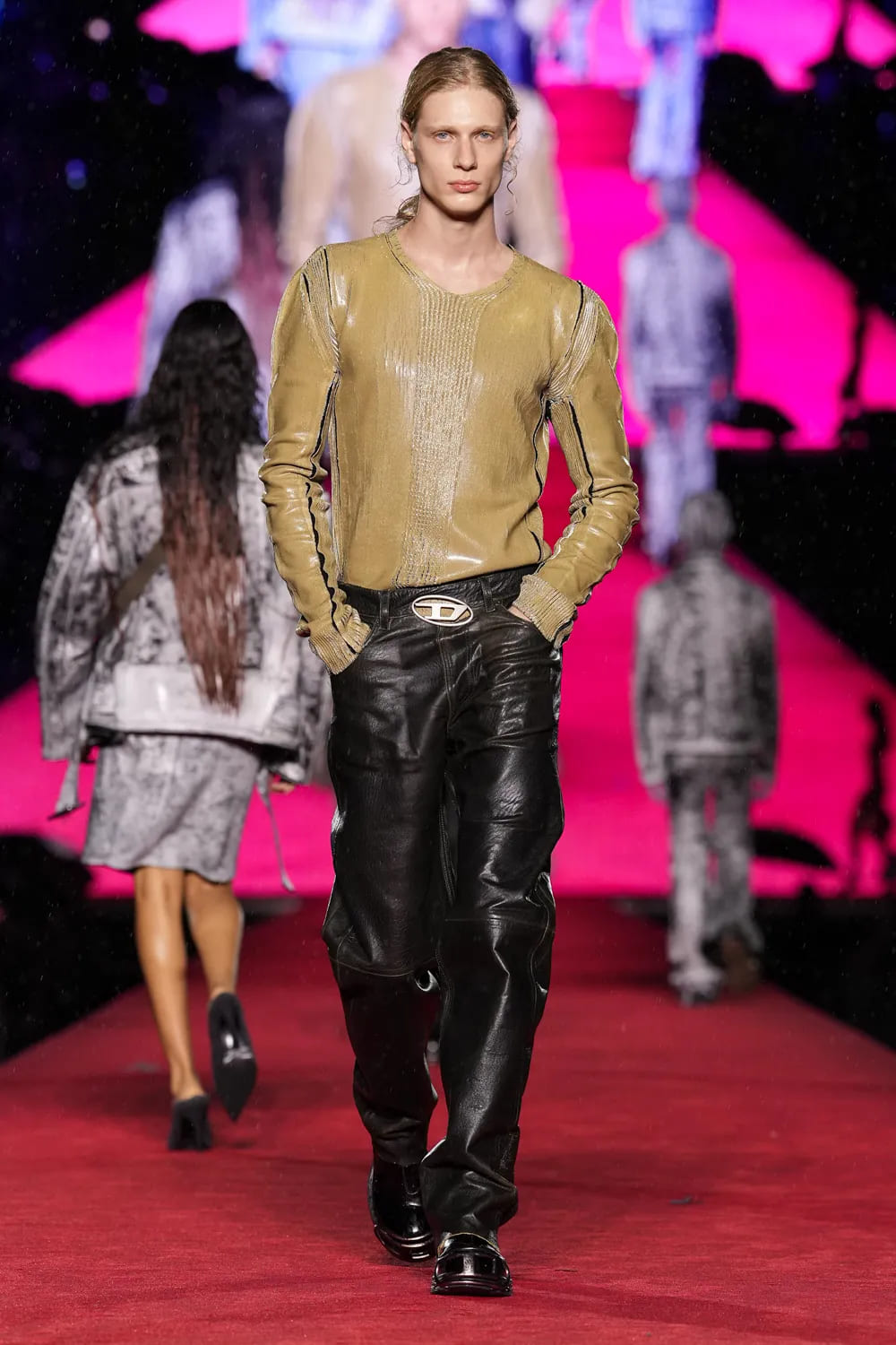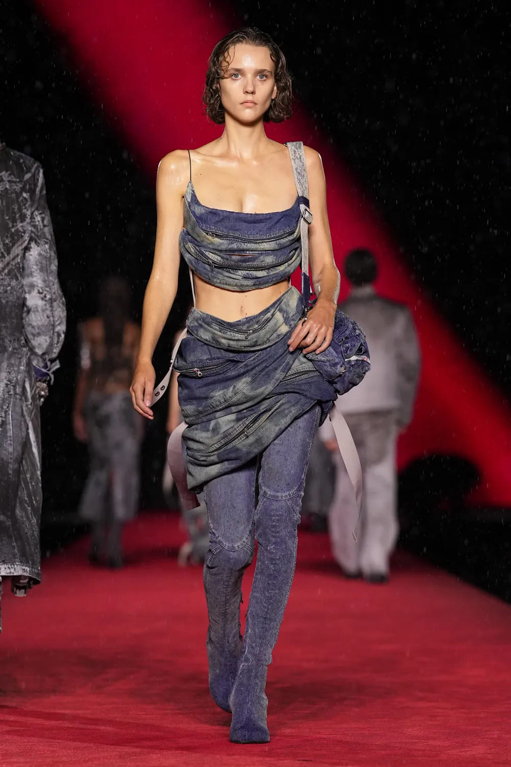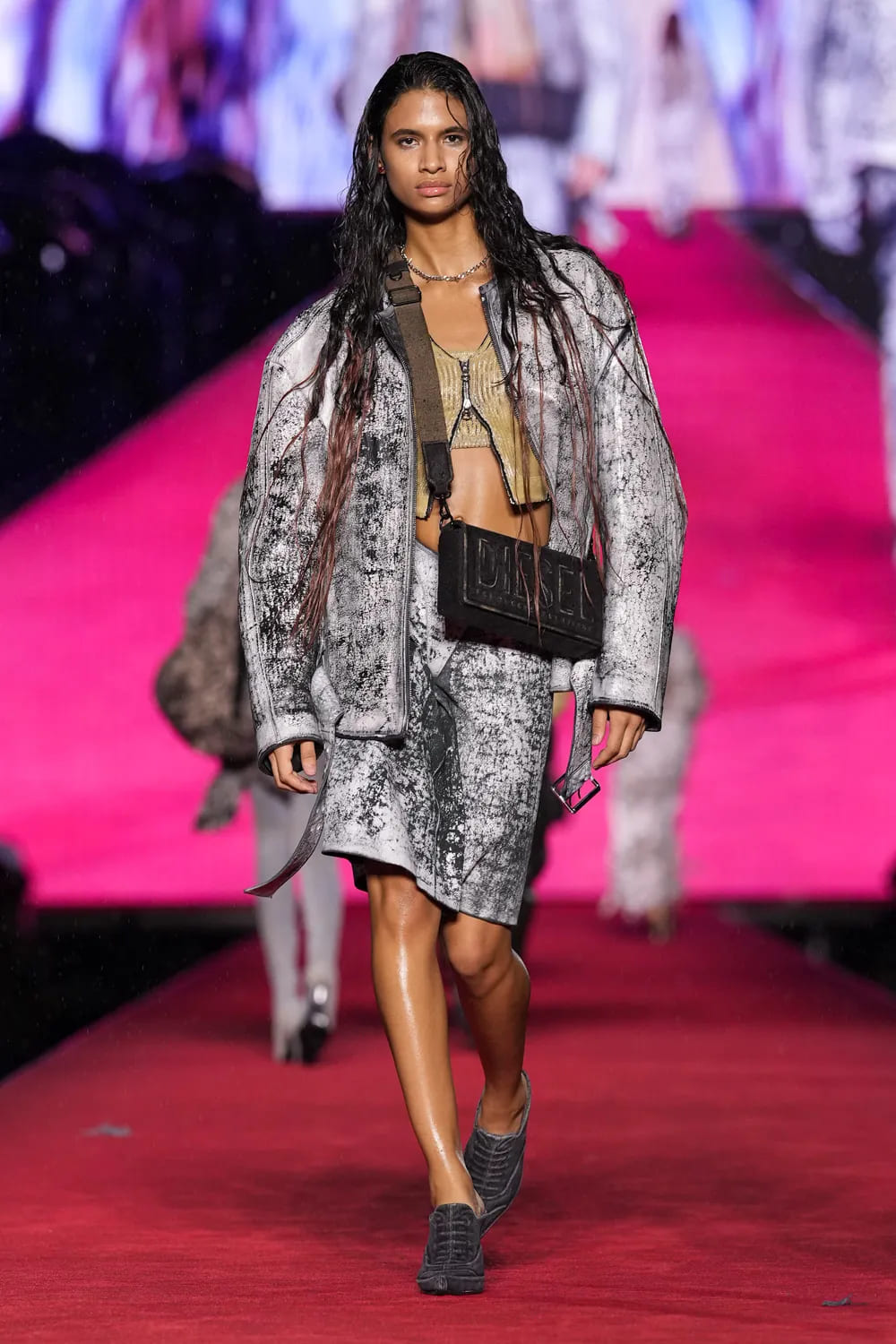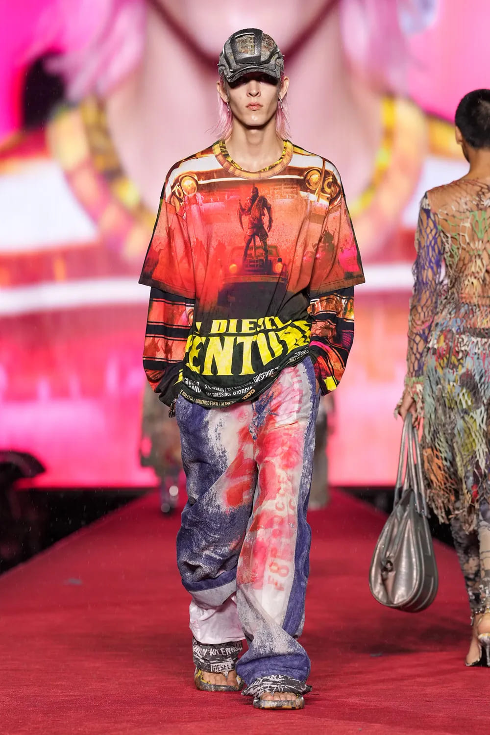 Утилітарні техніки, вигадлива деконструкція й дотепна інтерпретація голлівудських кодів стали важливими елементами для Diesel. На айтемах з’явилися потерті принти кінопостерів, видруковані на тканинах. До того ж сріблясті та нюдові образи підкреслили моделі, шкіру яких розмалювали у цей тон. У виборі текстилю бренд надав перевагу трикотажу, джинсу, люрексу й кристалам.
