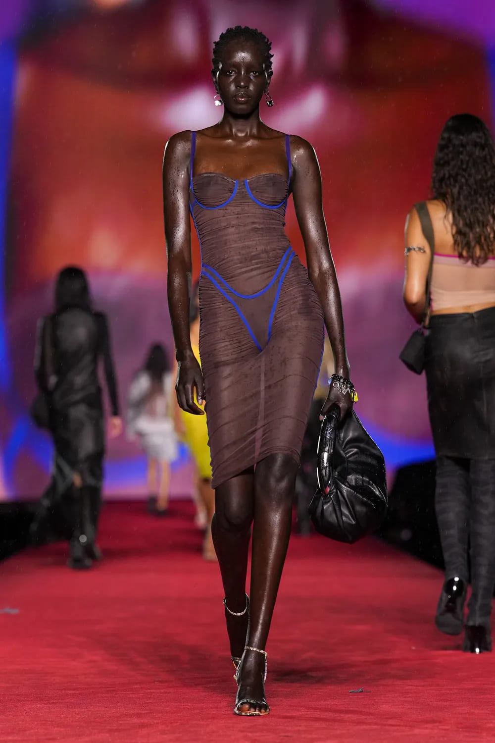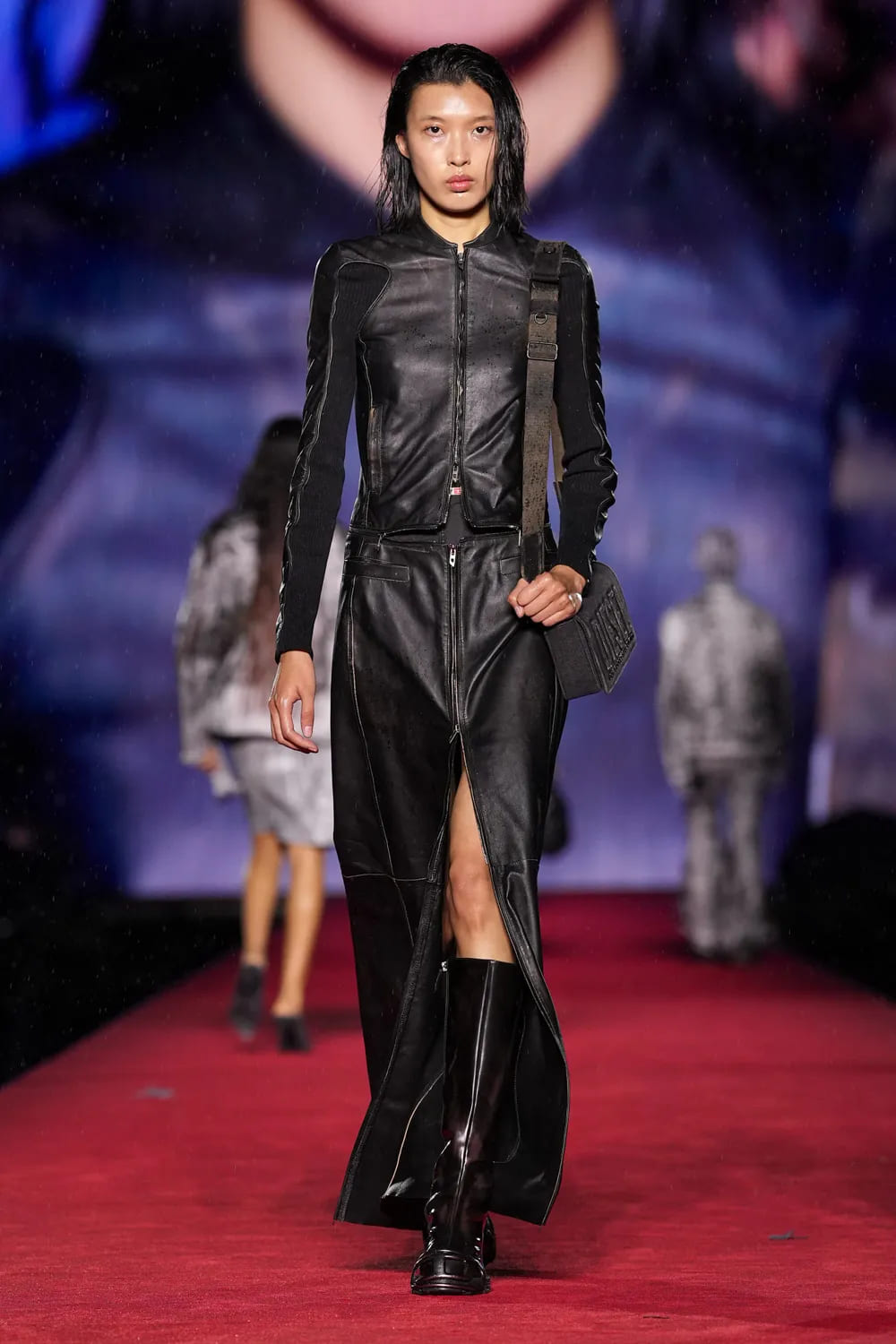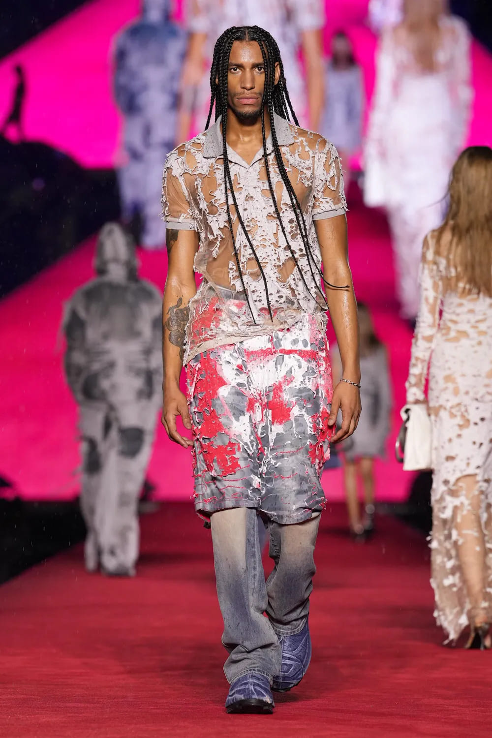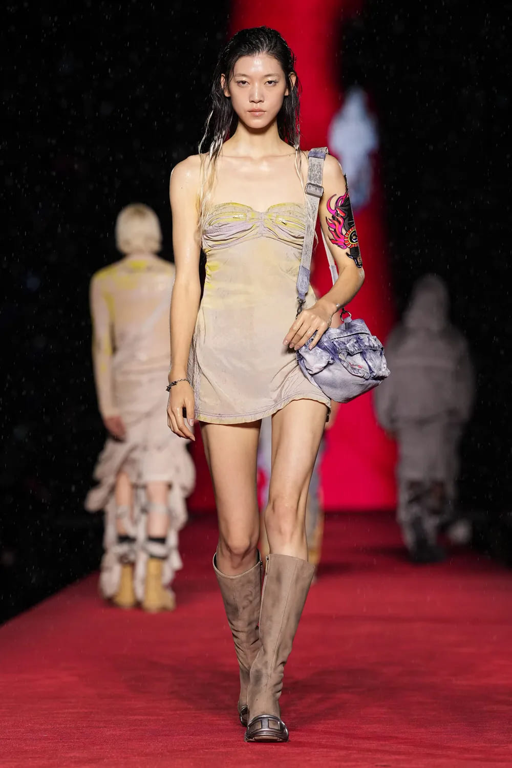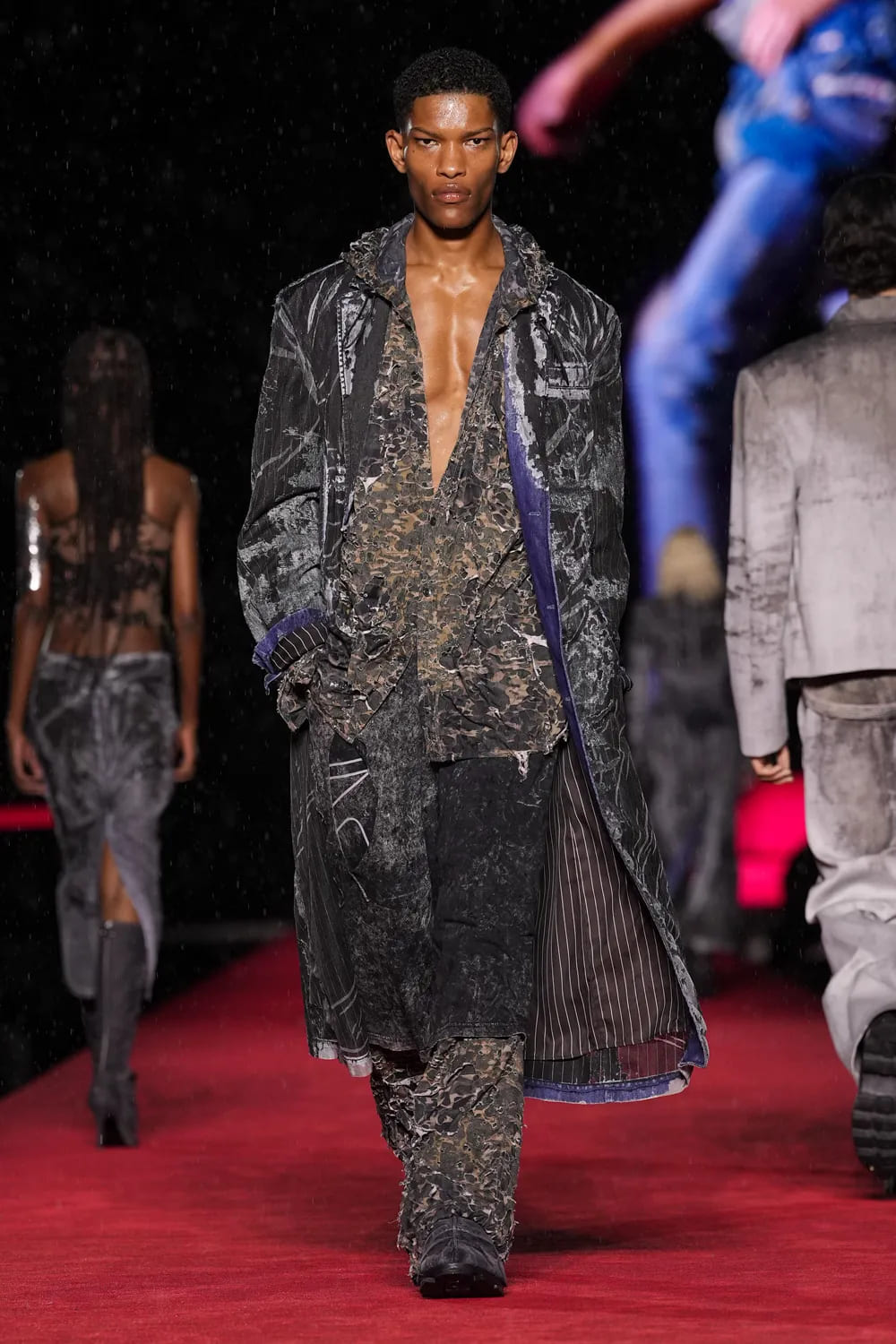 Утилітарні техніки, вигадлива деконструкція й дотепна інтерпретація голлівудських кодів стали важливими елементами для Diesel. На айтемах з’явилися потерті принти кінопостерів, видруковані на тканинах. До того ж сріблясті та нюдові образи підкреслили моделі, шкіру яких розмалювали у цей тон. У виборі текстилю бренд надав перевагу трикотажу, джинсу, люрексу й кристалам.