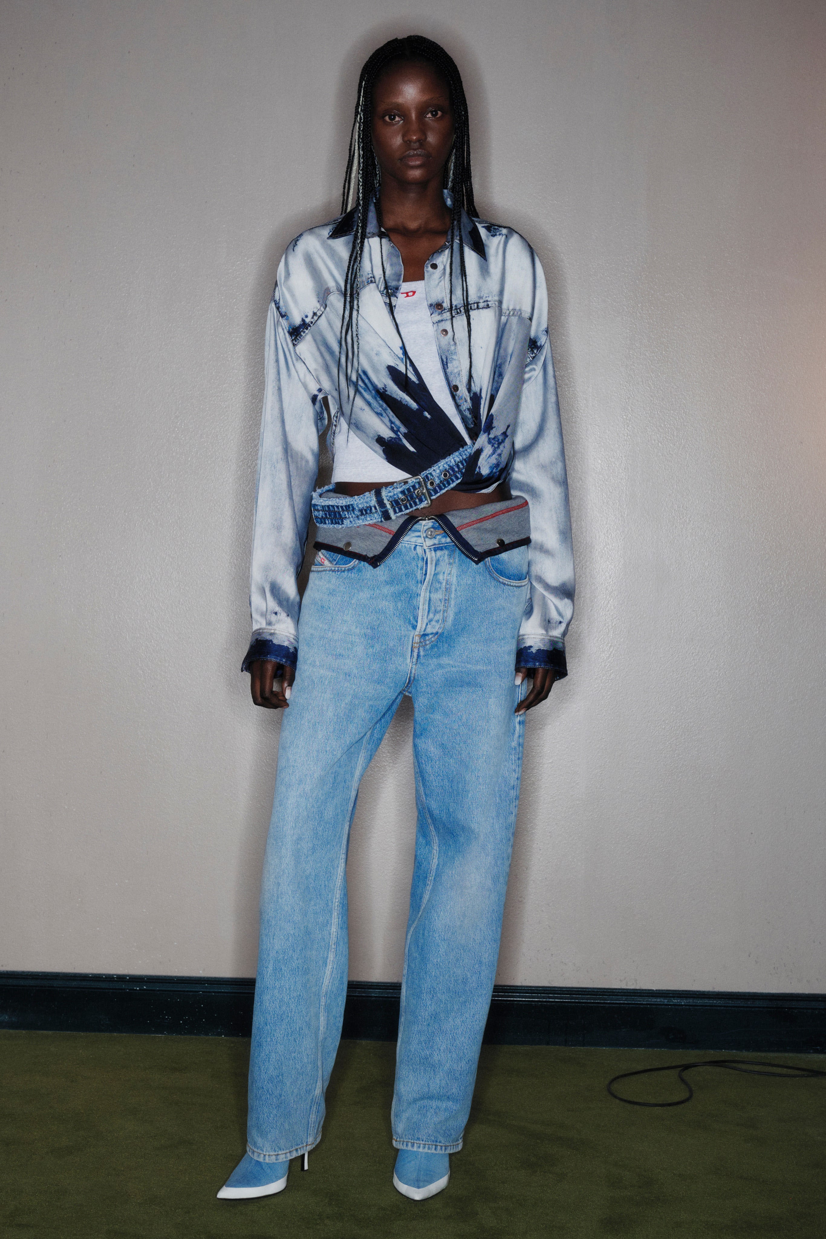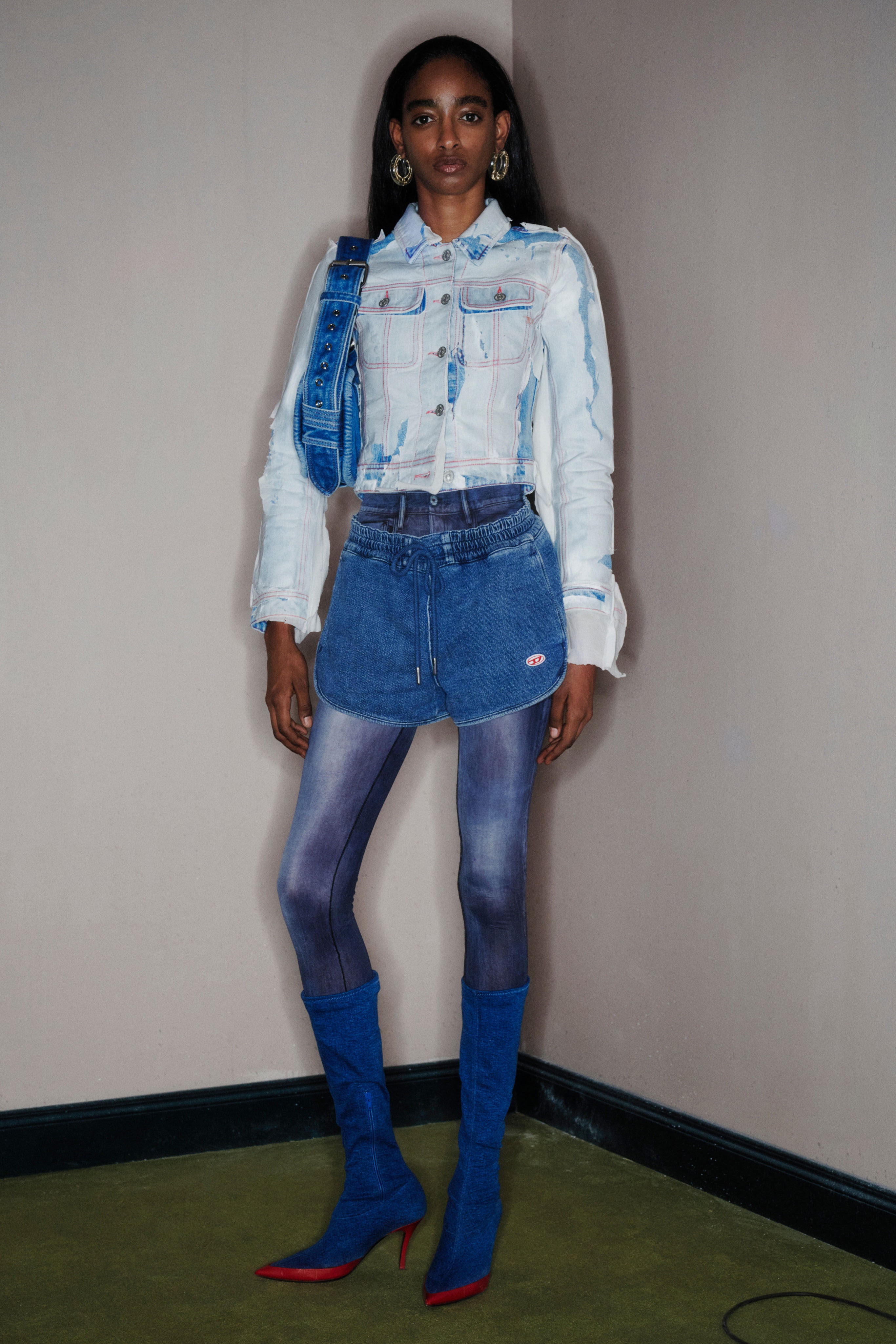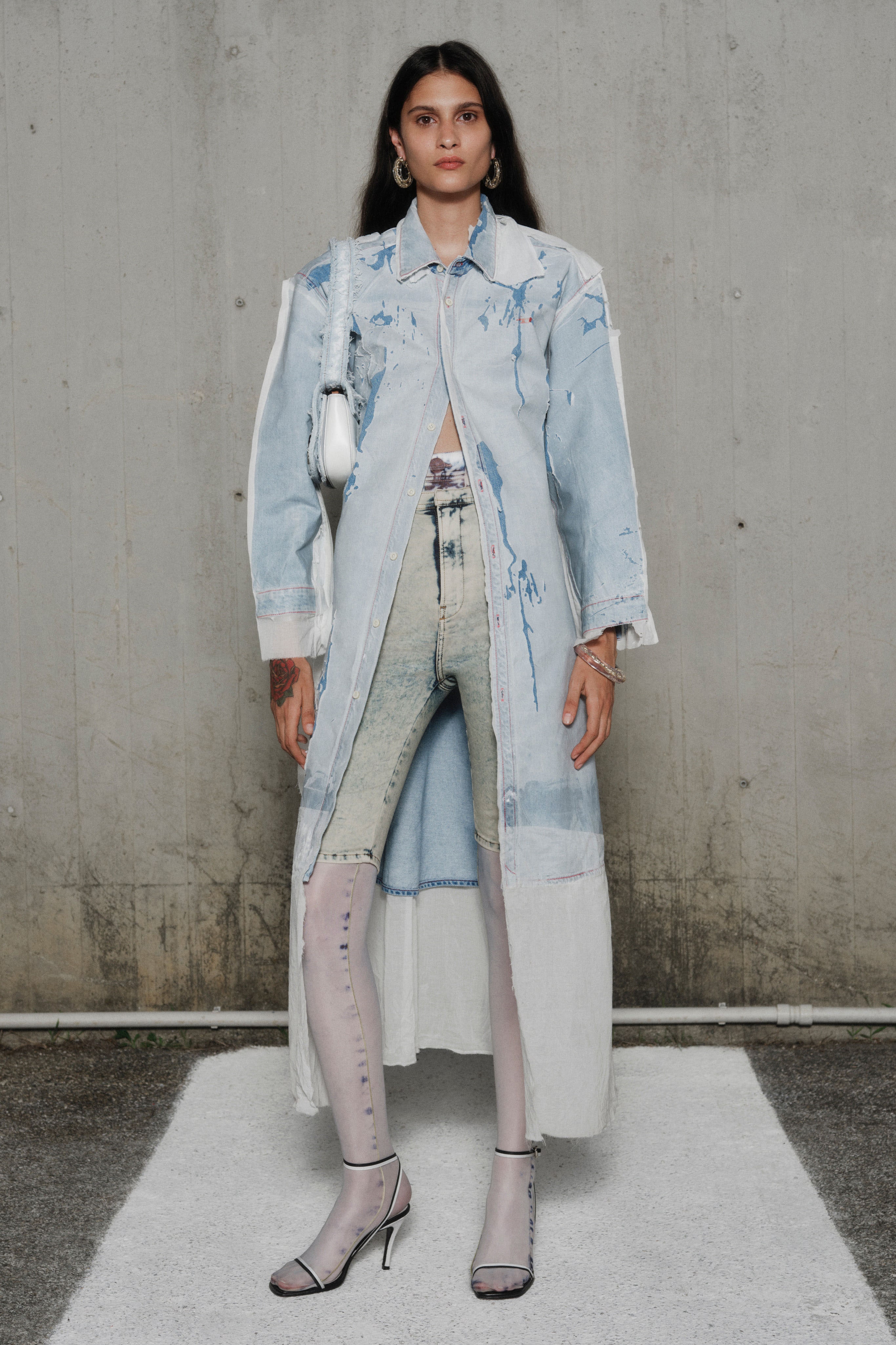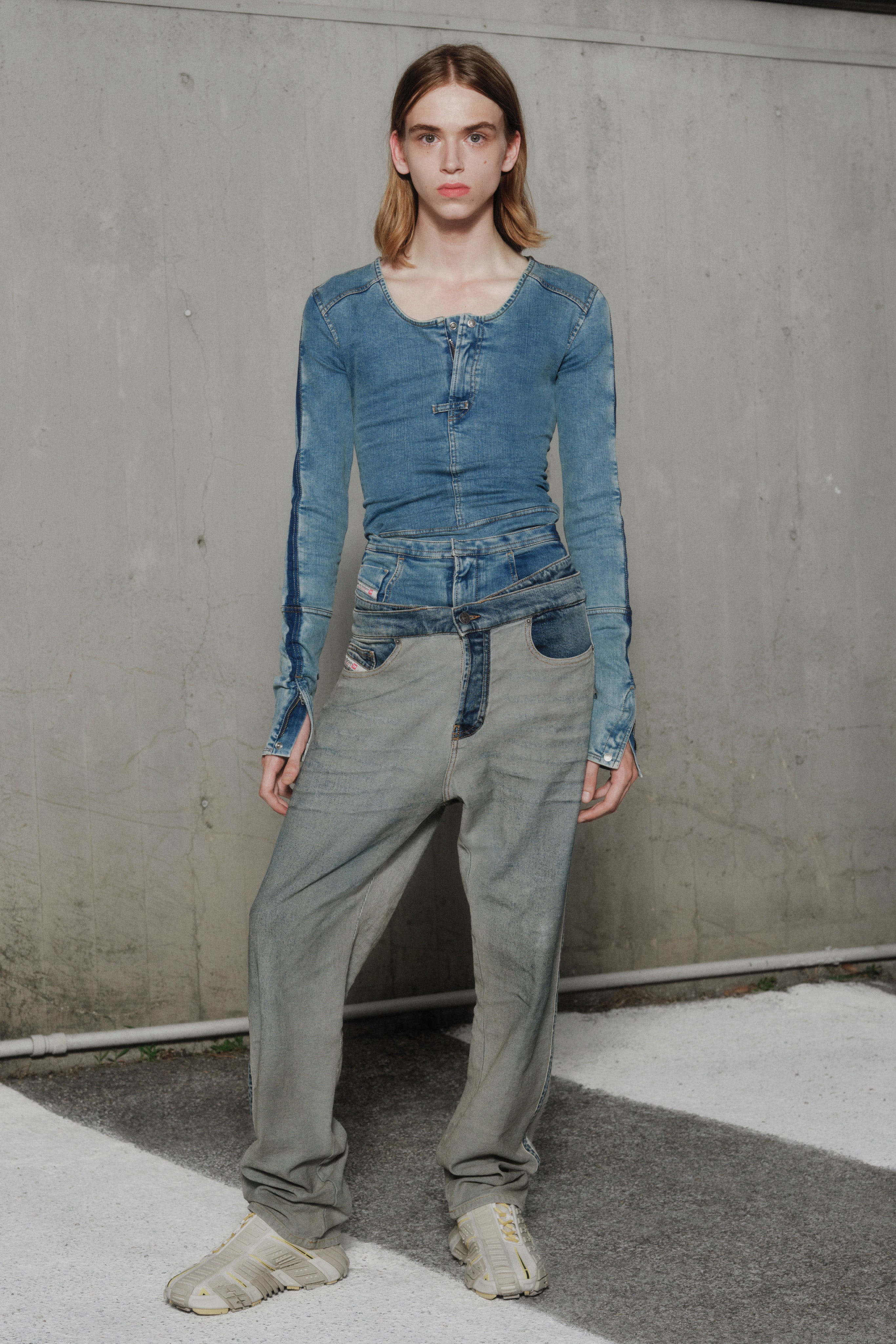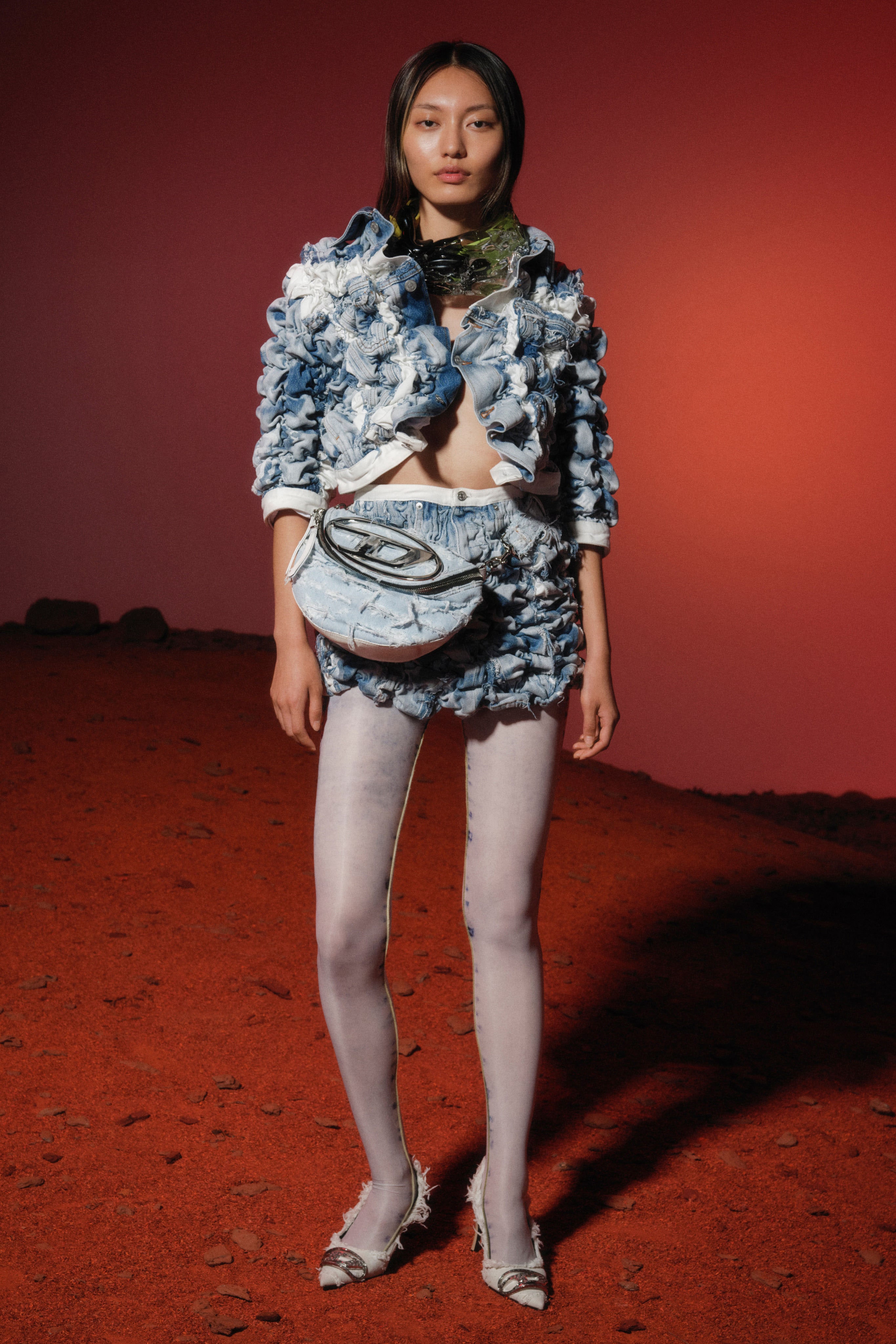 Мартенс также представил квинтэссенцию джинсовой моды 2000-х, в которой бренд занимал определенно значимое положение. Так, ряд моделей составили юбки и топы из деконструированных курток и комбинезонов с накладными карманами, брючные костюмы, соблазнительные топы и оверсайз-рубашки из денима. Линию верхней одежды представили силуэтные пальто и плащи из выбеленного денима, сформированного в технике "тромплей", объемные парки и фактурные шубы из производственных лоскутов ткани. Одни из главных материалов 2000-х, органзу и атлас, дизайнер интегрировал в экстравагантные модели спортивных брюк с завышенной талией и теннисных рубашек. Почти вся коллекция состоит из органически окрашенных тканей и переработанного денима, включая мужские и женские вещи. Для эффектных платьев с подчеркнутой линией талии джинсовую ткань сжали в объемное 3D-полотно, а окрашенные в ягодные тона велосипедные шорты дополнили лоскутные жилеты в орнаментальном тиснении. Одним из ключевых штрихов в модернизированном послании Diesel стали колготки, имитирующие джинсовую фактуру со швами и потертостями.