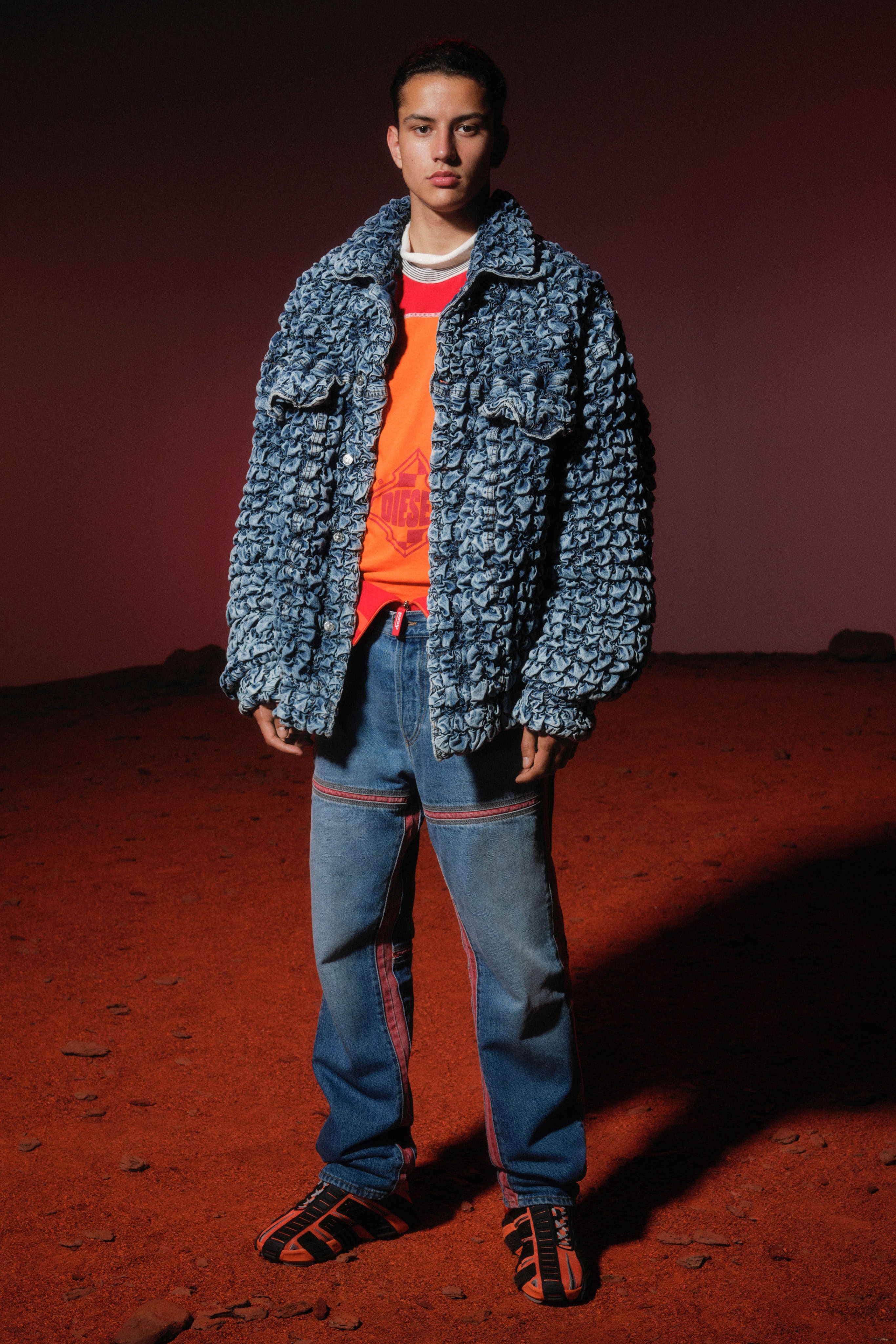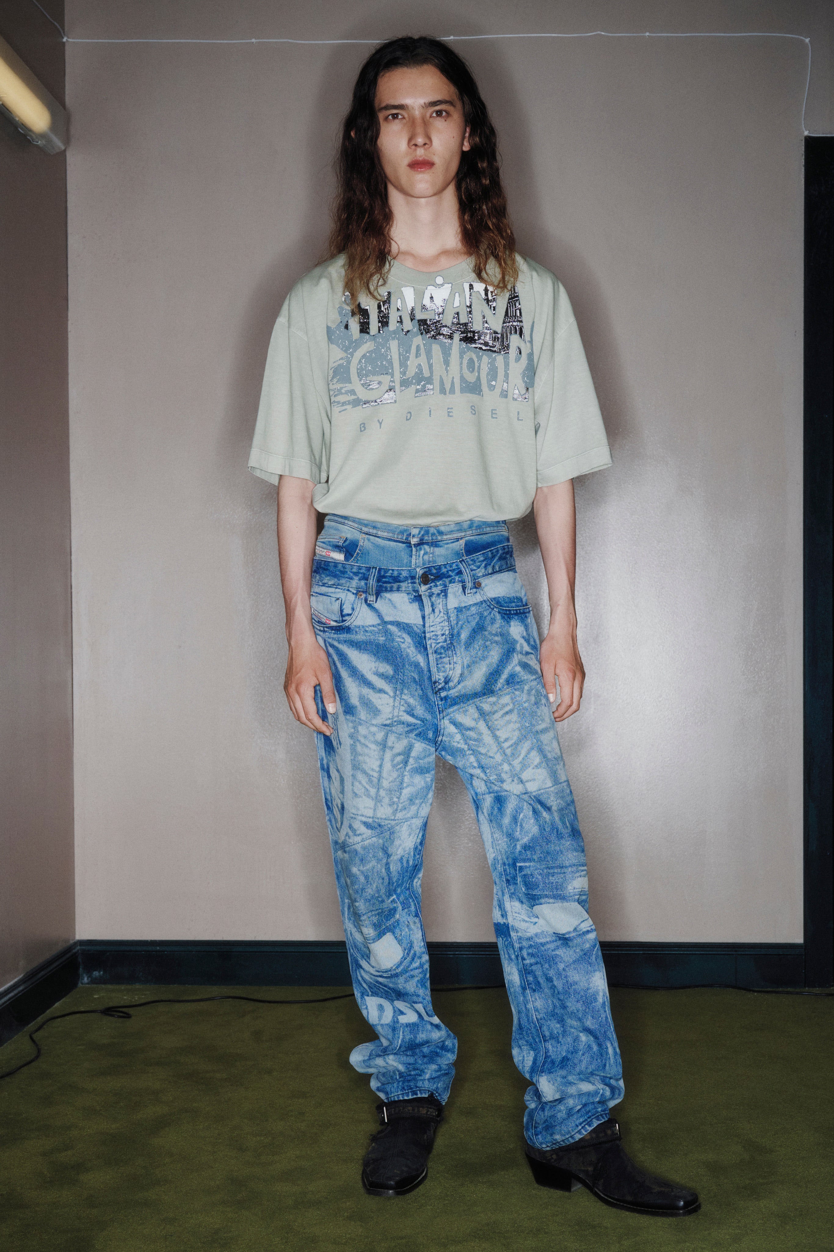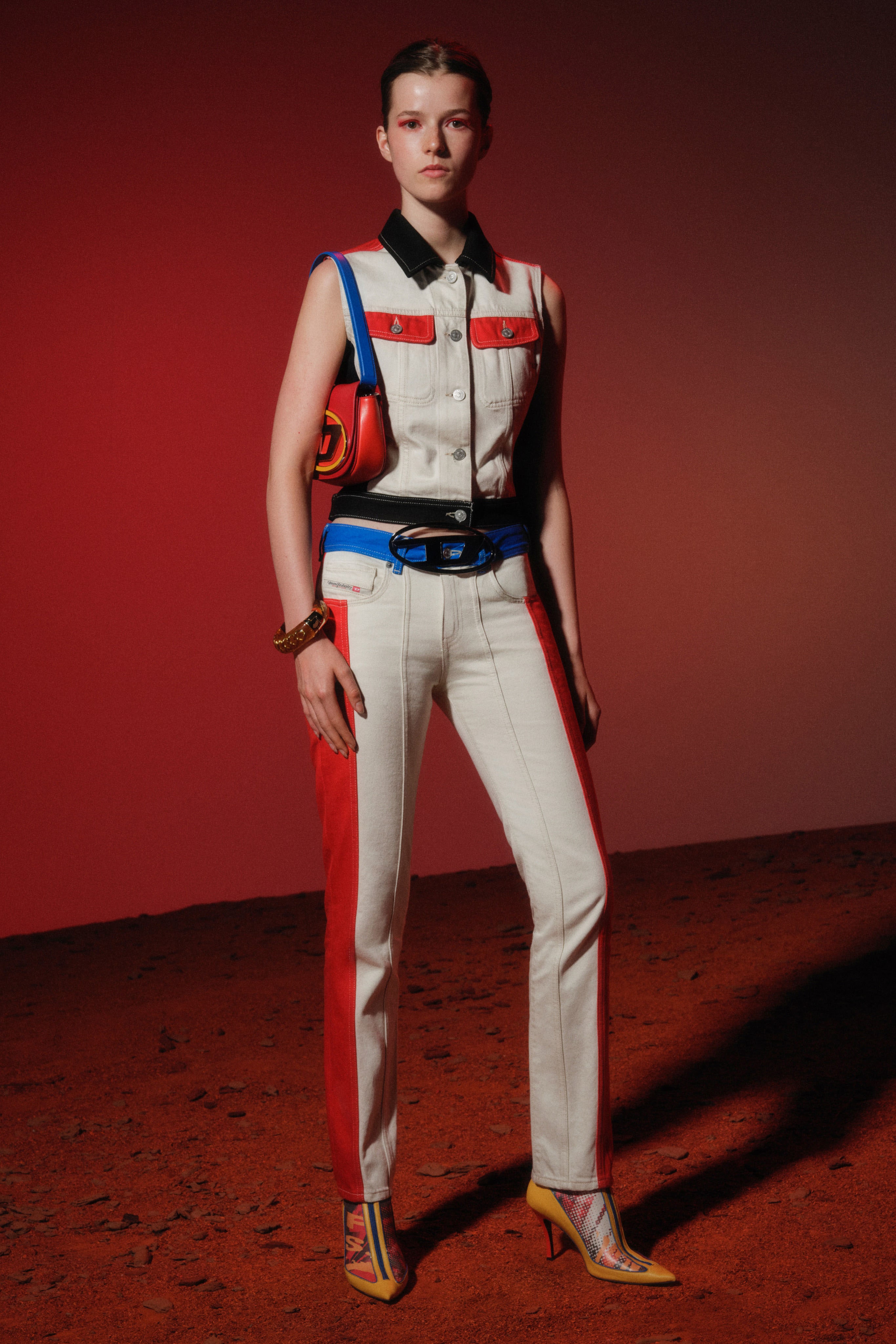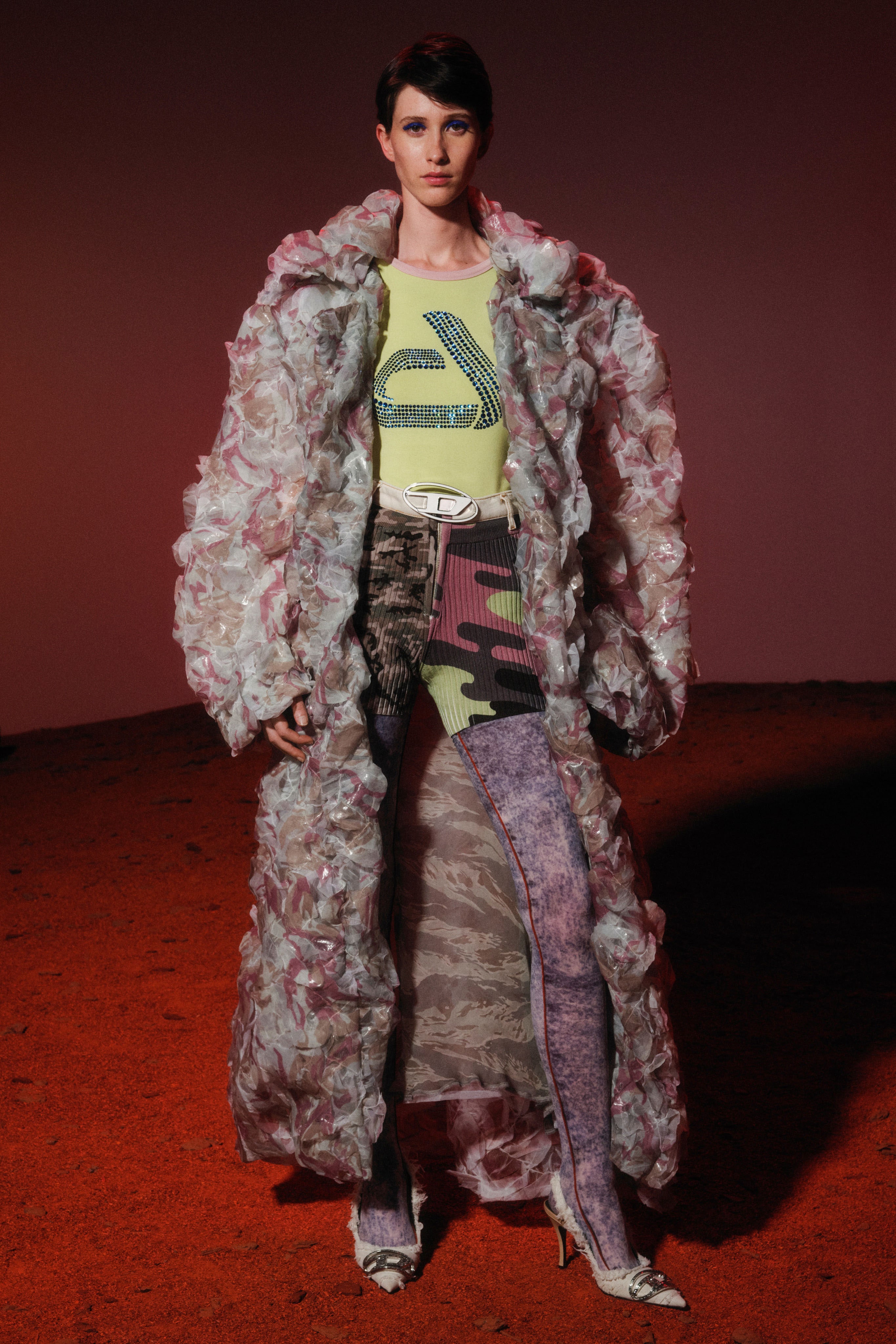 Мартенс также представил квинтэссенцию джинсовой моды 2000-х, в которой бренд занимал определенно значимое положение. Так, ряд моделей составили юбки и топы из деконструированных курток и комбинезонов с накладными карманами, брючные костюмы, соблазнительные топы и оверсайз-рубашки из денима. Линию верхней одежды представили силуэтные пальто и плащи из выбеленного денима, сформированного в технике "тромплей", объемные парки и фактурные шубы из производственных лоскутов ткани. Одни из главных материалов 2000-х, органзу и атлас, дизайнер интегрировал в экстравагантные модели спортивных брюк с завышенной талией и теннисных рубашек. Почти вся коллекция состоит из органически окрашенных тканей и переработанного денима, включая мужские и женские вещи. Для эффектных платьев с подчеркнутой линией талии джинсовую ткань сжали в объемное 3D-полотно, а окрашенные в ягодные тона велосипедные шорты дополнили лоскутные жилеты в орнаментальном тиснении. Одним из ключевых штрихов в модернизированном послании Diesel стали колготки, имитирующие джинсовую фактуру со швами и потертостями.
