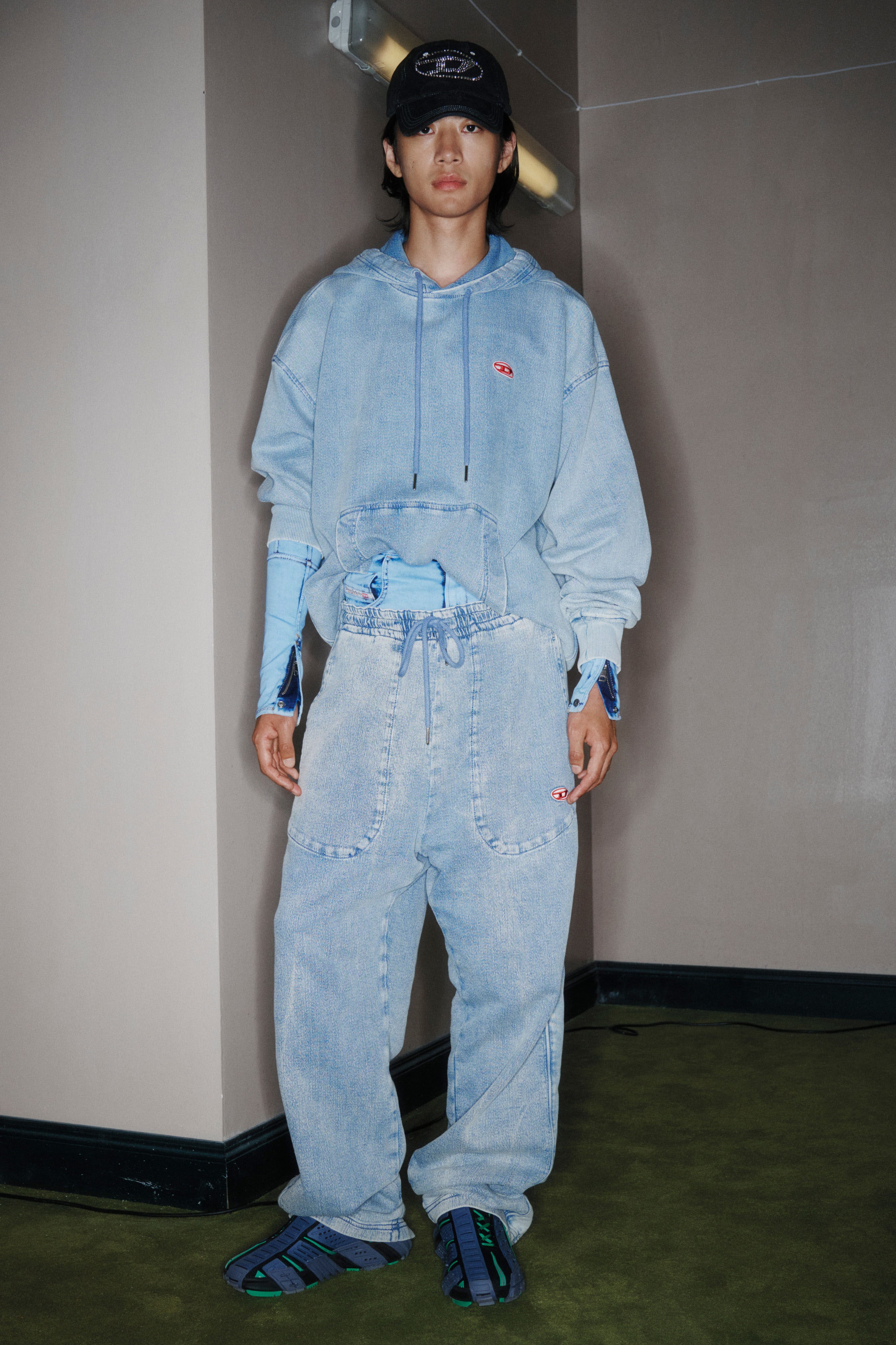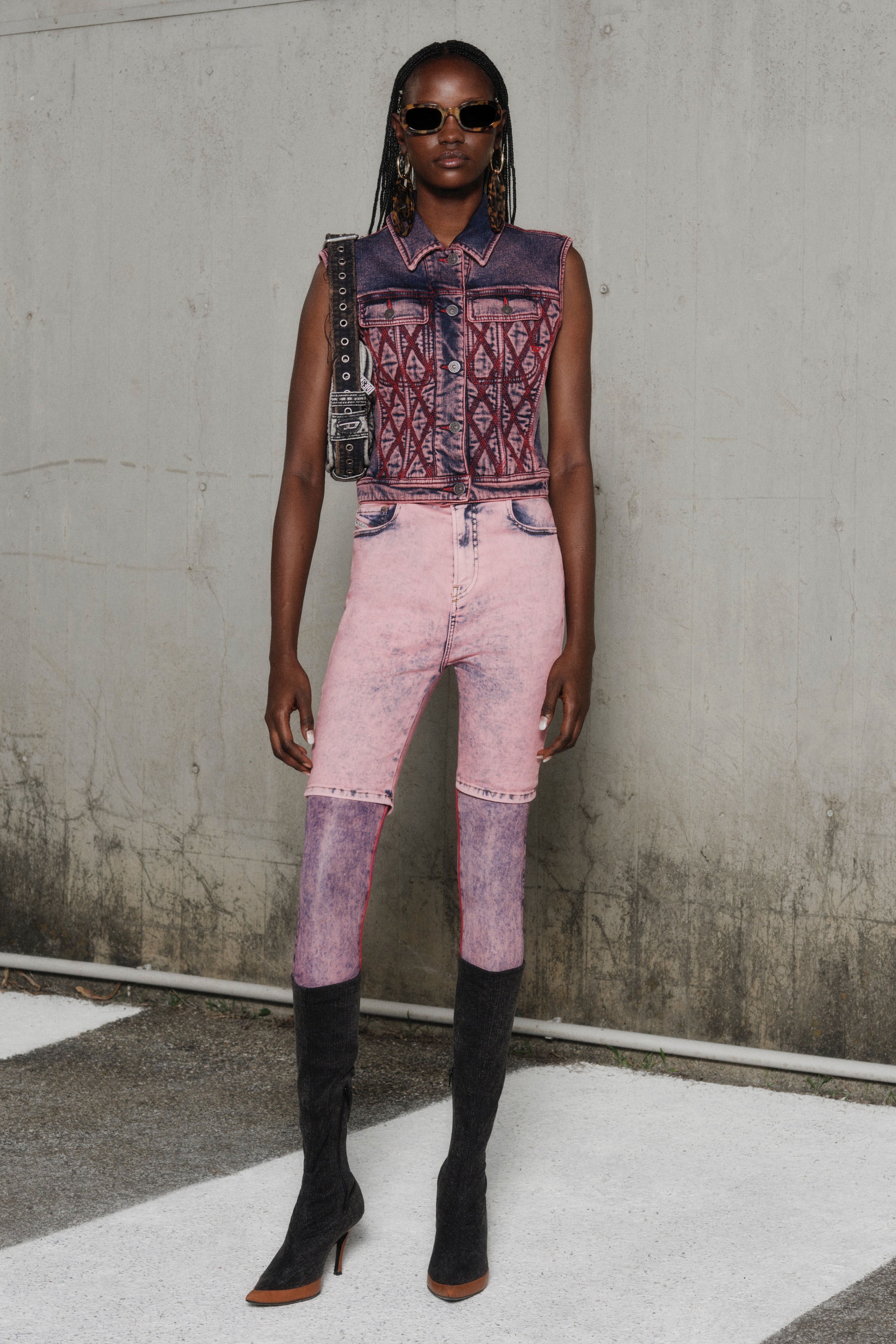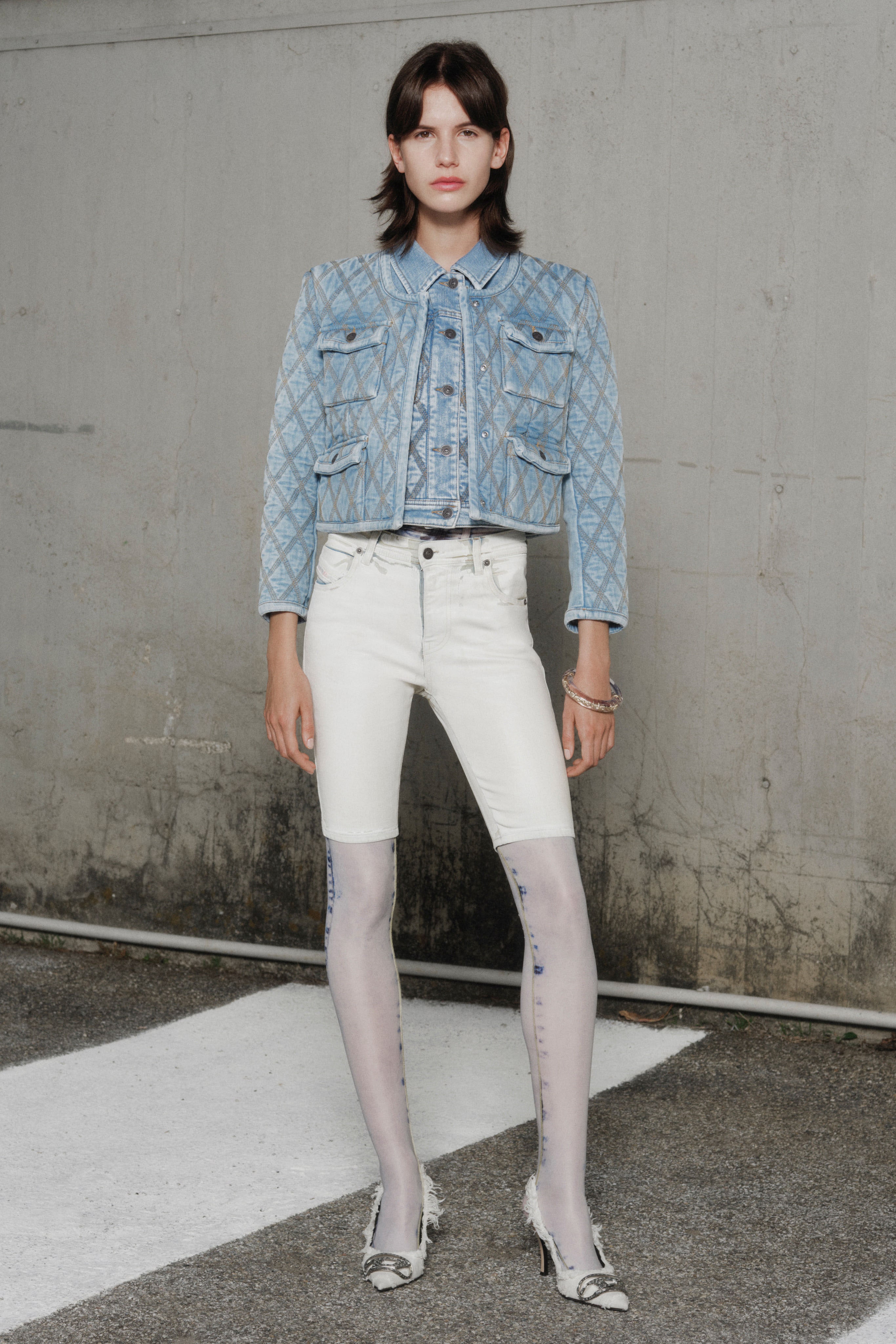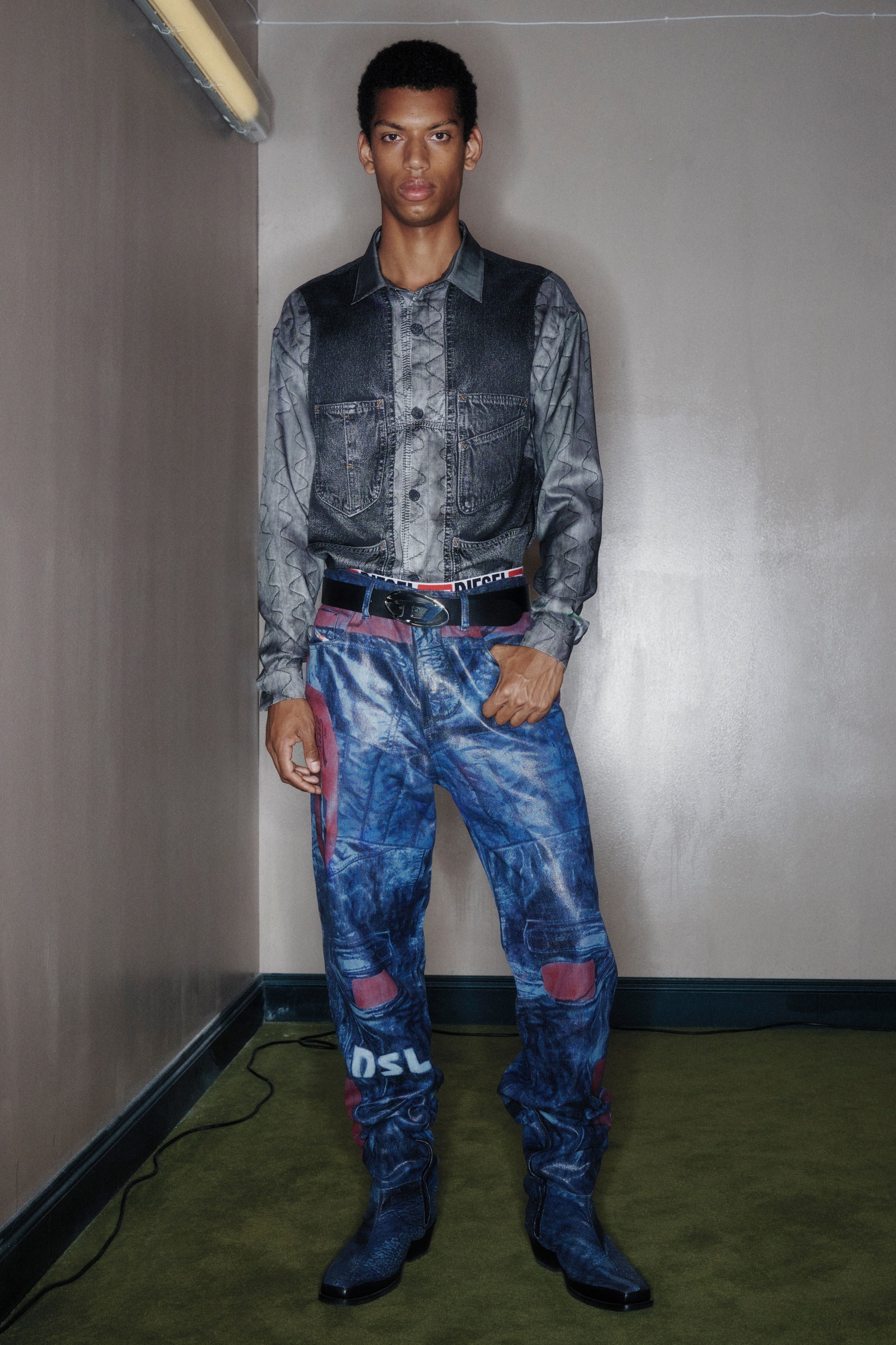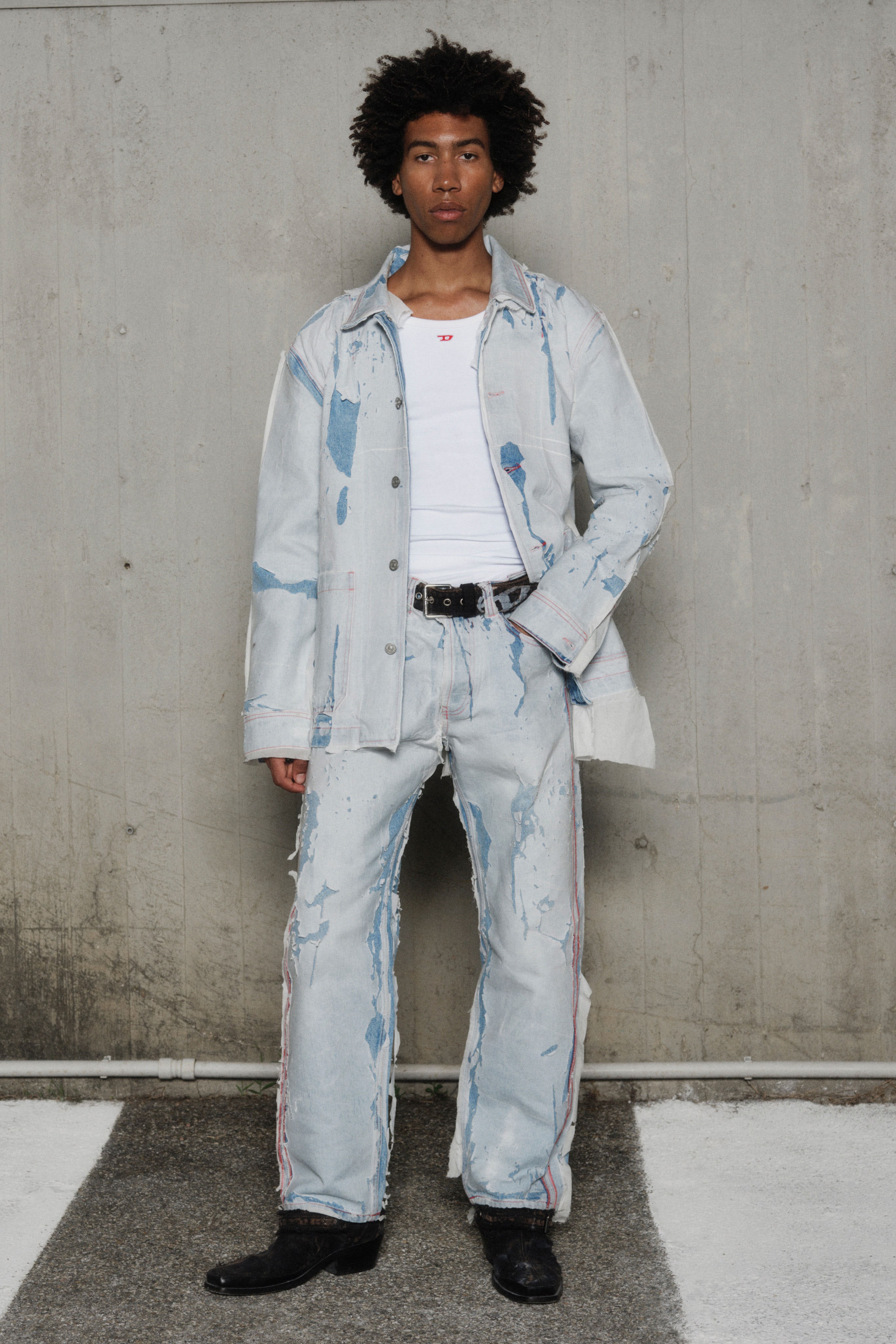 Мартенс также представил квинтэссенцию джинсовой моды 2000-х, в которой бренд занимал определенно значимое положение. Так, ряд моделей составили юбки и топы из деконструированных курток и комбинезонов с накладными карманами, брючные костюмы, соблазнительные топы и оверсайз-рубашки из денима. Линию верхней одежды представили силуэтные пальто и плащи из выбеленного денима, сформированного в технике "тромплей", объемные парки и фактурные шубы из производственных лоскутов ткани. Одни из главных материалов 2000-х, органзу и атлас, дизайнер интегрировал в экстравагантные модели спортивных брюк с завышенной талией и теннисных рубашек. Почти вся коллекция состоит из органически окрашенных тканей и переработанного денима, включая мужские и женские вещи. Для эффектных платьев с подчеркнутой линией талии джинсовую ткань сжали в объемное 3D-полотно, а окрашенные в ягодные тона велосипедные шорты дополнили лоскутные жилеты в орнаментальном тиснении. Одним из ключевых штрихов в модернизированном послании Diesel стали колготки, имитирующие джинсовую фактуру со швами и потертостями.
