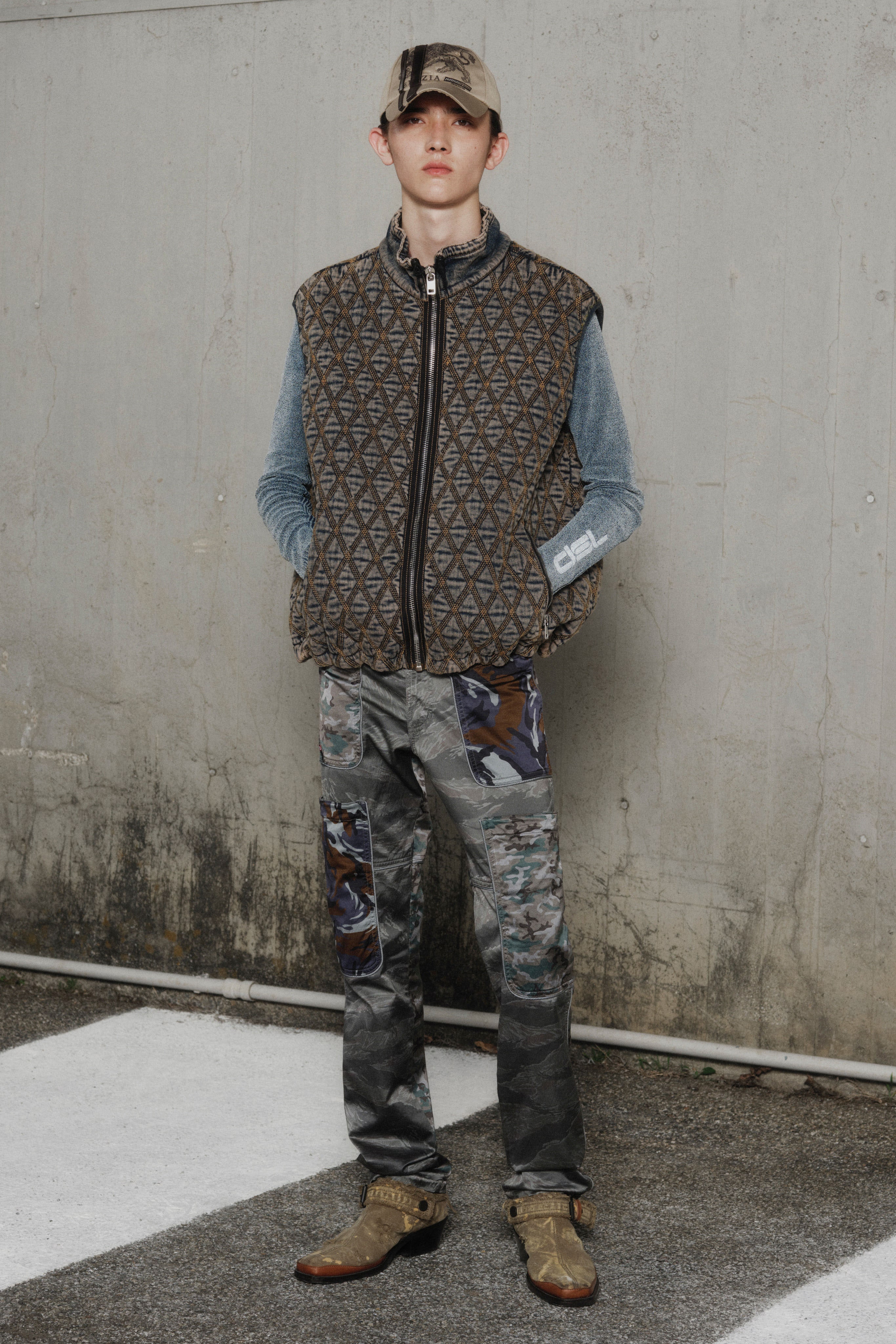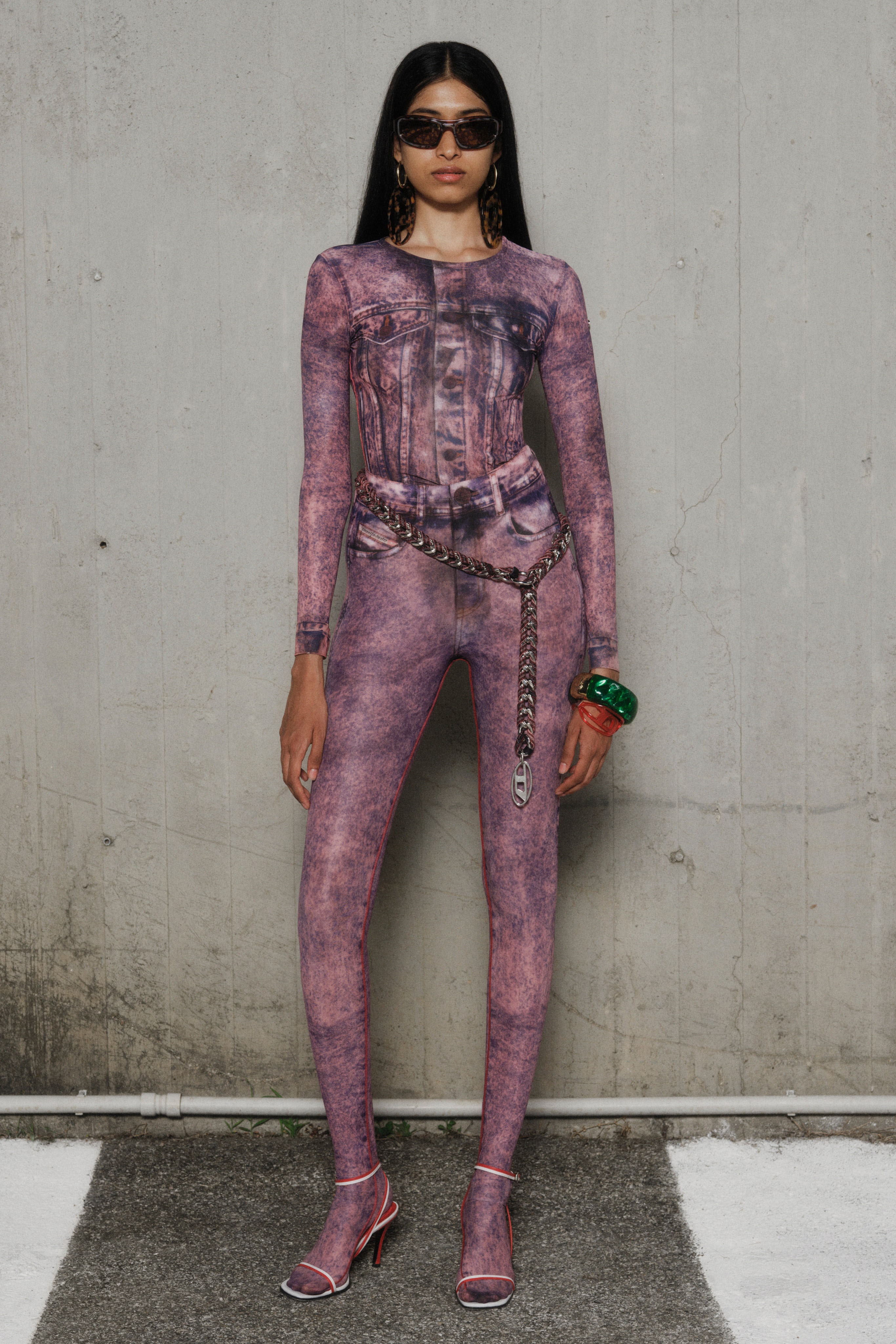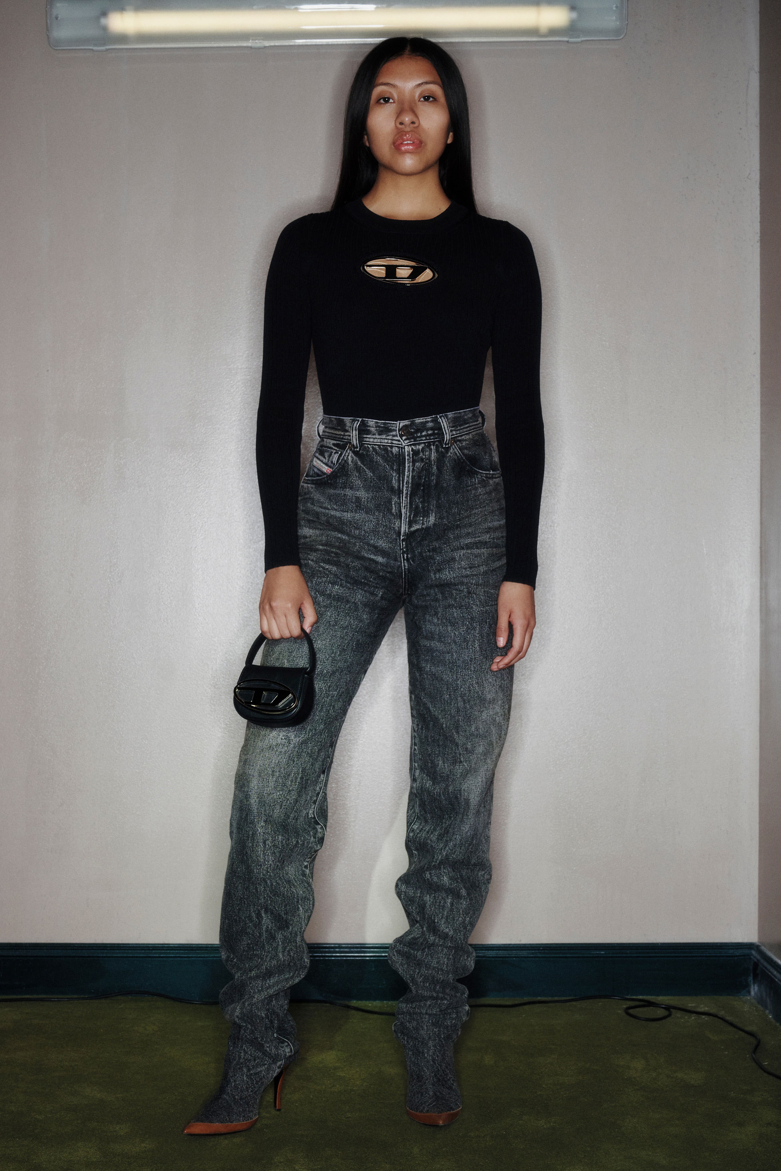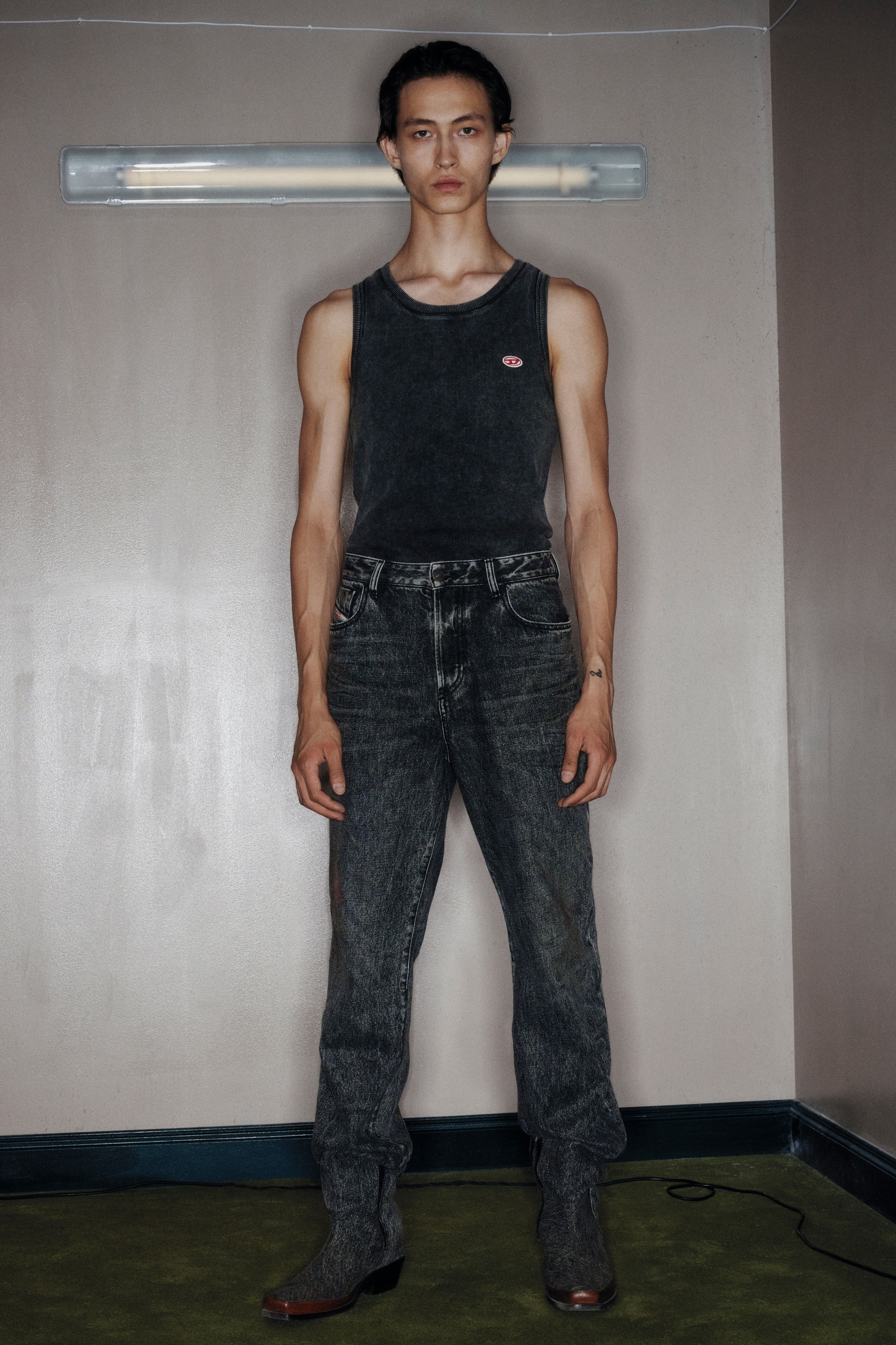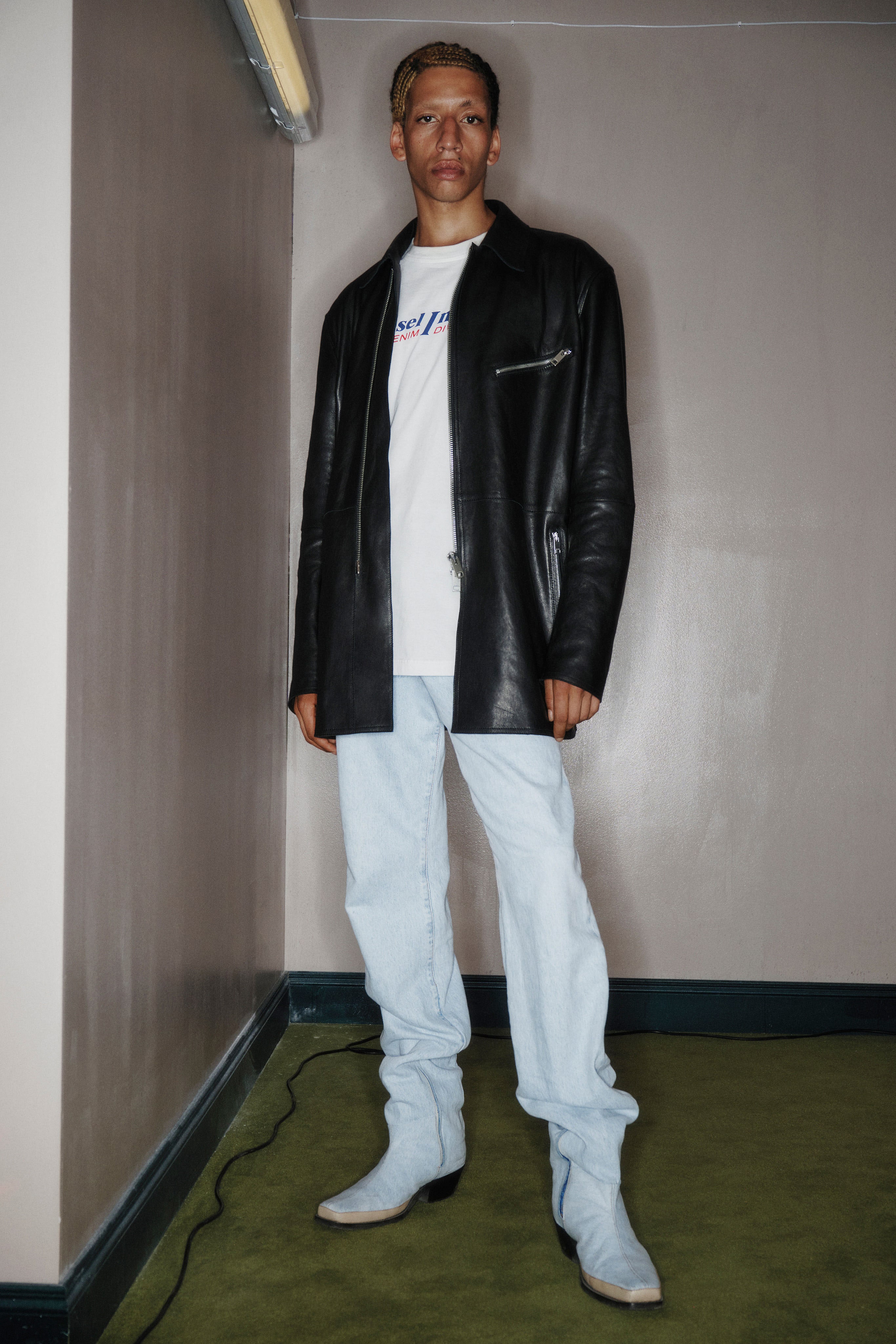 Мартенс также представил квинтэссенцию джинсовой моды 2000-х, в которой бренд занимал определенно значимое положение. Так, ряд моделей составили юбки и топы из деконструированных курток и комбинезонов с накладными карманами, брючные костюмы, соблазнительные топы и оверсайз-рубашки из денима. Линию верхней одежды представили силуэтные пальто и плащи из выбеленного денима, сформированного в технике "тромплей", объемные парки и фактурные шубы из производственных лоскутов ткани. Одни из главных материалов 2000-х, органзу и атлас, дизайнер интегрировал в экстравагантные модели спортивных брюк с завышенной талией и теннисных рубашек. Почти вся коллекция состоит из органически окрашенных тканей и переработанного денима, включая мужские и женские вещи. Для эффектных платьев с подчеркнутой линией талии джинсовую ткань сжали в объемное 3D-полотно, а окрашенные в ягодные тона велосипедные шорты дополнили лоскутные жилеты в орнаментальном тиснении. Одним из ключевых штрихов в модернизированном послании Diesel стали колготки, имитирующие джинсовую фактуру со швами и потертостями.