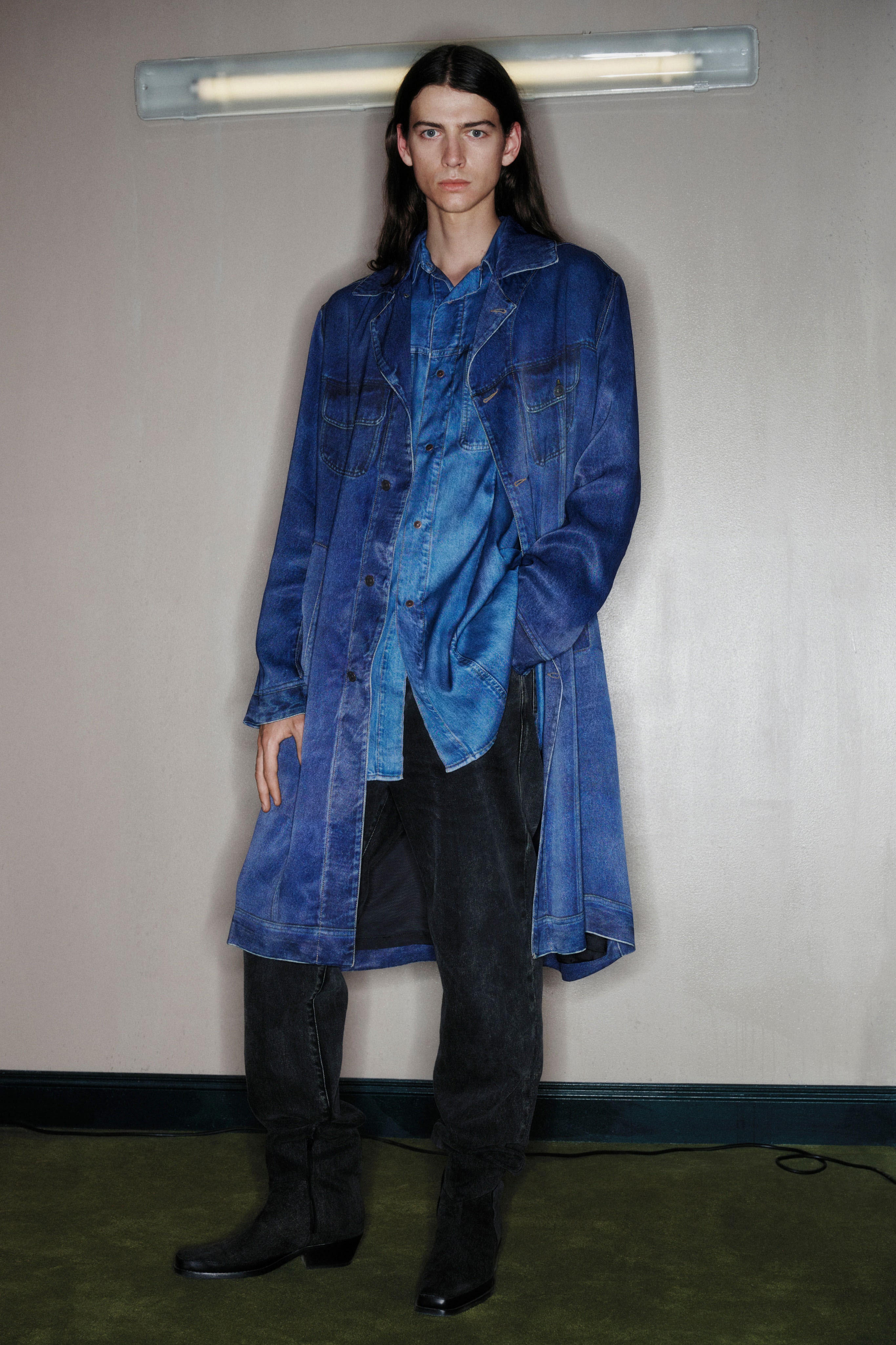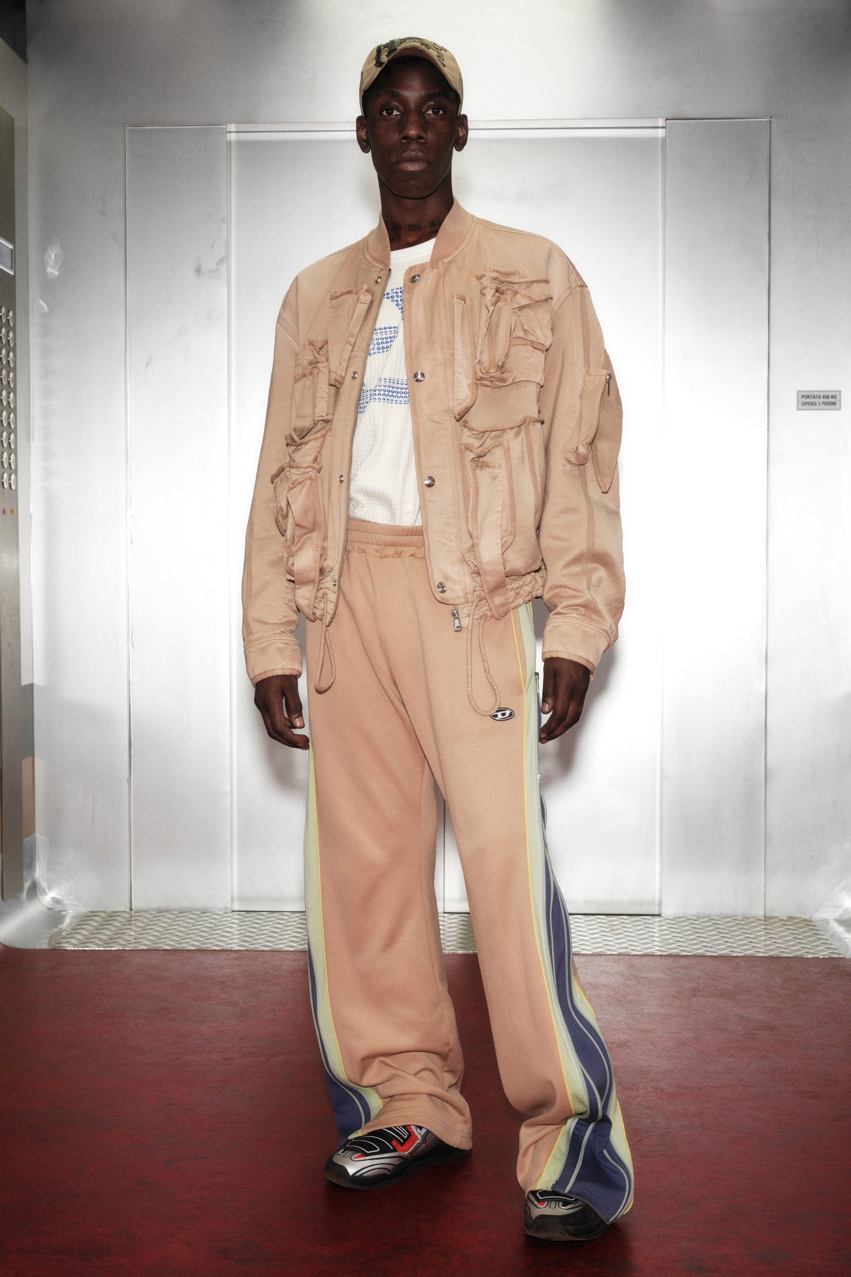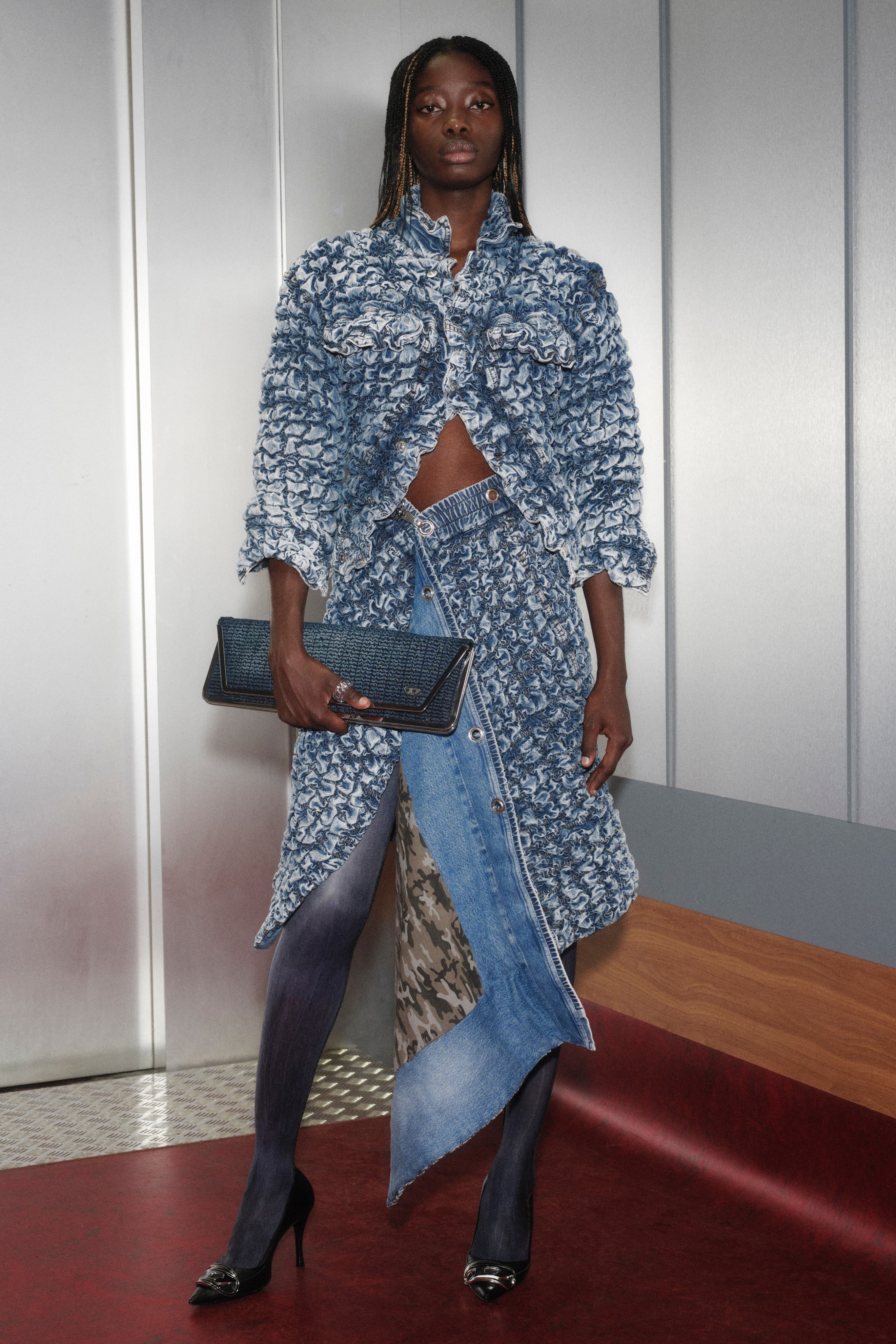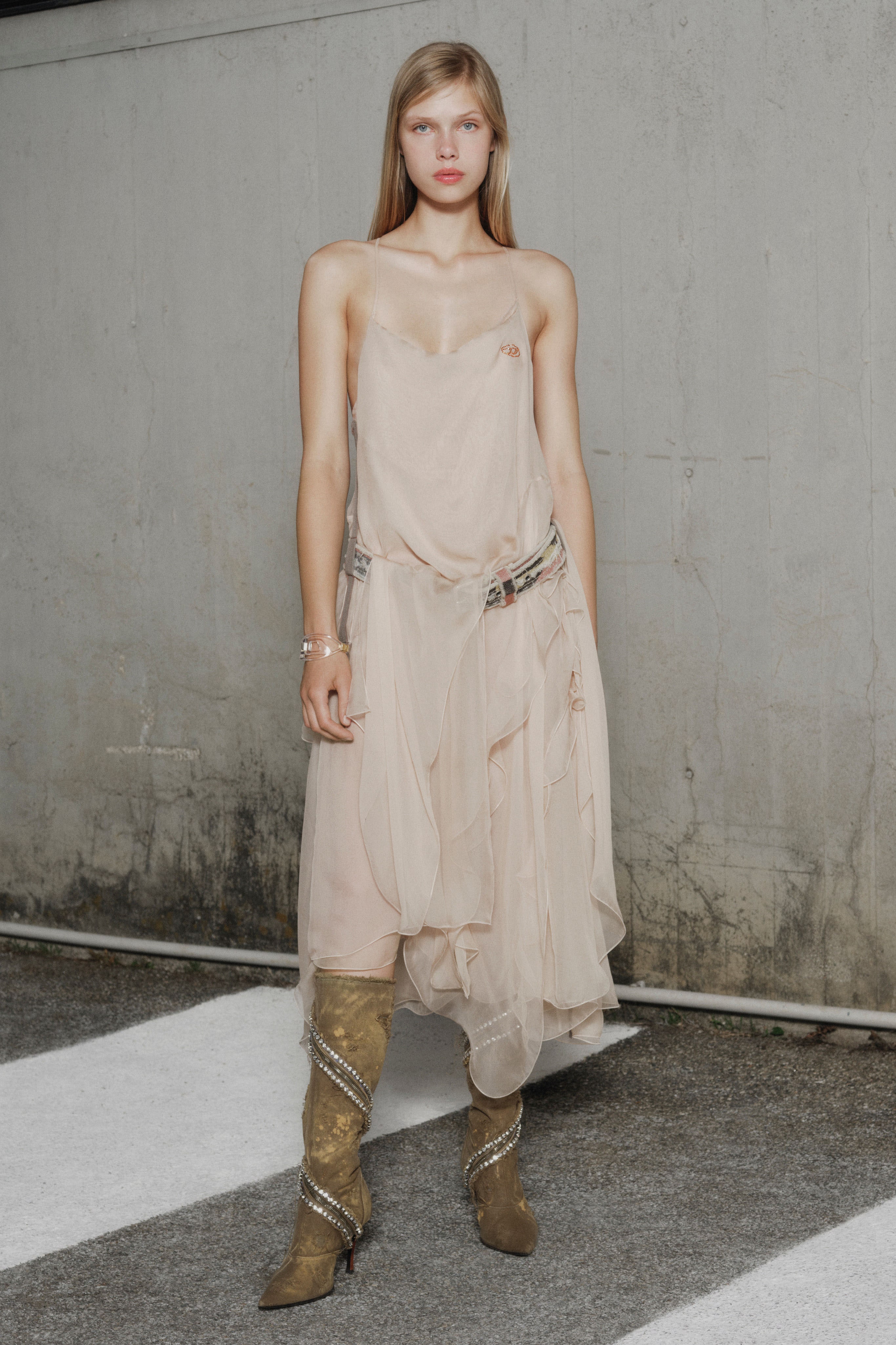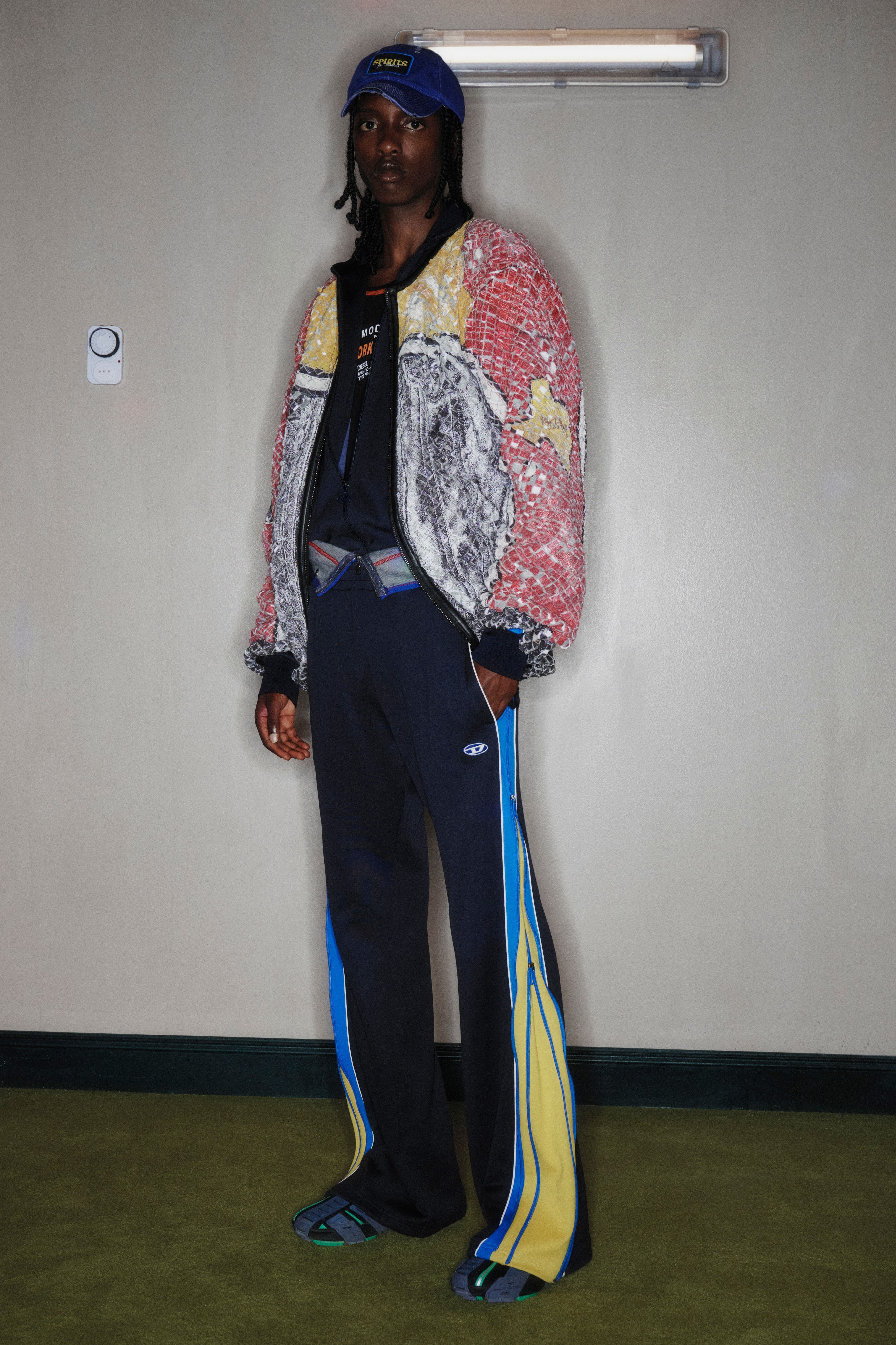 Мартенс также представил квинтэссенцию джинсовой моды 2000-х, в которой бренд занимал определенно значимое положение. Так, ряд моделей составили юбки и топы из деконструированных курток и комбинезонов с накладными карманами, брючные костюмы, соблазнительные топы и оверсайз-рубашки из денима. Линию верхней одежды представили силуэтные пальто и плащи из выбеленного денима, сформированного в технике "тромплей", объемные парки и фактурные шубы из производственных лоскутов ткани. Одни из главных материалов 2000-х, органзу и атлас, дизайнер интегрировал в экстравагантные модели спортивных брюк с завышенной талией и теннисных рубашек. Почти вся коллекция состоит из органически окрашенных тканей и переработанного денима, включая мужские и женские вещи. Для эффектных платьев с подчеркнутой линией талии джинсовую ткань сжали в объемное 3D-полотно, а окрашенные в ягодные тона велосипедные шорты дополнили лоскутные жилеты в орнаментальном тиснении. Одним из ключевых штрихов в модернизированном послании Diesel стали колготки, имитирующие джинсовую фактуру со швами и потертостями.