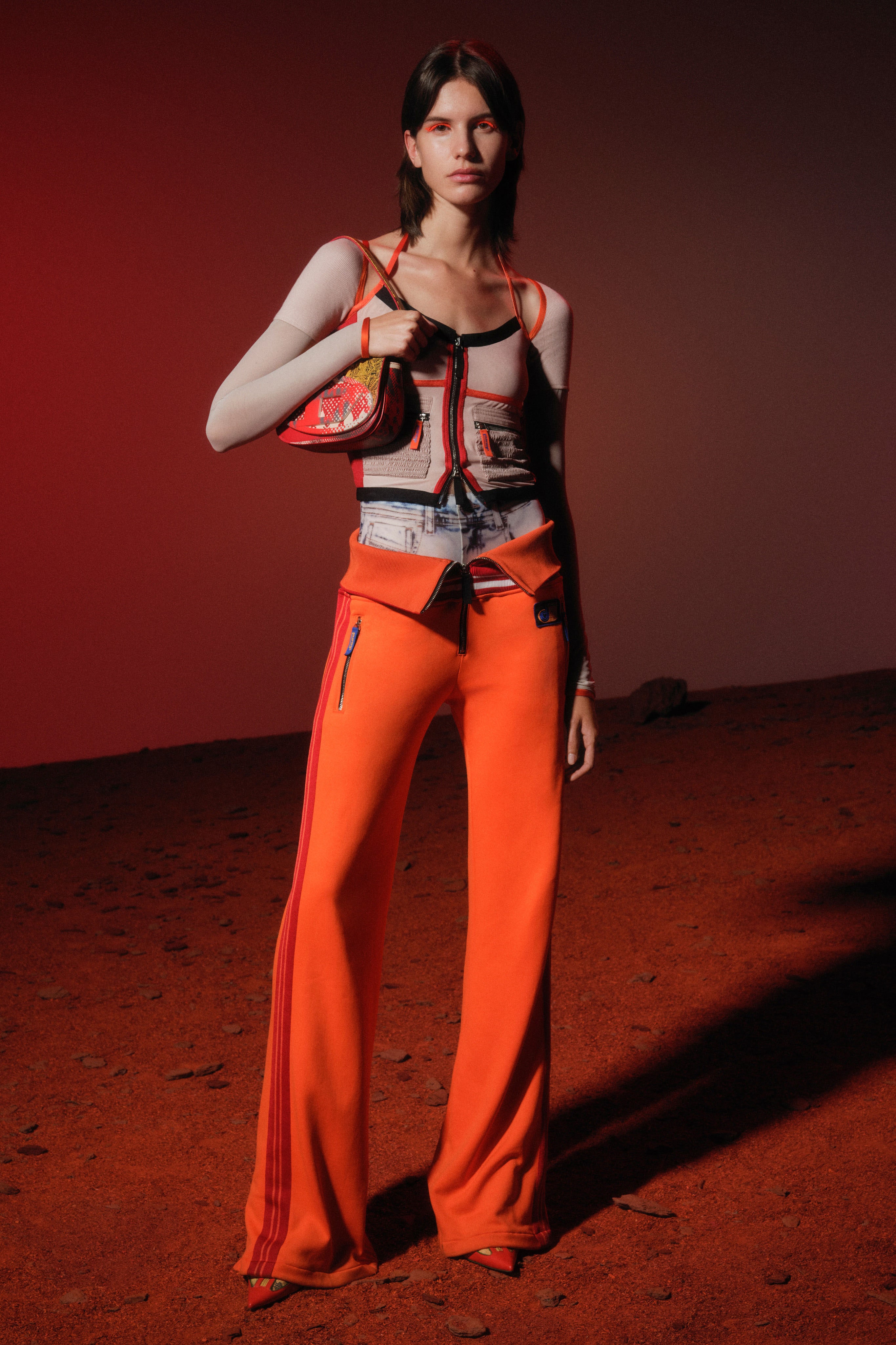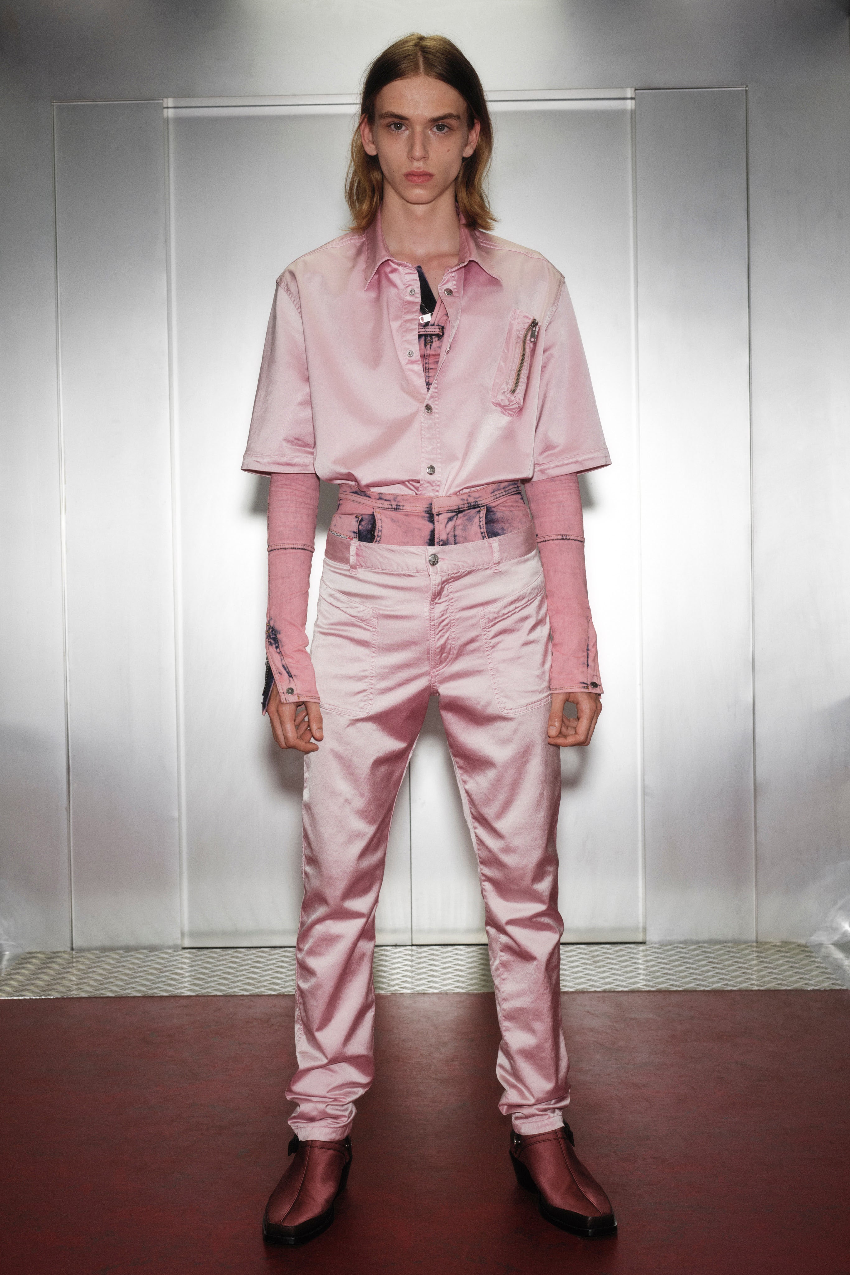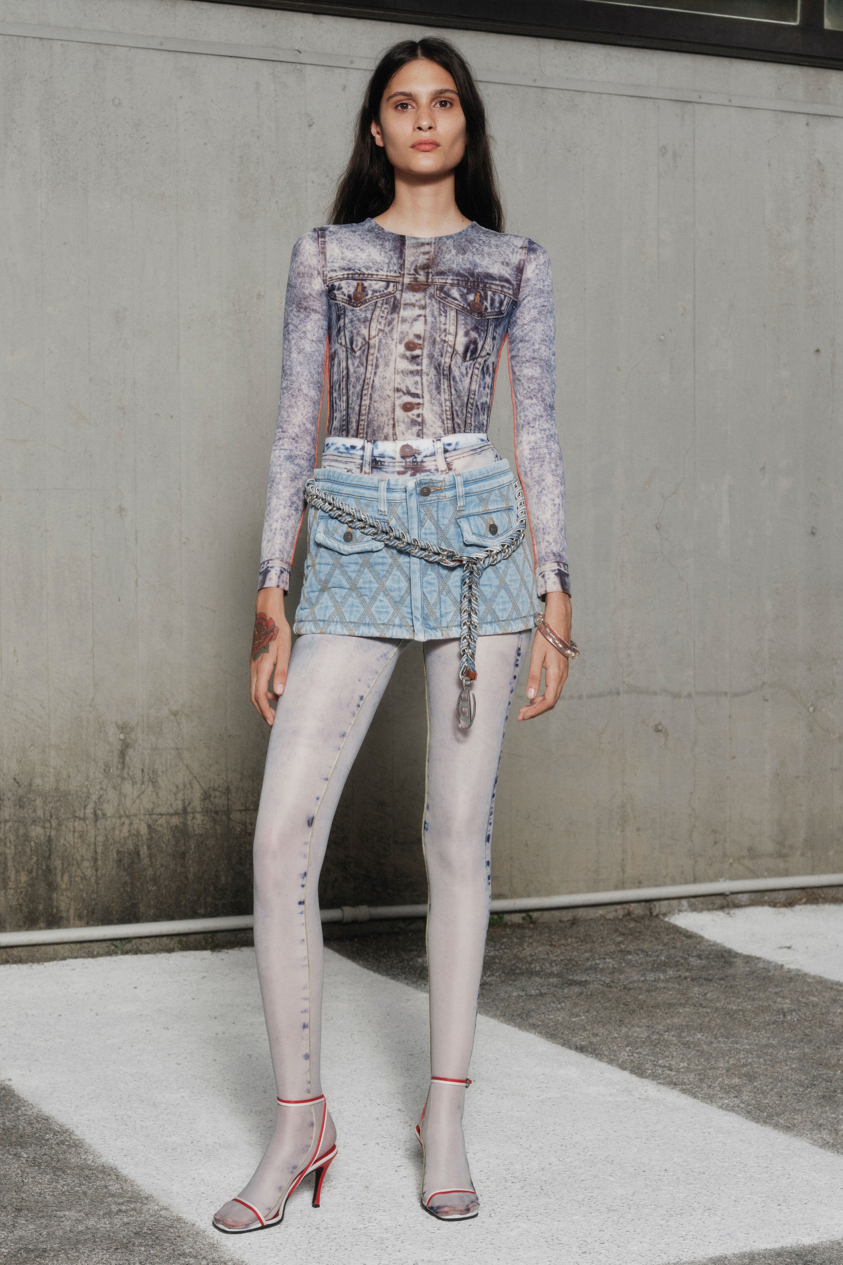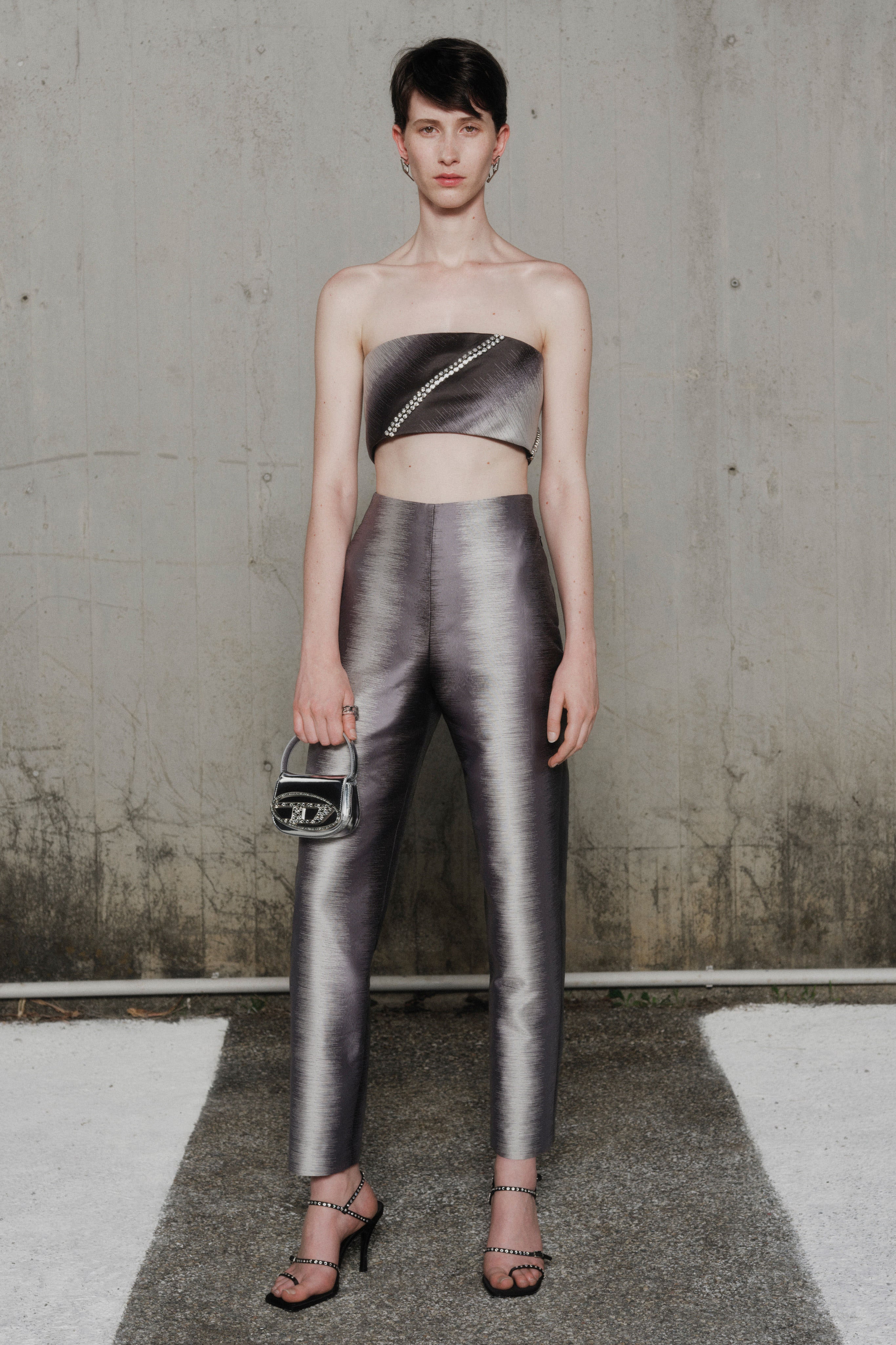 Мартенс также представил квинтэссенцию джинсовой моды 2000-х, в которой бренд занимал определенно значимое положение. Так, ряд моделей составили юбки и топы из деконструированных курток и комбинезонов с накладными карманами, брючные костюмы, соблазнительные топы и оверсайз-рубашки из денима. Линию верхней одежды представили силуэтные пальто и плащи из выбеленного денима, сформированного в технике "тромплей", объемные парки и фактурные шубы из производственных лоскутов ткани. Одни из главных материалов 2000-х, органзу и атлас, дизайнер интегрировал в экстравагантные модели спортивных брюк с завышенной талией и теннисных рубашек. Почти вся коллекция состоит из органически окрашенных тканей и переработанного денима, включая мужские и женские вещи. Для эффектных платьев с подчеркнутой линией талии джинсовую ткань сжали в объемное 3D-полотно, а окрашенные в ягодные тона велосипедные шорты дополнили лоскутные жилеты в орнаментальном тиснении. Одним из ключевых штрихов в модернизированном послании Diesel стали колготки, имитирующие джинсовую фактуру со швами и потертостями.