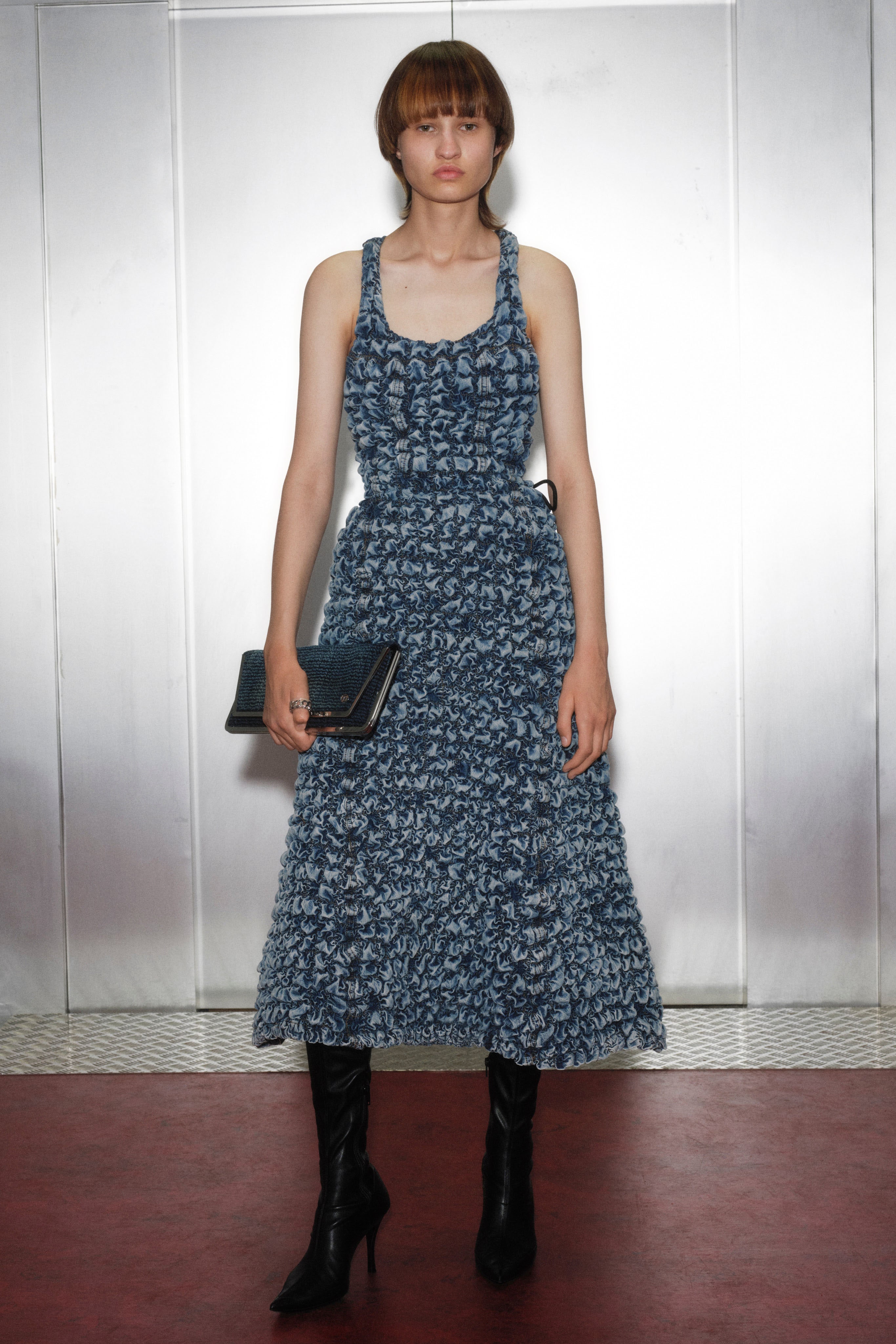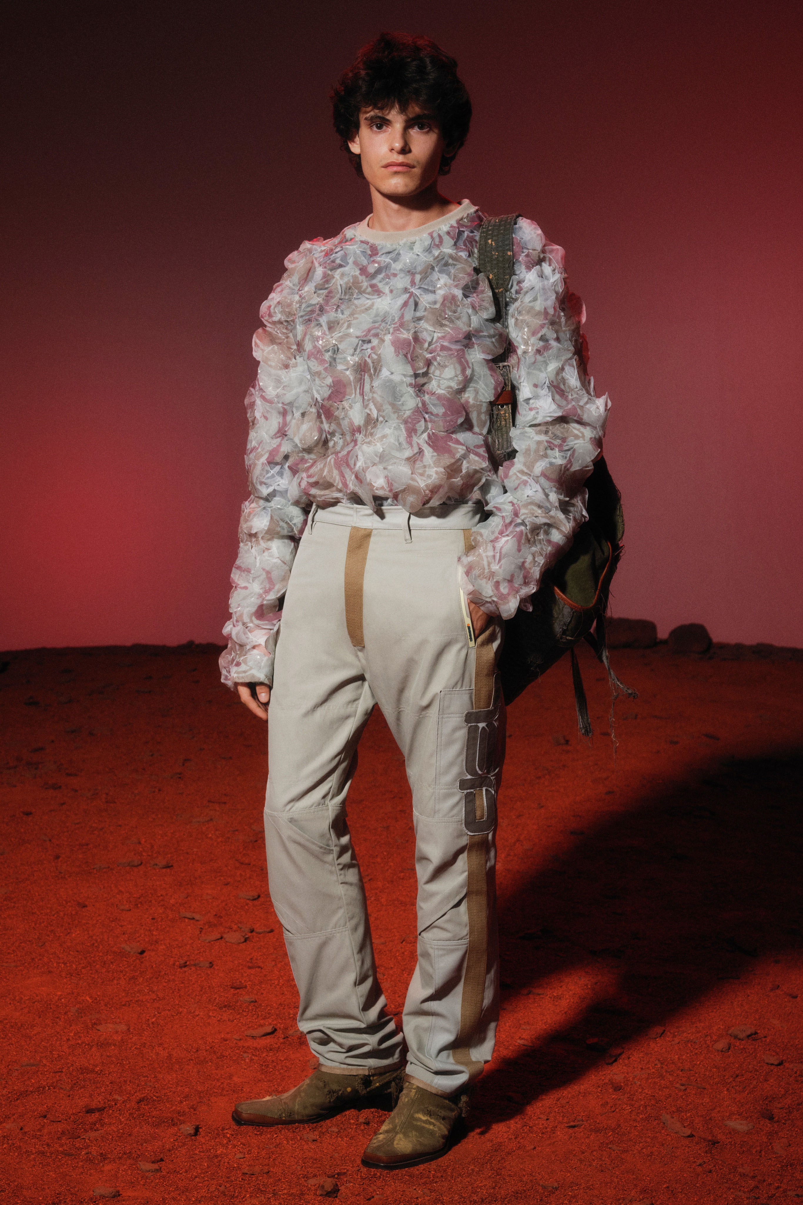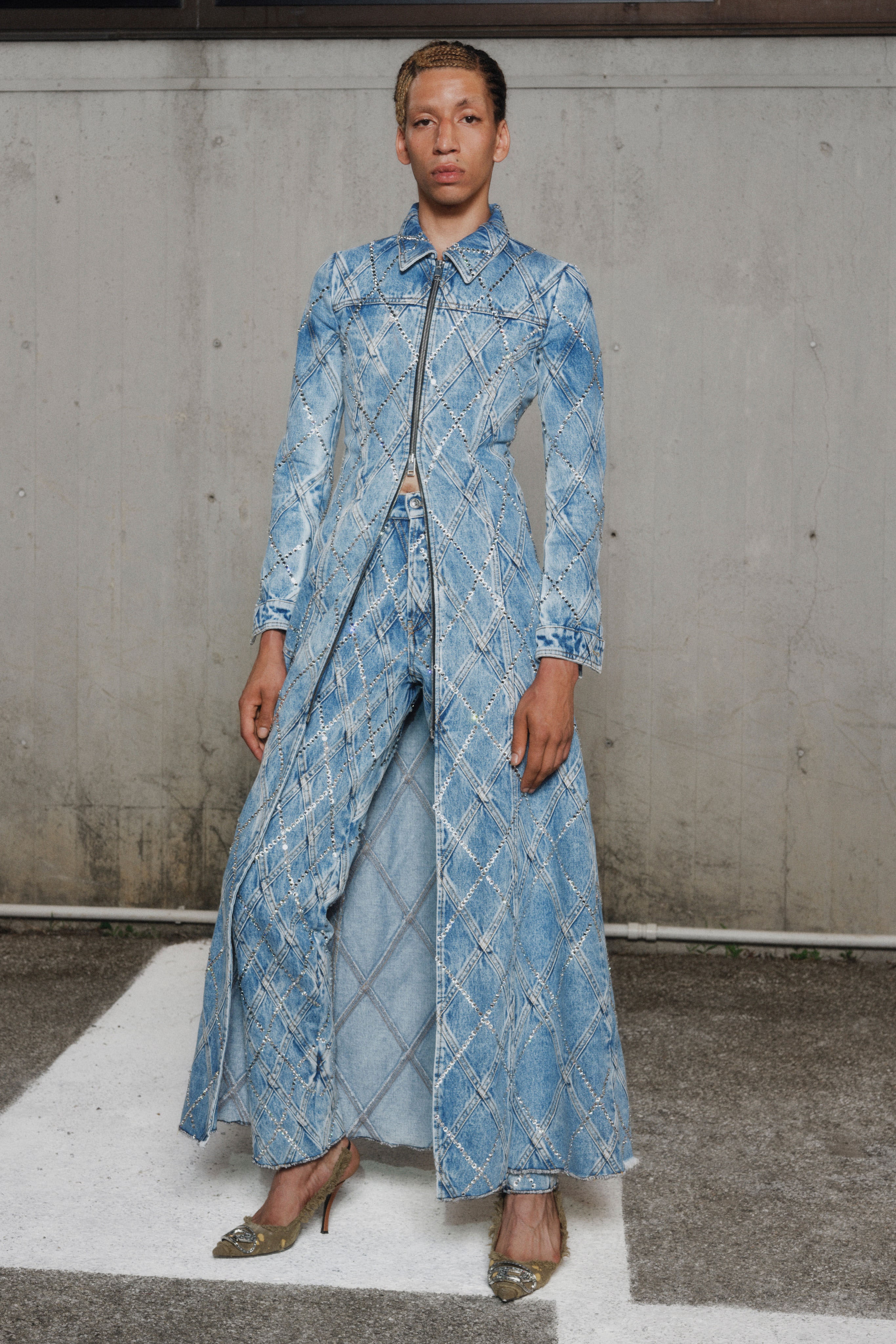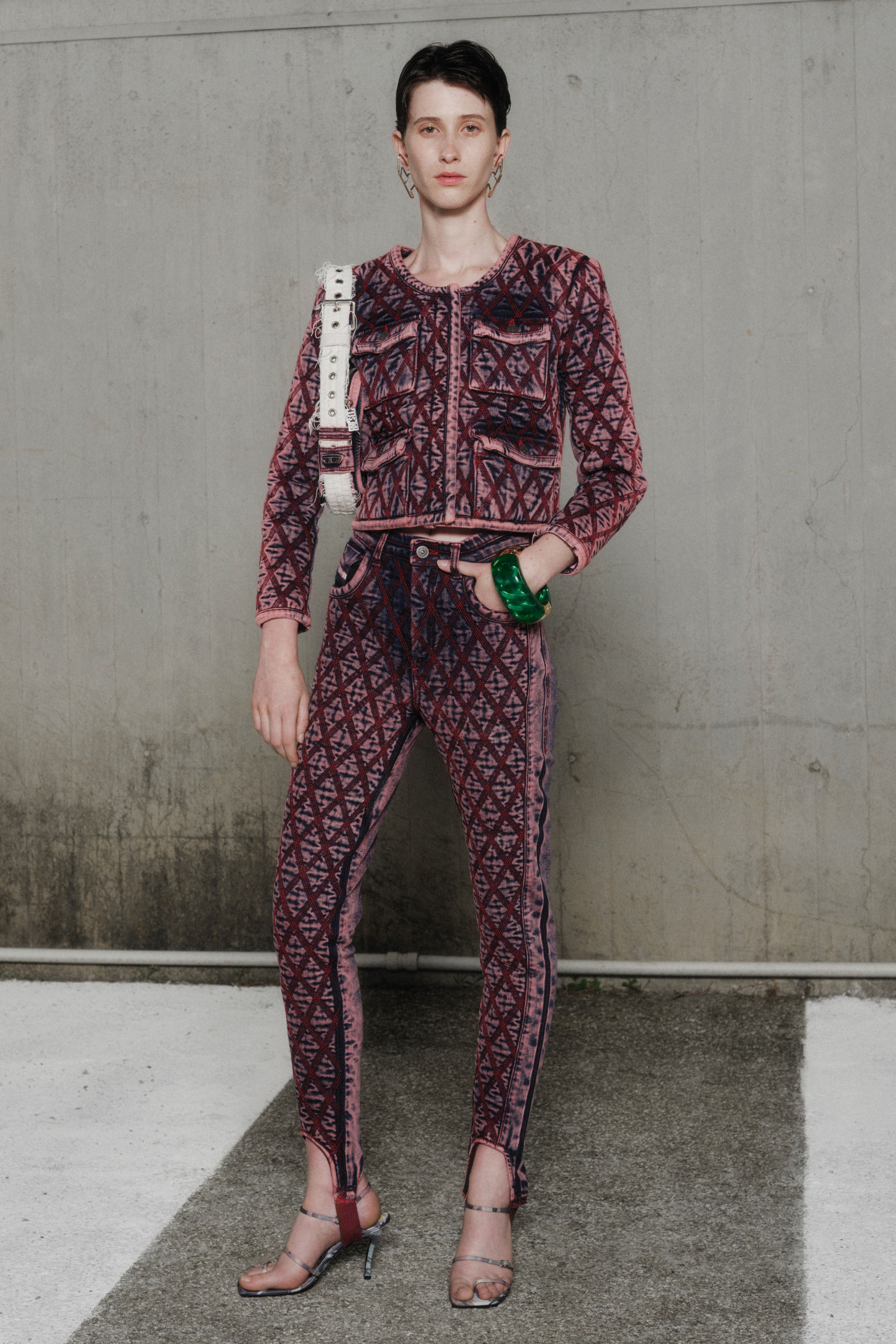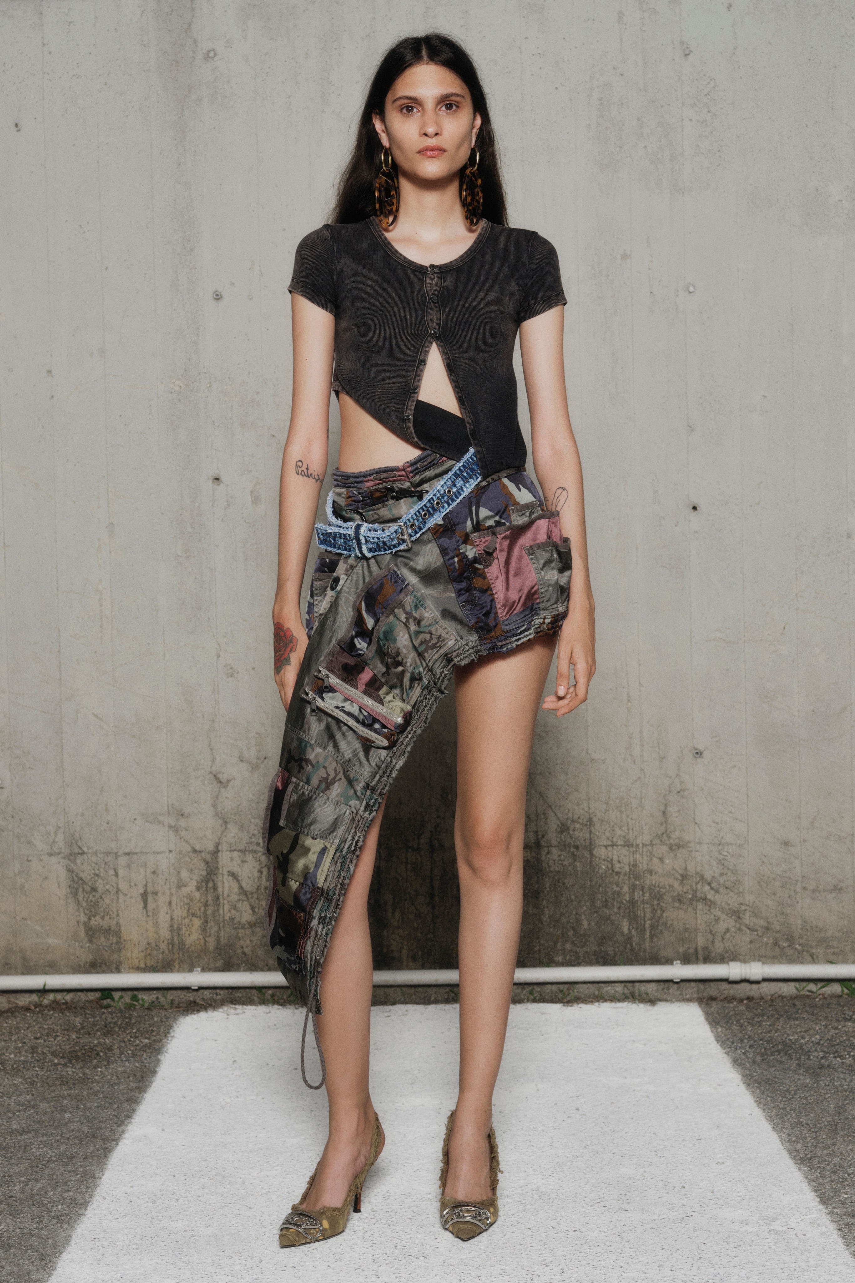 Мартенс также представил квинтэссенцию джинсовой моды 2000-х, в которой бренд занимал определенно значимое положение. Так, ряд моделей составили юбки и топы из деконструированных курток и комбинезонов с накладными карманами, брючные костюмы, соблазнительные топы и оверсайз-рубашки из денима. Линию верхней одежды представили силуэтные пальто и плащи из выбеленного денима, сформированного в технике "тромплей", объемные парки и фактурные шубы из производственных лоскутов ткани. Одни из главных материалов 2000-х, органзу и атлас, дизайнер интегрировал в экстравагантные модели спортивных брюк с завышенной талией и теннисных рубашек. Почти вся коллекция состоит из органически окрашенных тканей и переработанного денима, включая мужские и женские вещи. Для эффектных платьев с подчеркнутой линией талии джинсовую ткань сжали в объемное 3D-полотно, а окрашенные в ягодные тона велосипедные шорты дополнили лоскутные жилеты в орнаментальном тиснении. Одним из ключевых штрихов в модернизированном послании Diesel стали колготки, имитирующие джинсовую фактуру со швами и потертостями.