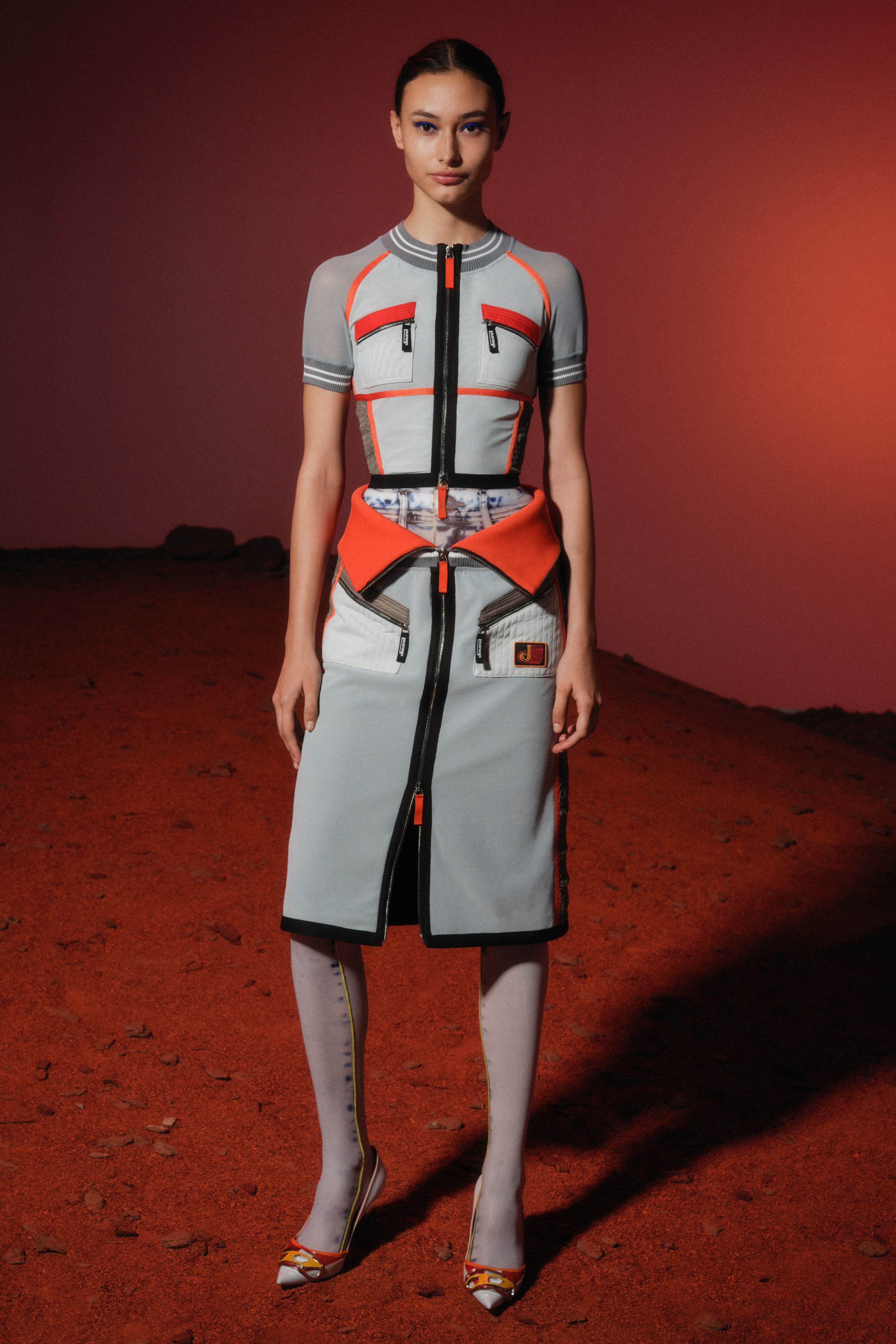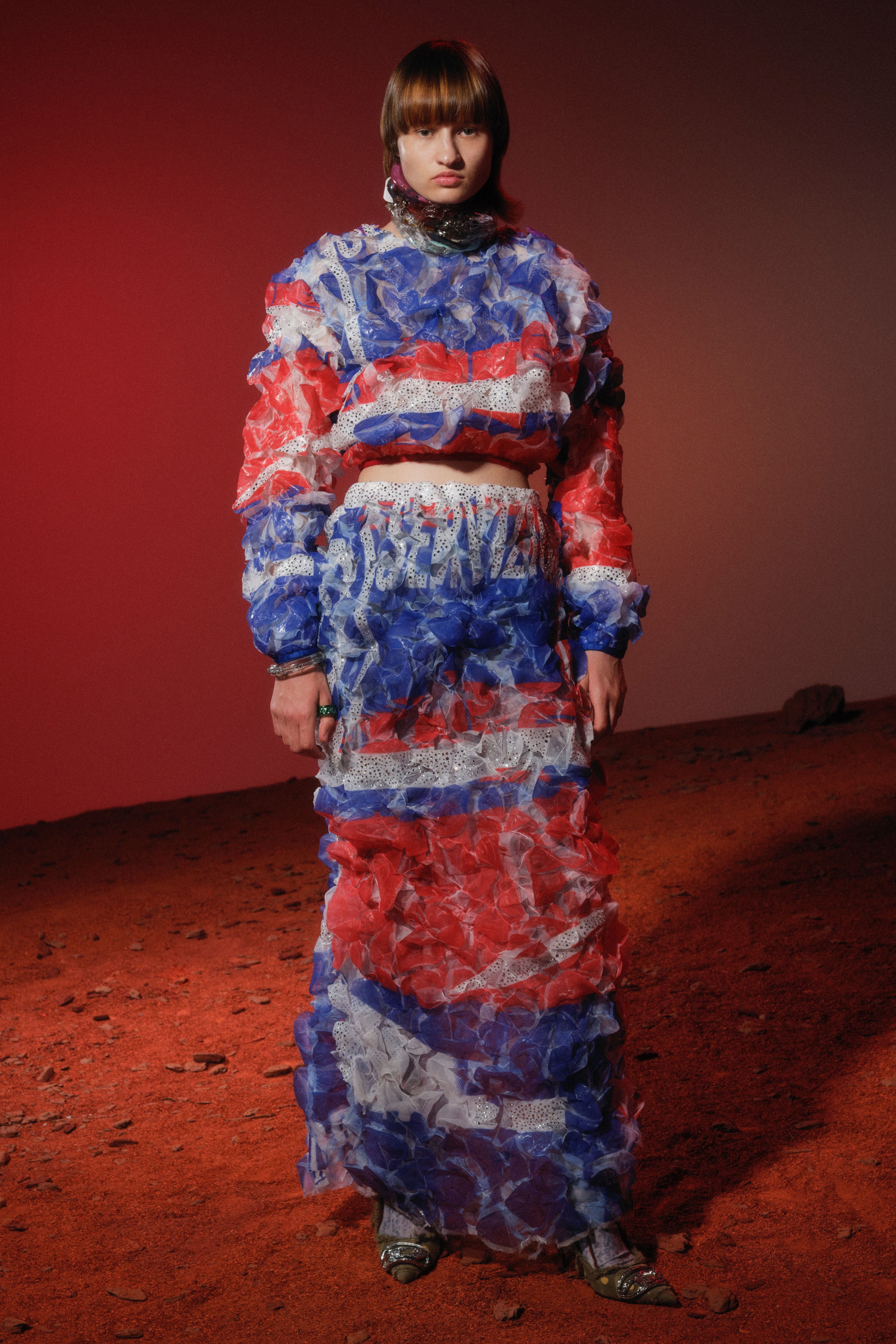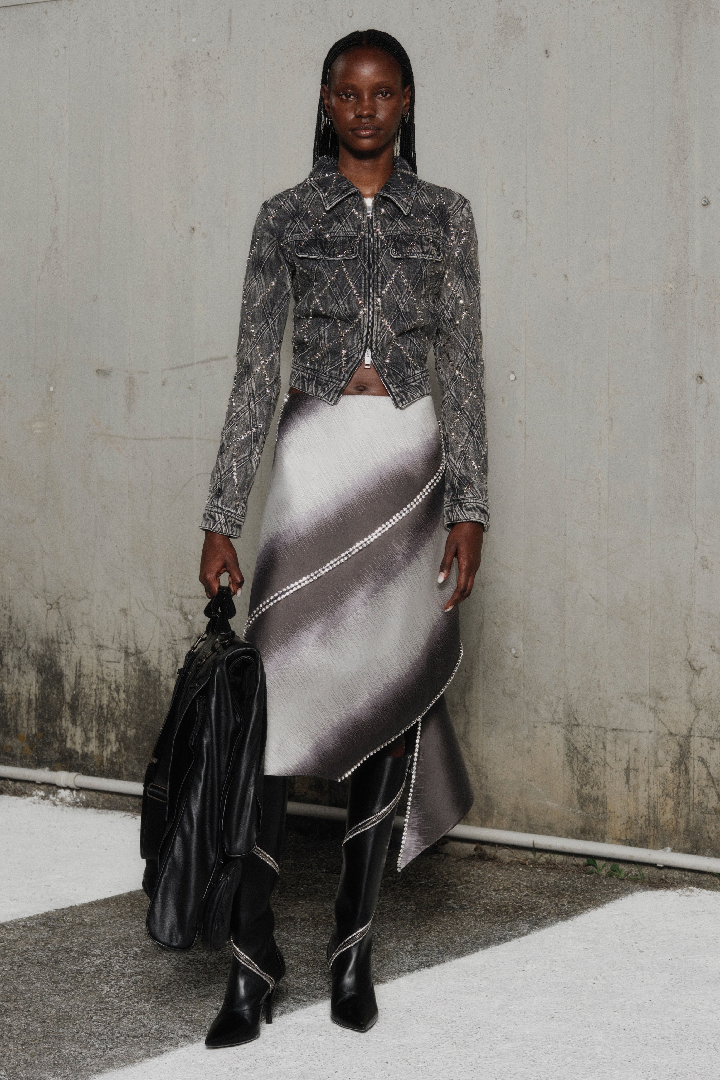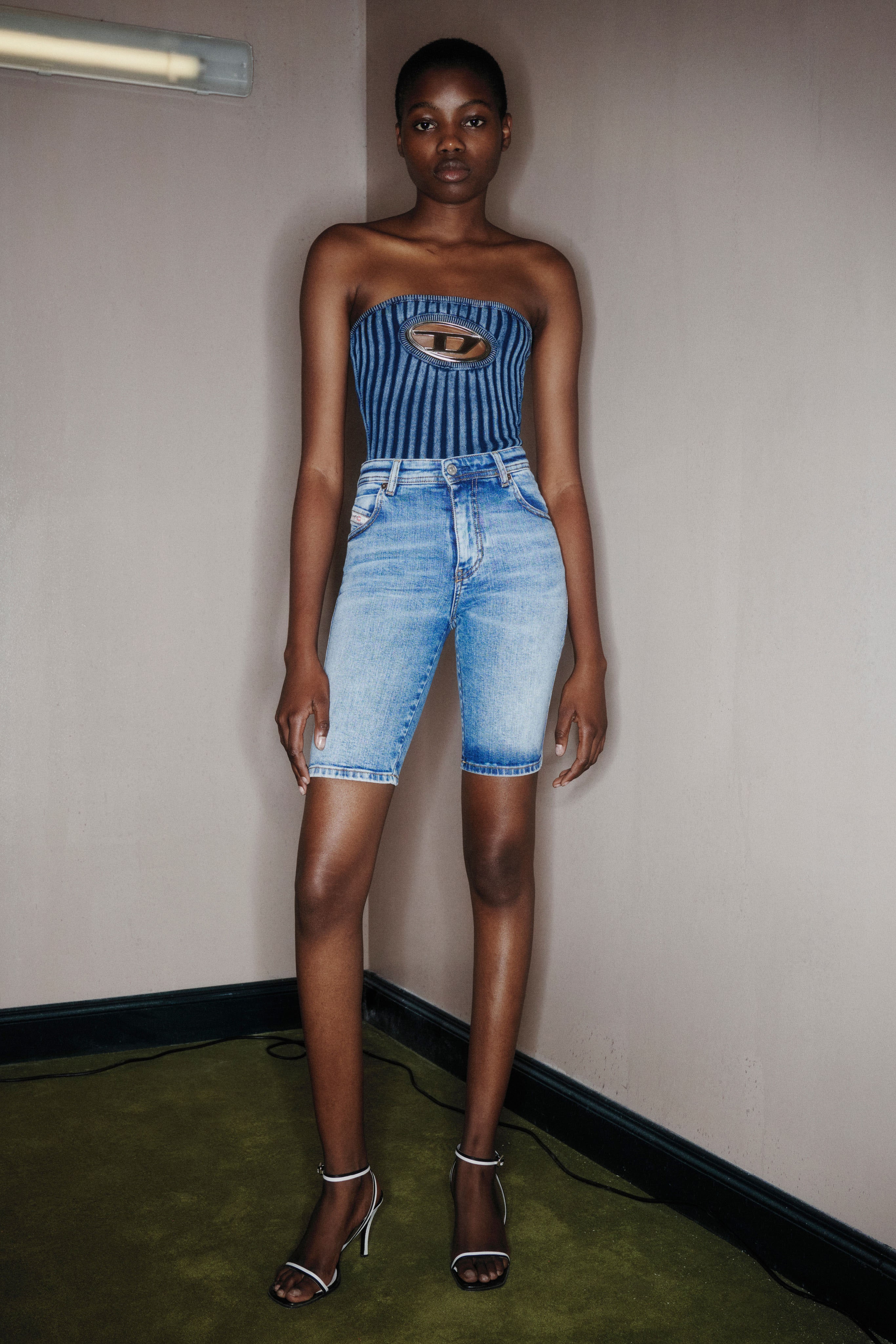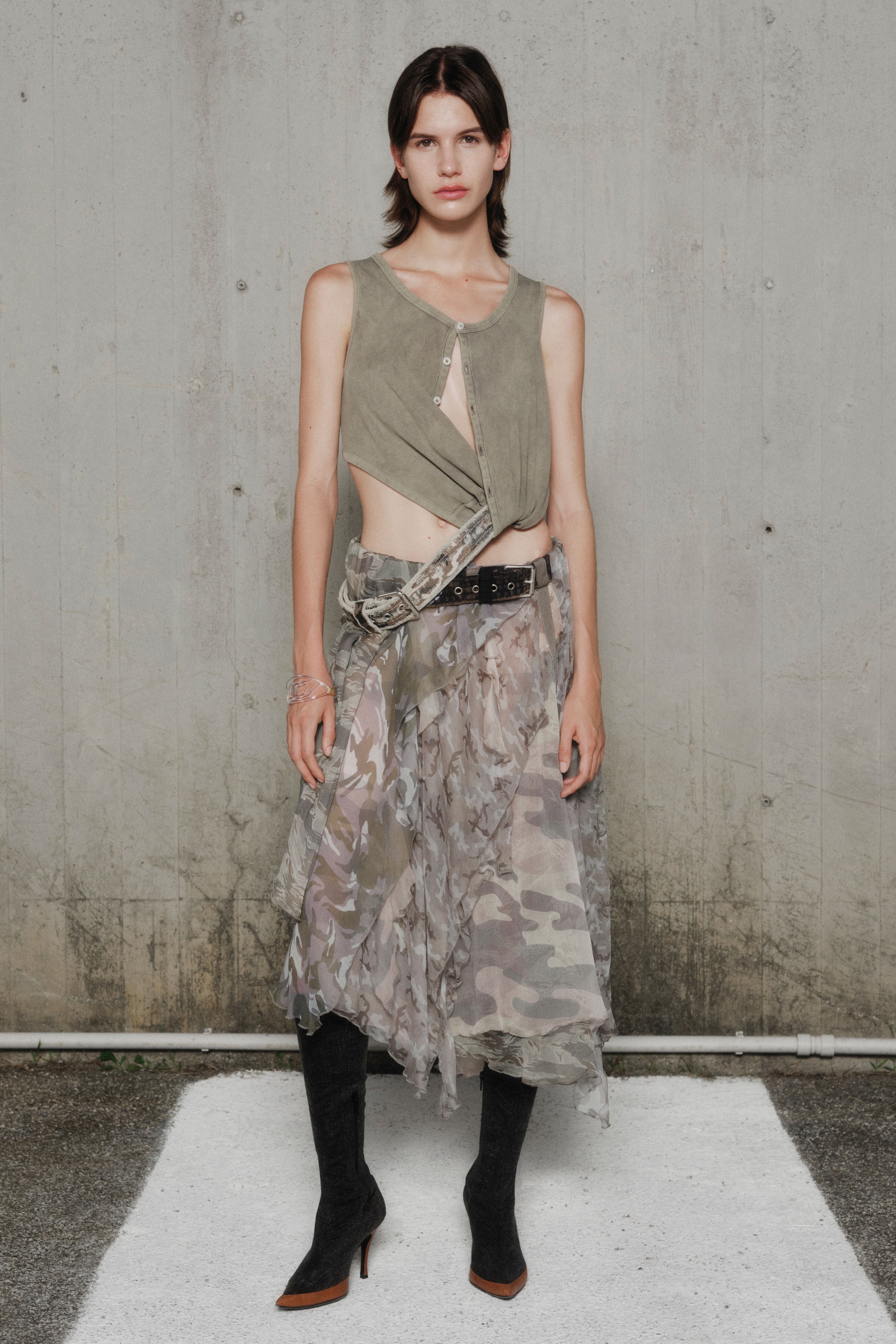 Мартенс также представил квинтэссенцию джинсовой моды 2000-х, в которой бренд занимал определенно значимое положение. Так, ряд моделей составили юбки и топы из деконструированных курток и комбинезонов с накладными карманами, брючные костюмы, соблазнительные топы и оверсайз-рубашки из денима. Линию верхней одежды представили силуэтные пальто и плащи из выбеленного денима, сформированного в технике "тромплей", объемные парки и фактурные шубы из производственных лоскутов ткани. Одни из главных материалов 2000-х, органзу и атлас, дизайнер интегрировал в экстравагантные модели спортивных брюк с завышенной талией и теннисных рубашек. Почти вся коллекция состоит из органически окрашенных тканей и переработанного денима, включая мужские и женские вещи. Для эффектных платьев с подчеркнутой линией талии джинсовую ткань сжали в объемное 3D-полотно, а окрашенные в ягодные тона велосипедные шорты дополнили лоскутные жилеты в орнаментальном тиснении. Одним из ключевых штрихов в модернизированном послании Diesel стали колготки, имитирующие джинсовую фактуру со швами и потертостями.