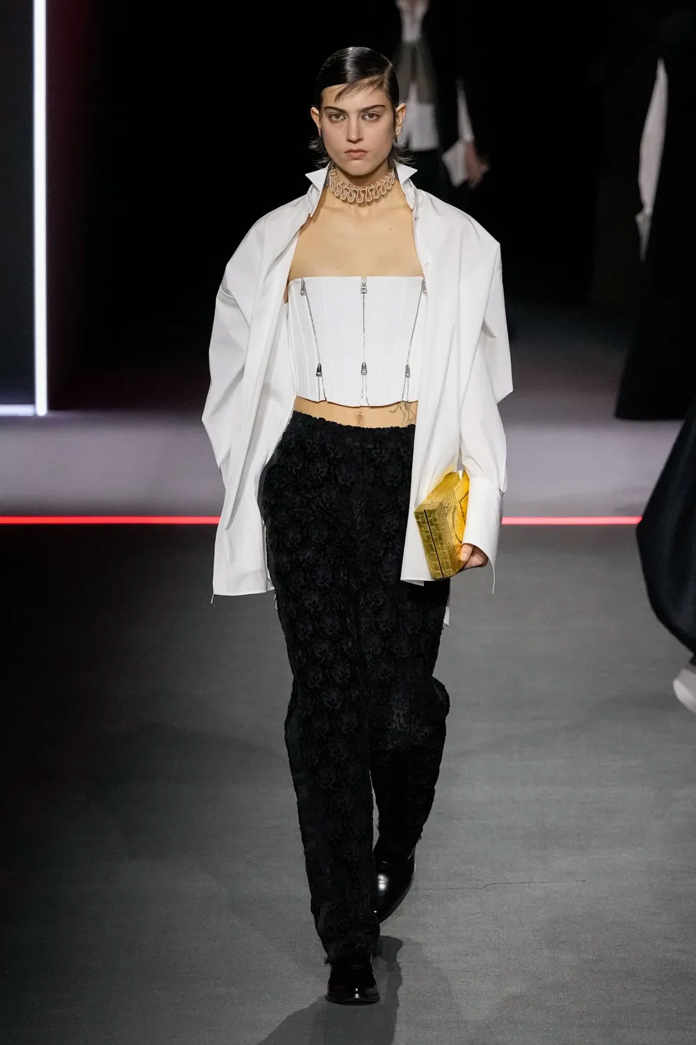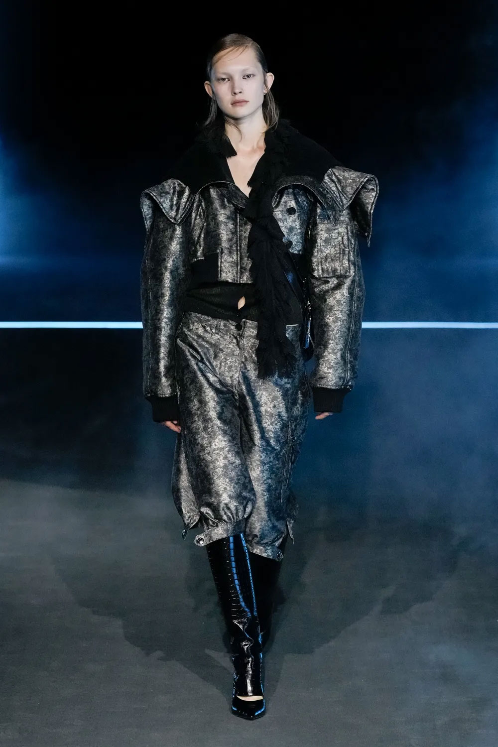 Блузи з комірцями-горжетками, сукні з мереживом чи криноліновими спідницями, тренчі та шкіряні куртки з деконструйованими корсетами, які символізували жагу до дослідження світу, широкі бріджи на зав’язках – ці та інші елементи одягу стали частиною колекції fall-winter — 2025. Неочікувано для модної публіки на подіумі з’явилася і футболка з написом J’adore Dior, яку вперше представив Джон Гальяно в 00-х.
