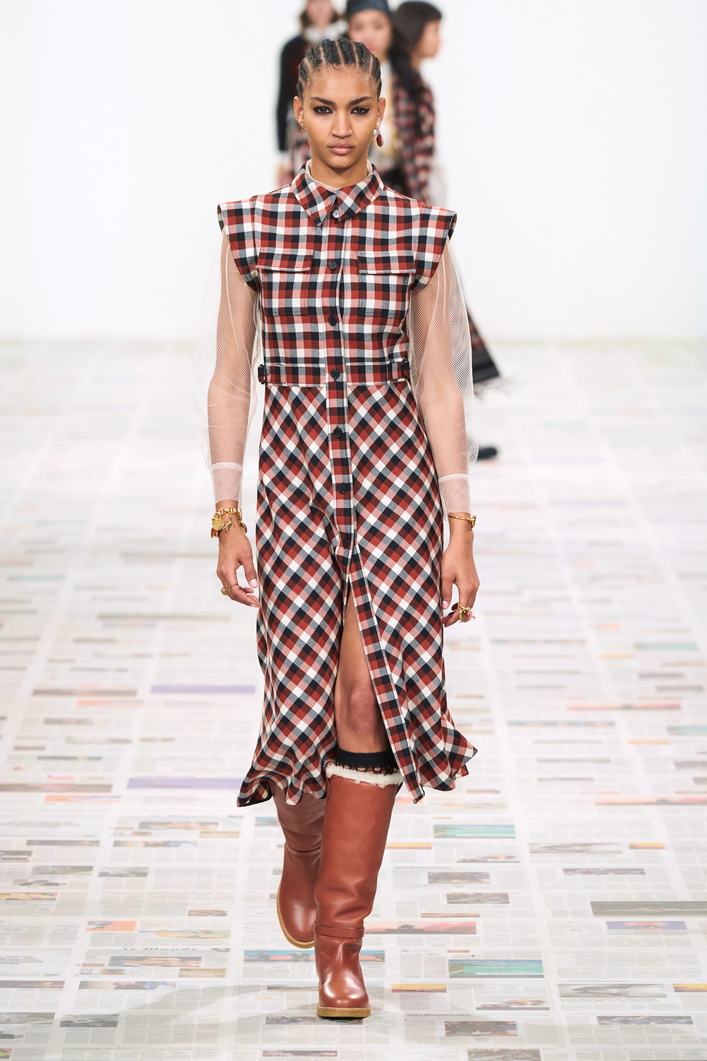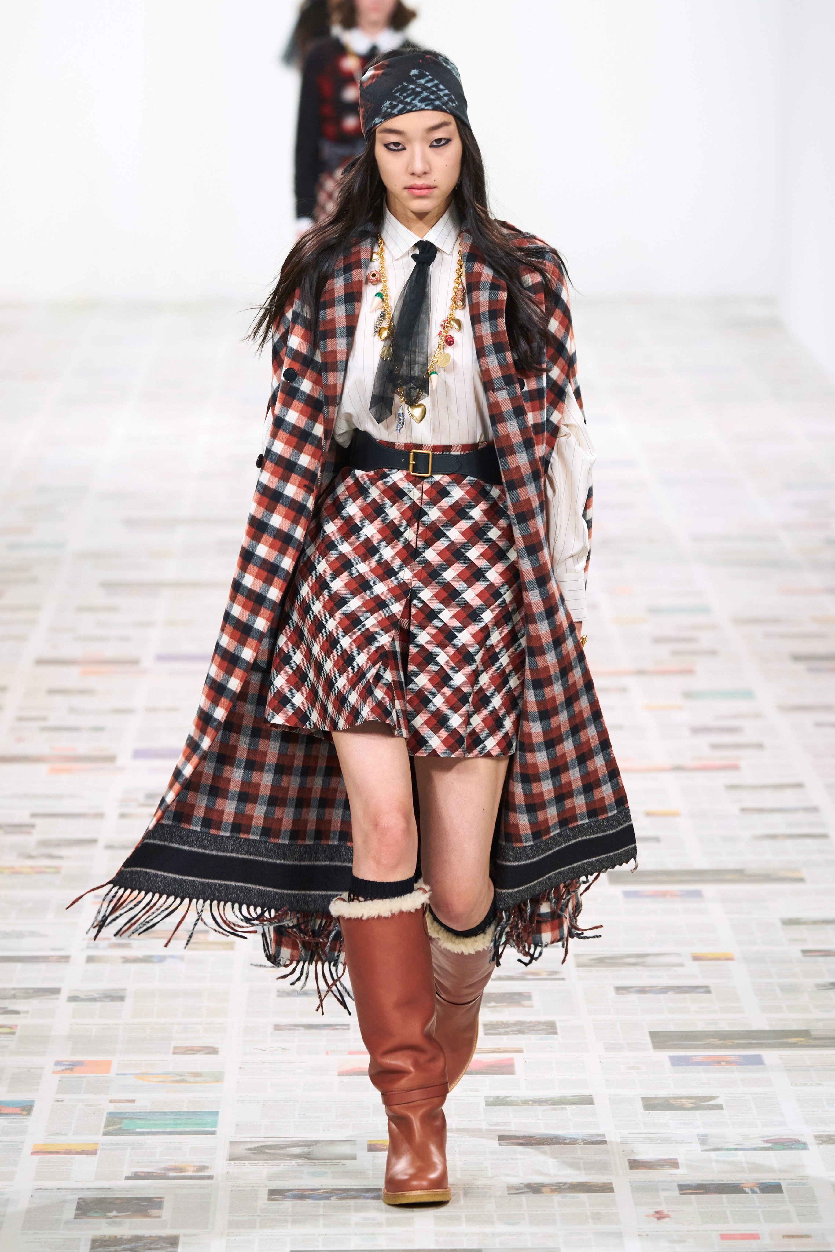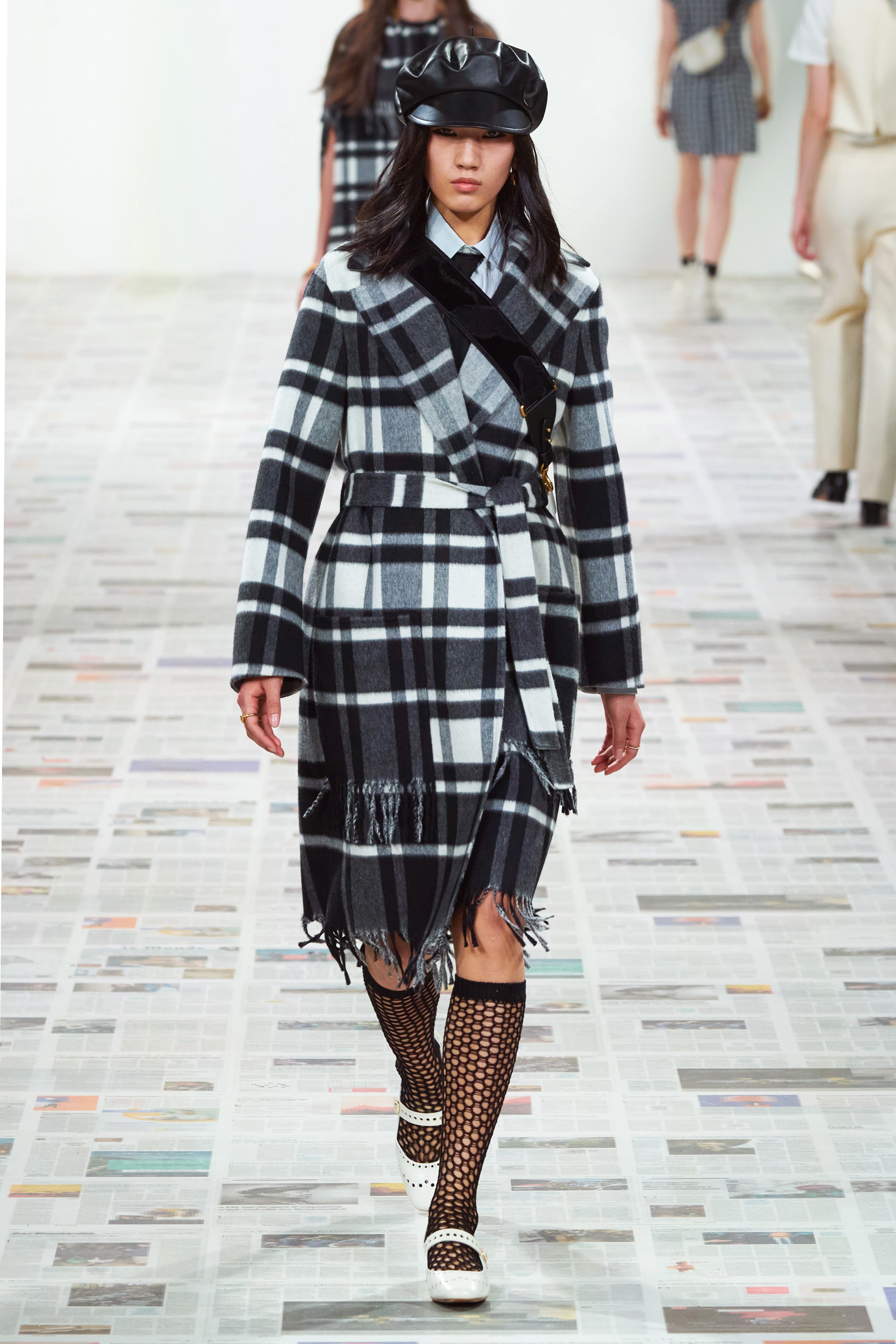 Главный тренд сезона, клетка, также нашел свое место в коллекции: это комфортные костюмы с брюками и юбками миди, жакеты-пончо, платья и пальто чистых силуэтов. Образы коллекции получились озорными, элегантными и лишь отдаленно воинственными.