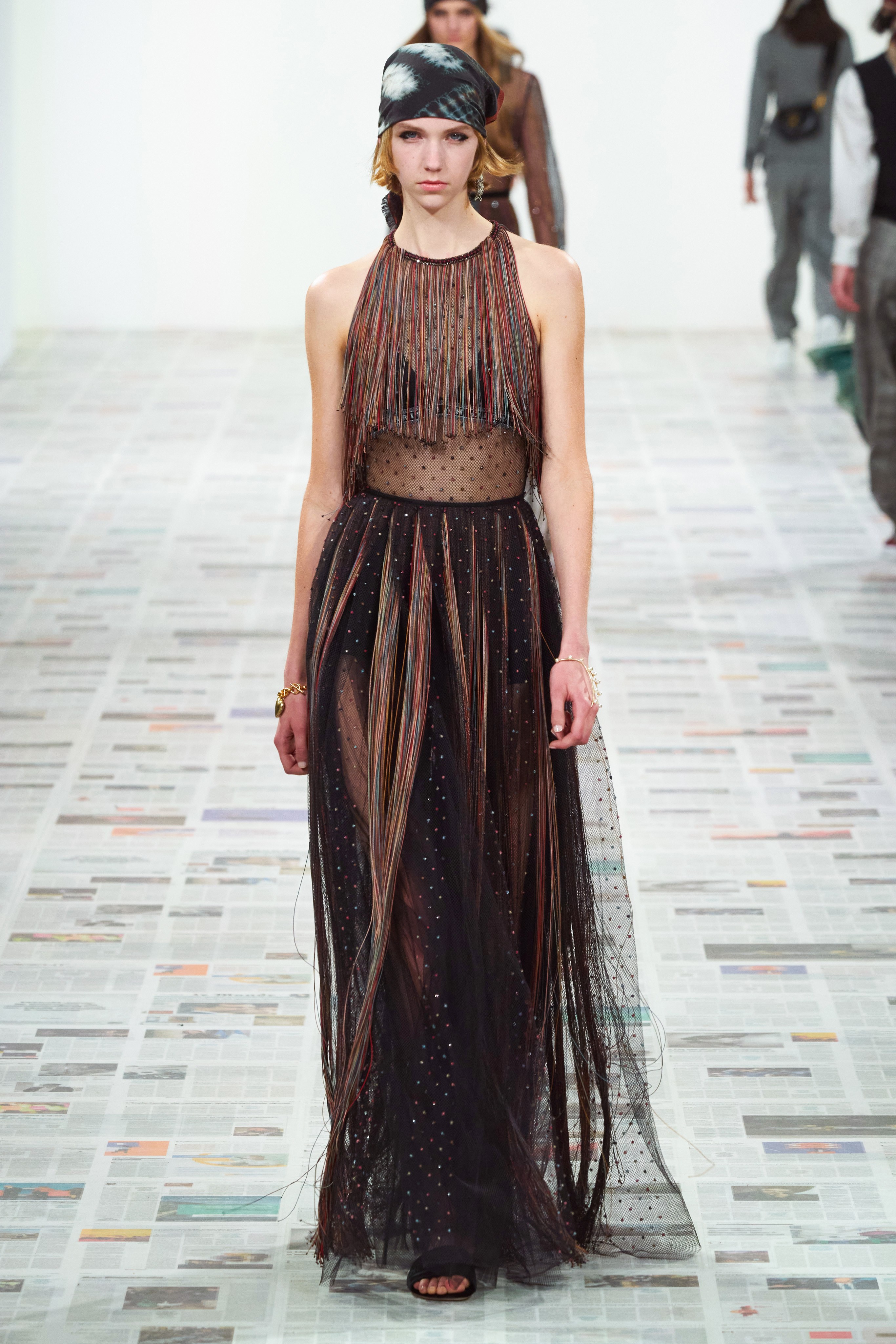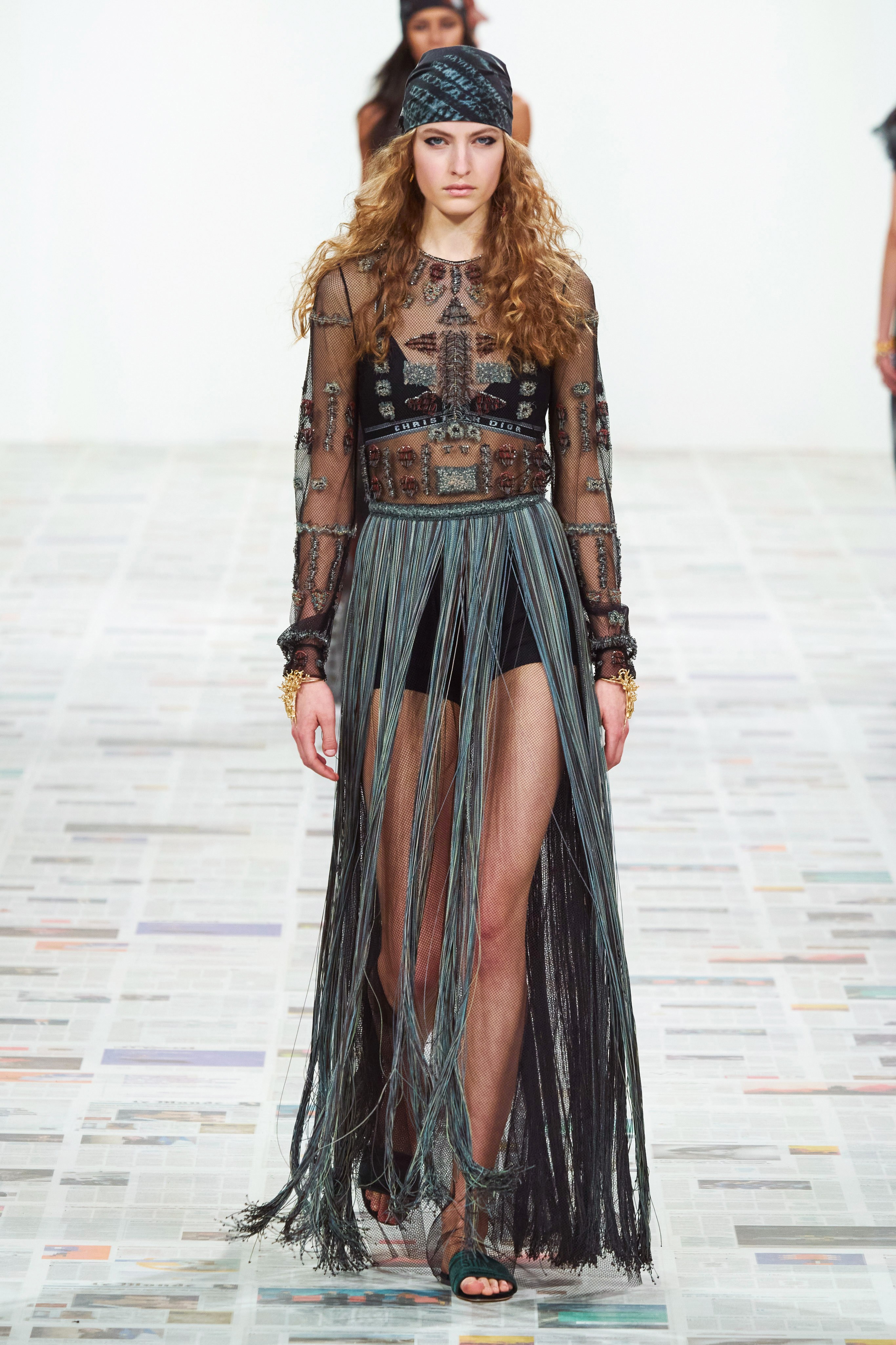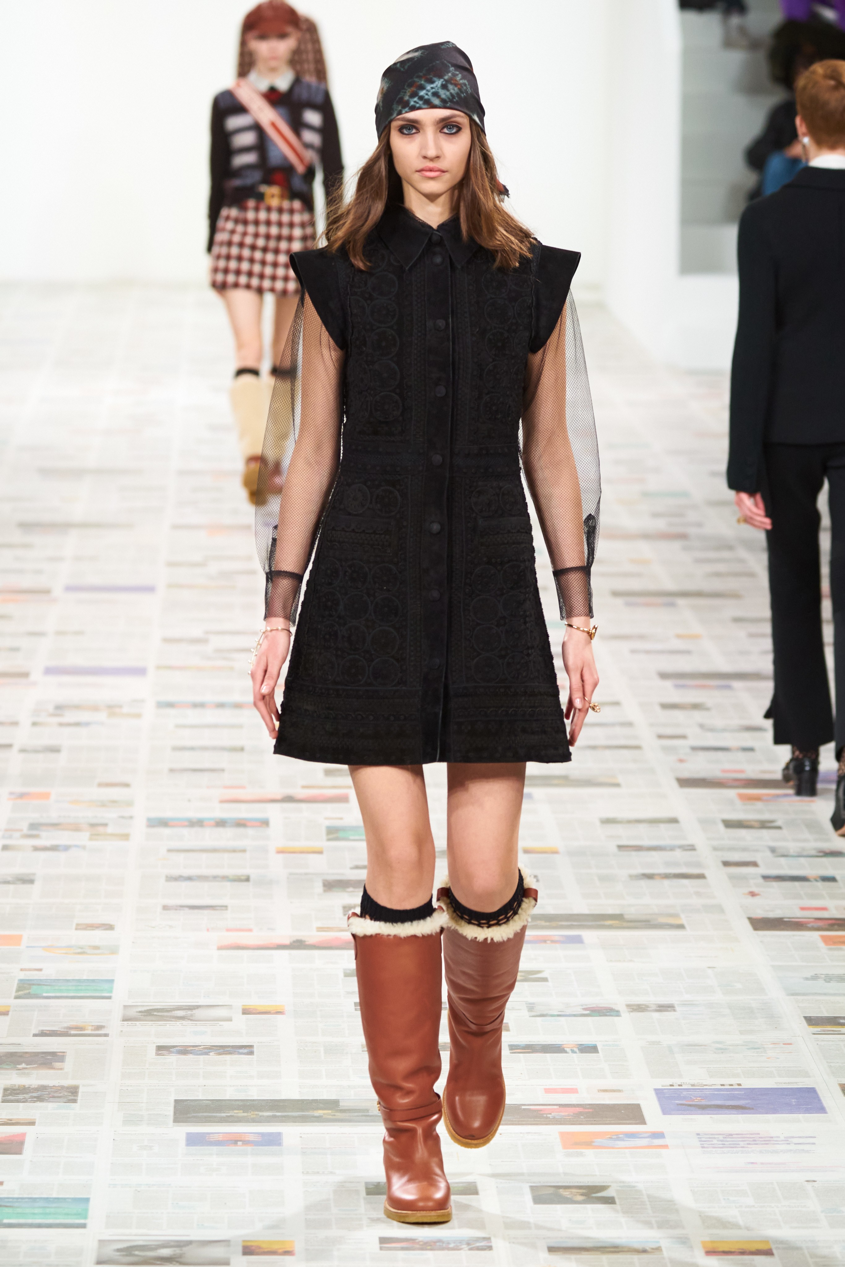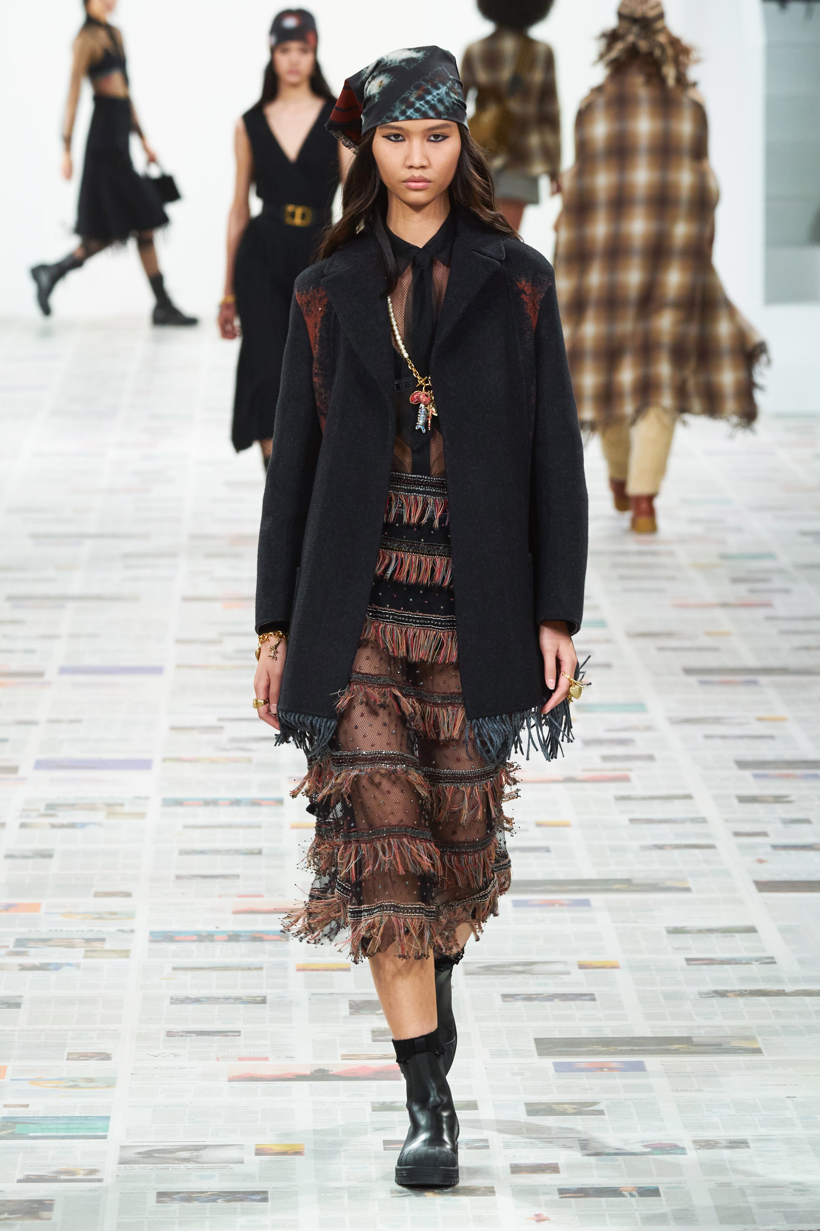 Модели напоминали работниц заводов, военных и активисток, но только не угнетенных и смертельно усталых, а царственных и величавых. На девушках были платья в стиле бохо, шелковые банданы, рубашки с галстуками из органзы, кожаные куртки-косухи и брючные костюмы ультрасилуэтов с пышными басками и подчеркнутой линией талии.