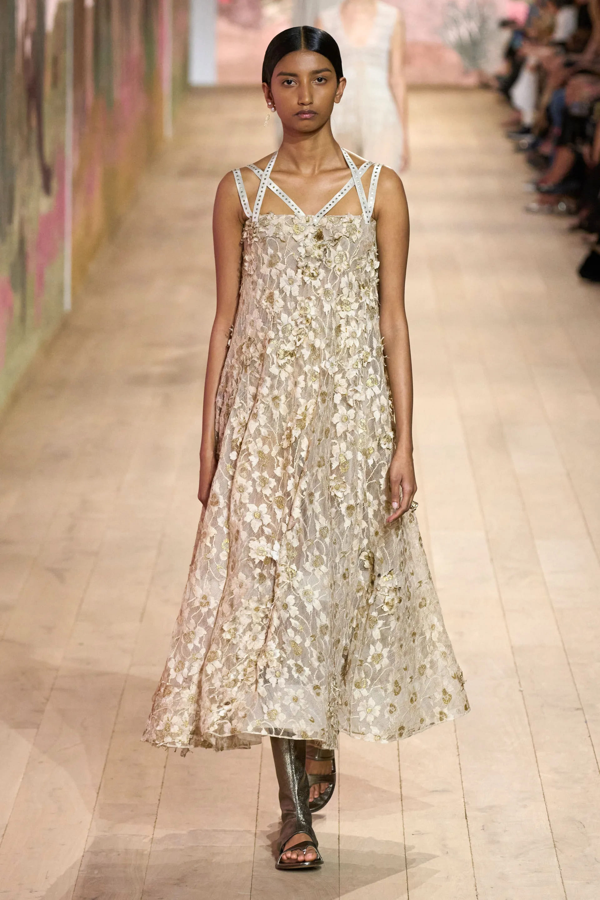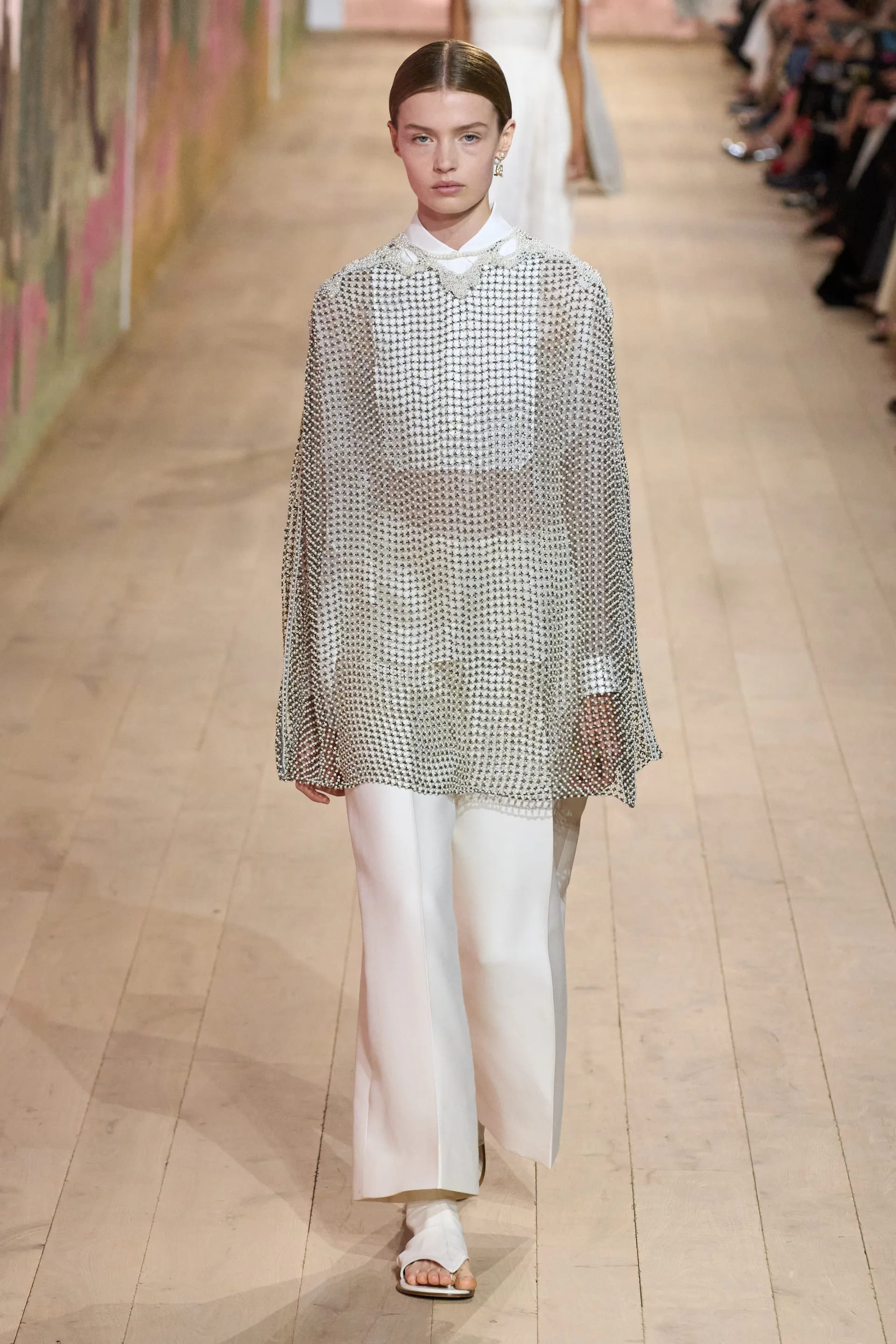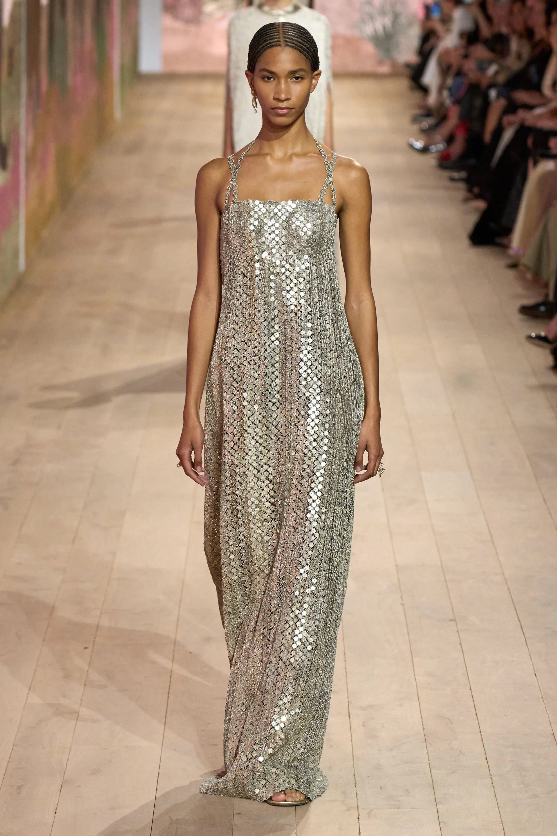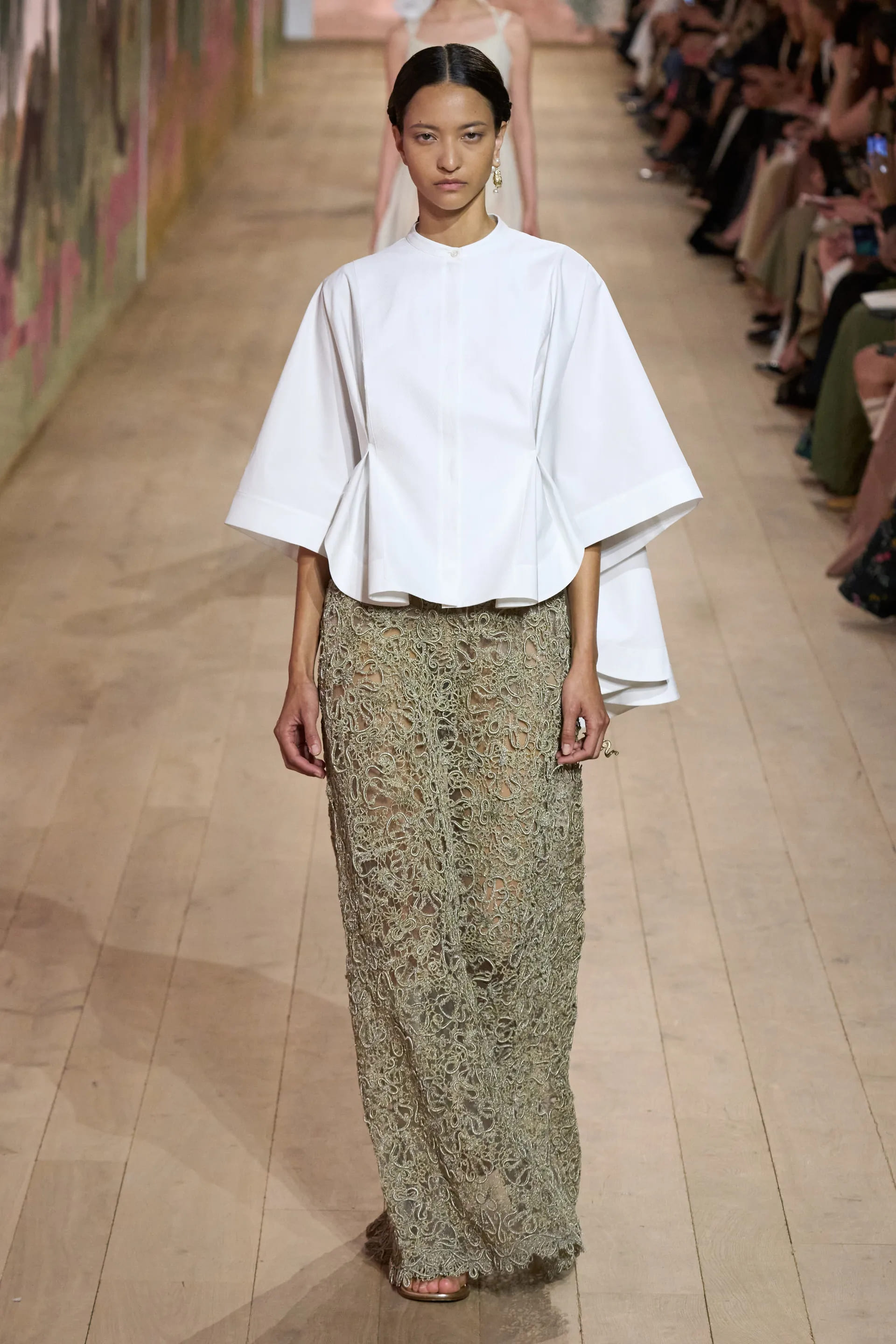 На показі моделі будували міфологічну ієрархію, рухаючись від тюлевої комбінації з босоніжками-гладіаторами до імітації кольчуги, витонченої вишивки з перлами та мерехтливими фактурами на сукнях і спідницях. Кутюр цього сезону від К’юрі є балансом ремісничої майстерності та мінімалізму, а нова висока мода Dior — це увічнення античності й культу богині в ілюстрації жіночої сили та тендітності.