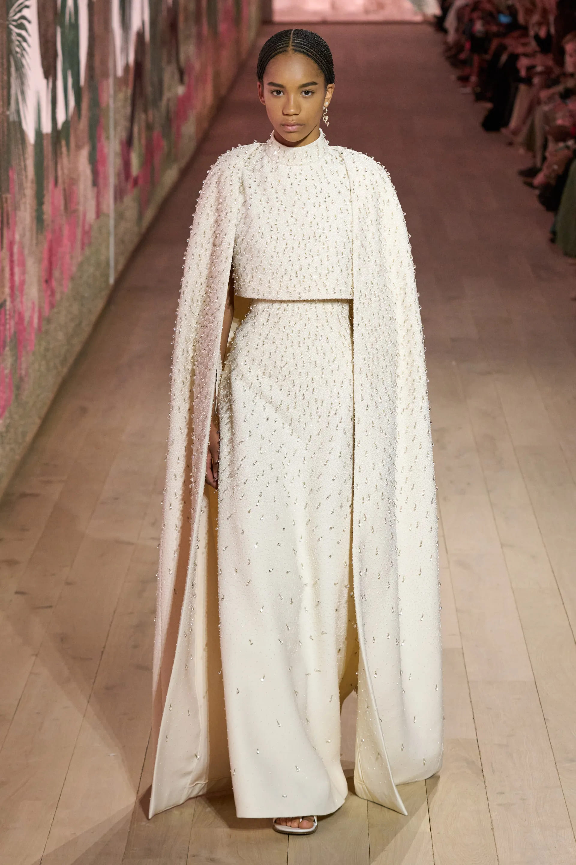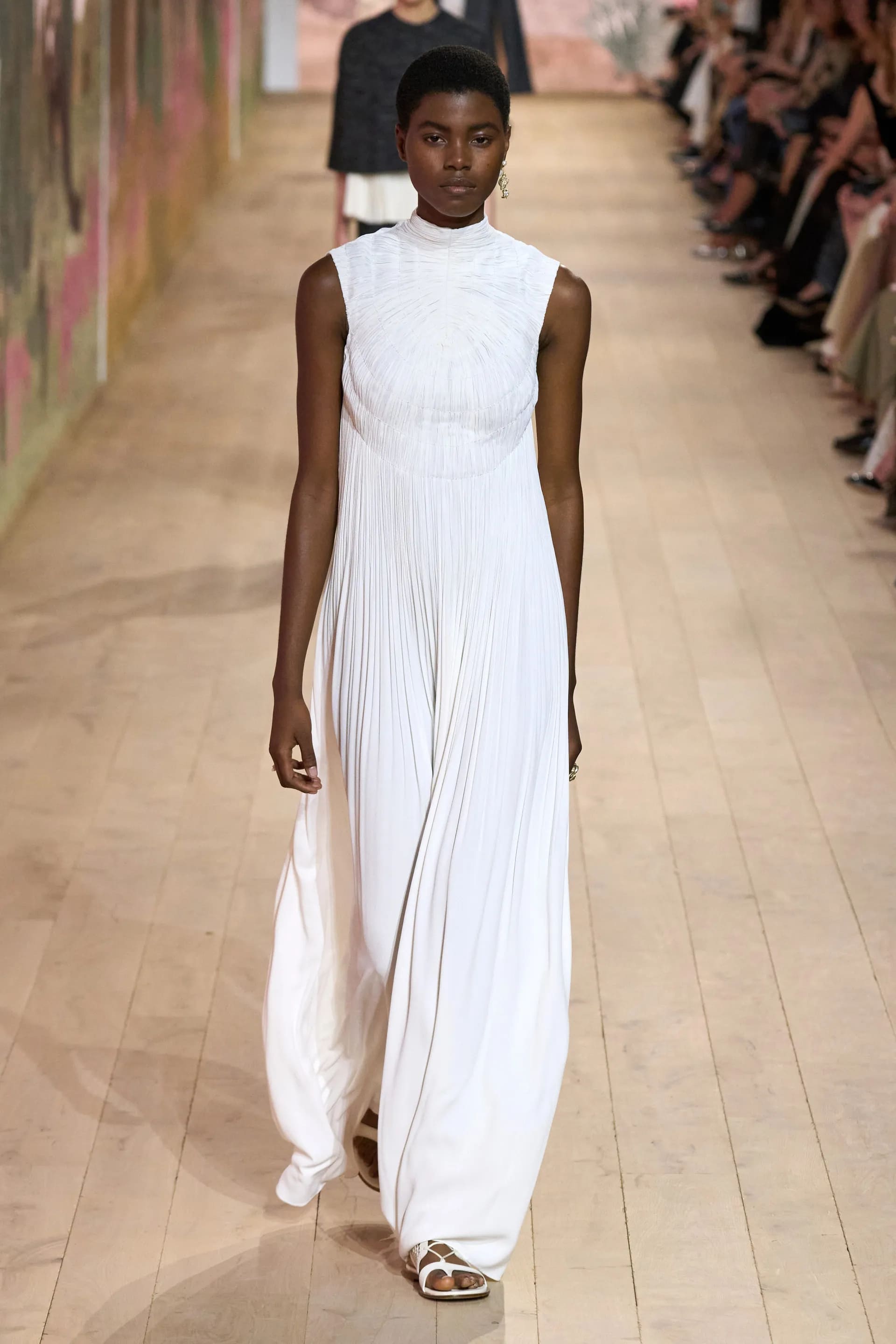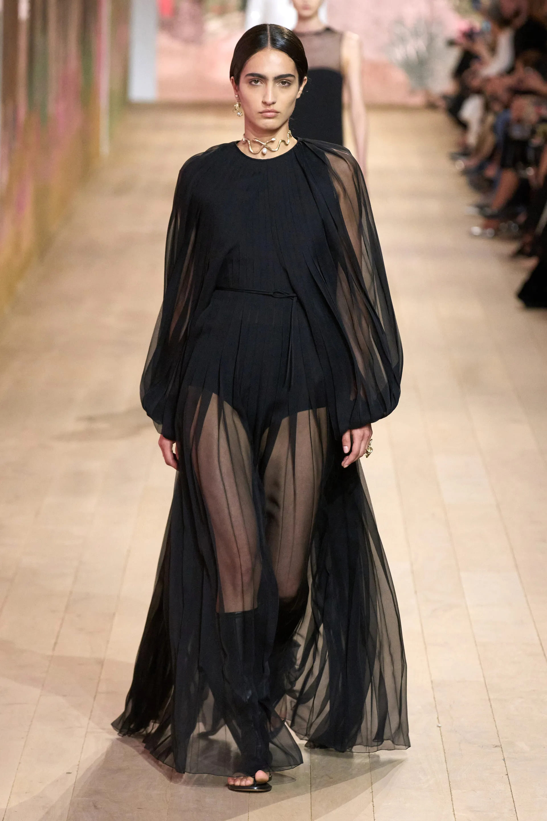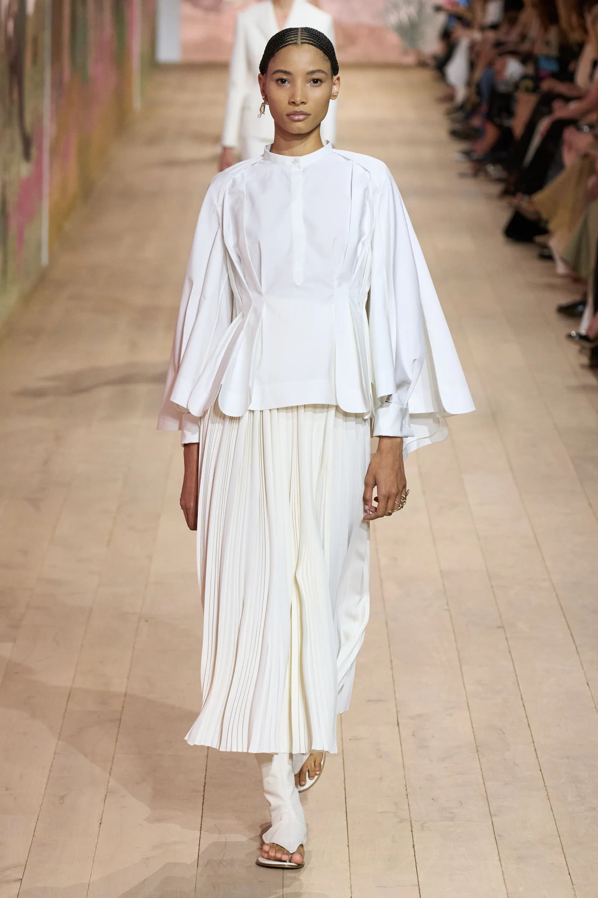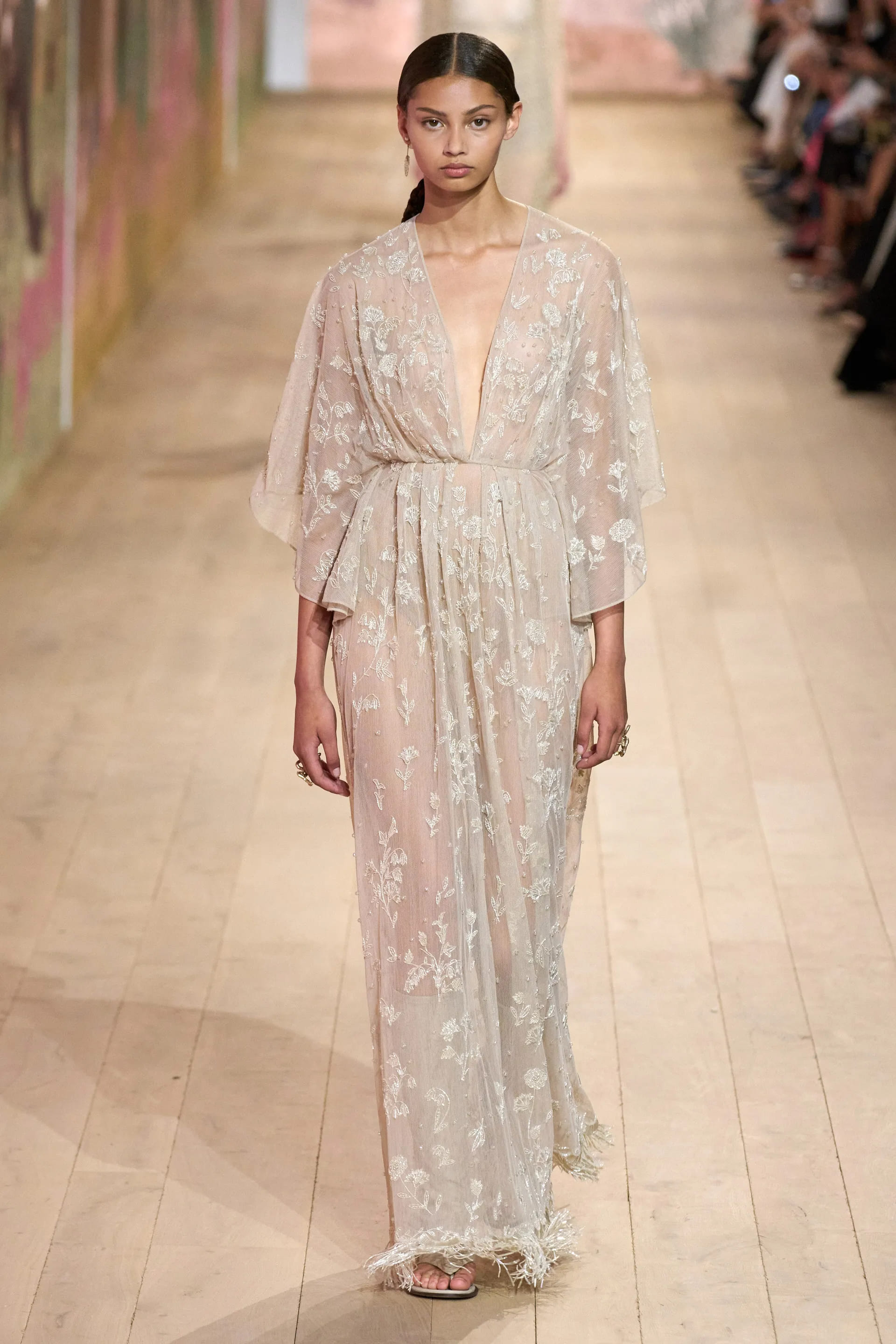 На показі моделі будували міфологічну ієрархію, рухаючись від тюлевої комбінації з босоніжками-гладіаторами до імітації кольчуги, витонченої вишивки з перлами та мерехтливими фактурами на сукнях і спідницях. Кутюр цього сезону від К’юрі є балансом ремісничої майстерності та мінімалізму, а нова висока мода Dior — це увічнення античності й культу богині в ілюстрації жіночої сили та тендітності.