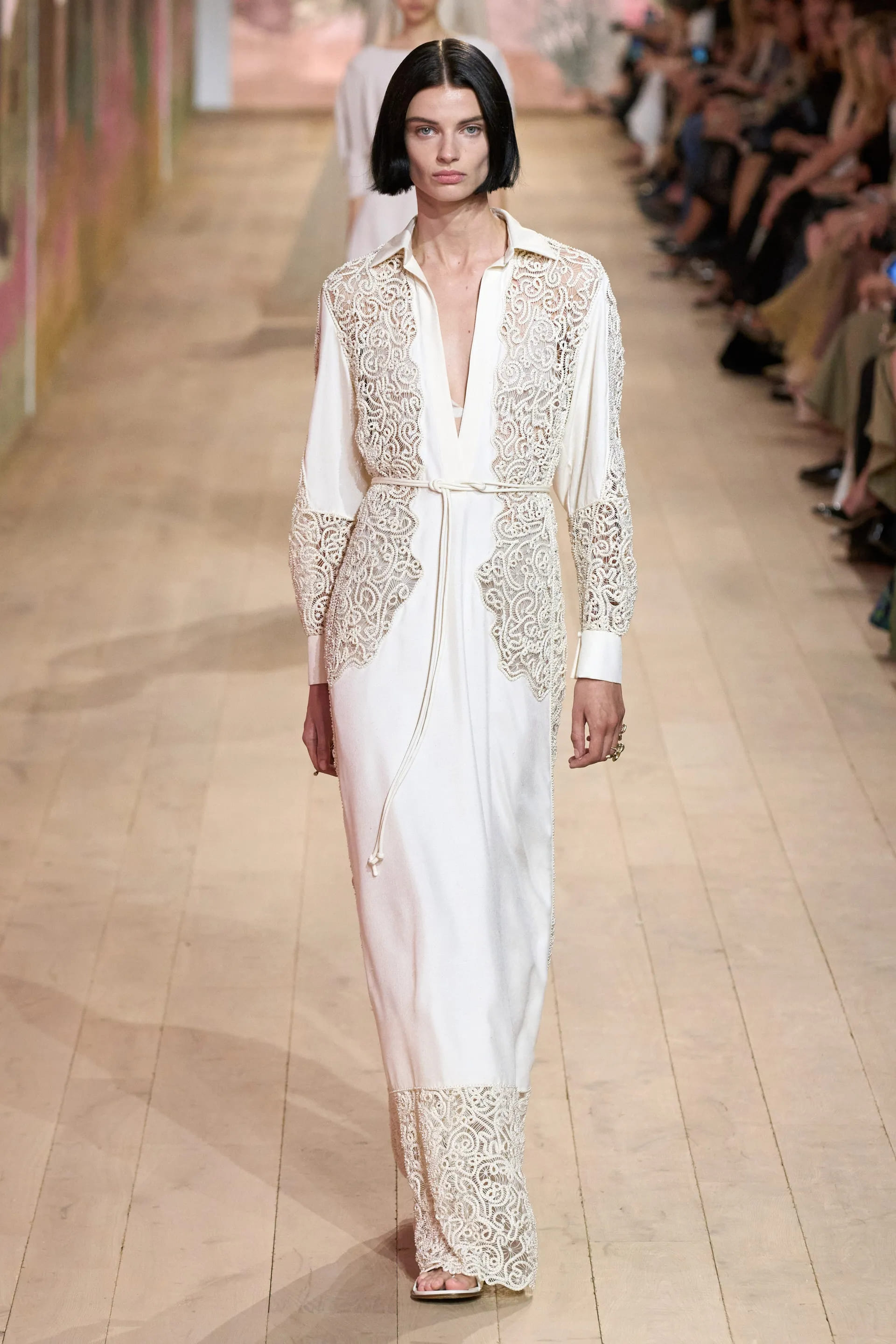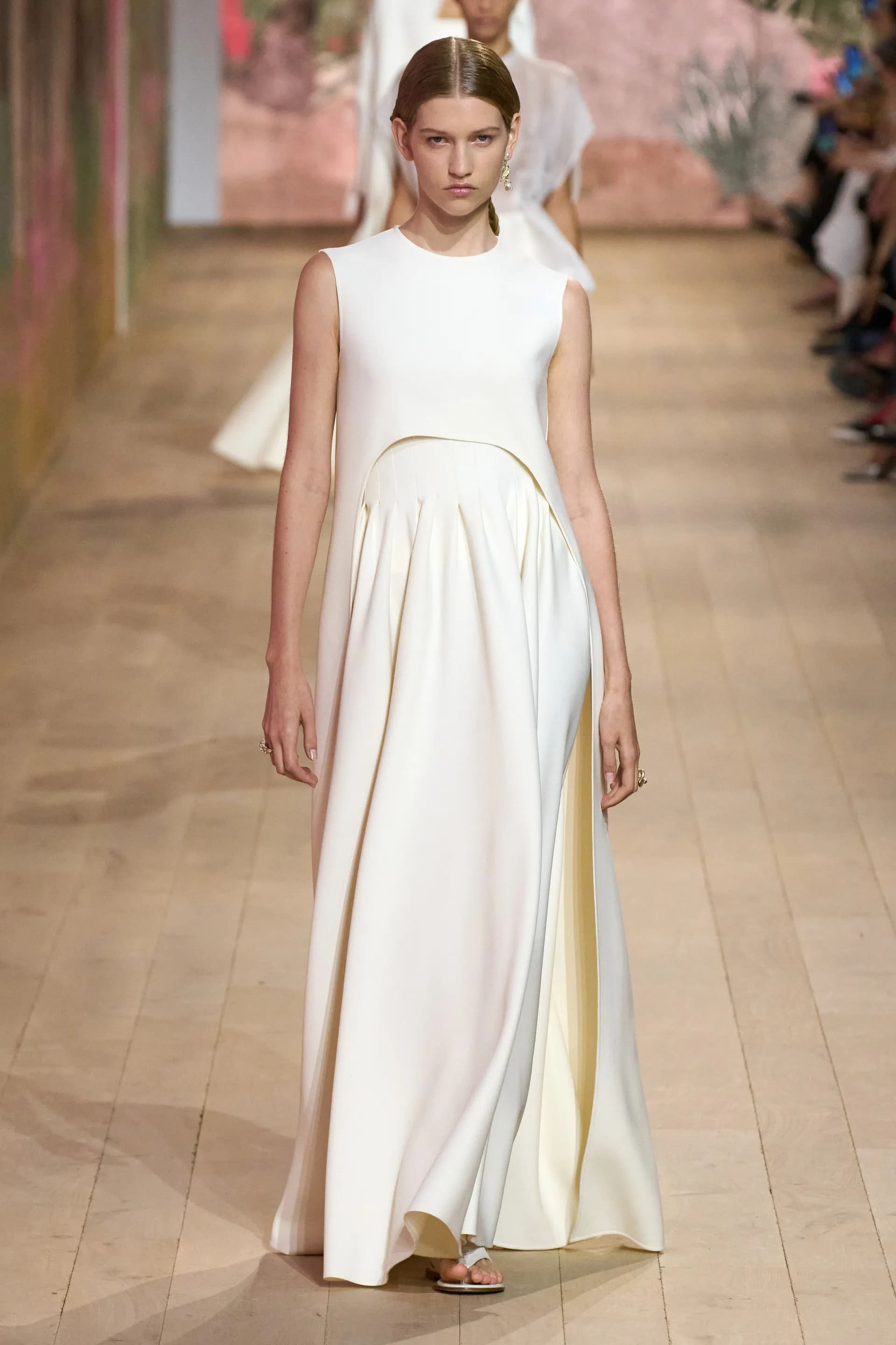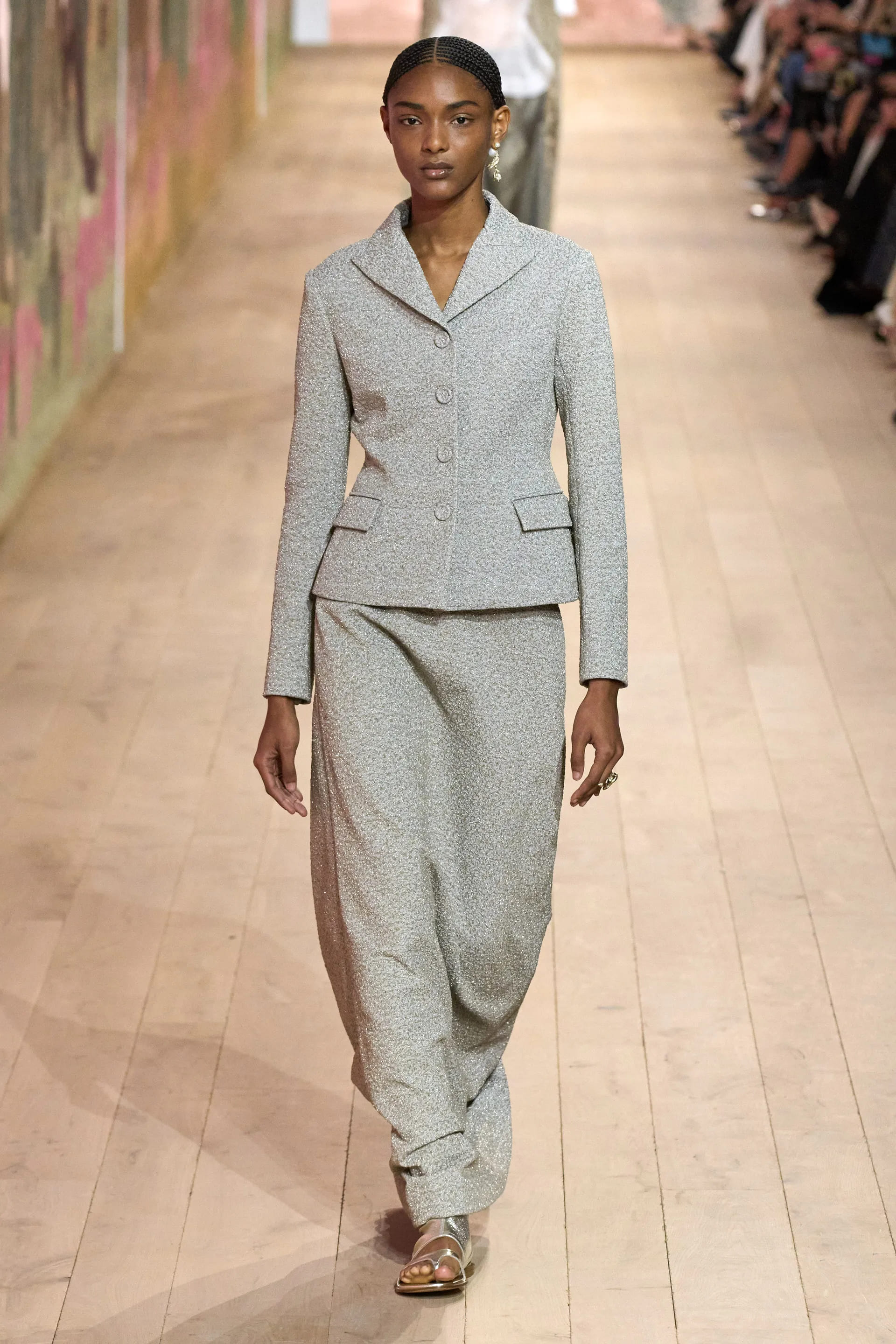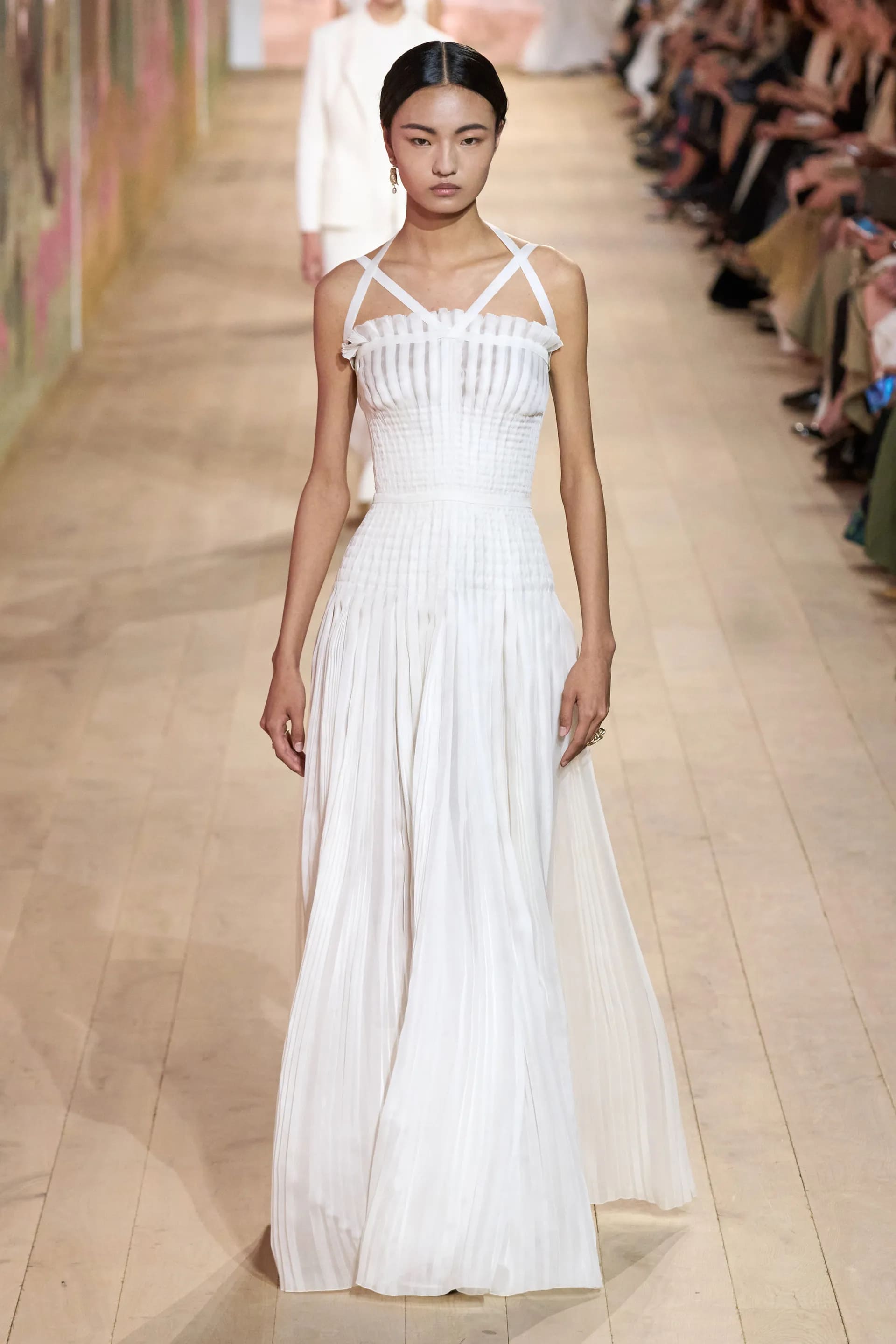 На показі моделі будували міфологічну ієрархію, рухаючись від тюлевої комбінації з босоніжками-гладіаторами до імітації кольчуги, витонченої вишивки з перлами та мерехтливими фактурами на сукнях і спідницях. Кутюр цього сезону від К’юрі є балансом ремісничої майстерності та мінімалізму, а нова висока мода Dior — це увічнення античності й культу богині в ілюстрації жіночої сили та тендітності.