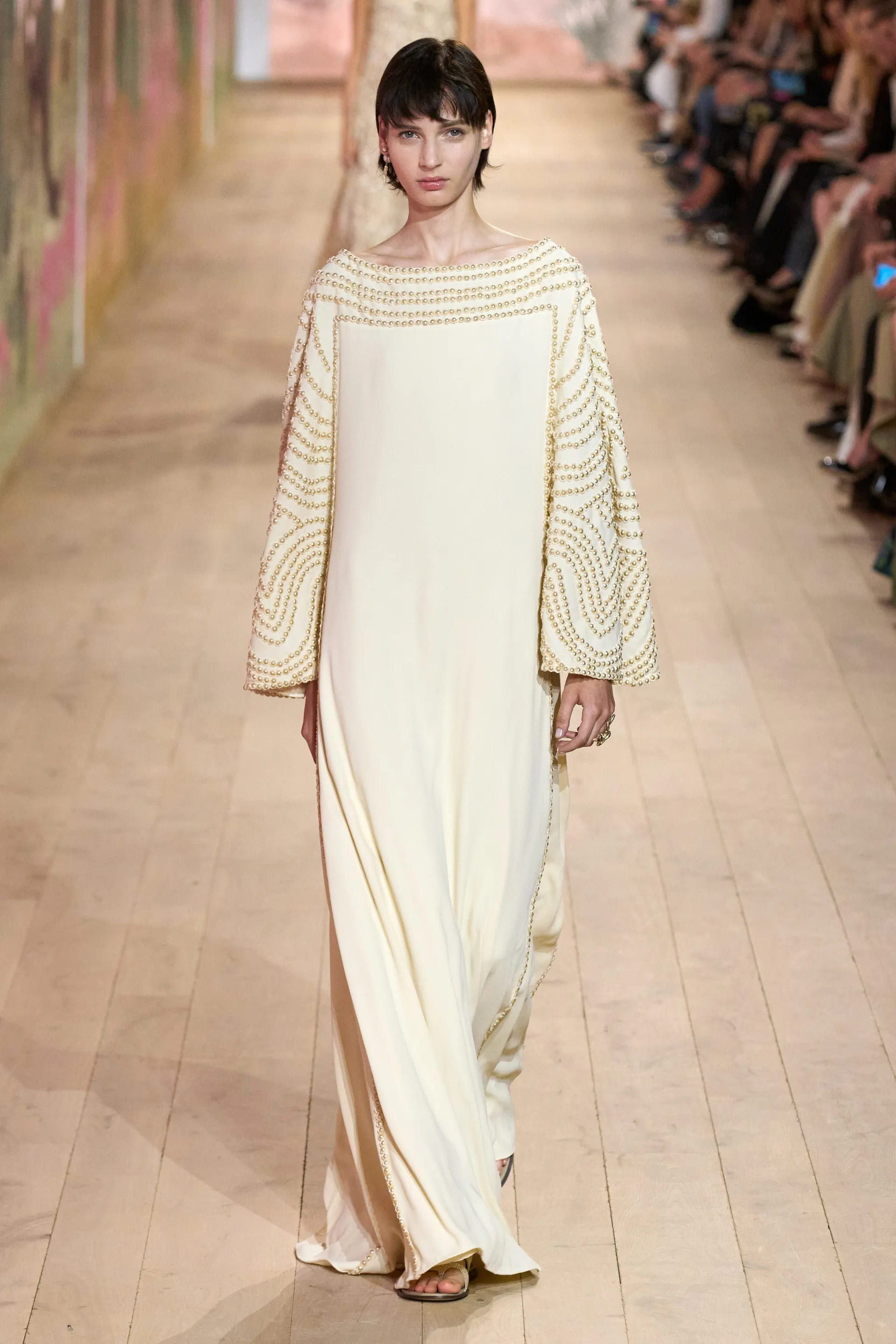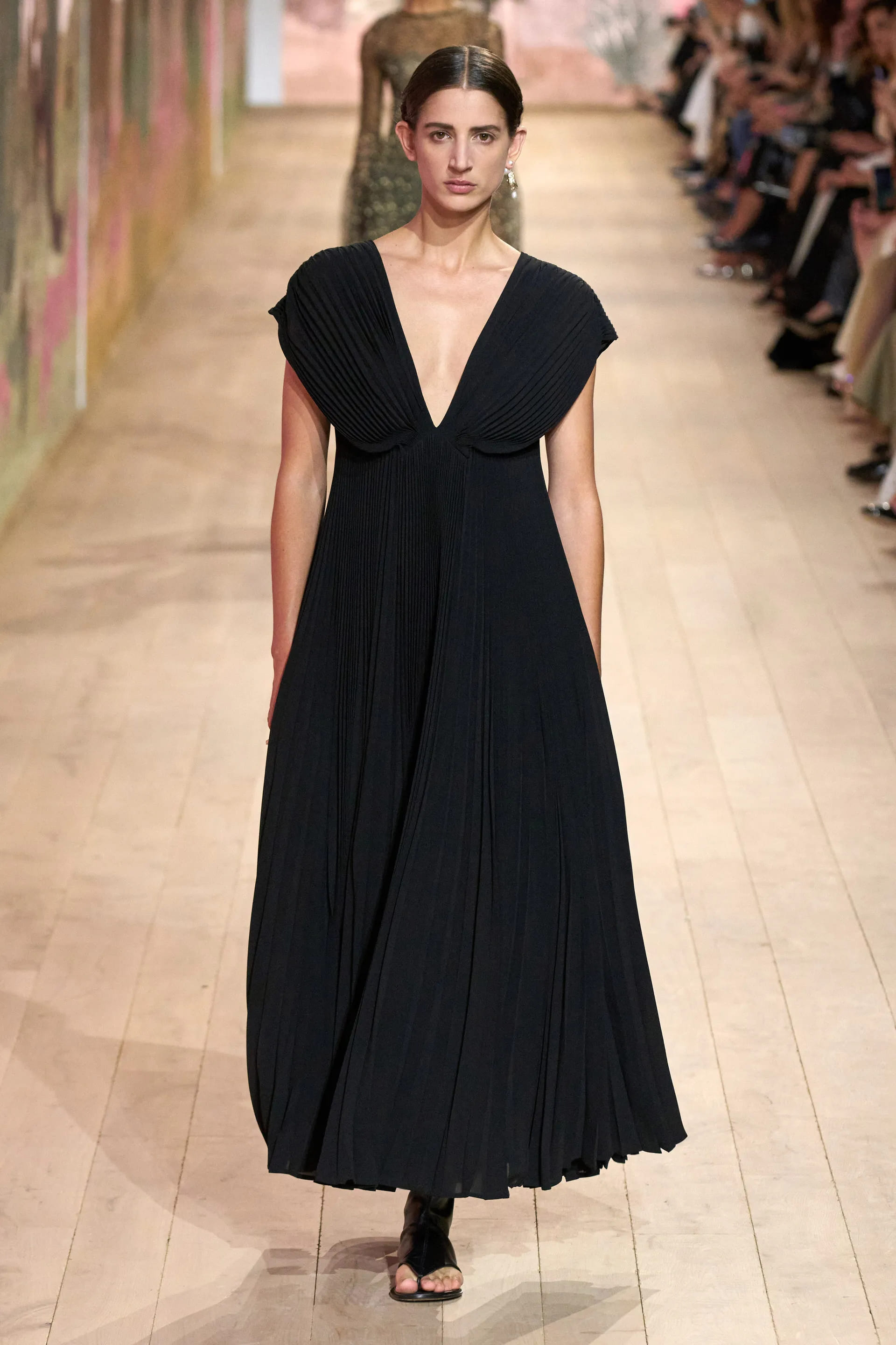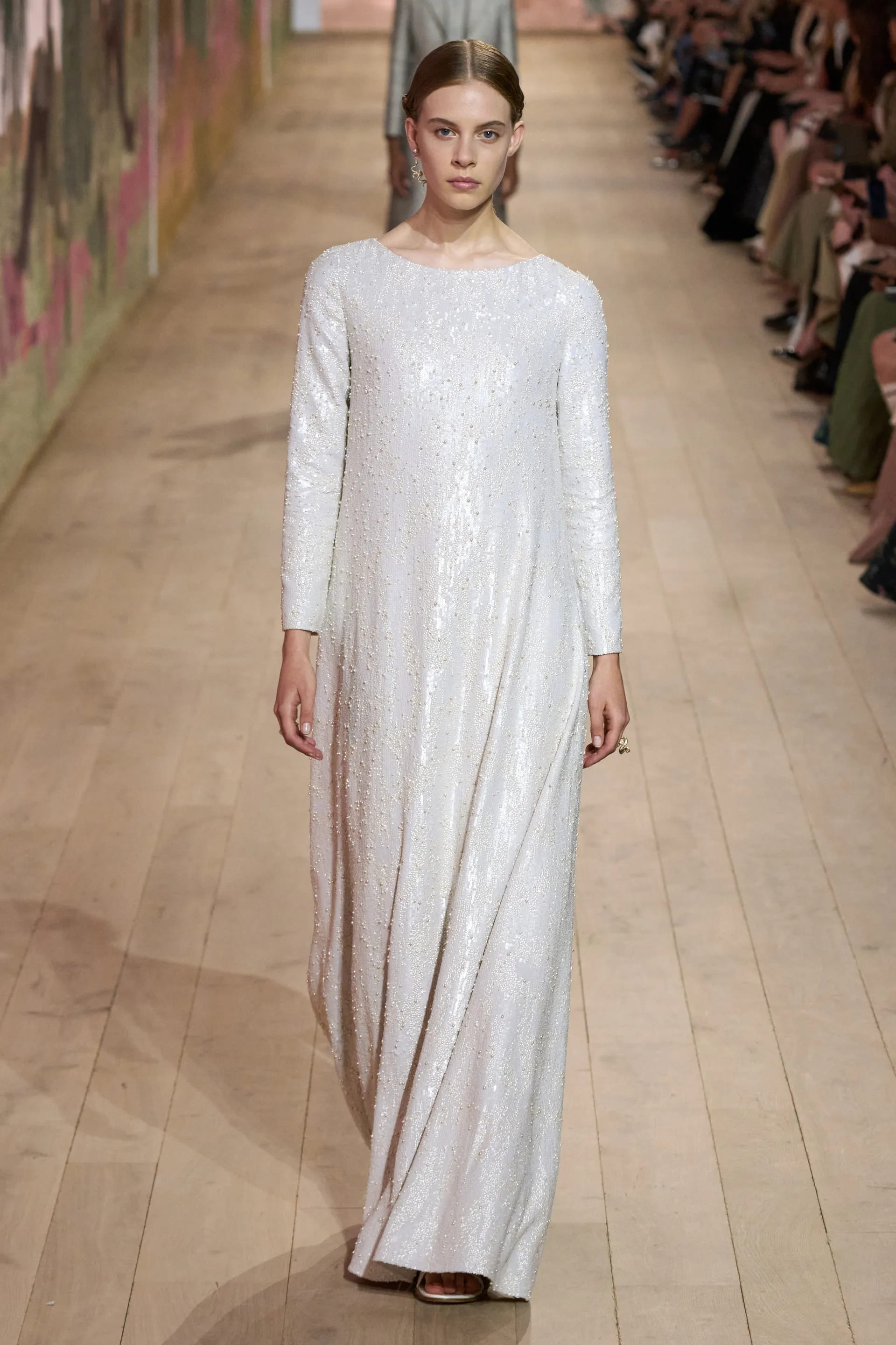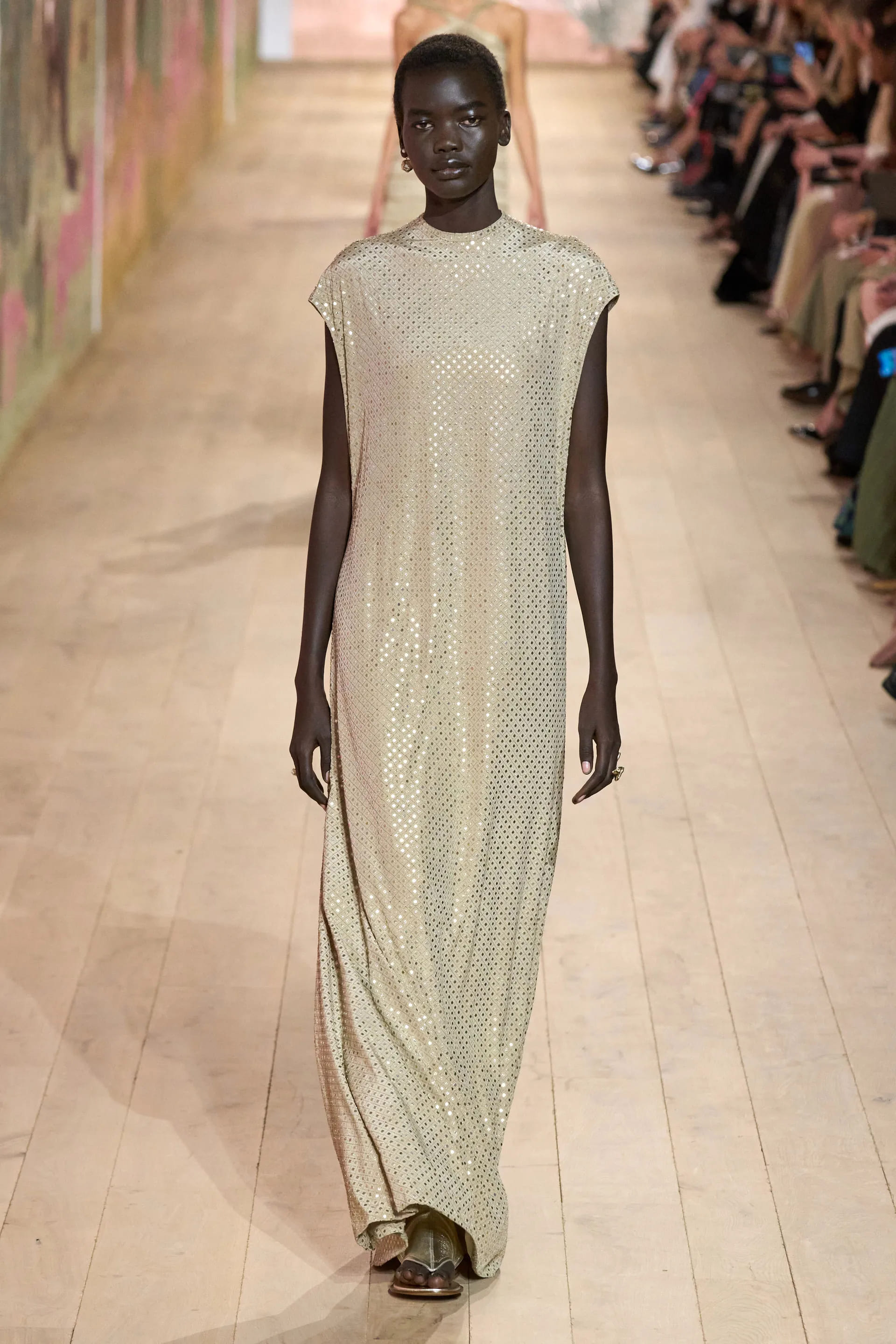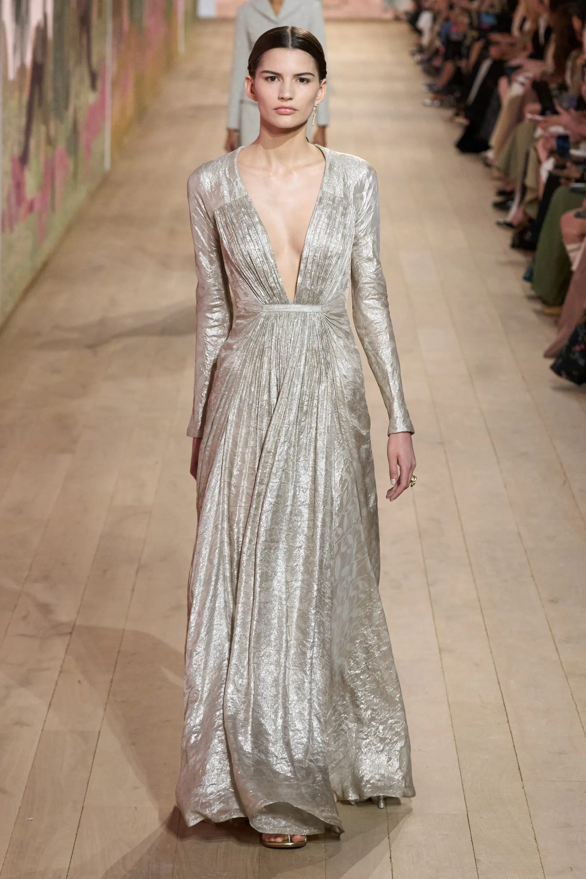 На показі моделі будували міфологічну ієрархію, рухаючись від тюлевої комбінації з босоніжками-гладіаторами до імітації кольчуги, витонченої вишивки з перлами та мерехтливими фактурами на сукнях і спідницях. Кутюр цього сезону від К’юрі є балансом ремісничої майстерності та мінімалізму, а нова висока мода Dior — це увічнення античності й культу богині в ілюстрації жіночої сили та тендітності.