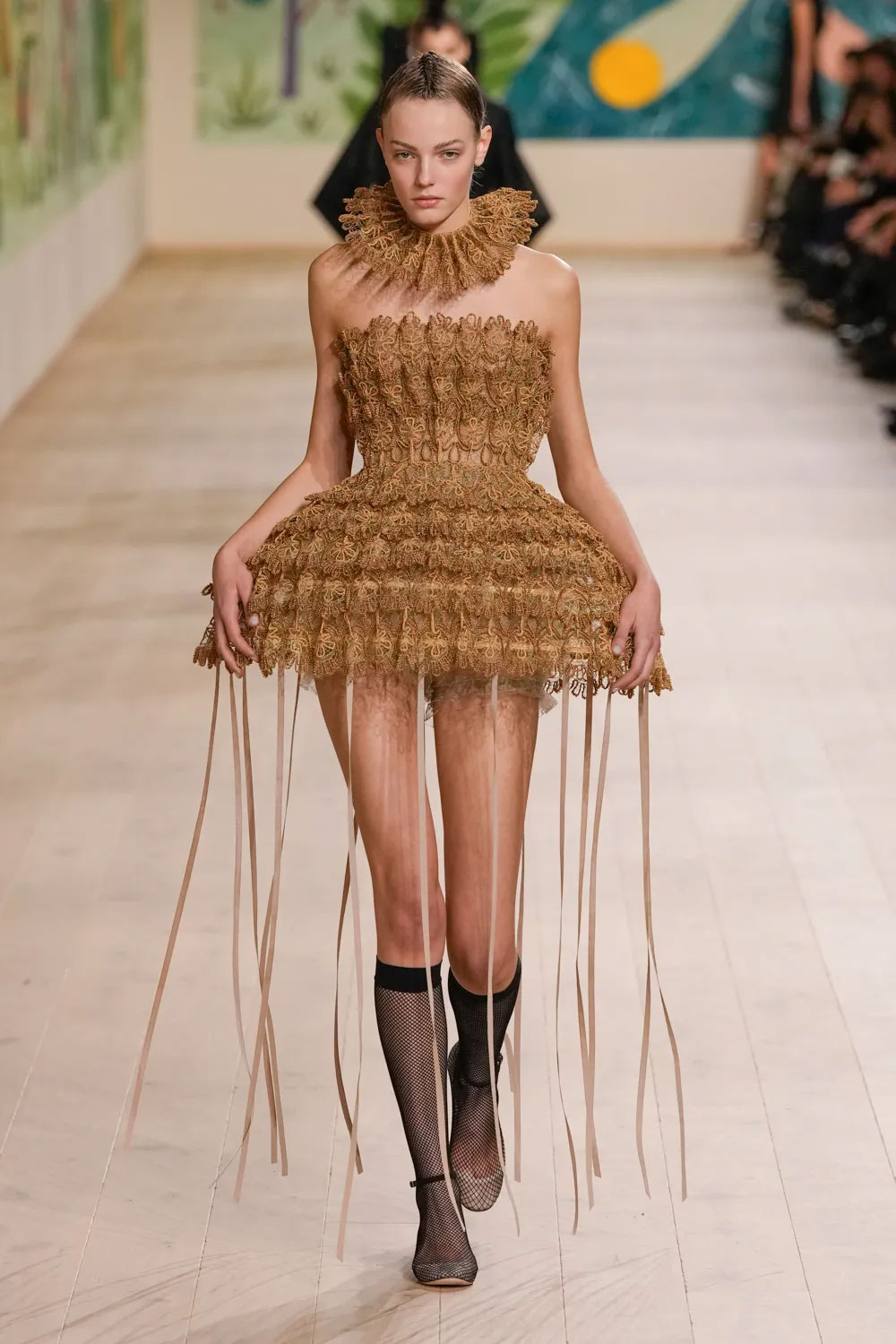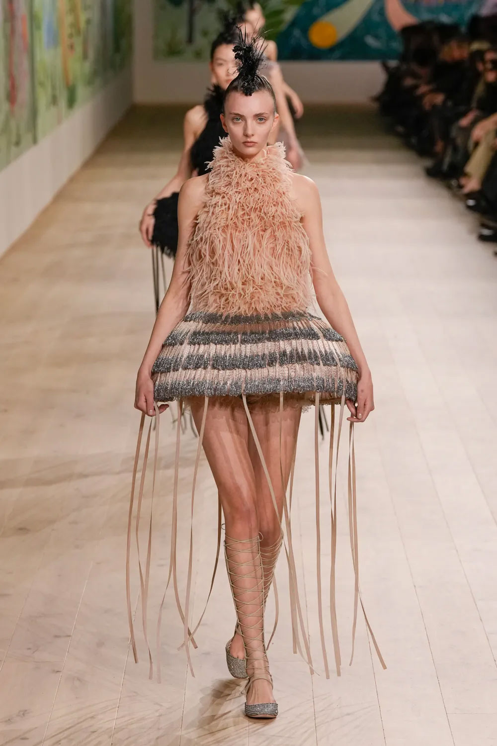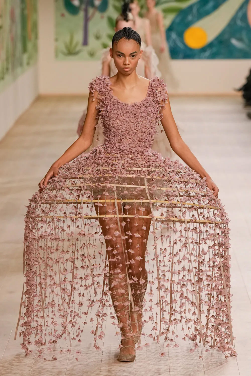 Моделі з іншої фантастичної реальності на показі Dior були одягнуті в панівній палітрі з бежевого, чорного, сірого й білого кольорів. Серед них були жінка-квітка або ж жінка-птаха, яку вирізняв гребенеподібний панківський головний убір. Їхні вбрання — це квіткові мотиви та сучасний кринолін, з якого до підлоги сягали стрічки чи торочки, схожі на гілки, а також оборки, банти й об’ємні рюші на шортах-блумерах і сукнях різної довжини. Жінка-квітка та жінка птаха Dior до того ж убралися в срібну вишивку, пір’я з органзи, мереживо, транслюючи невагомість із прозорими тканинами та крокуючи в гладіаторських балетках.