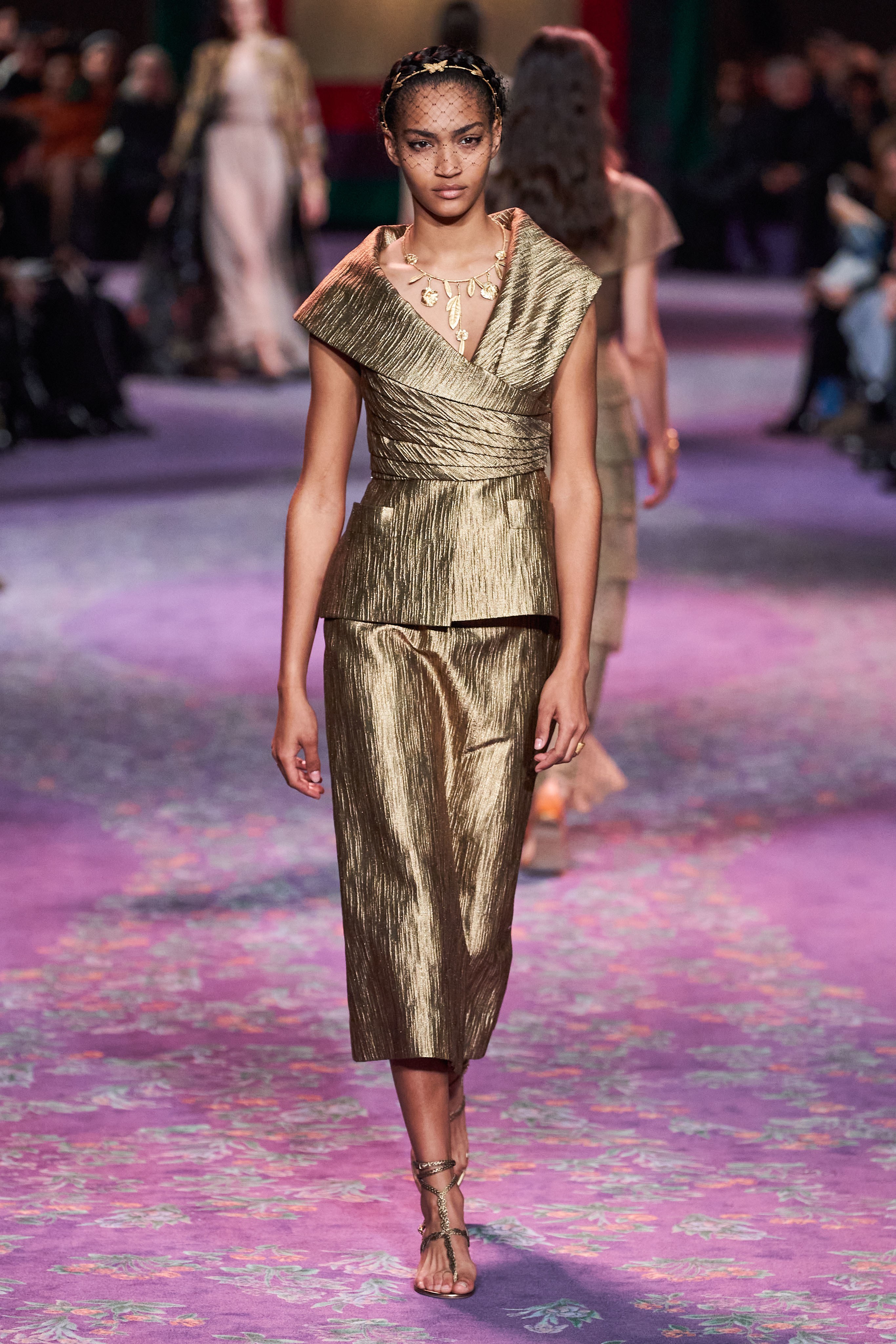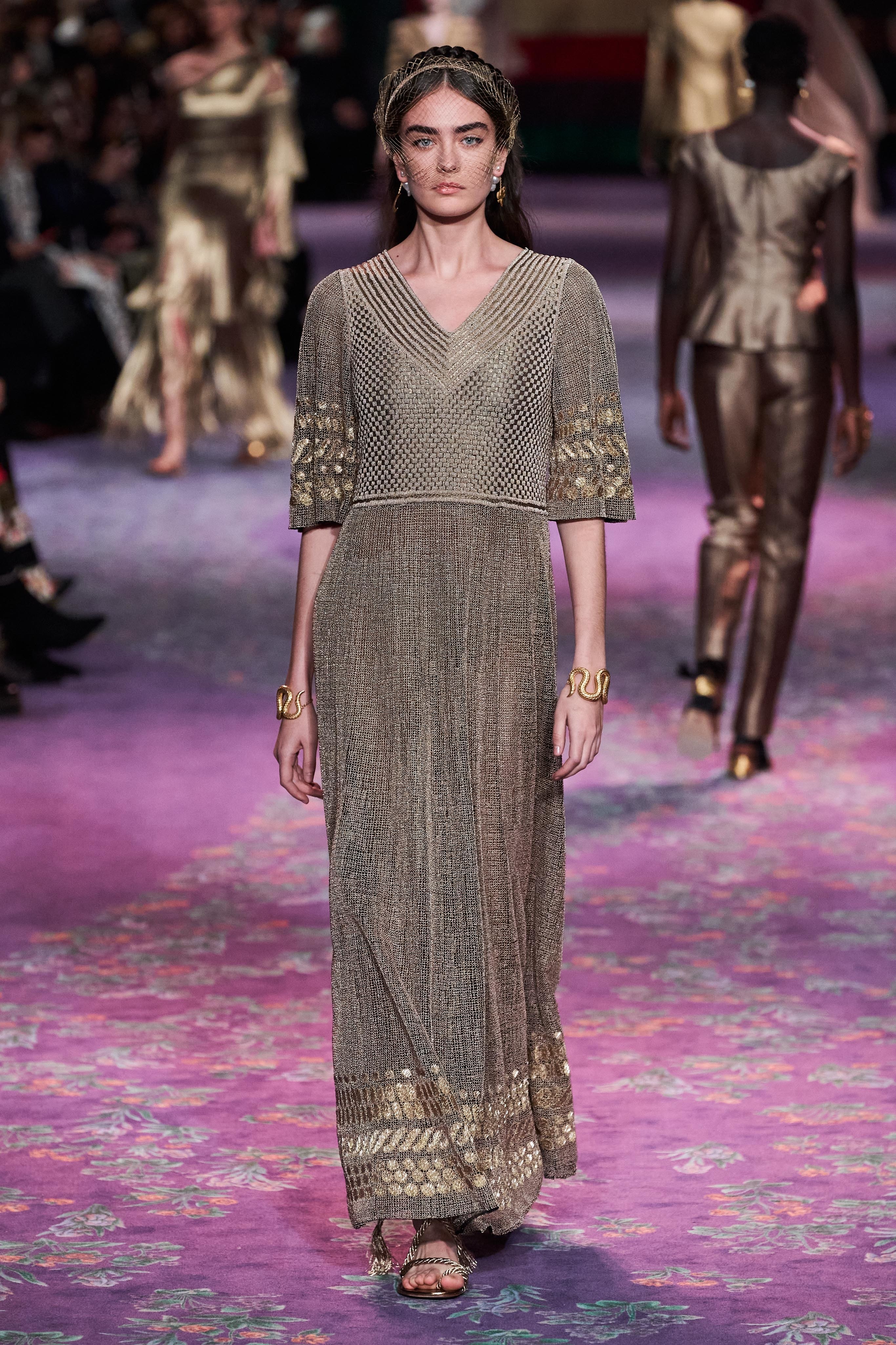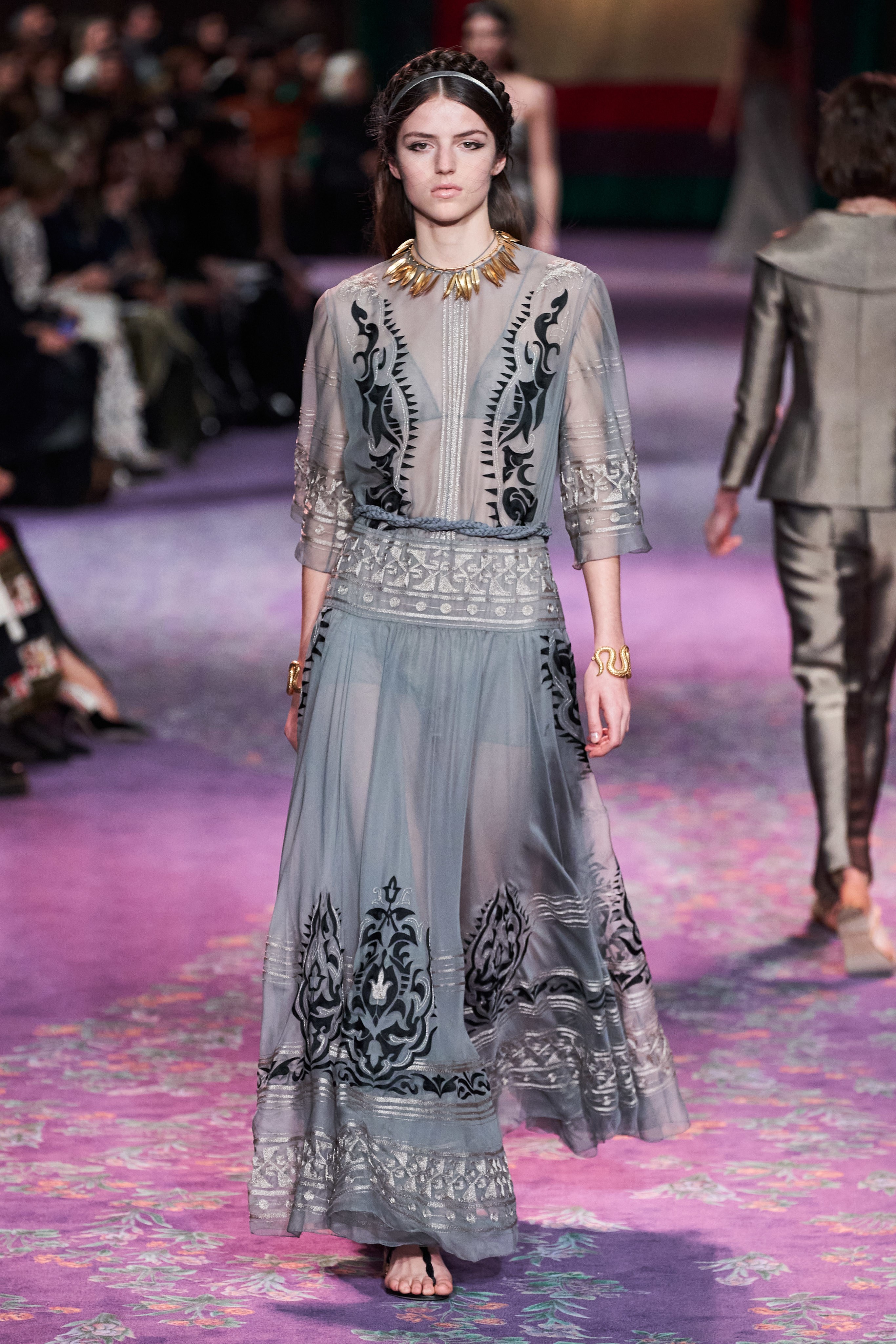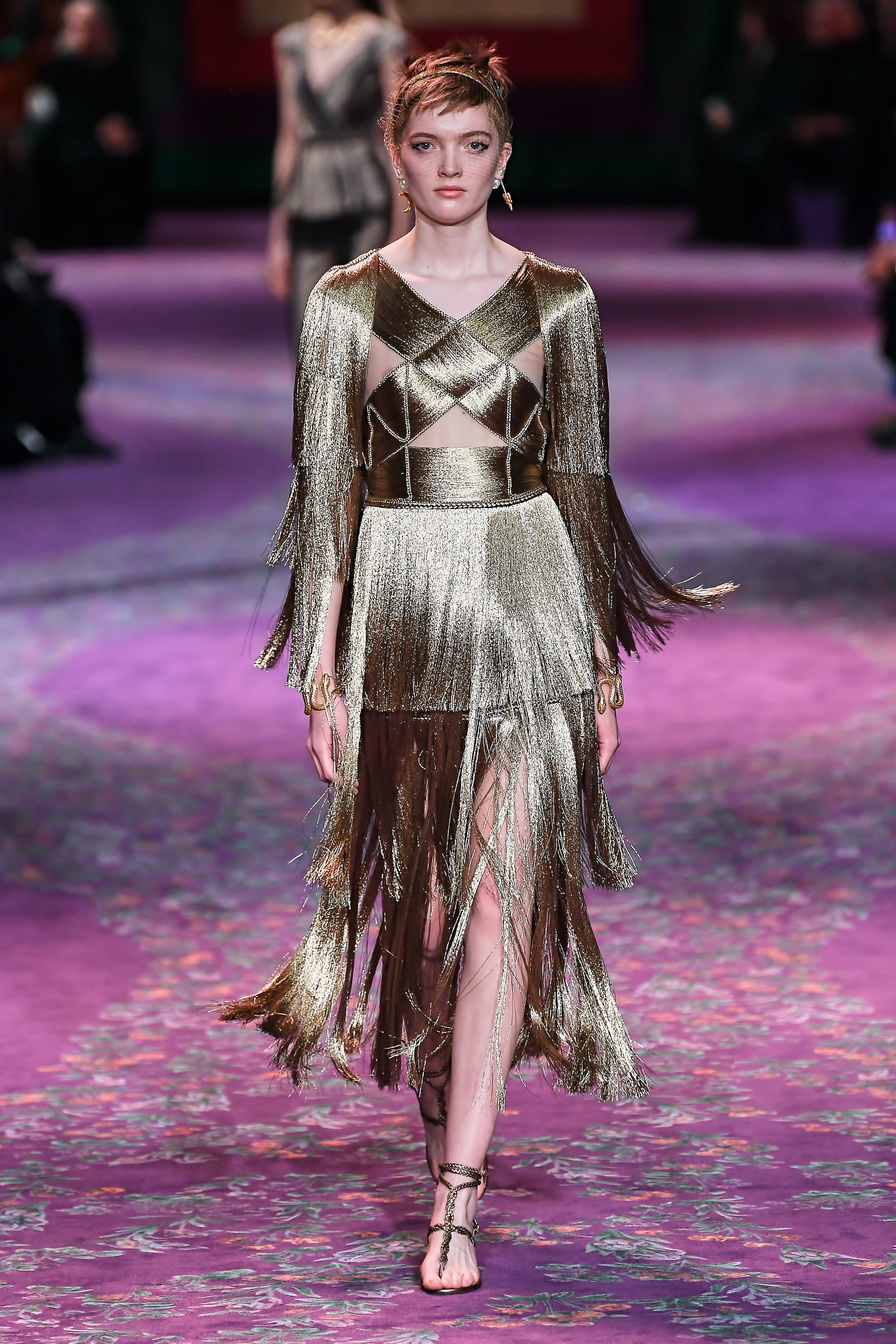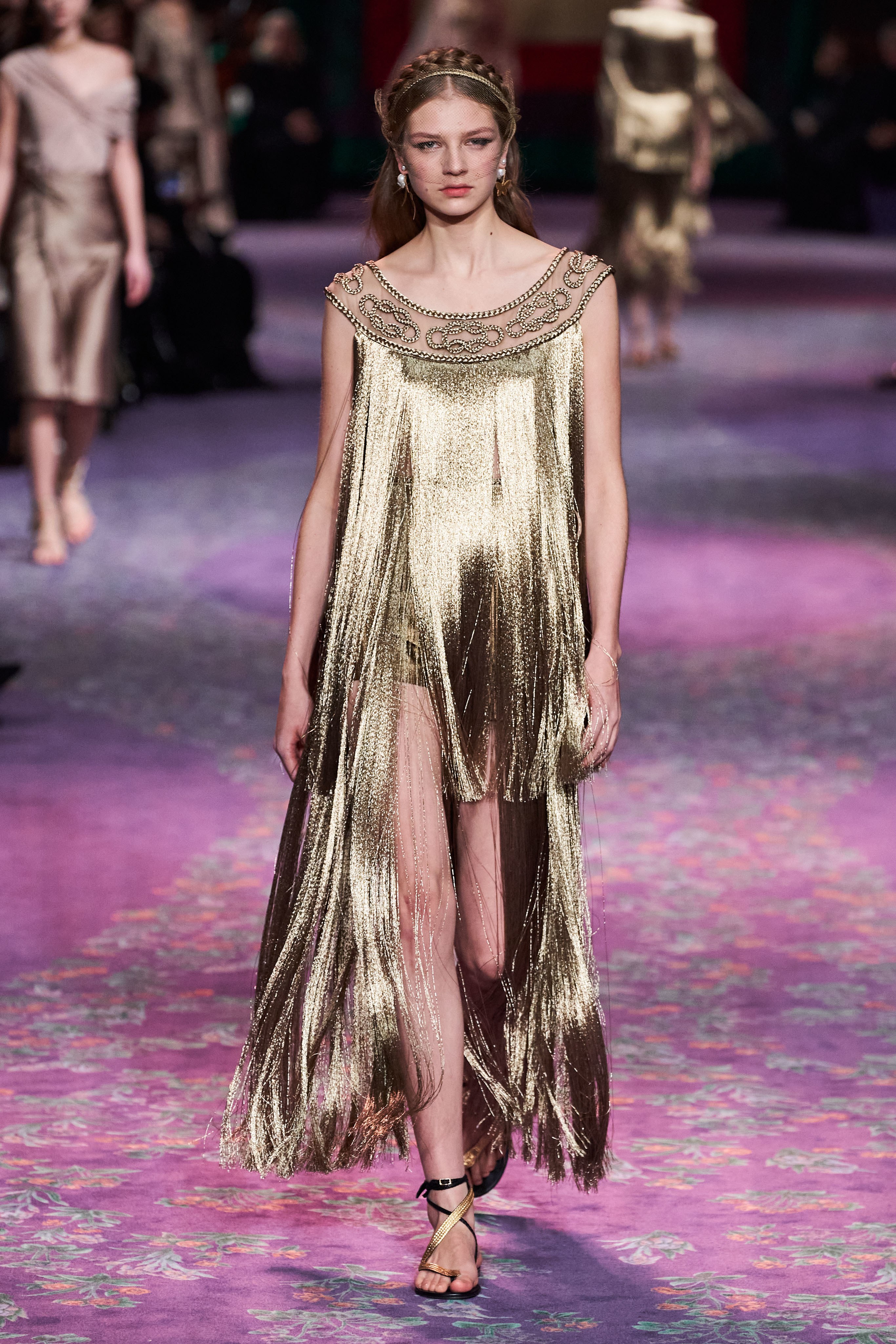 Основным цветовым лейтмотивом коллекции стало золото. Мария Грация Кьюри дополнила летящие платья из бахромы и невесомых тканей увесистыми браслетами, колье, фигурными золотыми поясами и открытыми босоножками на плоском ходу. Платья в пол, которые легли в основу коллекции, дизайнер разбавила брючными вечерними костюмами, приталенными жилетами и пальто-халатами.