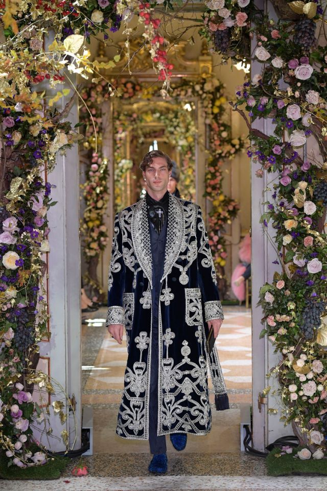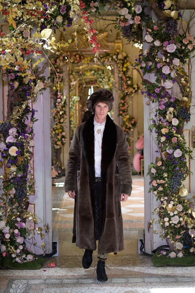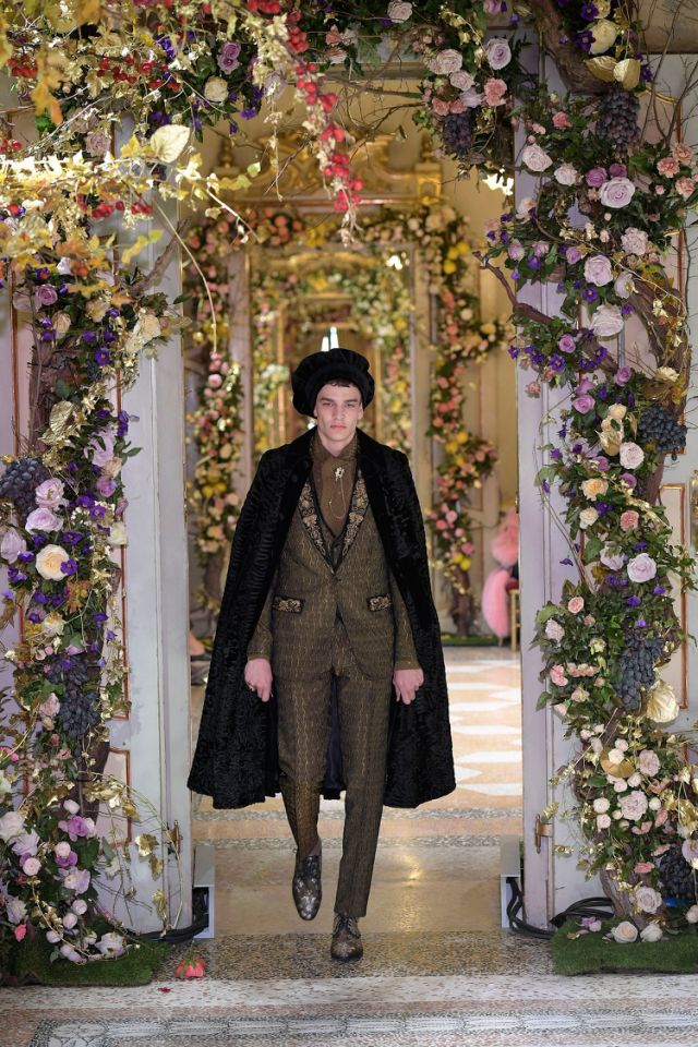Мужские образы были не менее артистичны: "индийские" пиджаки с вышивкой Лесаж, пальто и пиджаки с каракулевыми вставками и репродукциями шедевров Ренессанса, выполненными в технике Punto Pittura. Сочетание кожи крокодила, экзотического меха и кашемира в верхней одежде придало образам и вовсе практическую достоверность и схожесть с персонажами полотен и знатными жителями Италии тех времен.